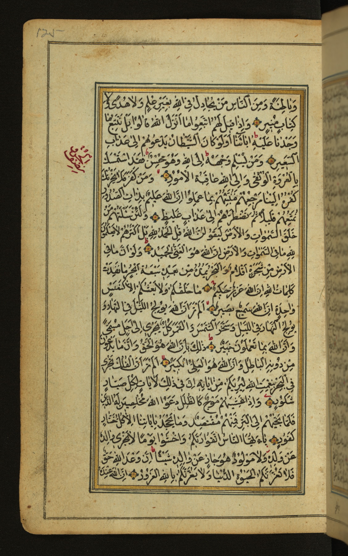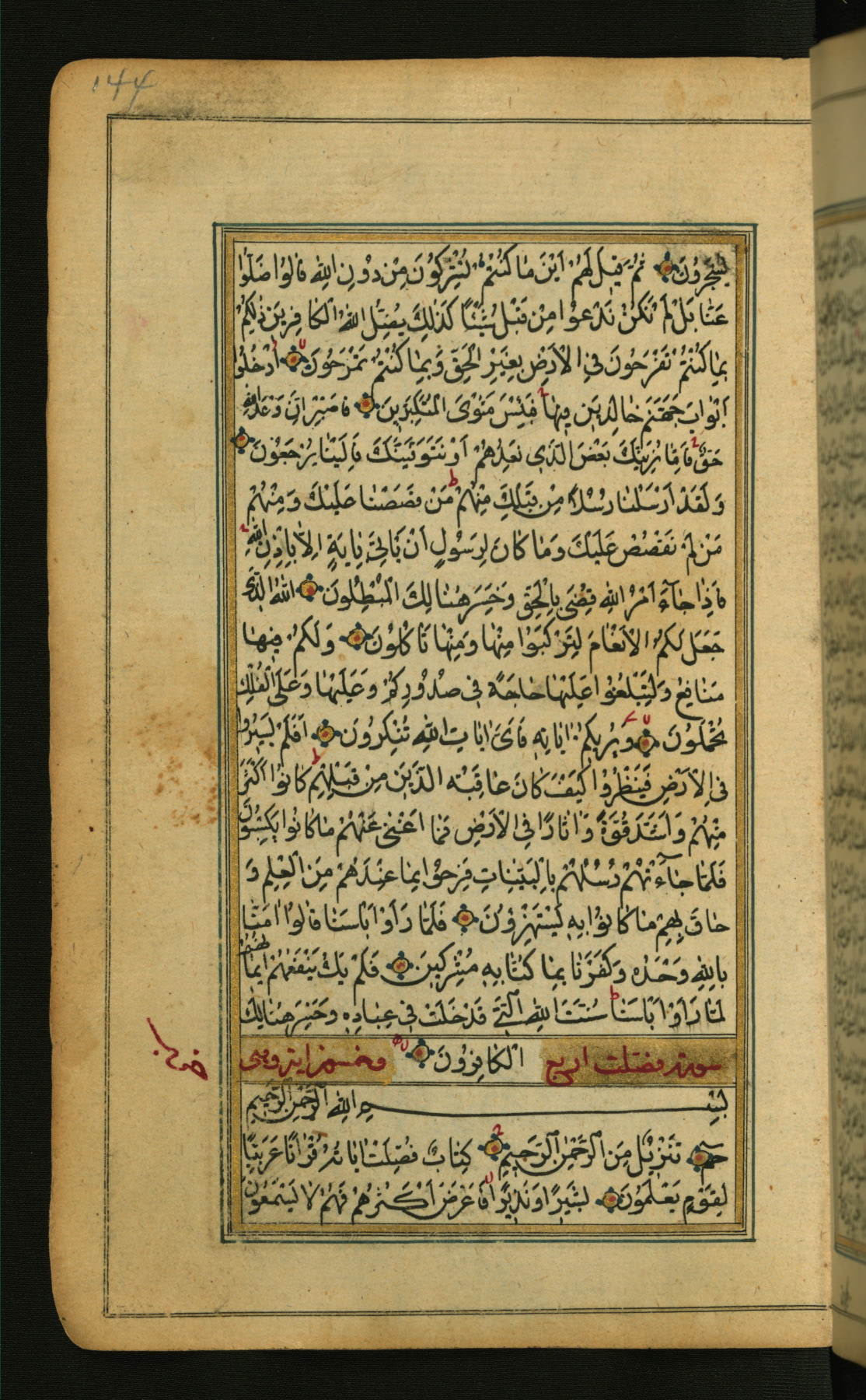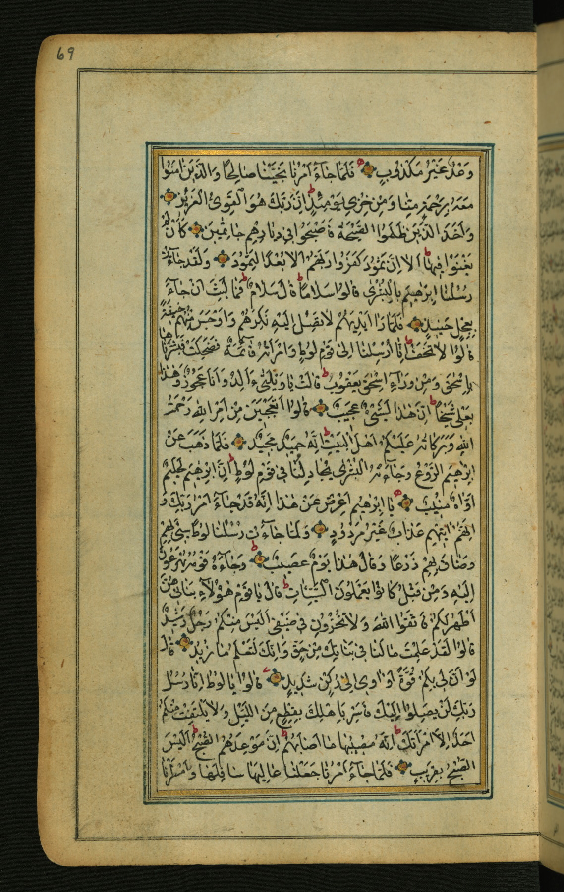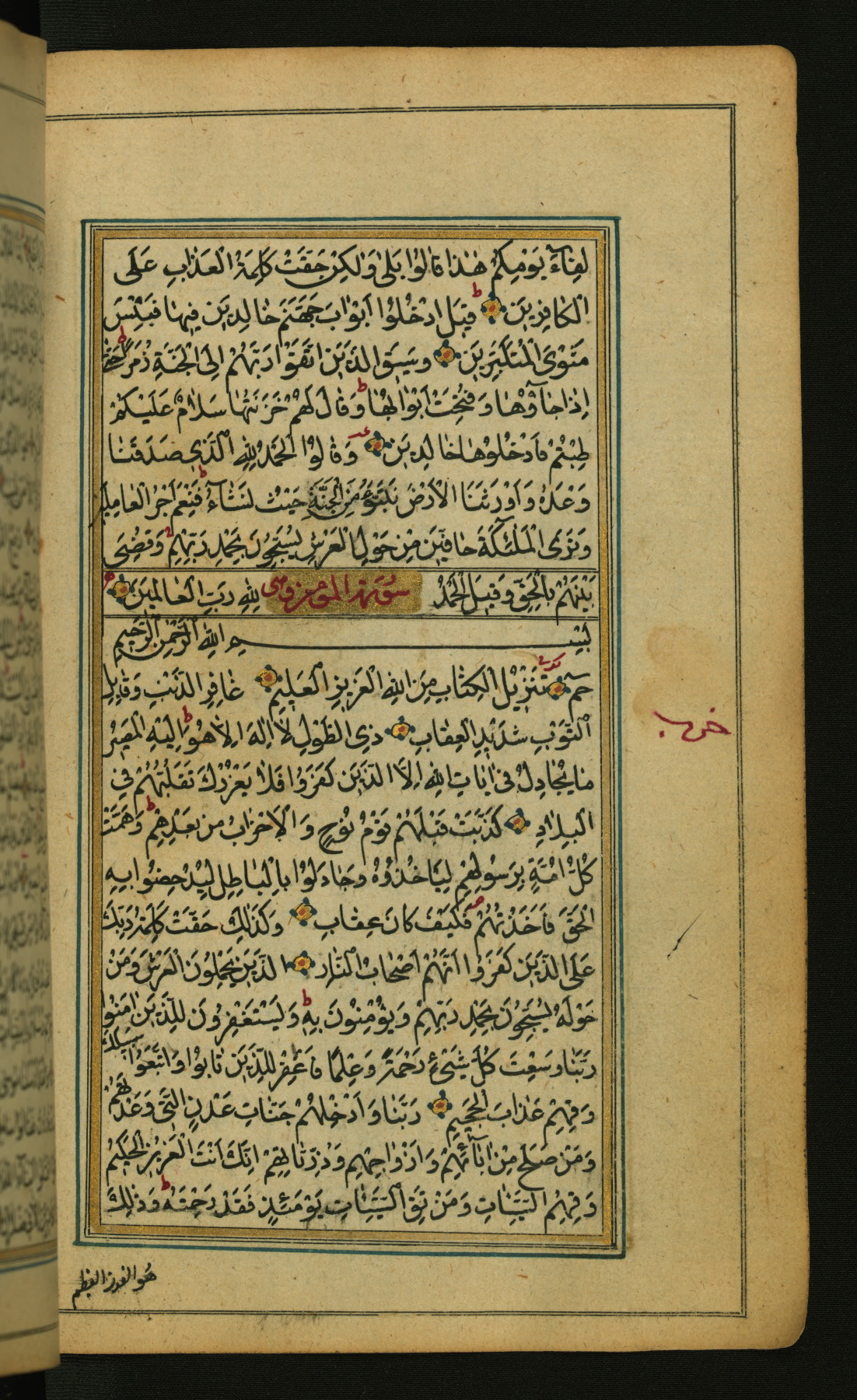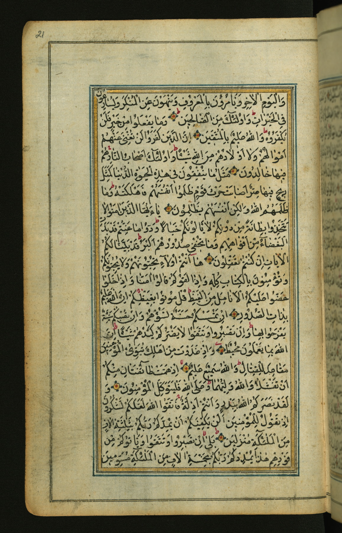 This manuscript is a small illuminated single-volume copy of the Qurʾan, likely produced in Iran. A date is inscribed on the final page, which is interpreted as 1230 AH / 1814-5 CE (fol. 186b). The manuscript opens with an illuminated double-page incipit with the verses of chapter 1 (Sūrat al-fātiḥah) and the initial verses of chapter 2 (Sūrat al-baqarah), decorated with interlinear illumination (fols. 1b-2a). The text is in vocalized naskh script in black ink with reading marks in red and text divisions, such as thirty verses (juzʾ) or sixty verses (ḥizb), in the margins. Illuminated discs with colored dots separate the verses. Chapter headings are in riqāʿ script in red ink on a gold ground. The nineteenth-century lacquer binding with a floral composition on a gold field on the upper and lower boards seems to be contemporary with the manuscript. The insides of both boards are painted with a lobed yellow central medallion and pendants on an orange field.