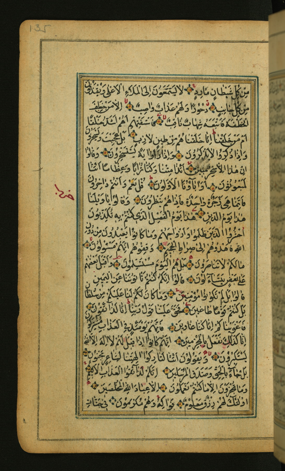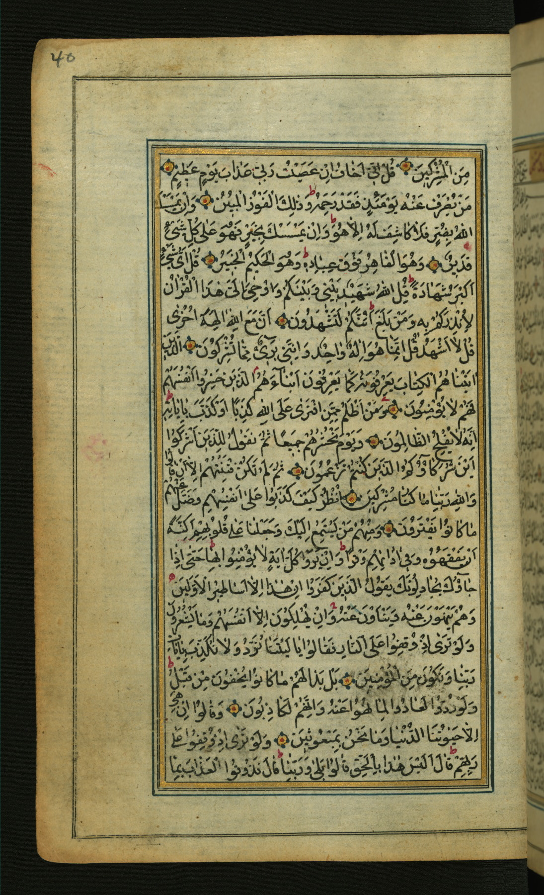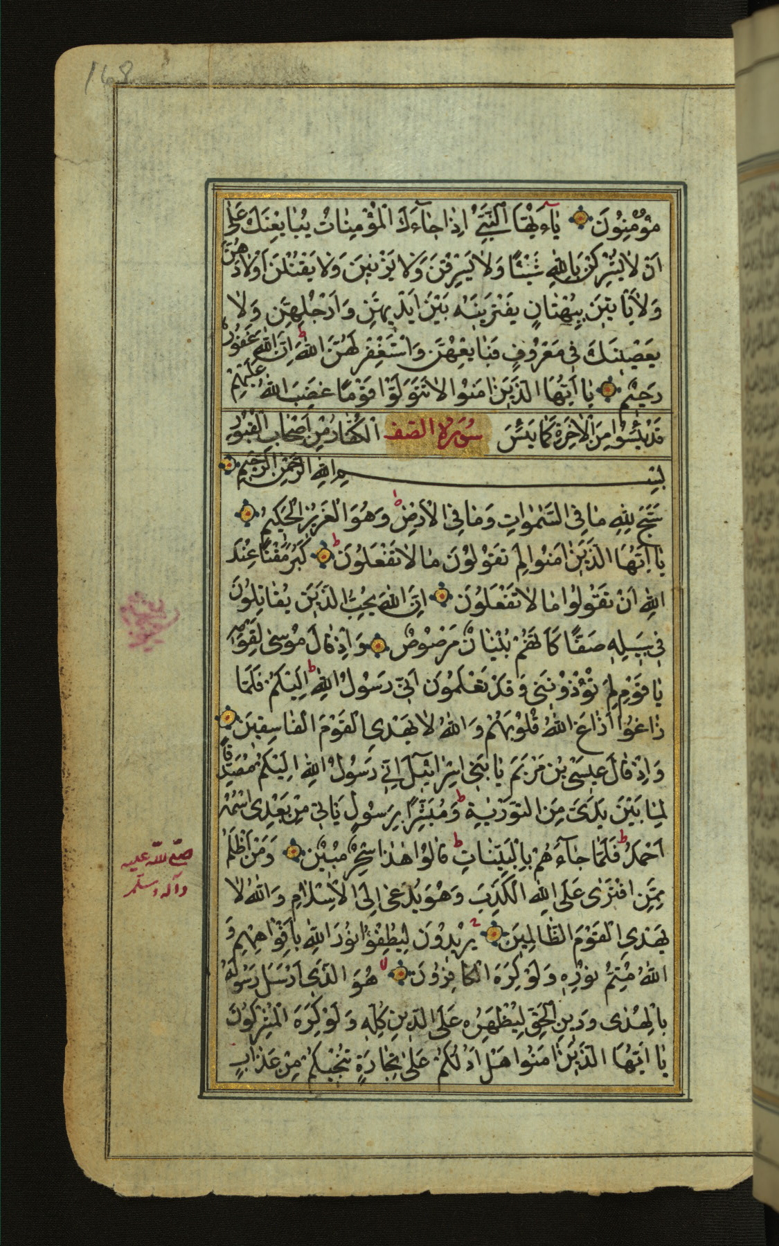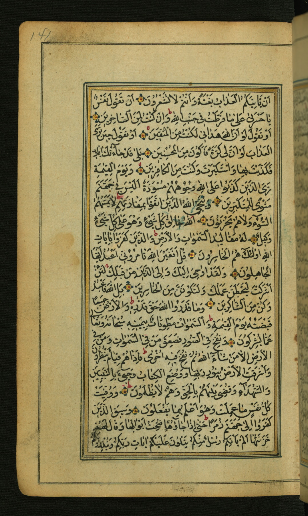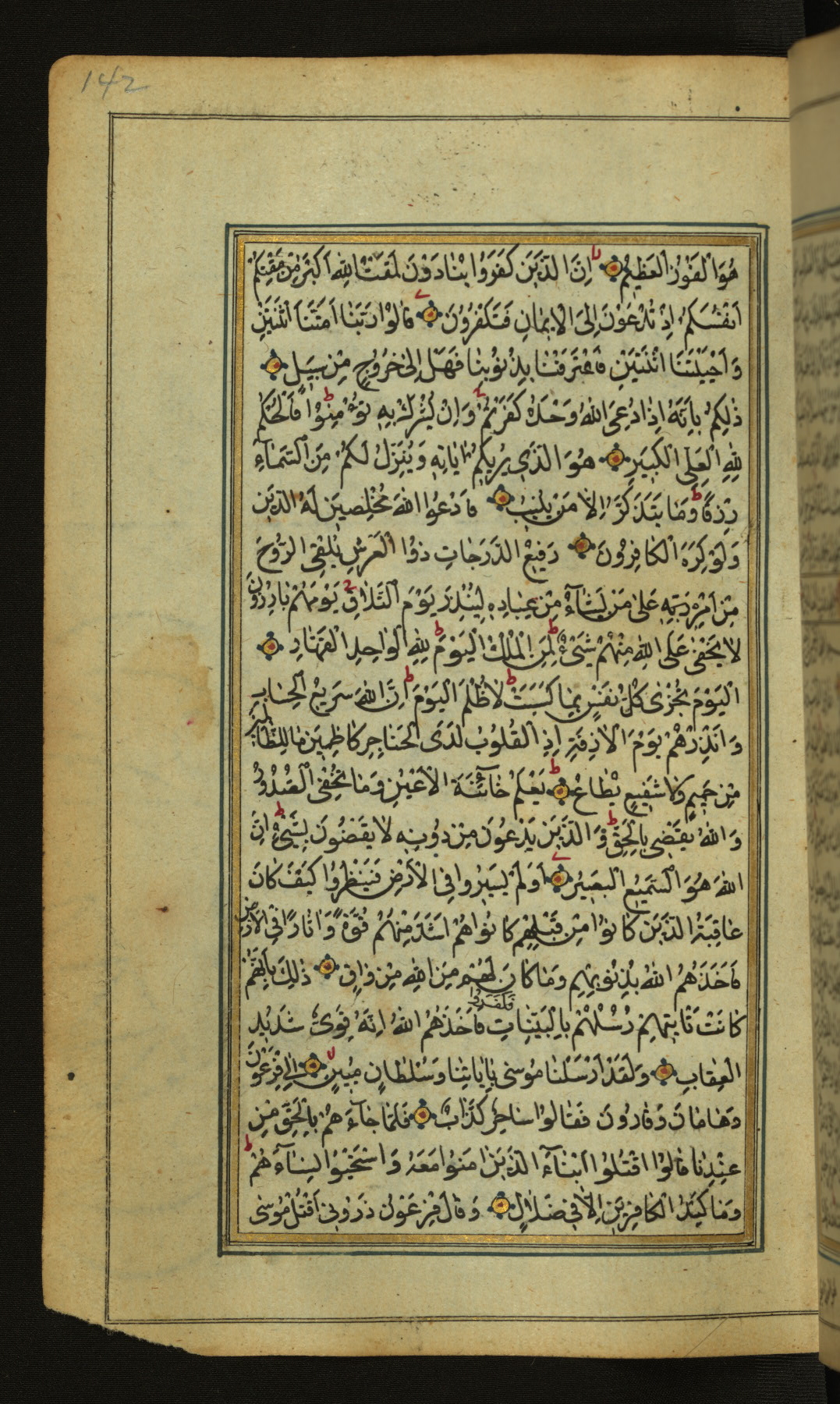 This manuscript is a small illuminated single-volume copy of the Qurʾan, likely produced in Iran. A date is inscribed on the final page, which is interpreted as 1230 AH / 1814-5 CE (fol. 186b). The manuscript opens with an illuminated double-page incipit with the verses of chapter 1 (Sūrat al-fātiḥah) and the initial verses of chapter 2 (Sūrat al-baqarah), decorated with interlinear illumination (fols. 1b-2a). The text is in vocalized naskh script in black ink with reading marks in red and text divisions, such as thirty verses (juzʾ) or sixty verses (ḥizb), in the margins. Illuminated discs with colored dots separate the verses. Chapter headings are in riqāʿ script in red ink on a gold ground. The nineteenth-century lacquer binding with a floral composition on a gold field on the upper and lower boards seems to be contemporary with the manuscript. The insides of both boards are painted with a lobed yellow central medallion and pendants on an orange field.