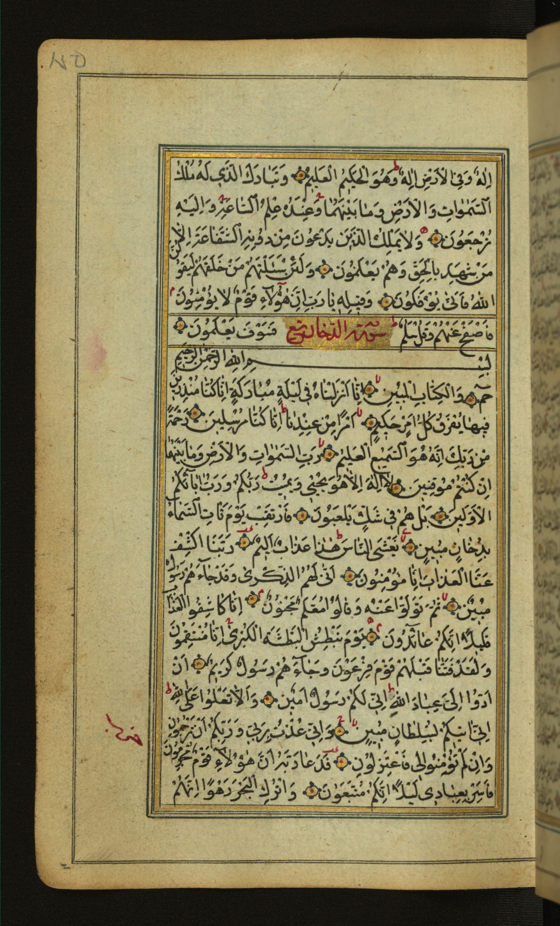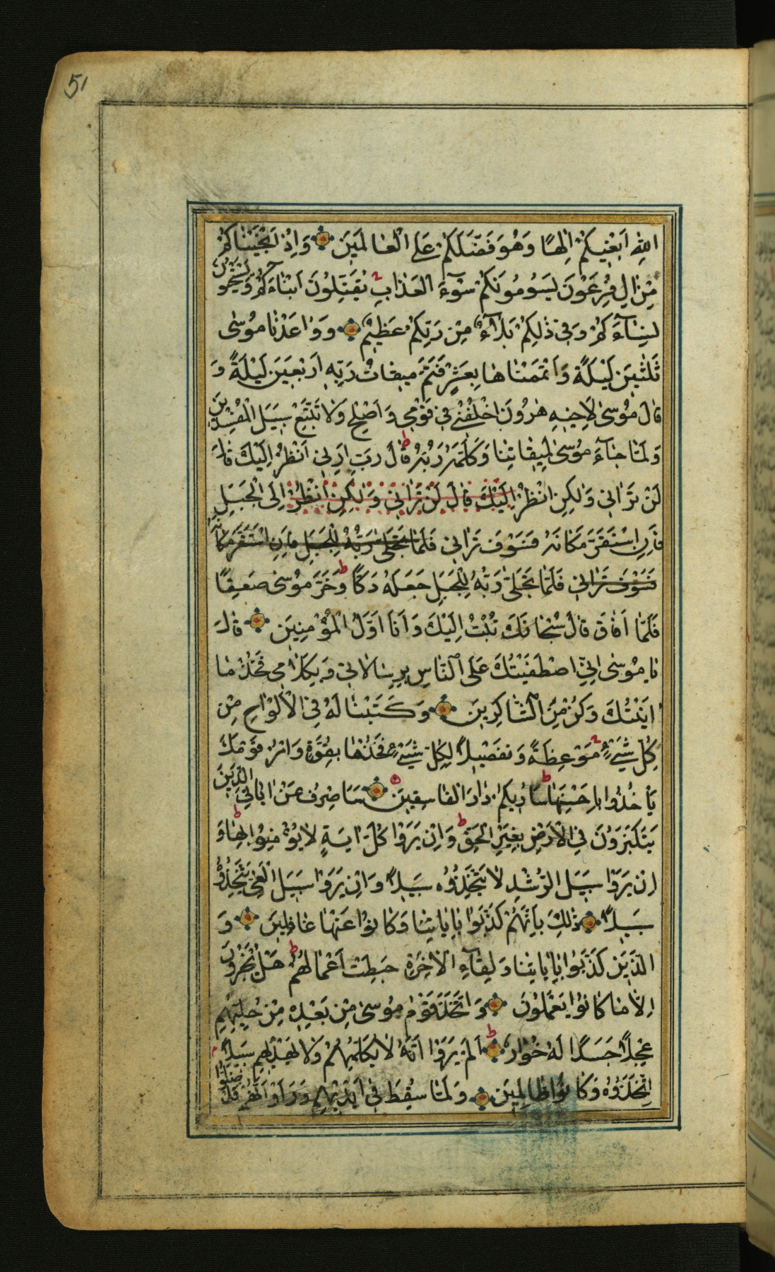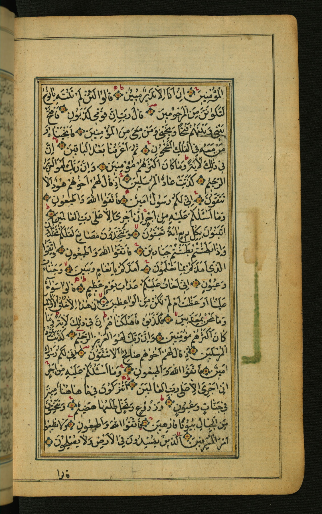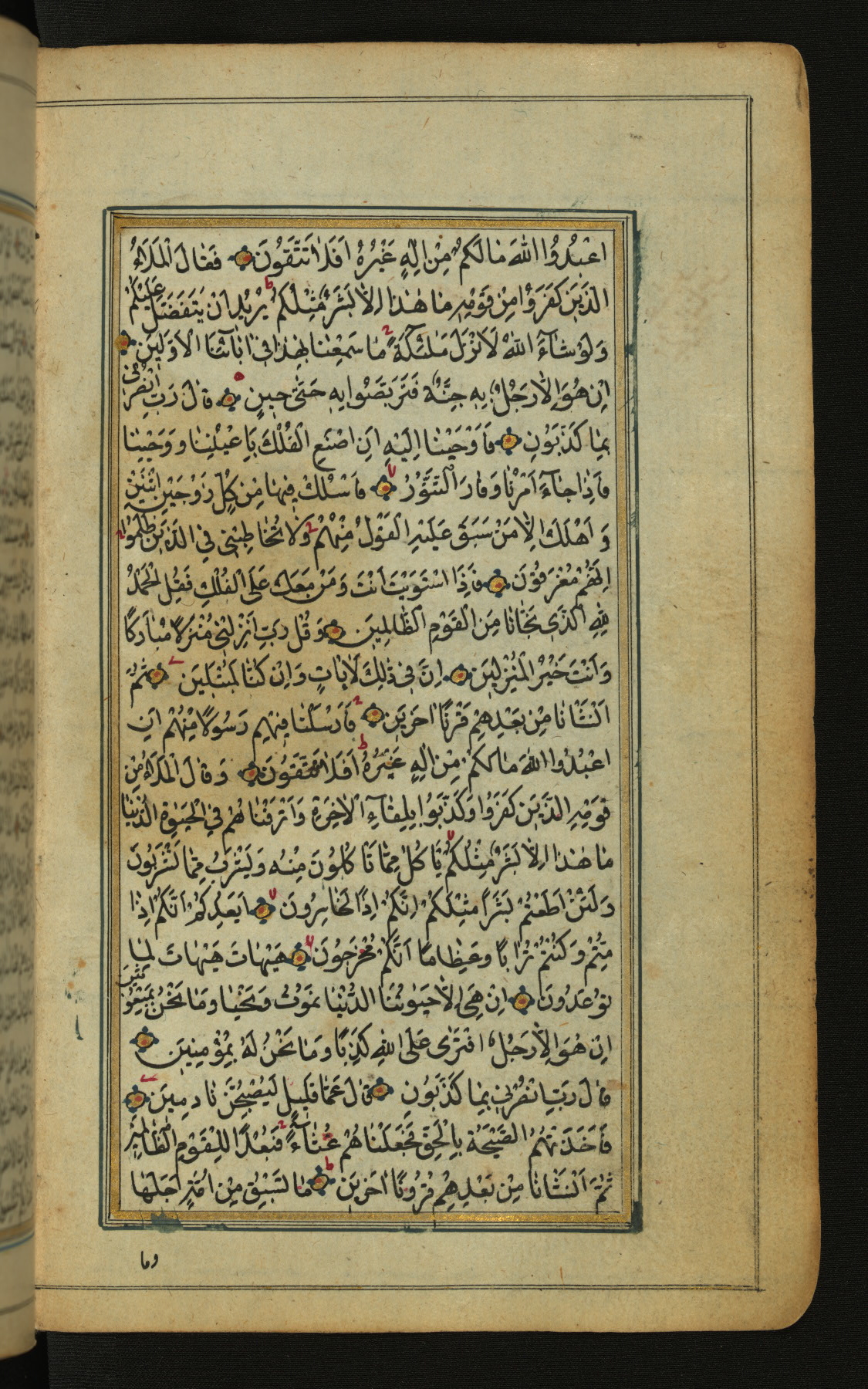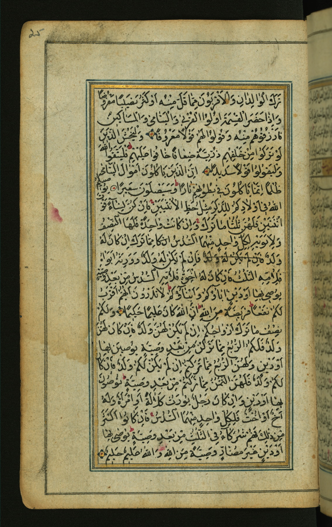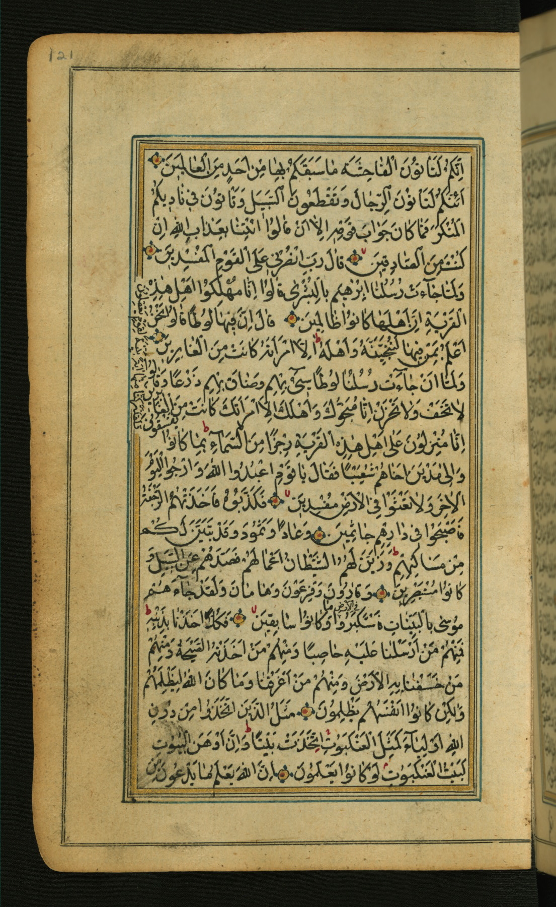 This manuscript is a small illuminated single-volume copy of the Qurʾan, likely produced in Iran. A date is inscribed on the final page, which is interpreted as 1230 AH / 1814-5 CE (fol. 186b). The manuscript opens with an illuminated double-page incipit with the verses of chapter 1 (Sūrat al-fātiḥah) and the initial verses of chapter 2 (Sūrat al-baqarah), decorated with interlinear illumination (fols. 1b-2a). The text is in vocalized naskh script in black ink with reading marks in red and text divisions, such as thirty verses (juzʾ) or sixty verses (ḥizb), in the margins. Illuminated discs with colored dots separate the verses. Chapter headings are in riqāʿ script in red ink on a gold ground. The nineteenth-century lacquer binding with a floral composition on a gold field on the upper and lower boards seems to be contemporary with the manuscript. The insides of both boards are painted with a lobed yellow central medallion and pendants on an orange field.