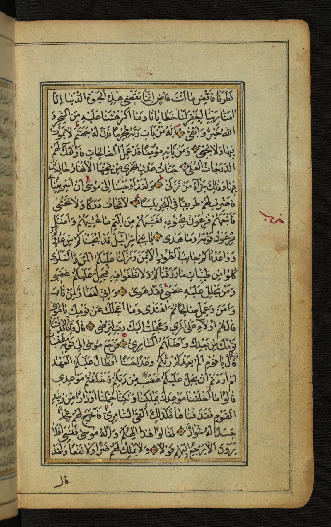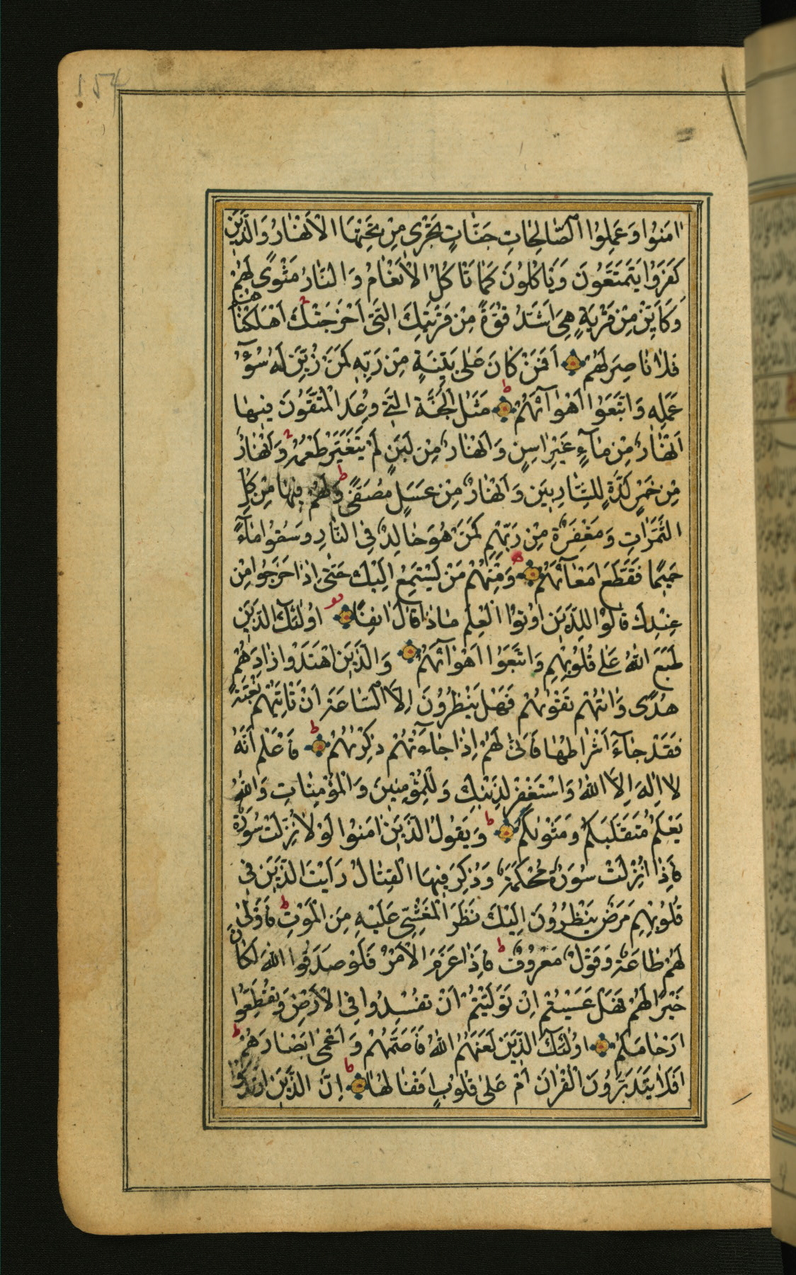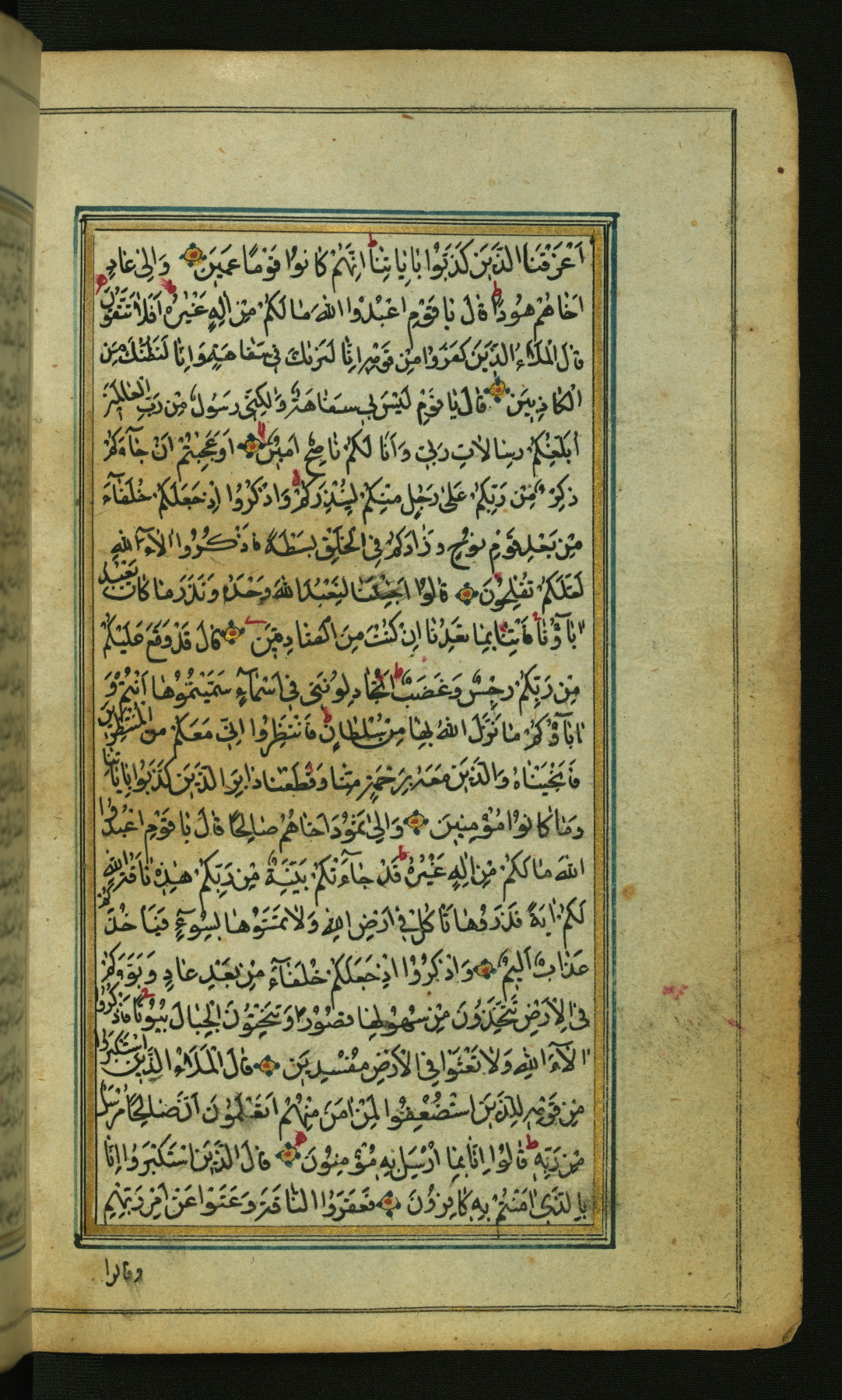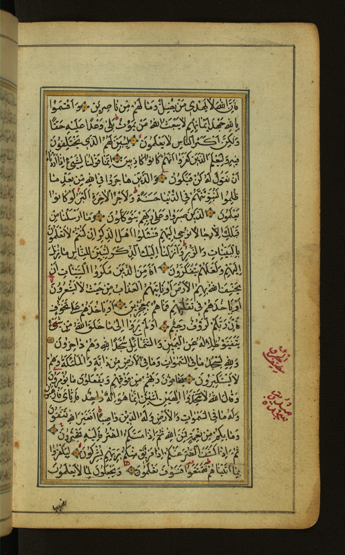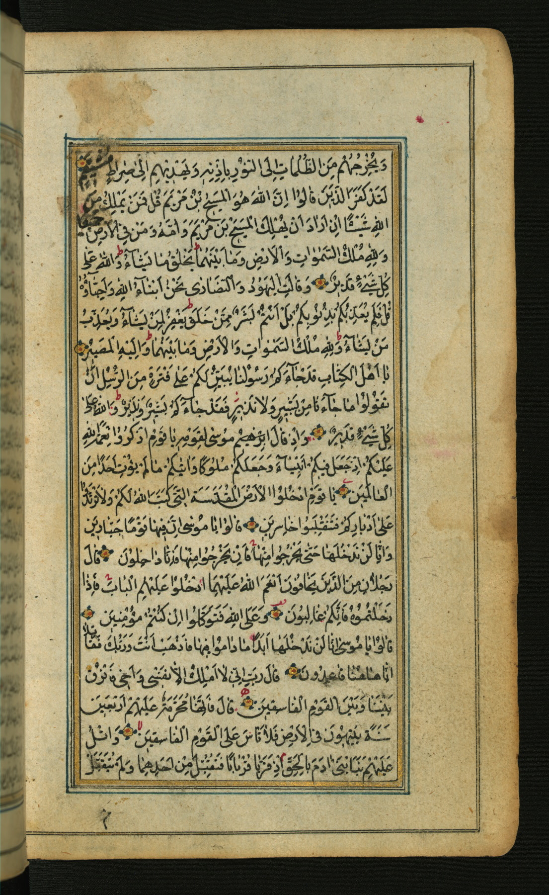 This manuscript is a small illuminated single-volume copy of the Qurʾan, likely produced in Iran. A date is inscribed on the final page, which is interpreted as 1230 AH / 1814-5 CE (fol. 186b). The manuscript opens with an illuminated double-page incipit with the verses of chapter 1 (Sūrat al-fātiḥah) and the initial verses of chapter 2 (Sūrat al-baqarah), decorated with interlinear illumination (fols. 1b-2a). The text is in vocalized naskh script in black ink with reading marks in red and text divisions, such as thirty verses (juzʾ) or sixty verses (ḥizb), in the margins. Illuminated discs with colored dots separate the verses. Chapter headings are in riqāʿ script in red ink on a gold ground. The nineteenth-century lacquer binding with a floral composition on a gold field on the upper and lower boards seems to be contemporary with the manuscript. The insides of both boards are painted with a lobed yellow central medallion and pendants on an orange field.