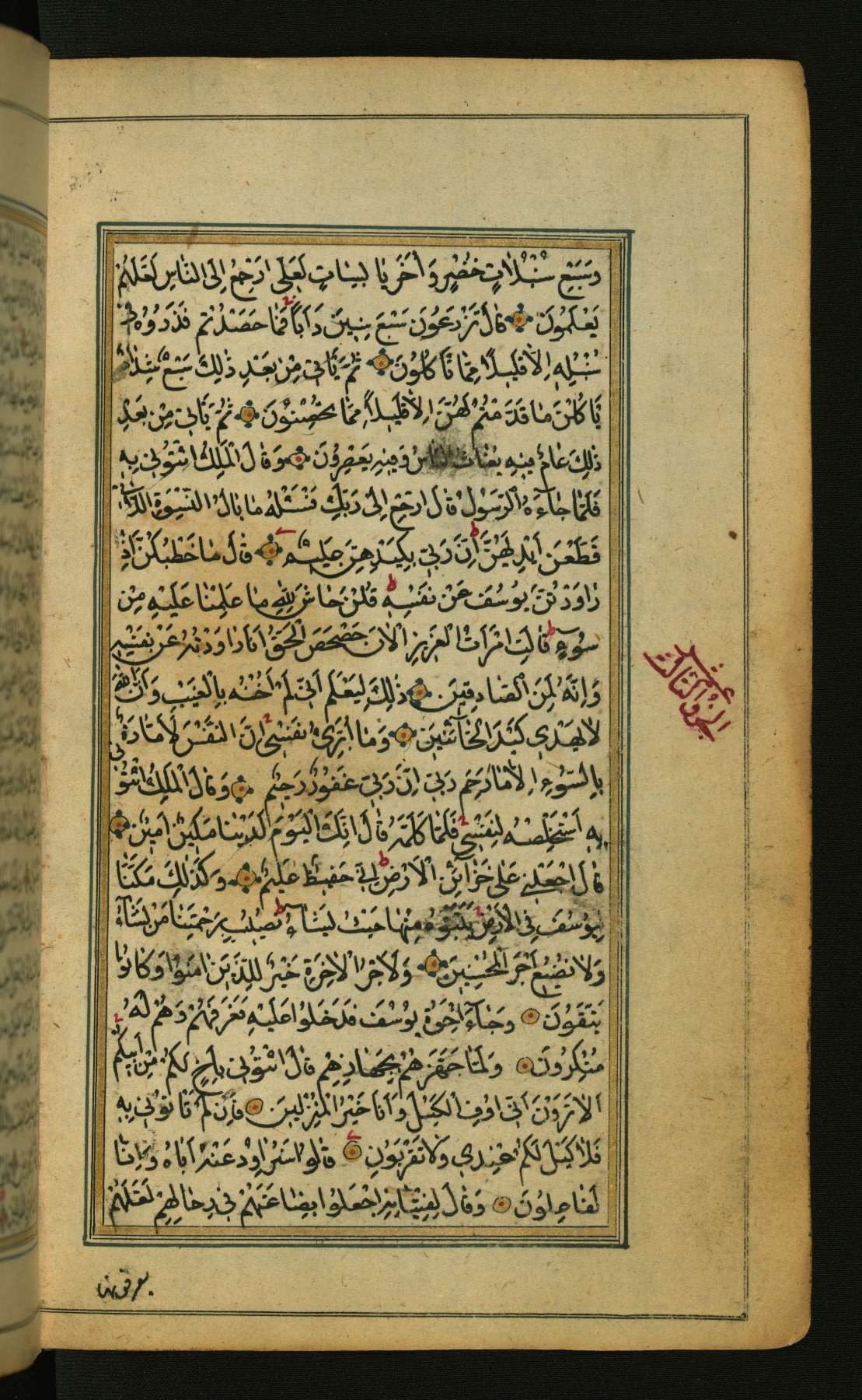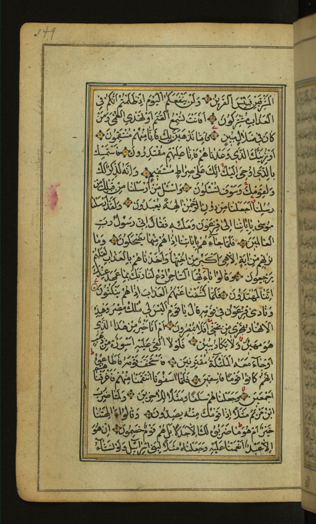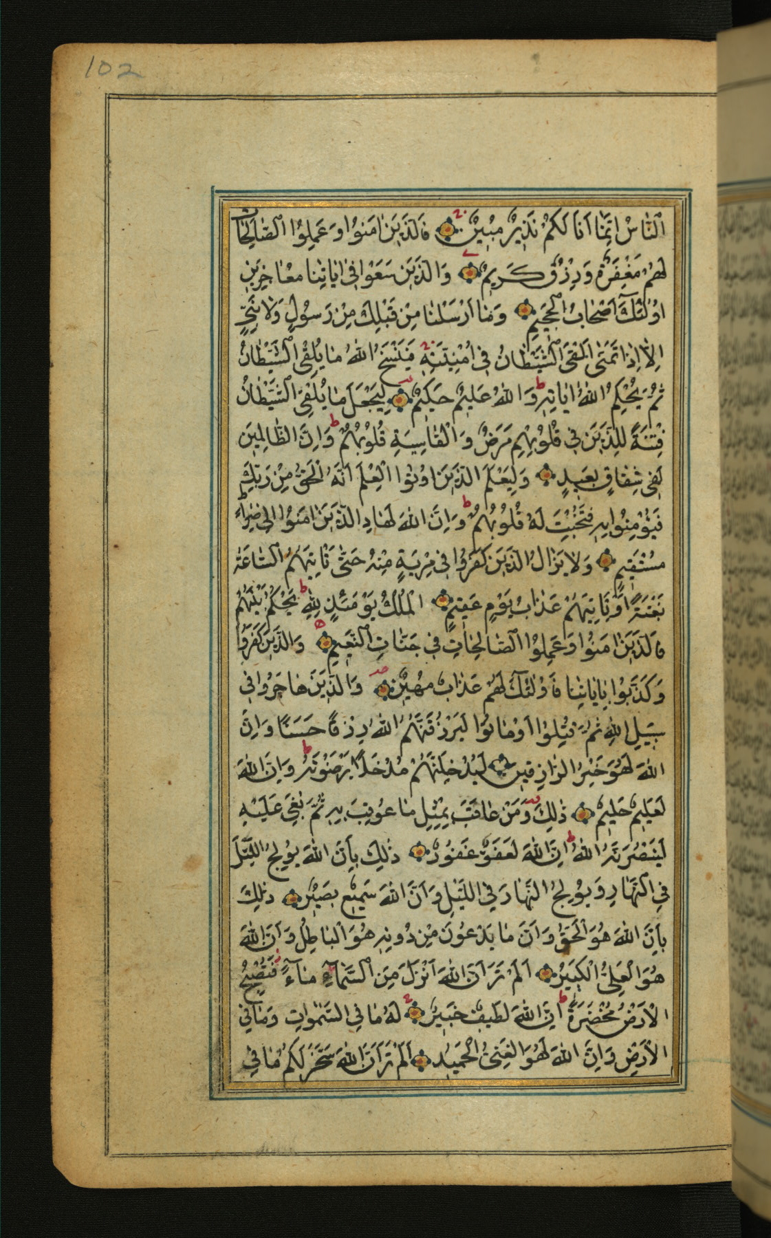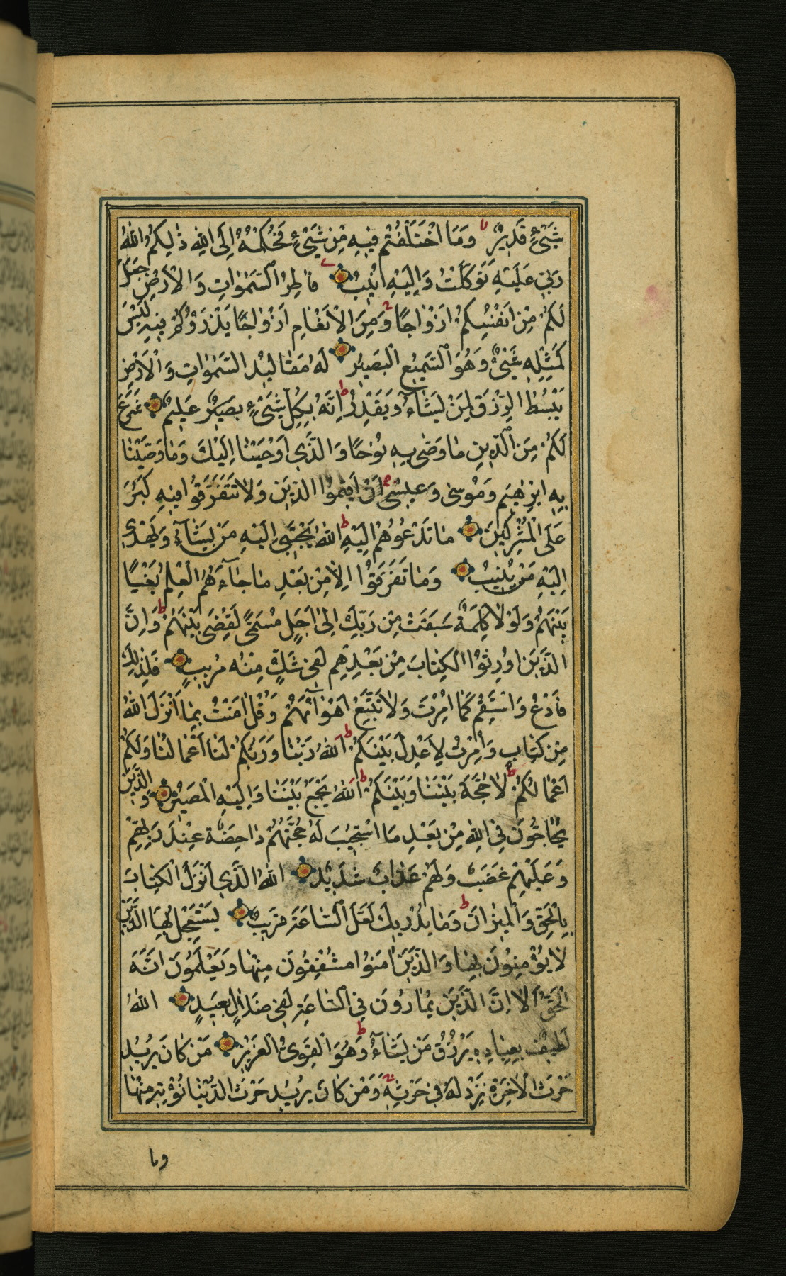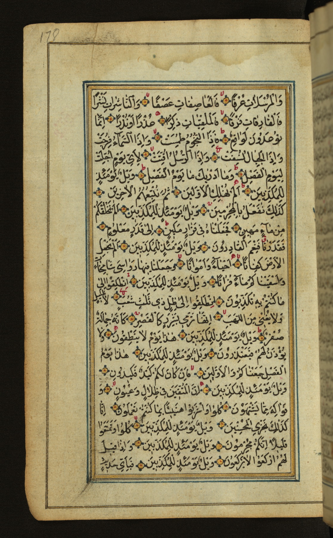 This manuscript is a small illuminated single-volume copy of the Qurʾan, likely produced in Iran. A date is inscribed on the final page, which is interpreted as 1230 AH / 1814-5 CE (fol. 186b). The manuscript opens with an illuminated double-page incipit with the verses of chapter 1 (Sūrat al-fātiḥah) and the initial verses of chapter 2 (Sūrat al-baqarah), decorated with interlinear illumination (fols. 1b-2a). The text is in vocalized naskh script in black ink with reading marks in red and text divisions, such as thirty verses (juzʾ) or sixty verses (ḥizb), in the margins. Illuminated discs with colored dots separate the verses. Chapter headings are in riqāʿ script in red ink on a gold ground. The nineteenth-century lacquer binding with a floral composition on a gold field on the upper and lower boards seems to be contemporary with the manuscript. The insides of both boards are painted with a lobed yellow central medallion and pendants on an orange field.