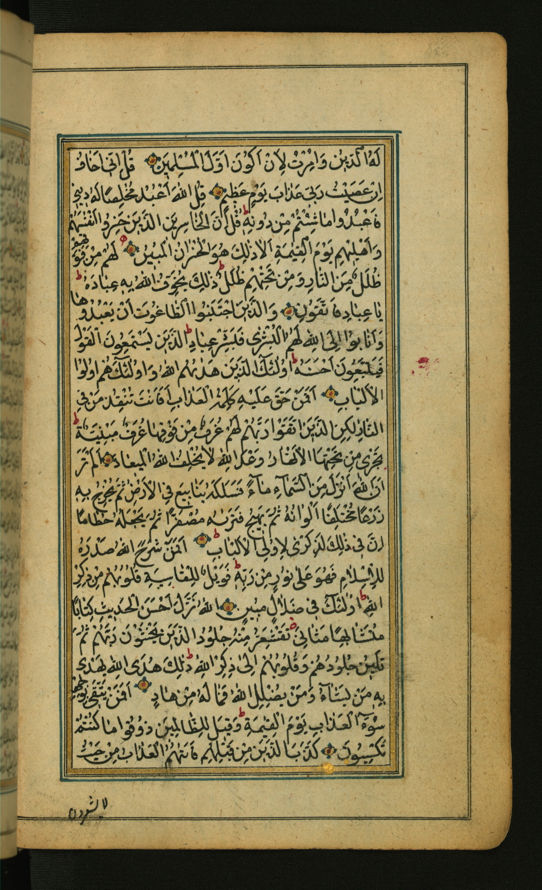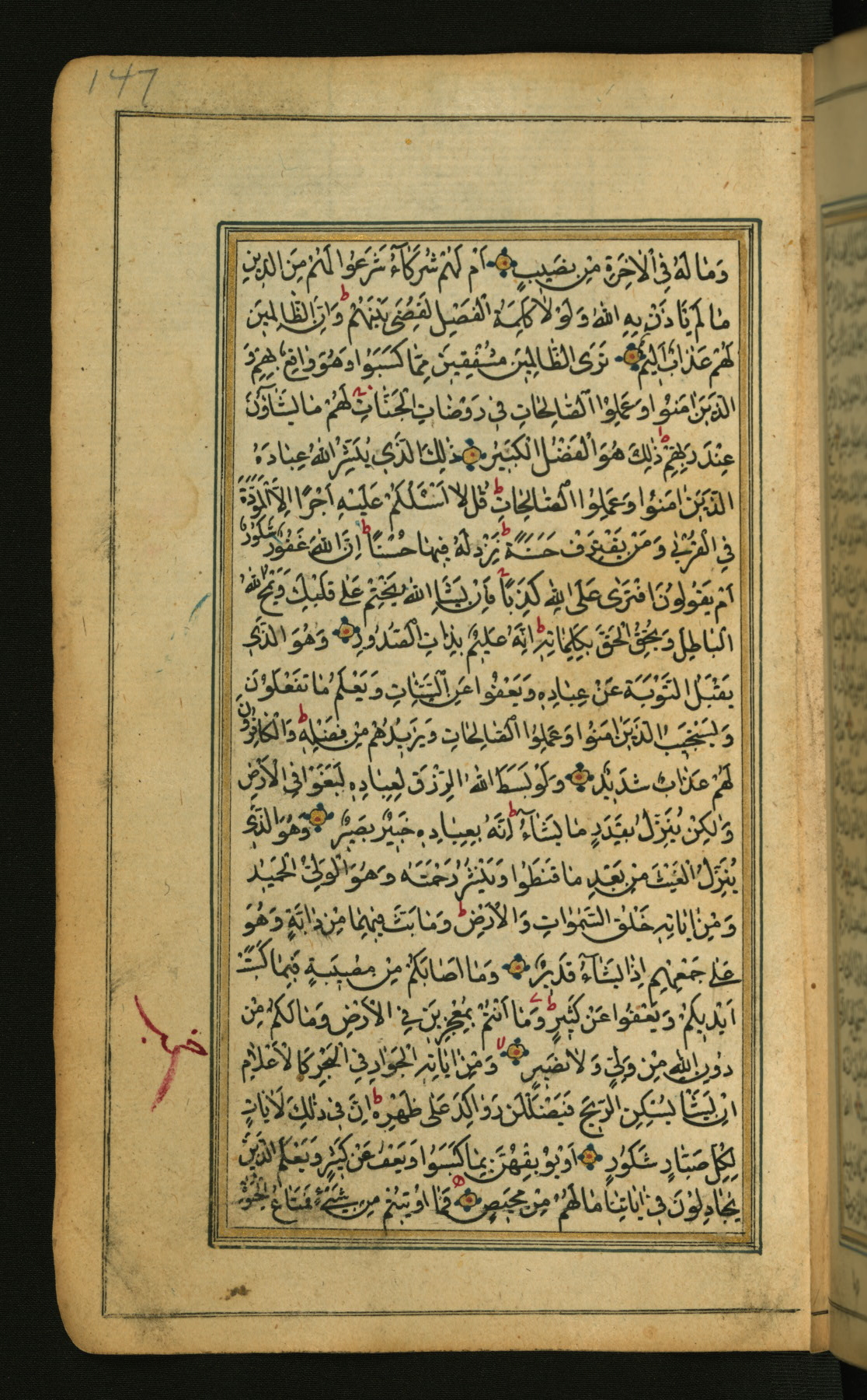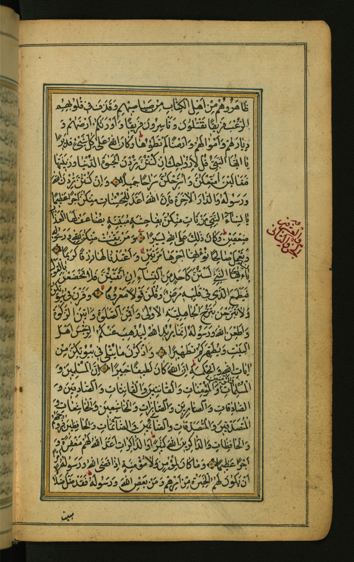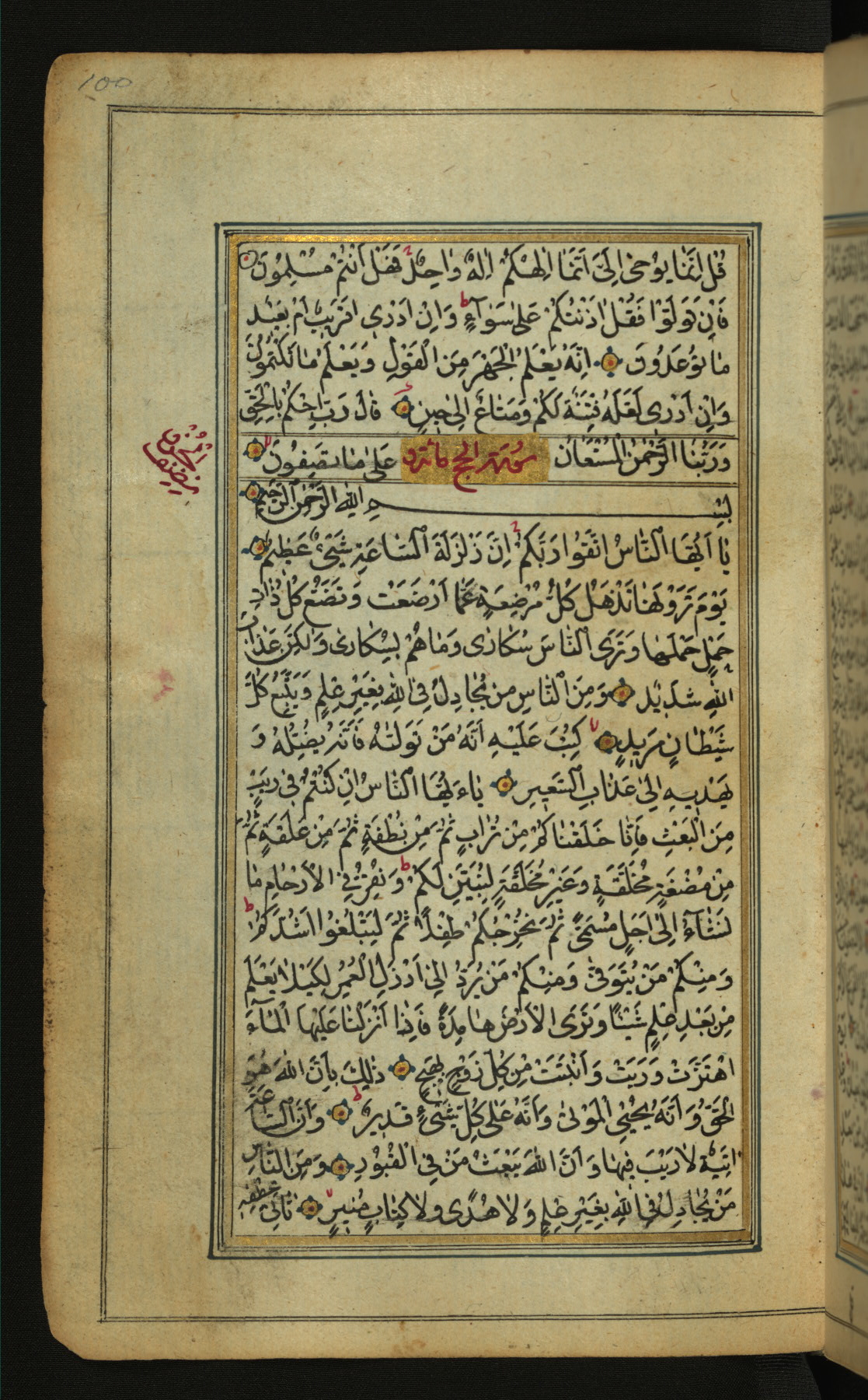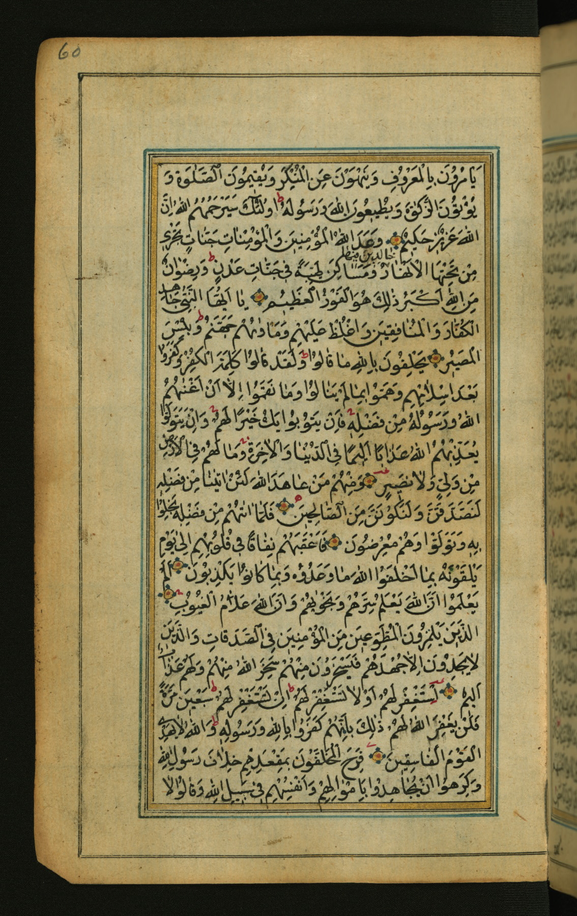 This manuscript is a small illuminated single-volume copy of the Qurʾan, likely produced in Iran. A date is inscribed on the final page, which is interpreted as 1230 AH / 1814-5 CE (fol. 186b). The manuscript opens with an illuminated double-page incipit with the verses of chapter 1 (Sūrat al-fātiḥah) and the initial verses of chapter 2 (Sūrat al-baqarah), decorated with interlinear illumination (fols. 1b-2a). The text is in vocalized naskh script in black ink with reading marks in red and text divisions, such as thirty verses (juzʾ) or sixty verses (ḥizb), in the margins. Illuminated discs with colored dots separate the verses. Chapter headings are in riqāʿ script in red ink on a gold ground. The nineteenth-century lacquer binding with a floral composition on a gold field on the upper and lower boards seems to be contemporary with the manuscript. The insides of both boards are painted with a lobed yellow central medallion and pendants on an orange field.