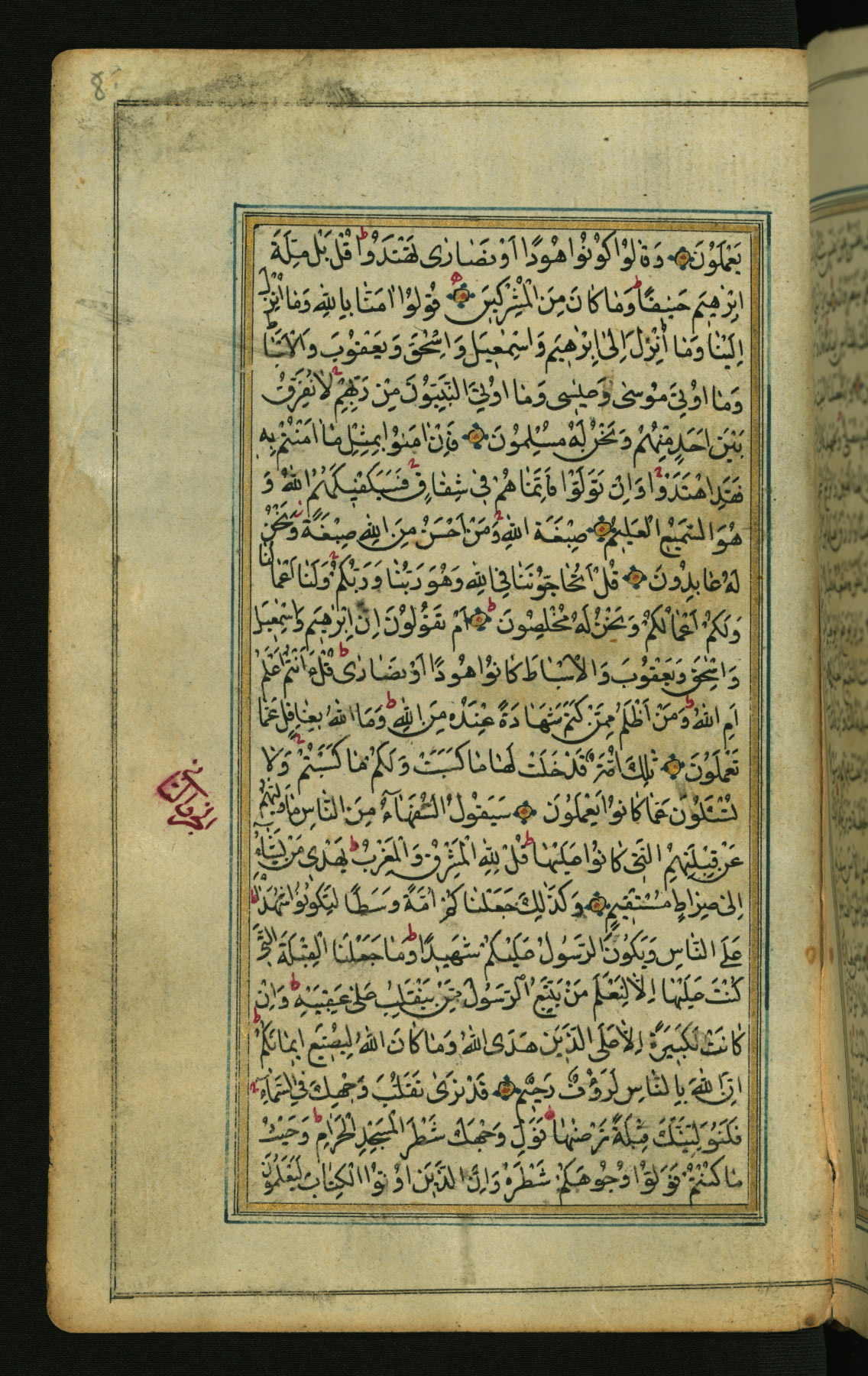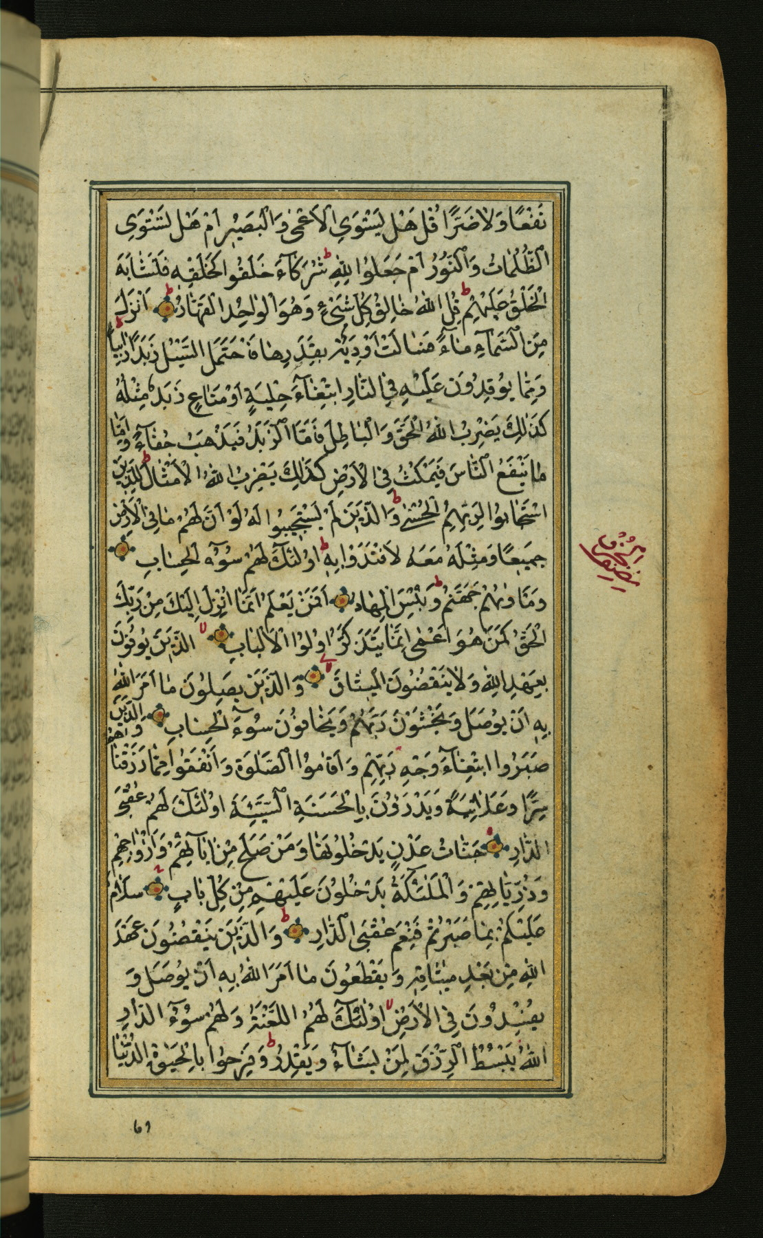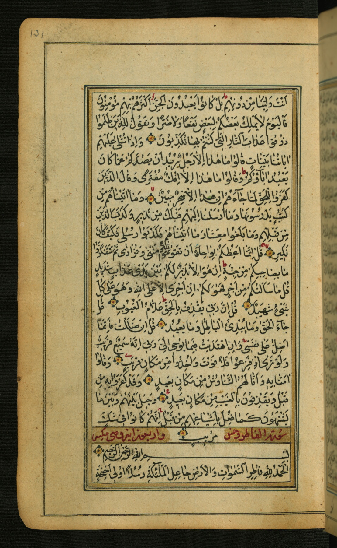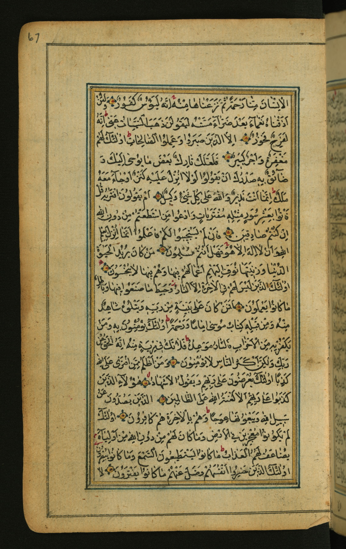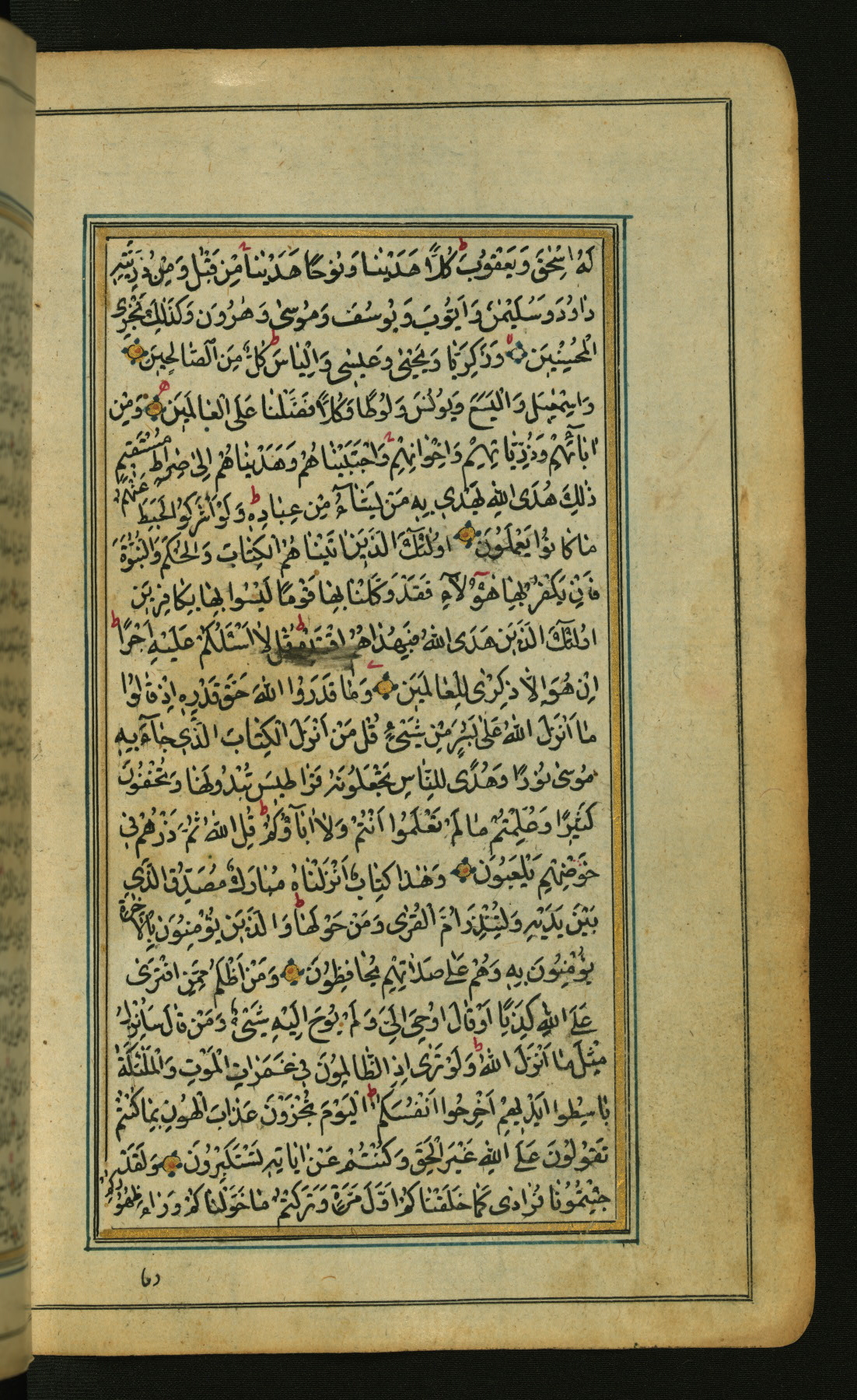 This manuscript is a small illuminated single-volume copy of the Qurʾan, likely produced in Iran. A date is inscribed on the final page, which is interpreted as 1230 AH / 1814-5 CE (fol. 186b). The manuscript opens with an illuminated double-page incipit with the verses of chapter 1 (Sūrat al-fātiḥah) and the initial verses of chapter 2 (Sūrat al-baqarah), decorated with interlinear illumination (fols. 1b-2a). The text is in vocalized naskh script in black ink with reading marks in red and text divisions, such as thirty verses (juzʾ) or sixty verses (ḥizb), in the margins. Illuminated discs with colored dots separate the verses. Chapter headings are in riqāʿ script in red ink on a gold ground. The nineteenth-century lacquer binding with a floral composition on a gold field on the upper and lower boards seems to be contemporary with the manuscript. The insides of both boards are painted with a lobed yellow central medallion and pendants on an orange field.