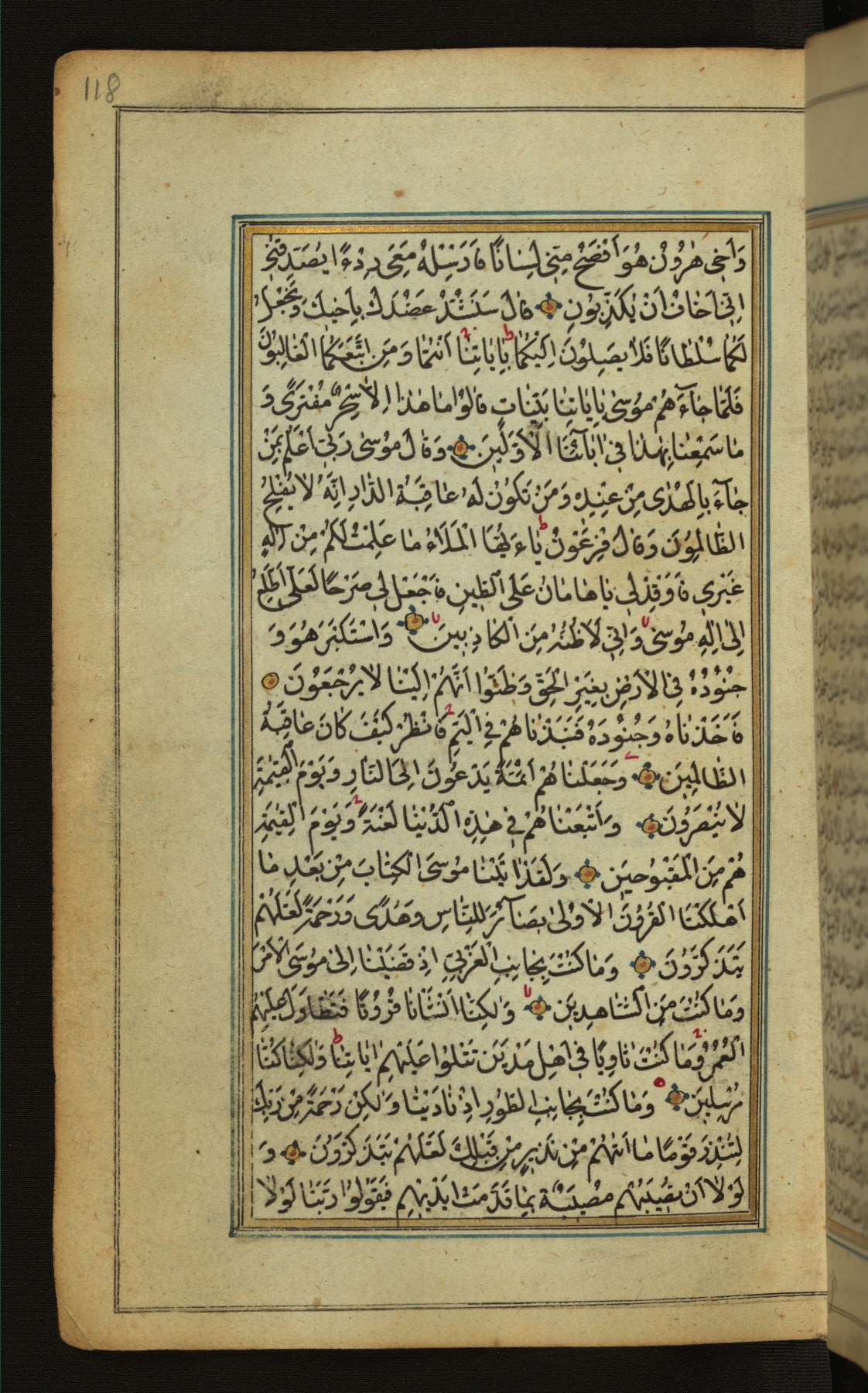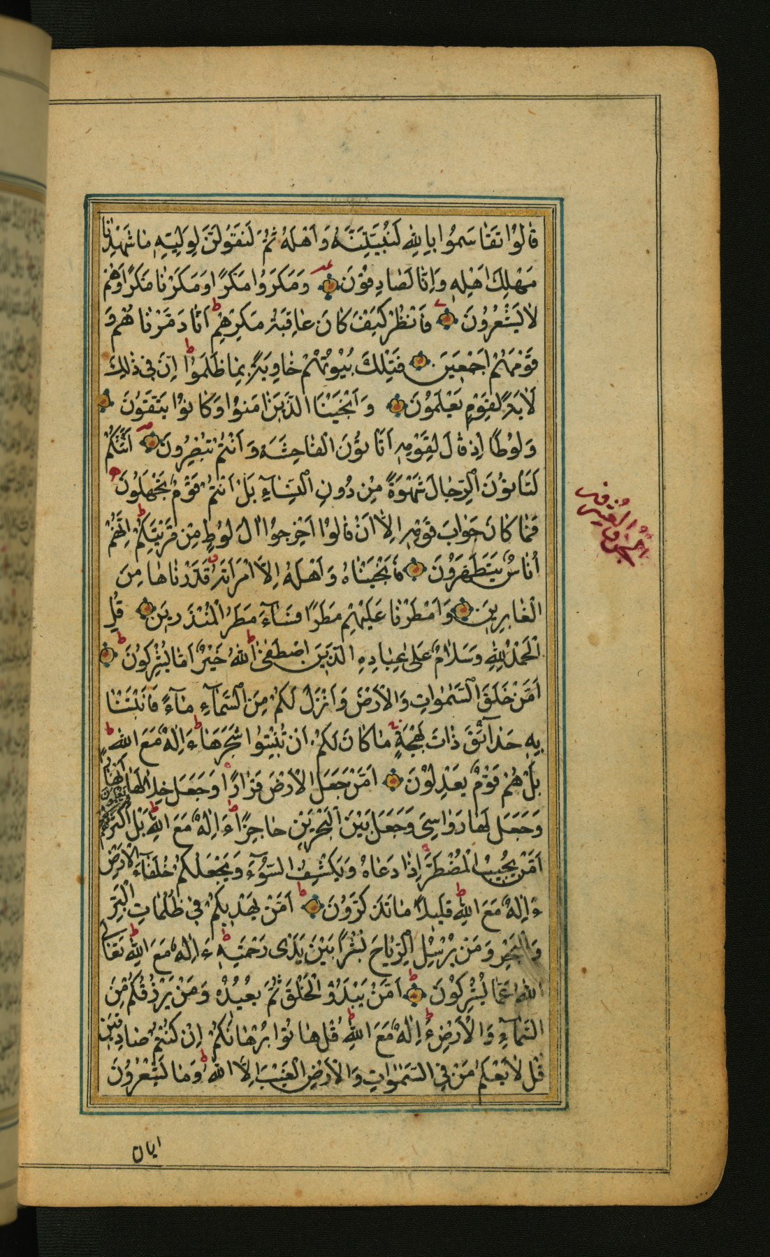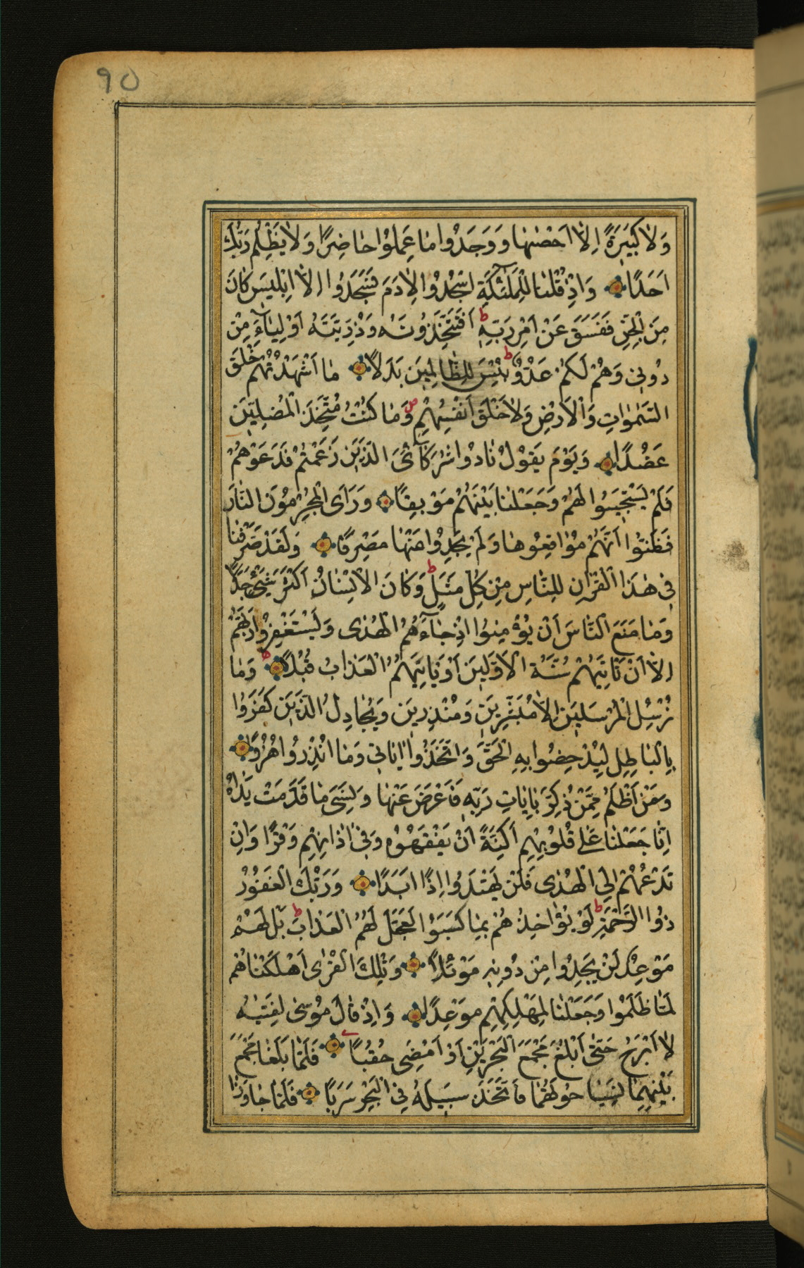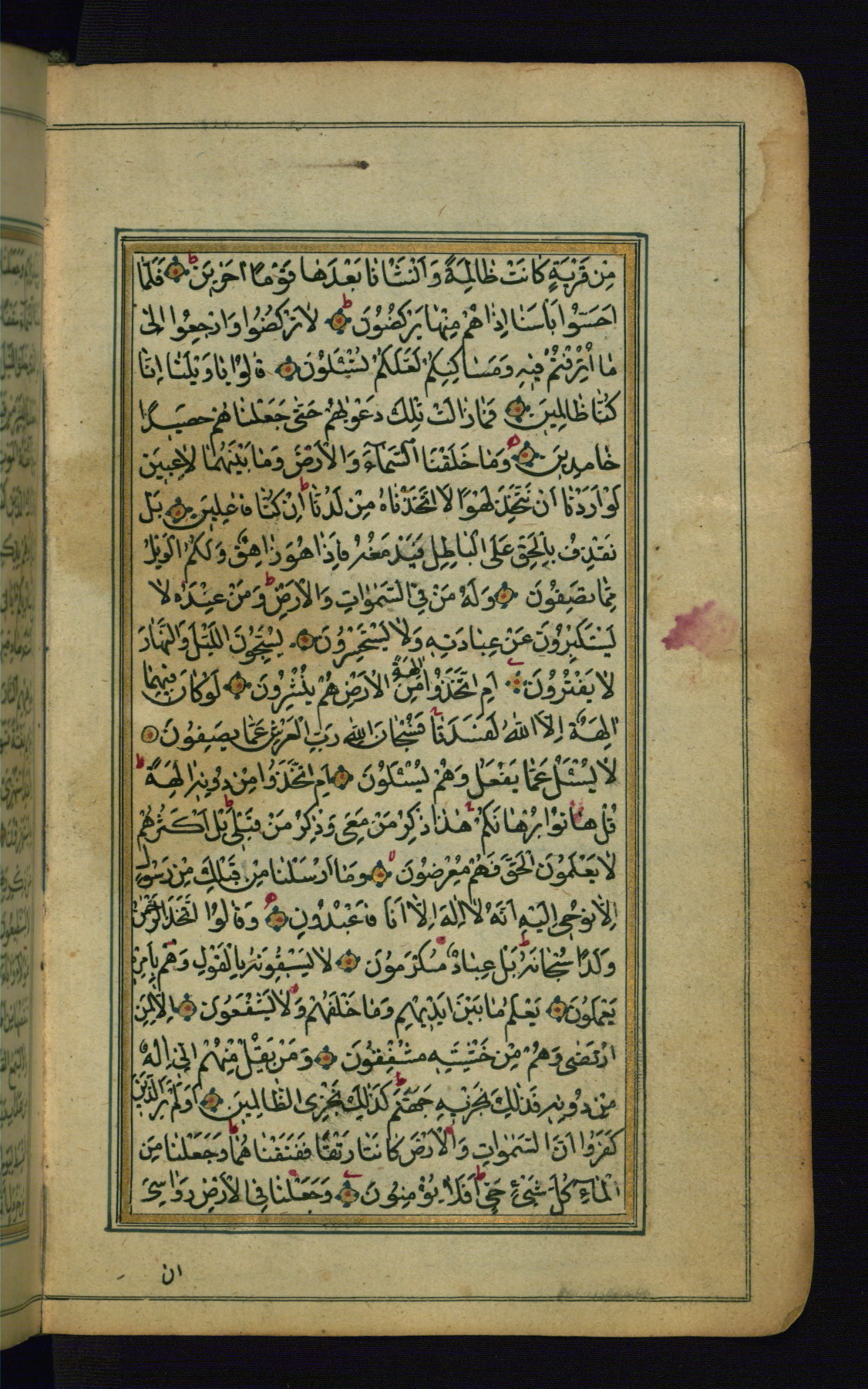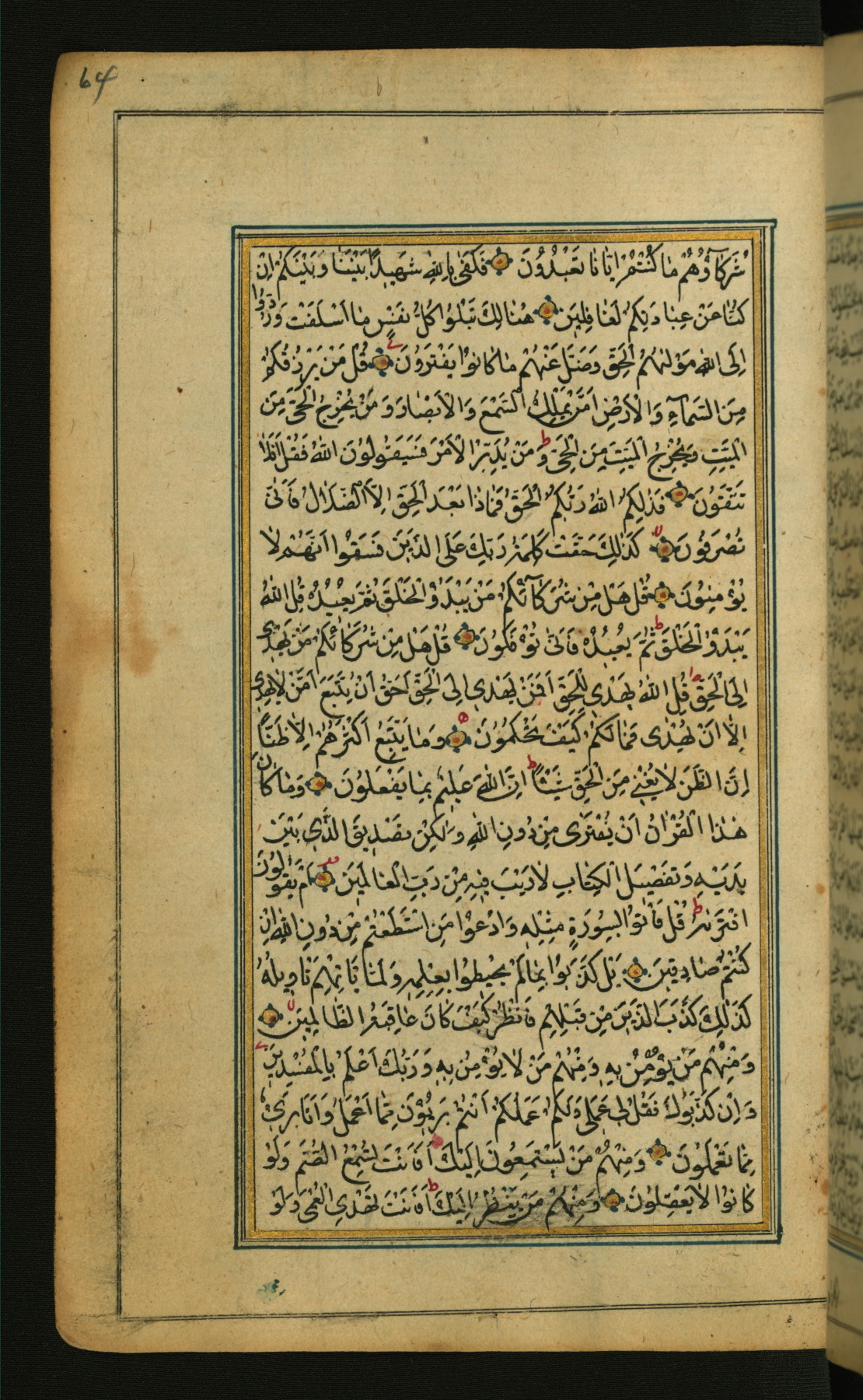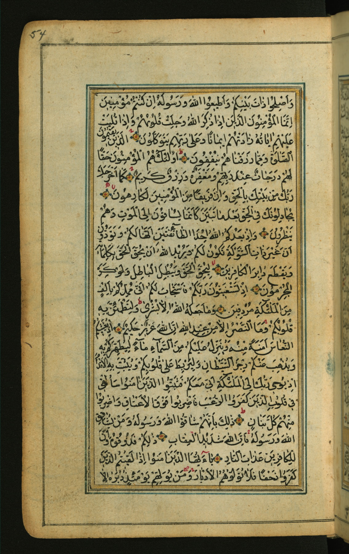 This manuscript is a small illuminated single-volume copy of the Qurʾan, likely produced in Iran. A date is inscribed on the final page, which is interpreted as 1230 AH / 1814-5 CE (fol. 186b). The manuscript opens with an illuminated double-page incipit with the verses of chapter 1 (Sūrat al-fātiḥah) and the initial verses of chapter 2 (Sūrat al-baqarah), decorated with interlinear illumination (fols. 1b-2a). The text is in vocalized naskh script in black ink with reading marks in red and text divisions, such as thirty verses (juzʾ) or sixty verses (ḥizb), in the margins. Illuminated discs with colored dots separate the verses. Chapter headings are in riqāʿ script in red ink on a gold ground. The nineteenth-century lacquer binding with a floral composition on a gold field on the upper and lower boards seems to be contemporary with the manuscript. The insides of both boards are painted with a lobed yellow central medallion and pendants on an orange field.