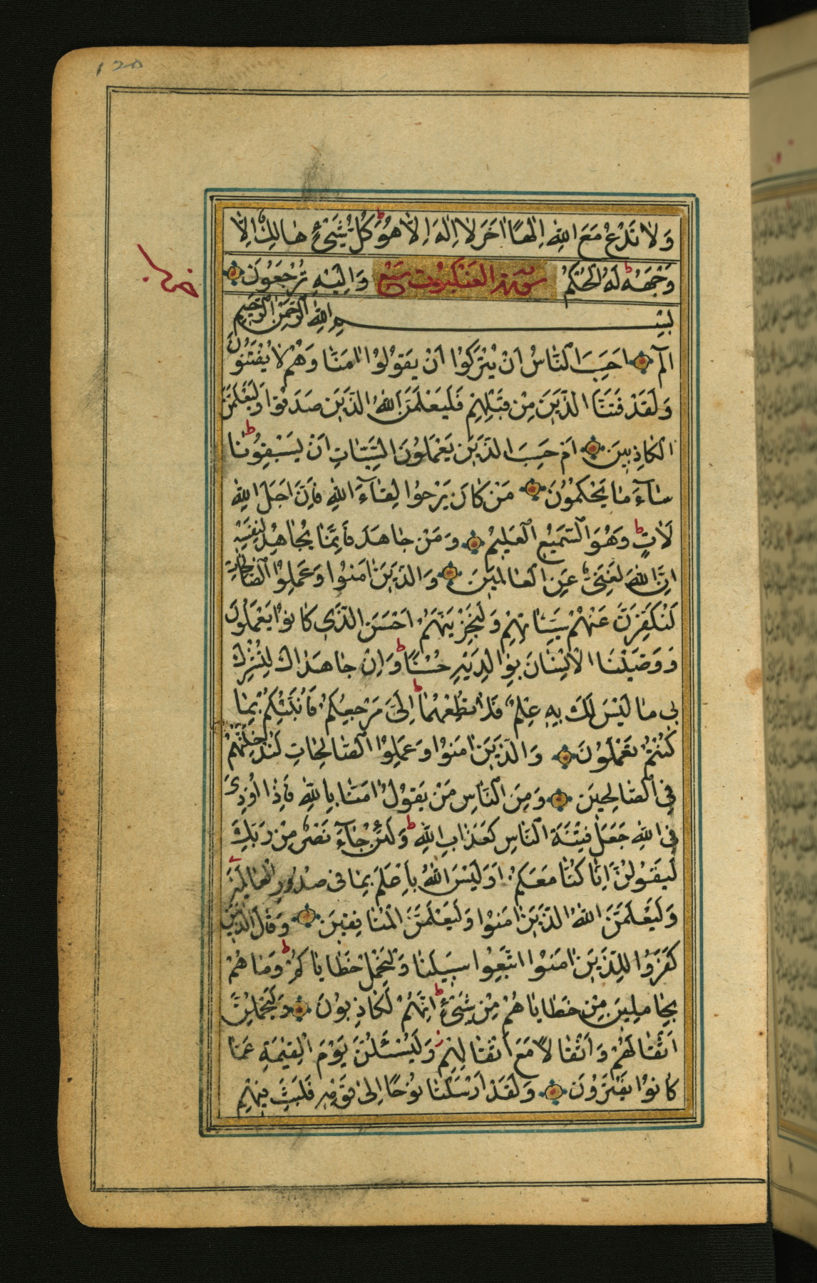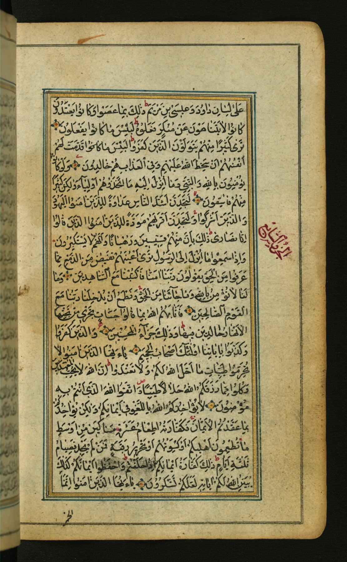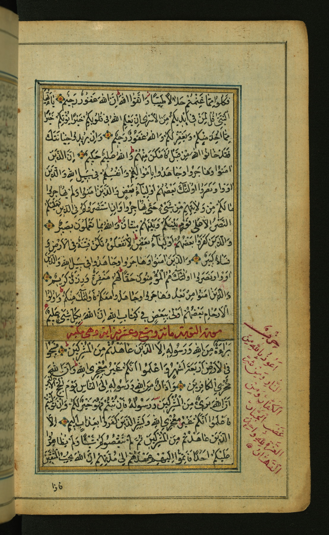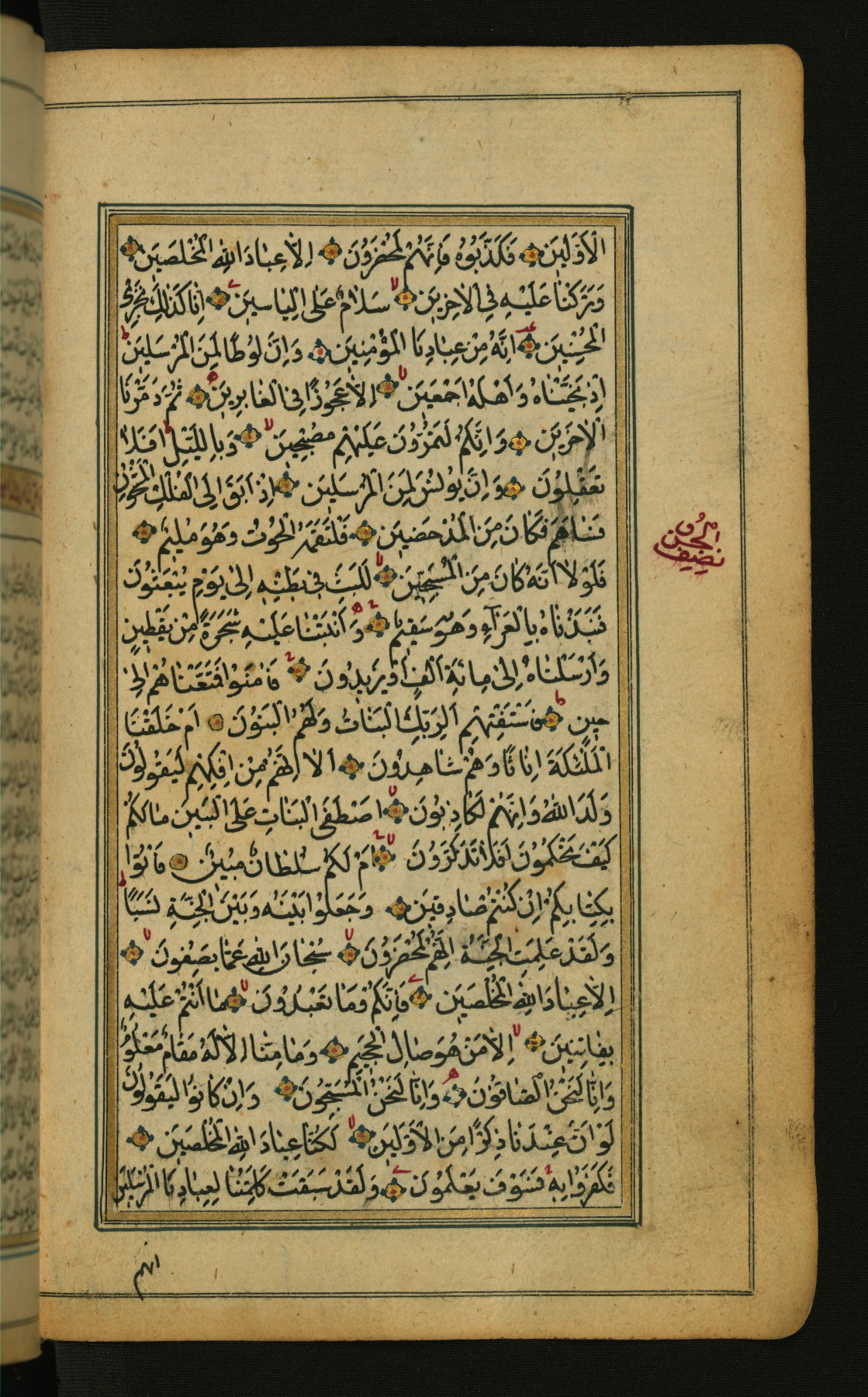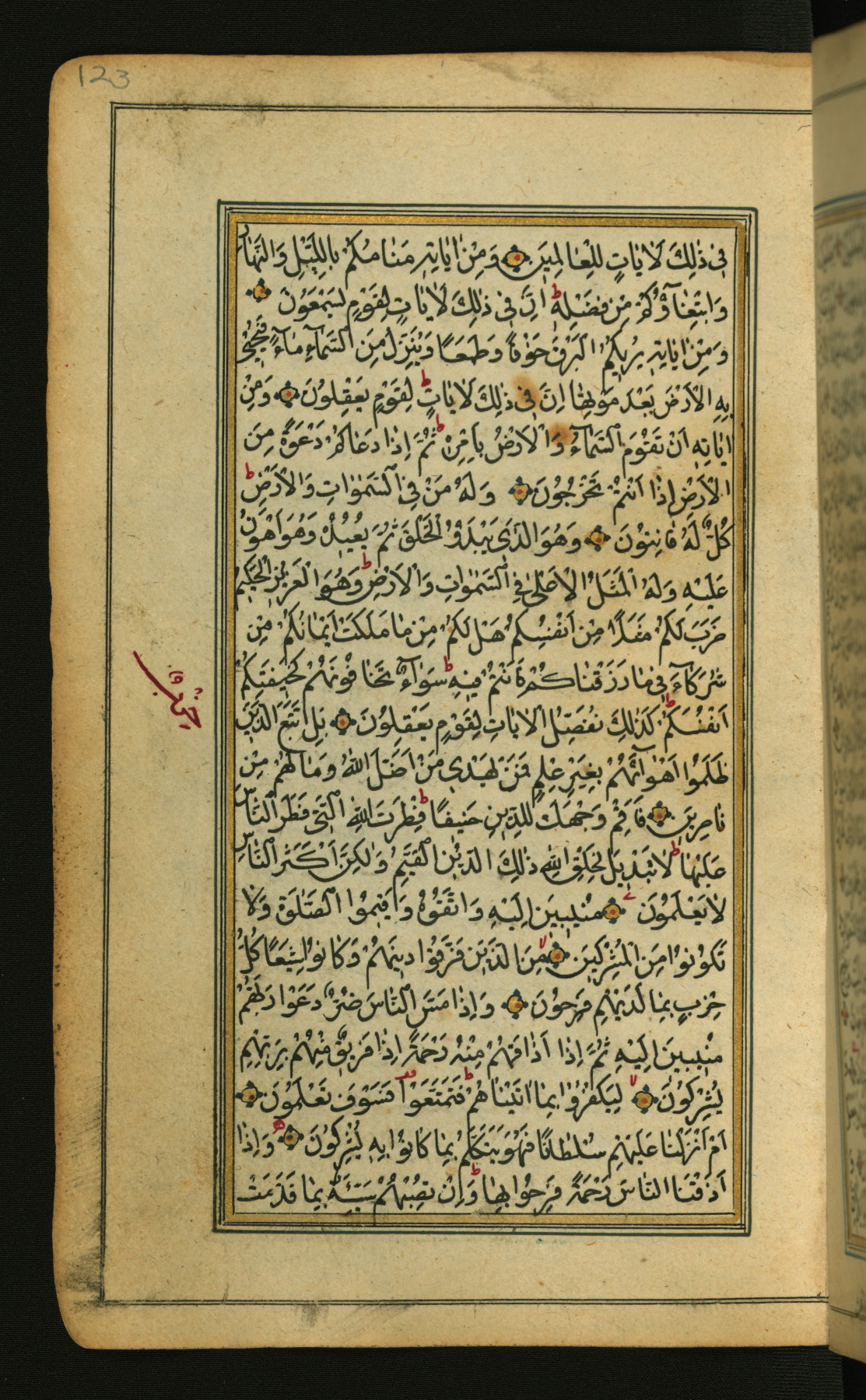 This manuscript is a small illuminated single-volume copy of the Qurʾan, likely produced in Iran. A date is inscribed on the final page, which is interpreted as 1230 AH / 1814-5 CE (fol. 186b). The manuscript opens with an illuminated double-page incipit with the verses of chapter 1 (Sūrat al-fātiḥah) and the initial verses of chapter 2 (Sūrat al-baqarah), decorated with interlinear illumination (fols. 1b-2a). The text is in vocalized naskh script in black ink with reading marks in red and text divisions, such as thirty verses (juzʾ) or sixty verses (ḥizb), in the margins. Illuminated discs with colored dots separate the verses. Chapter headings are in riqāʿ script in red ink on a gold ground. The nineteenth-century lacquer binding with a floral composition on a gold field on the upper and lower boards seems to be contemporary with the manuscript. The insides of both boards are painted with a lobed yellow central medallion and pendants on an orange field.