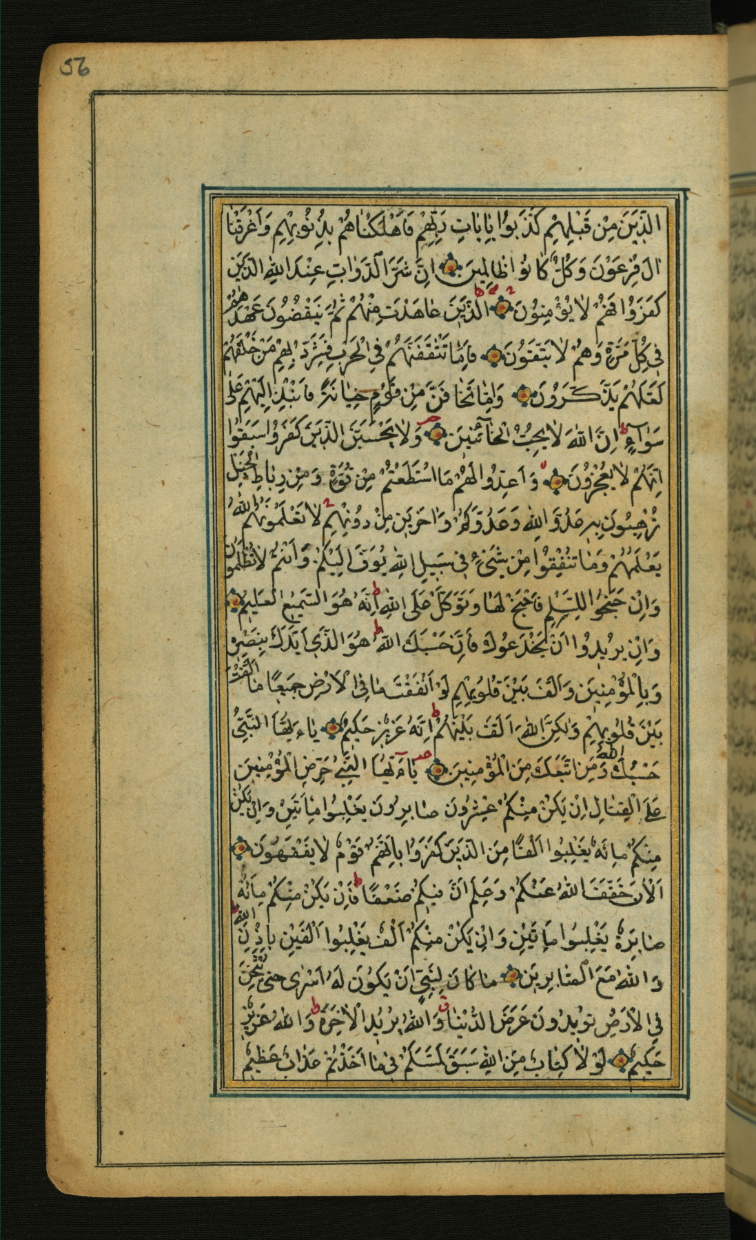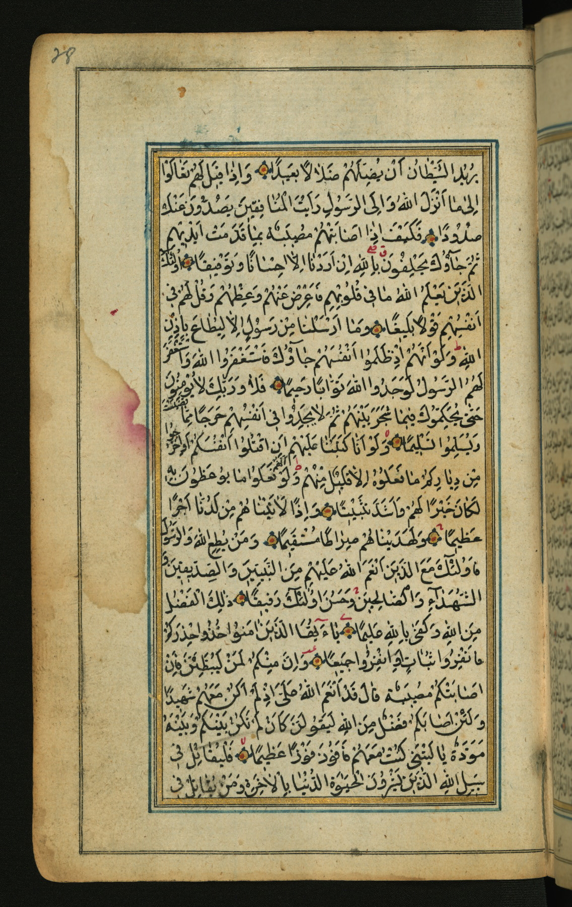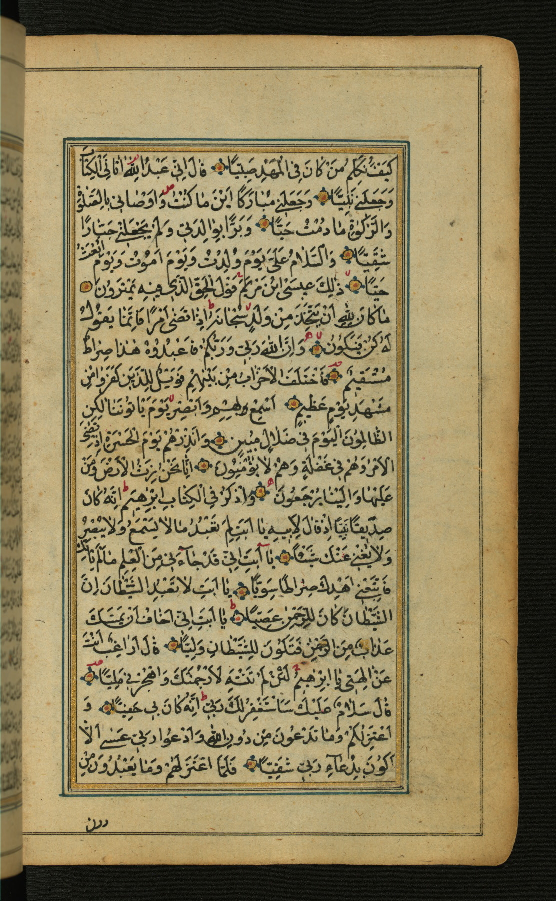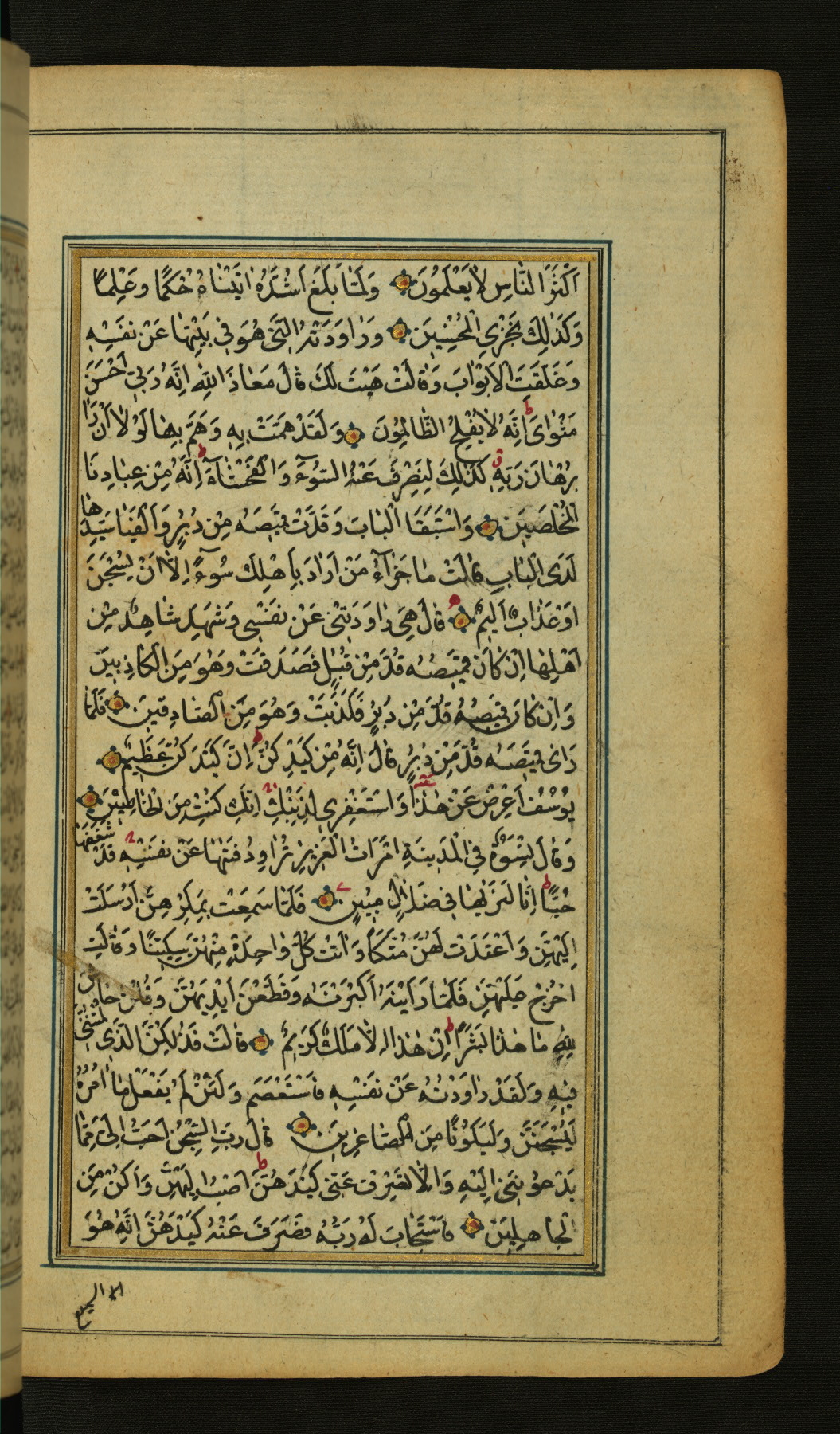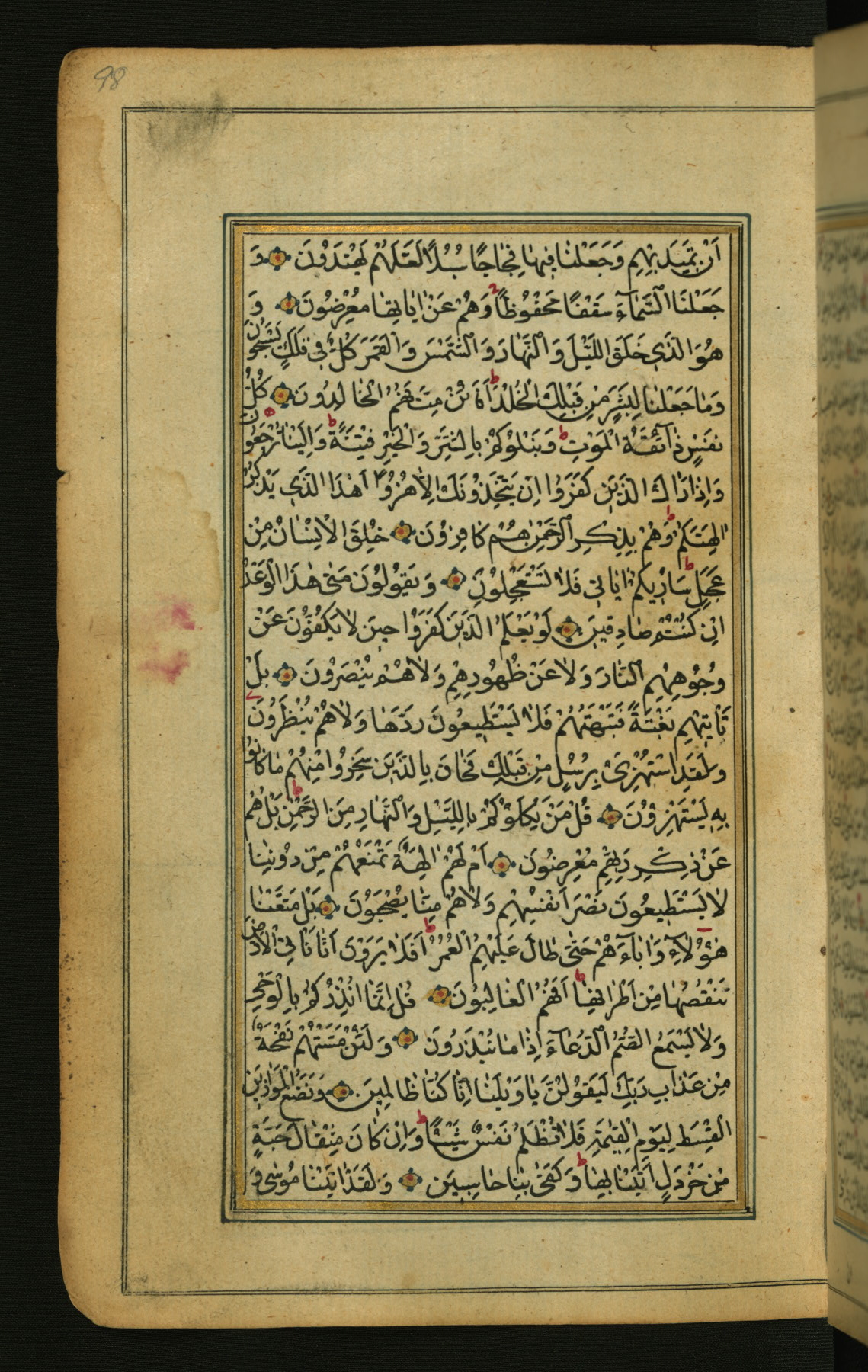 This manuscript is a small illuminated single-volume copy of the Qurʾan, likely produced in Iran. A date is inscribed on the final page, which is interpreted as 1230 AH / 1814-5 CE (fol. 186b). The manuscript opens with an illuminated double-page incipit with the verses of chapter 1 (Sūrat al-fātiḥah) and the initial verses of chapter 2 (Sūrat al-baqarah), decorated with interlinear illumination (fols. 1b-2a). The text is in vocalized naskh script in black ink with reading marks in red and text divisions, such as thirty verses (juzʾ) or sixty verses (ḥizb), in the margins. Illuminated discs with colored dots separate the verses. Chapter headings are in riqāʿ script in red ink on a gold ground. The nineteenth-century lacquer binding with a floral composition on a gold field on the upper and lower boards seems to be contemporary with the manuscript. The insides of both boards are painted with a lobed yellow central medallion and pendants on an orange field.