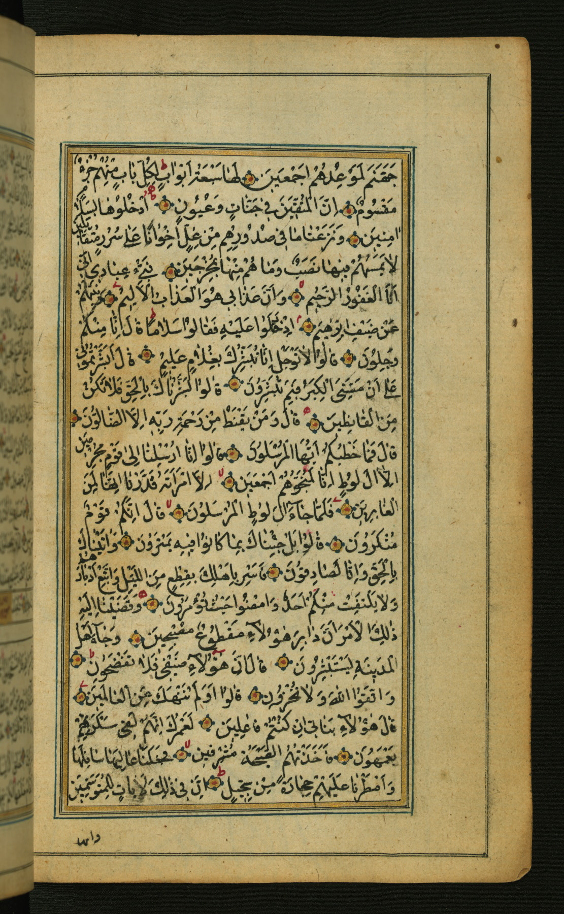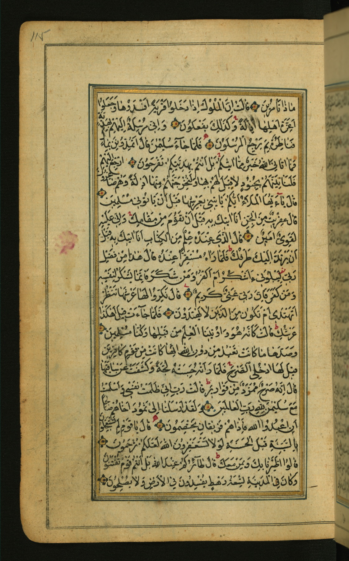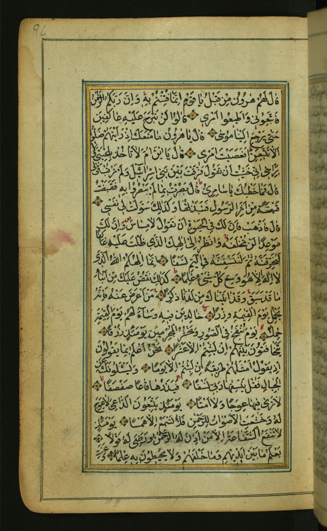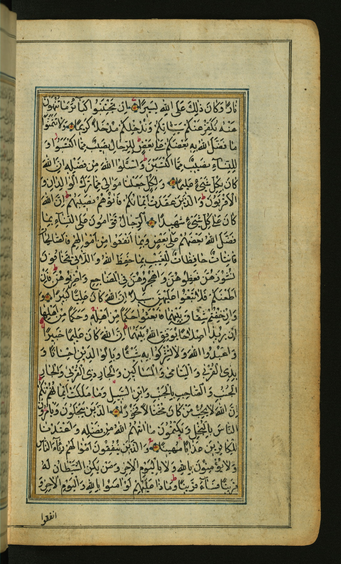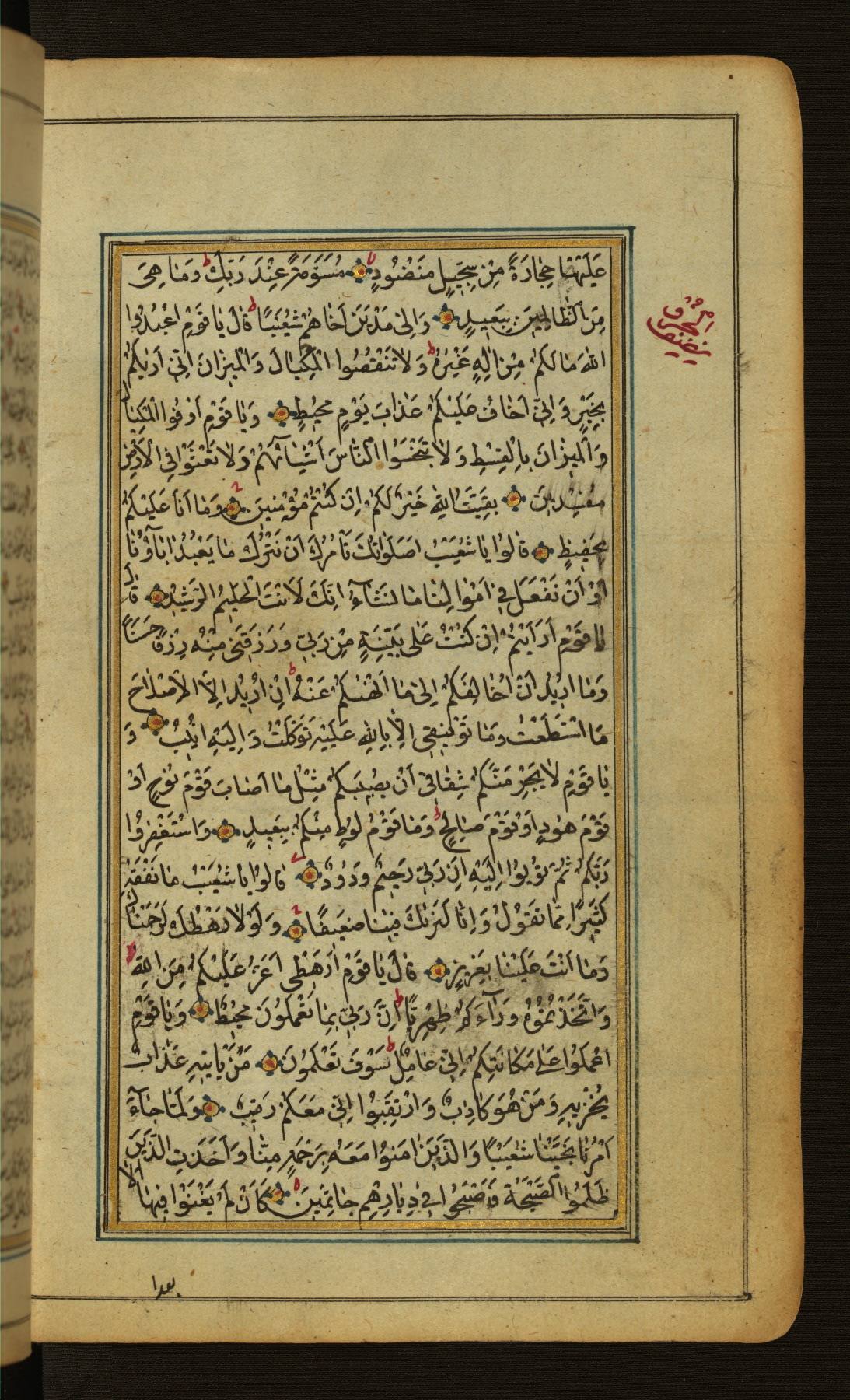 This manuscript is a small illuminated single-volume copy of the Qurʾan, likely produced in Iran. A date is inscribed on the final page, which is interpreted as 1230 AH / 1814-5 CE (fol. 186b). The manuscript opens with an illuminated double-page incipit with the verses of chapter 1 (Sūrat al-fātiḥah) and the initial verses of chapter 2 (Sūrat al-baqarah), decorated with interlinear illumination (fols. 1b-2a). The text is in vocalized naskh script in black ink with reading marks in red and text divisions, such as thirty verses (juzʾ) or sixty verses (ḥizb), in the margins. Illuminated discs with colored dots separate the verses. Chapter headings are in riqāʿ script in red ink on a gold ground. The nineteenth-century lacquer binding with a floral composition on a gold field on the upper and lower boards seems to be contemporary with the manuscript. The insides of both boards are painted with a lobed yellow central medallion and pendants on an orange field.