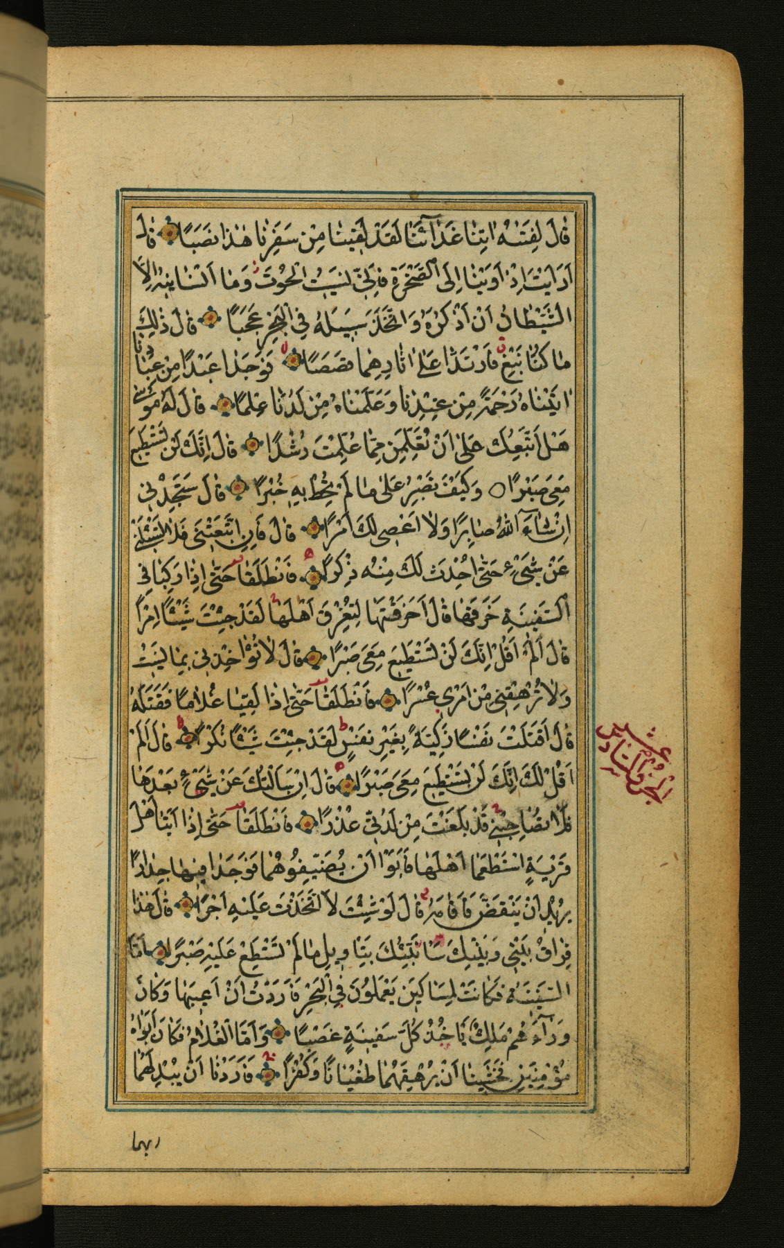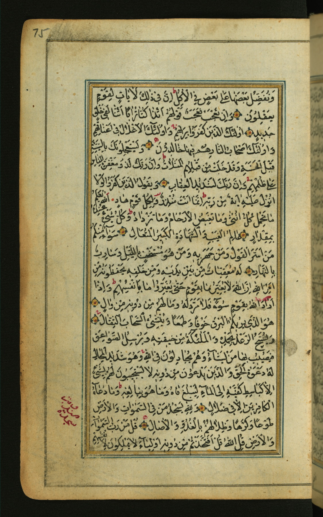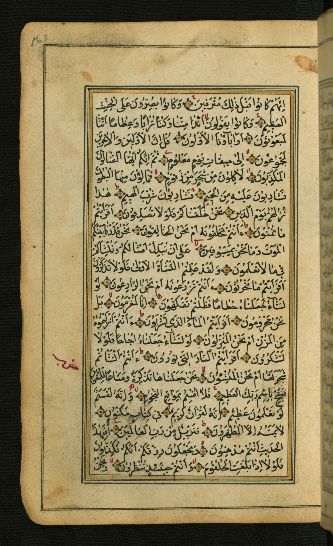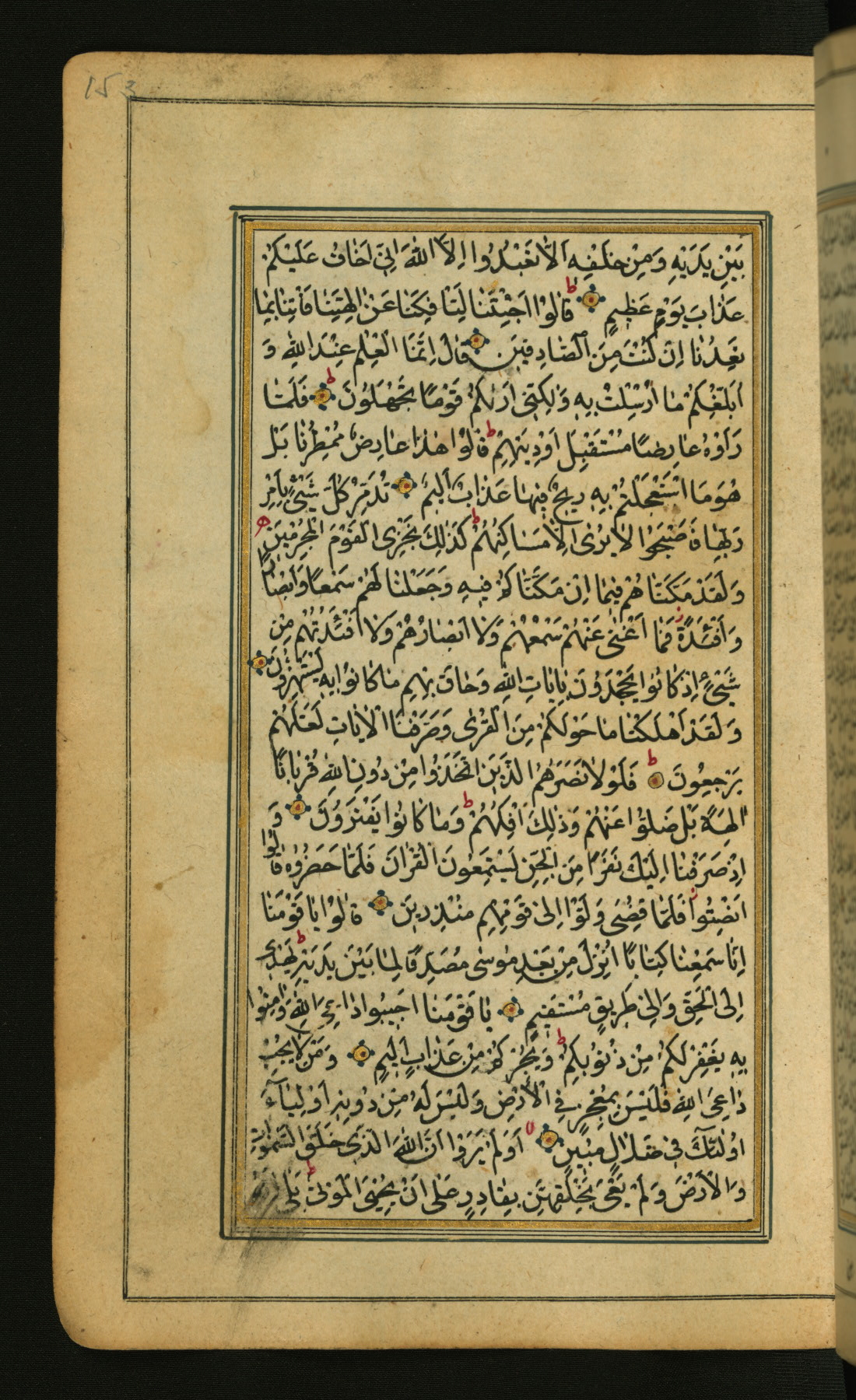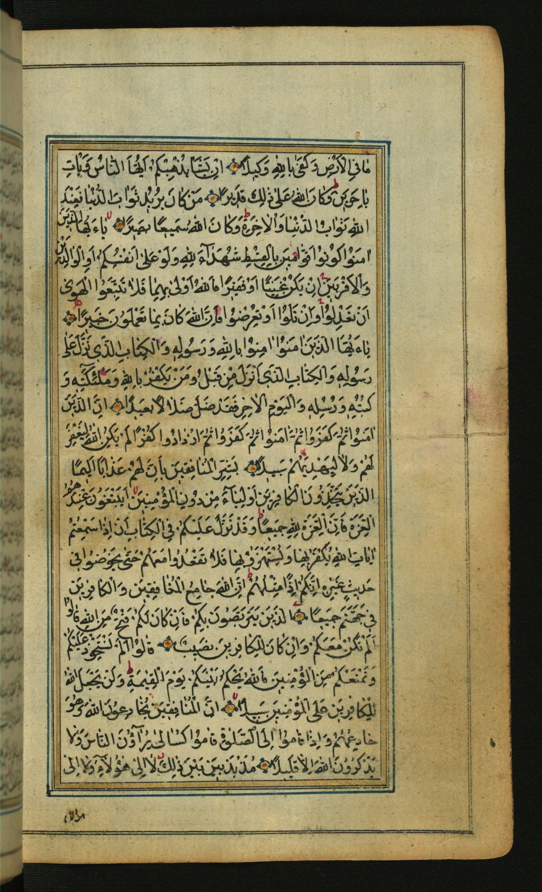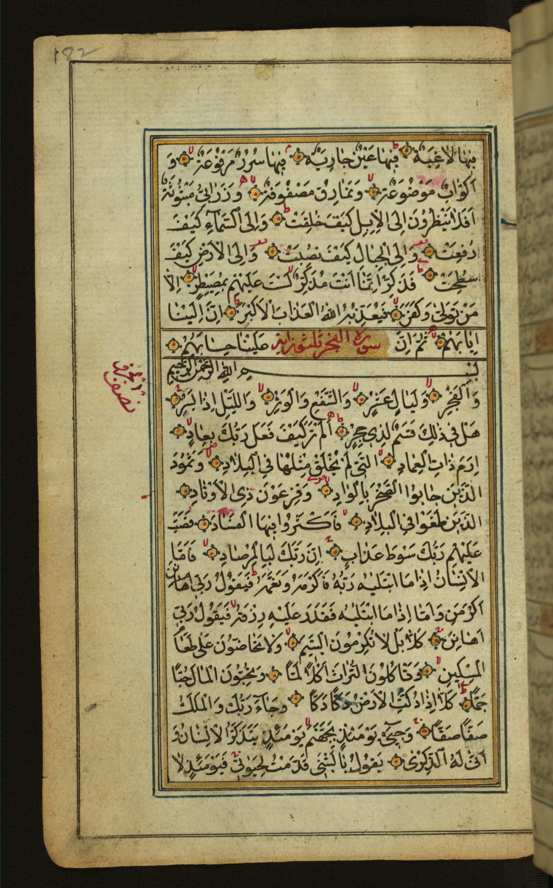 This manuscript is a small illuminated single-volume copy of the Qurʾan, likely produced in Iran. A date is inscribed on the final page, which is interpreted as 1230 AH / 1814-5 CE (fol. 186b). The manuscript opens with an illuminated double-page incipit with the verses of chapter 1 (Sūrat al-fātiḥah) and the initial verses of chapter 2 (Sūrat al-baqarah), decorated with interlinear illumination (fols. 1b-2a). The text is in vocalized naskh script in black ink with reading marks in red and text divisions, such as thirty verses (juzʾ) or sixty verses (ḥizb), in the margins. Illuminated discs with colored dots separate the verses. Chapter headings are in riqāʿ script in red ink on a gold ground. The nineteenth-century lacquer binding with a floral composition on a gold field on the upper and lower boards seems to be contemporary with the manuscript. The insides of both boards are painted with a lobed yellow central medallion and pendants on an orange field.