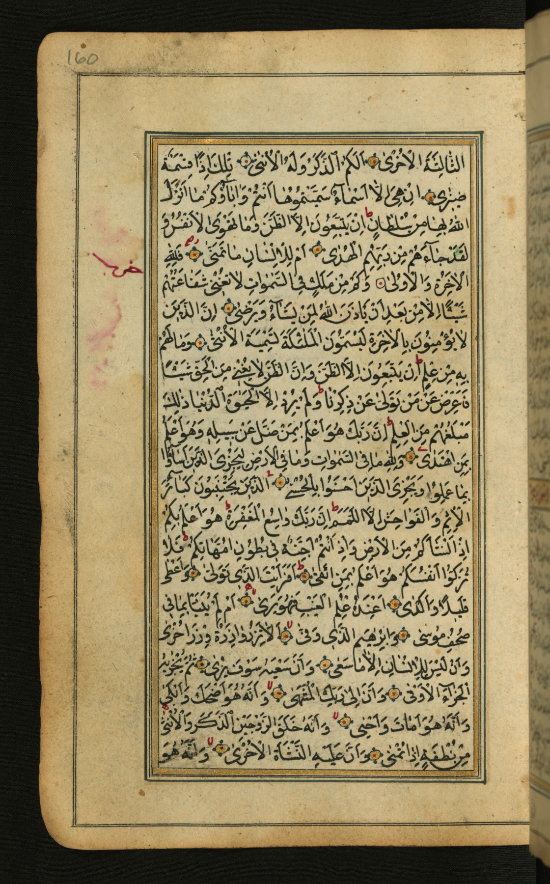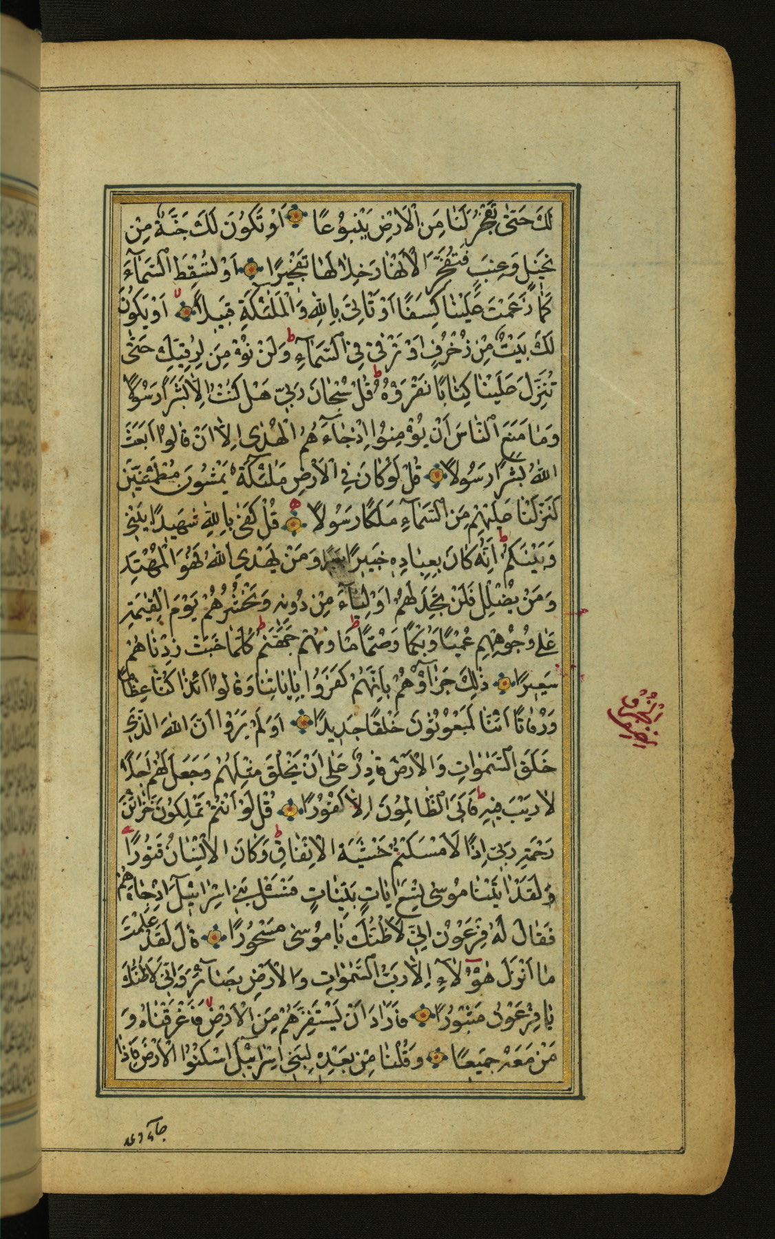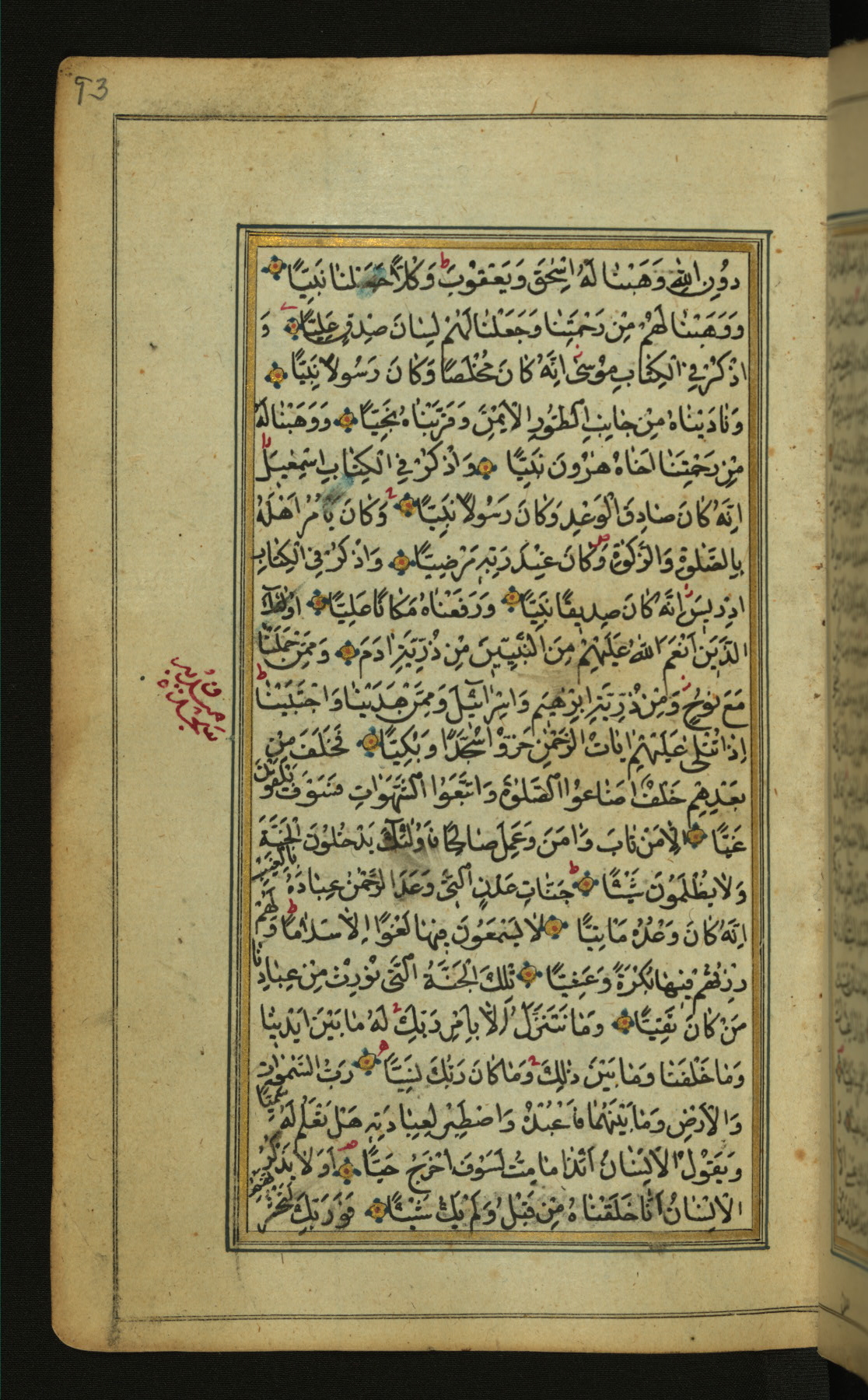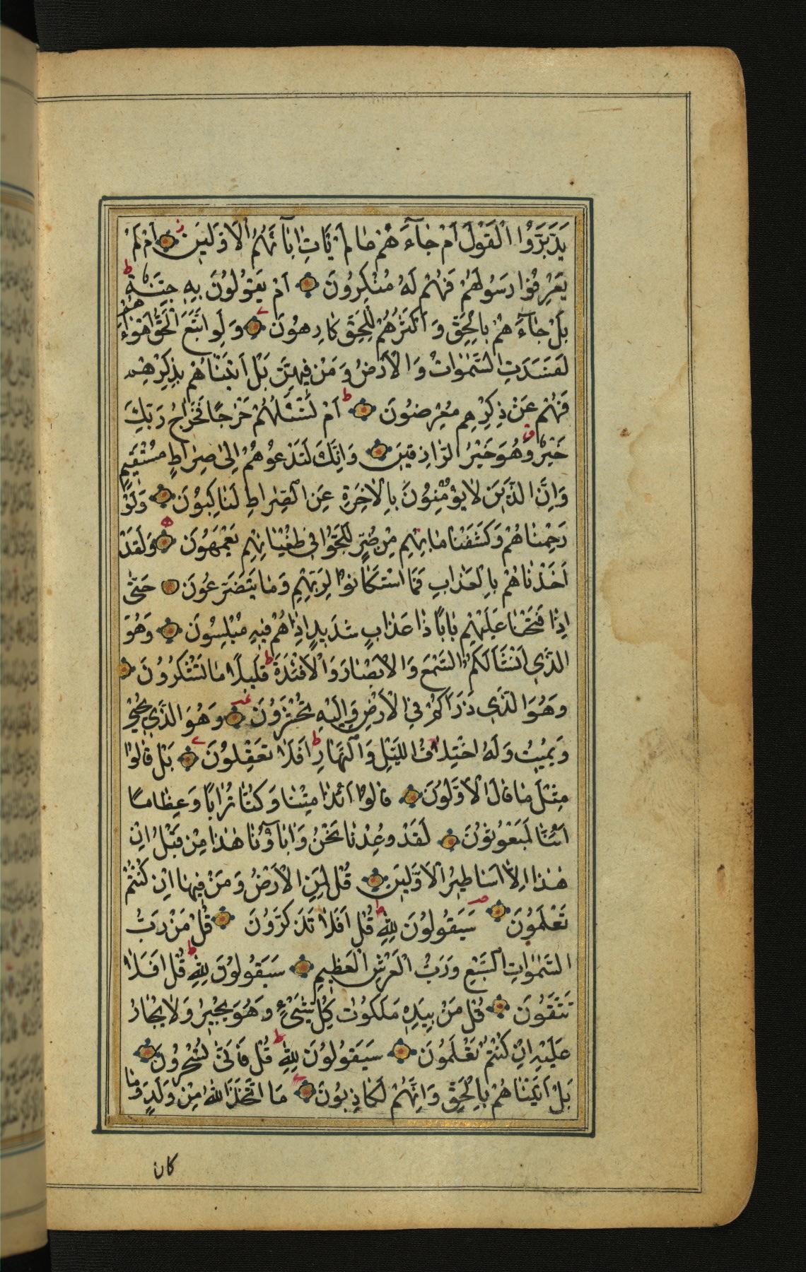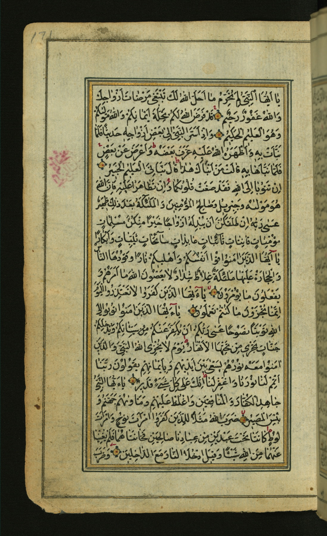 This manuscript is a small illuminated single-volume copy of the Qurʾan, likely produced in Iran. A date is inscribed on the final page, which is interpreted as 1230 AH / 1814-5 CE (fol. 186b). The manuscript opens with an illuminated double-page incipit with the verses of chapter 1 (Sūrat al-fātiḥah) and the initial verses of chapter 2 (Sūrat al-baqarah), decorated with interlinear illumination (fols. 1b-2a). The text is in vocalized naskh script in black ink with reading marks in red and text divisions, such as thirty verses (juzʾ) or sixty verses (ḥizb), in the margins. Illuminated discs with colored dots separate the verses. Chapter headings are in riqāʿ script in red ink on a gold ground. The nineteenth-century lacquer binding with a floral composition on a gold field on the upper and lower boards seems to be contemporary with the manuscript. The insides of both boards are painted with a lobed yellow central medallion and pendants on an orange field.
