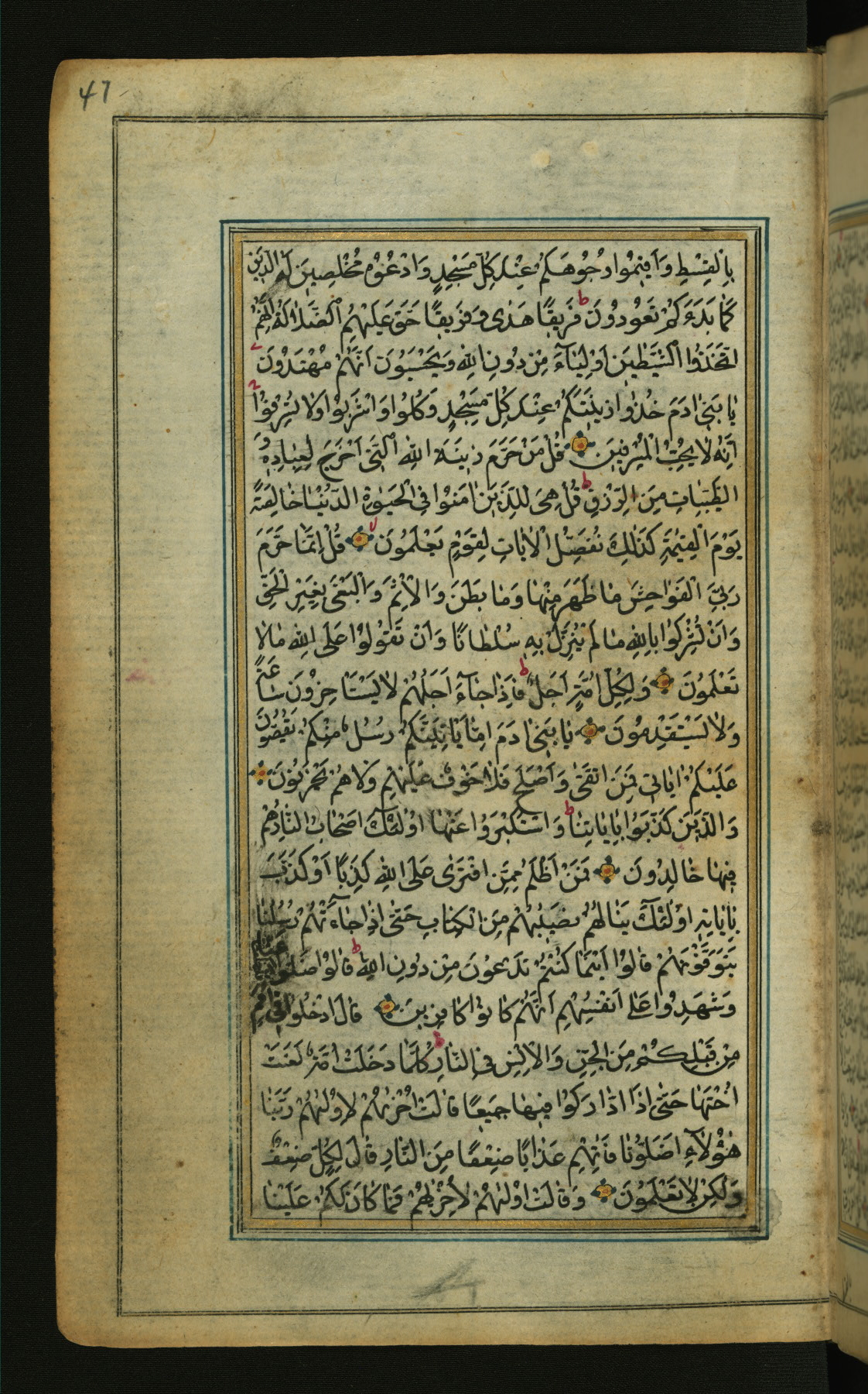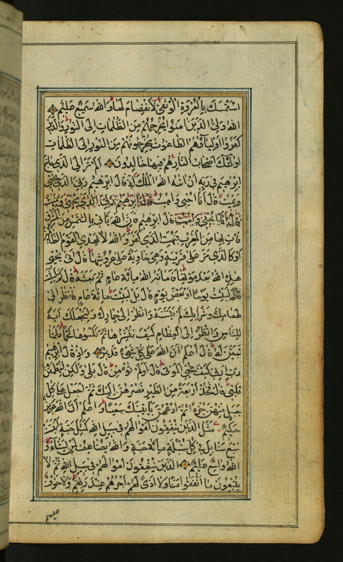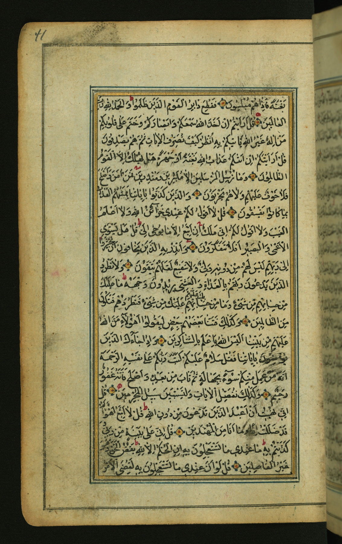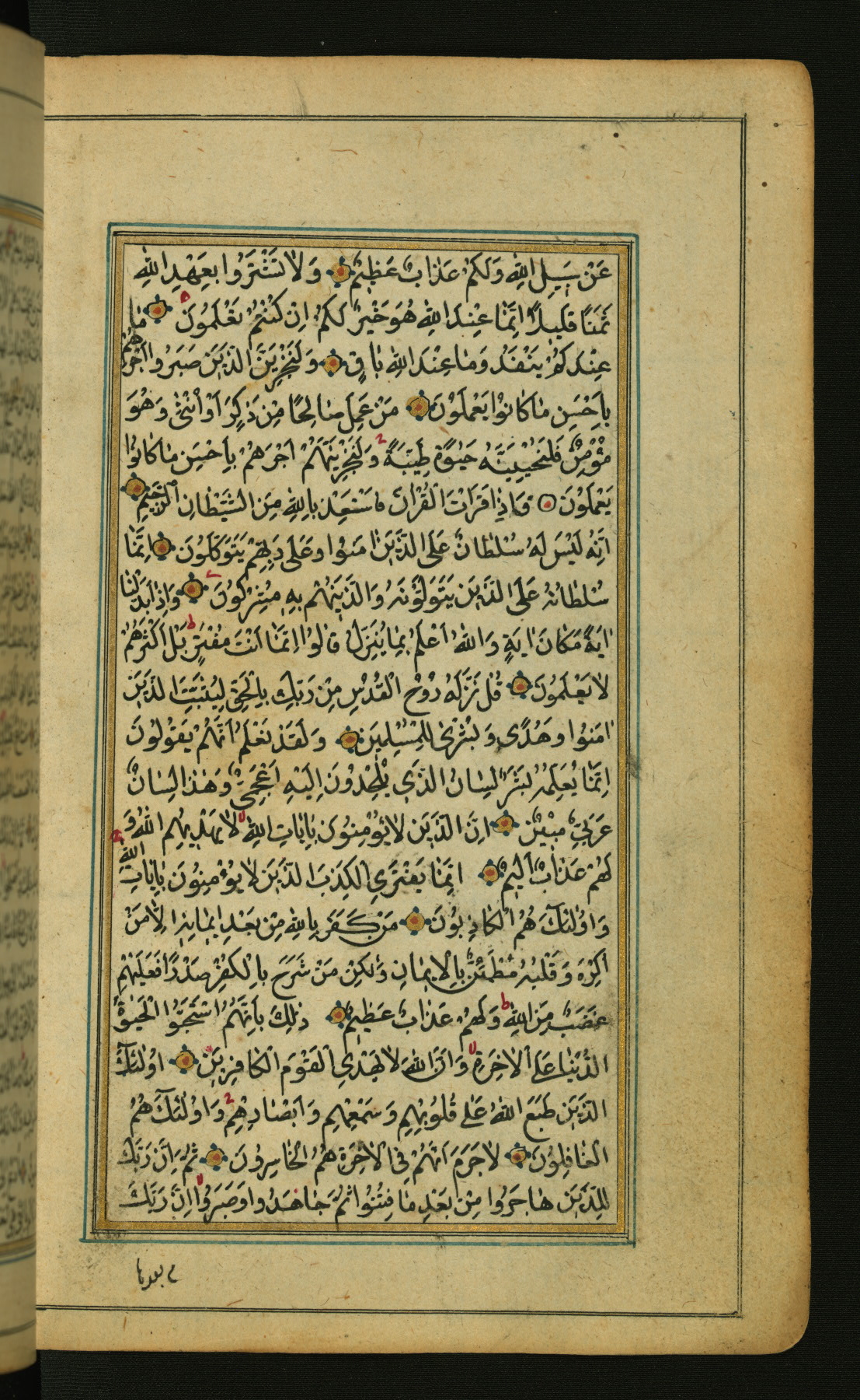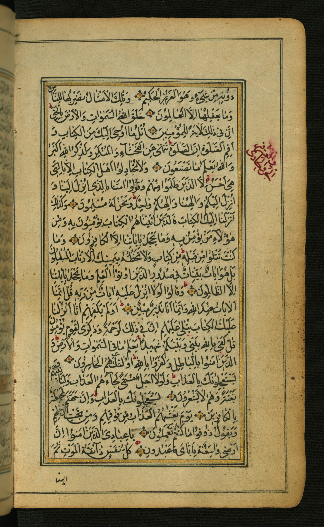 This manuscript is a small illuminated single-volume copy of the Qurʾan, likely produced in Iran. A date is inscribed on the final page, which is interpreted as 1230 AH / 1814-5 CE (fol. 186b). The manuscript opens with an illuminated double-page incipit with the verses of chapter 1 (Sūrat al-fātiḥah) and the initial verses of chapter 2 (Sūrat al-baqarah), decorated with interlinear illumination (fols. 1b-2a). The text is in vocalized naskh script in black ink with reading marks in red and text divisions, such as thirty verses (juzʾ) or sixty verses (ḥizb), in the margins. Illuminated discs with colored dots separate the verses. Chapter headings are in riqāʿ script in red ink on a gold ground. The nineteenth-century lacquer binding with a floral composition on a gold field on the upper and lower boards seems to be contemporary with the manuscript. The insides of both boards are painted with a lobed yellow central medallion and pendants on an orange field.