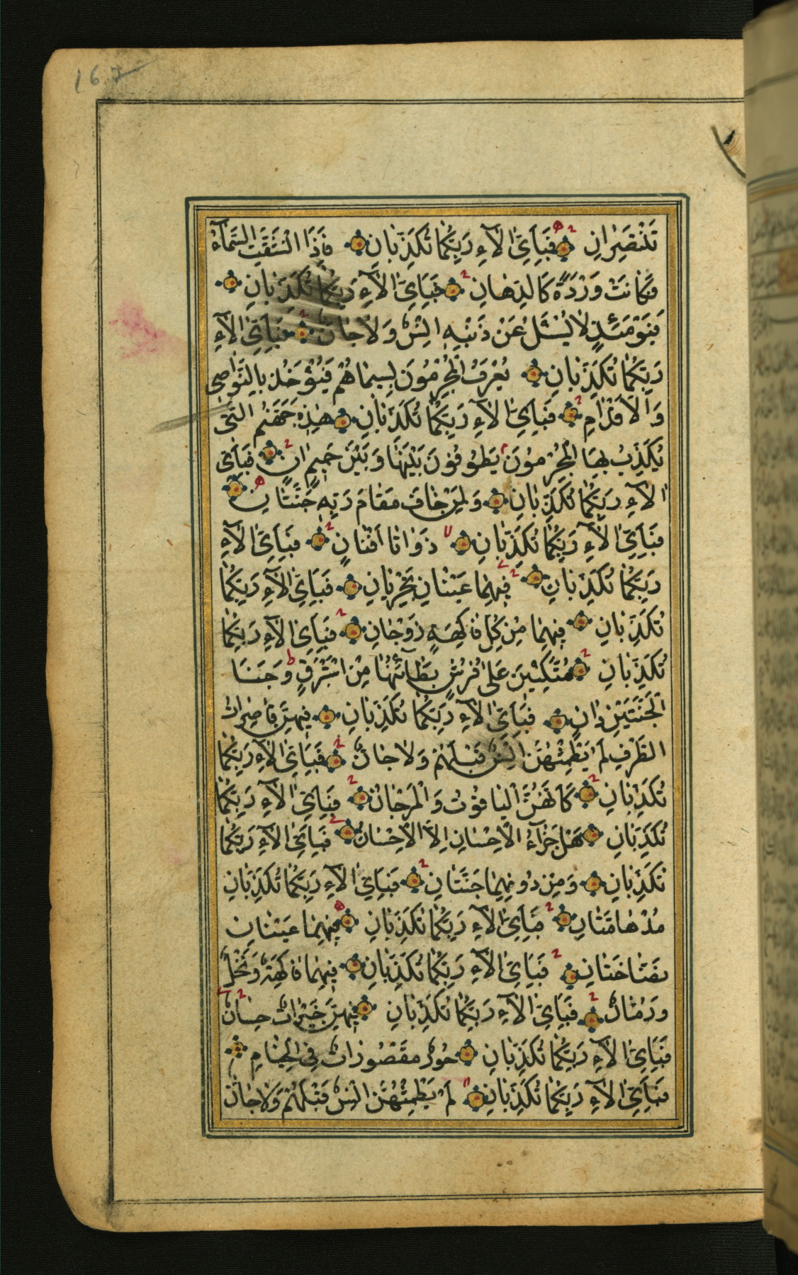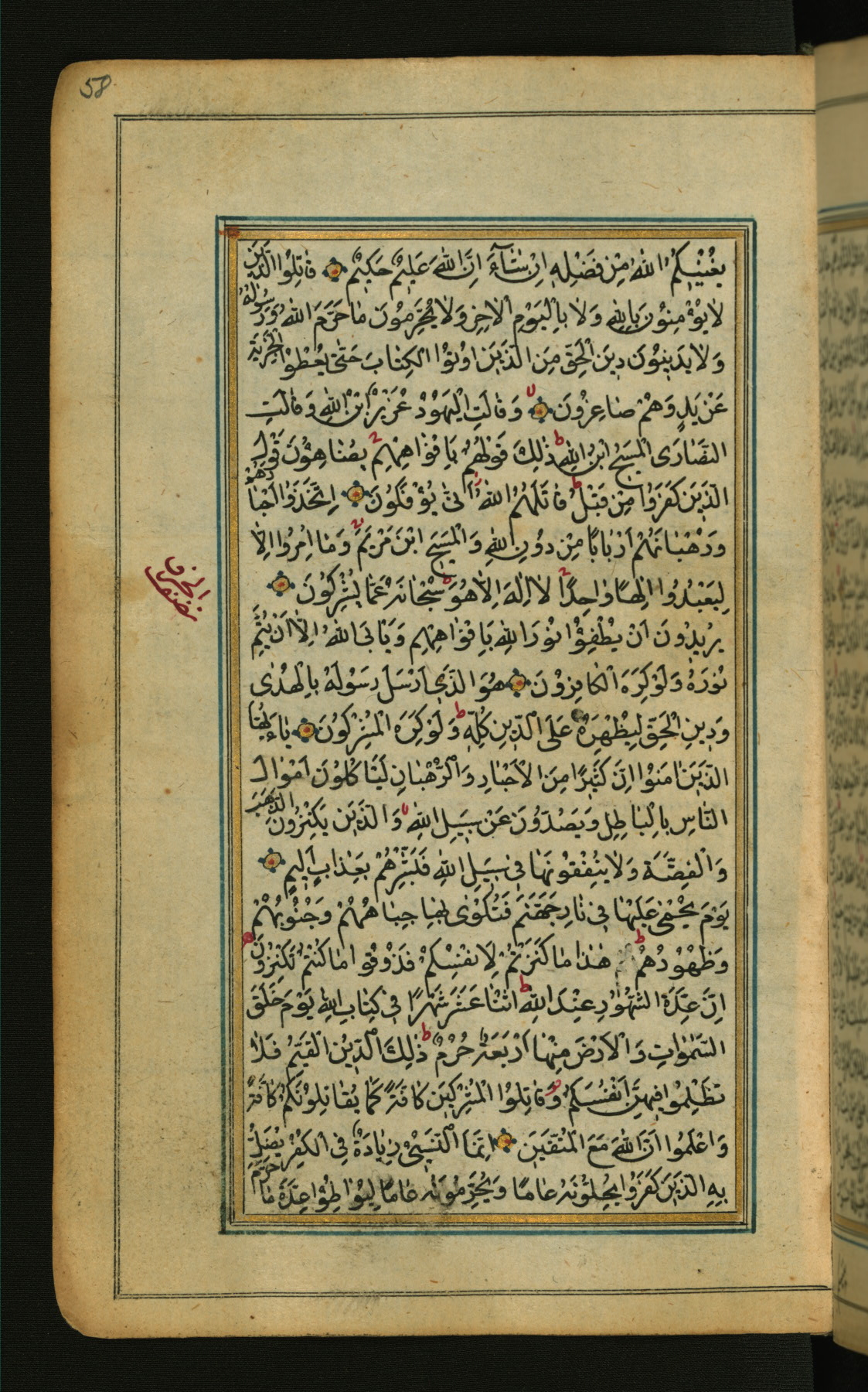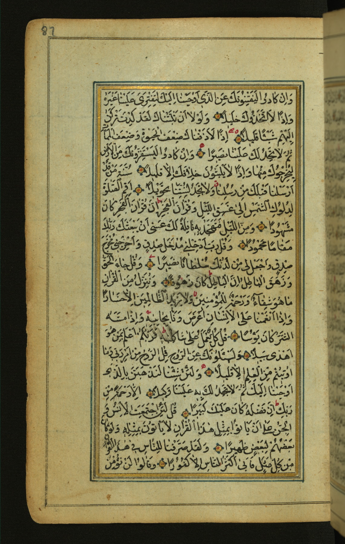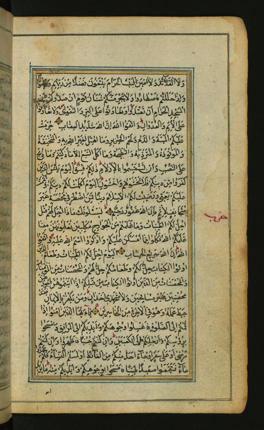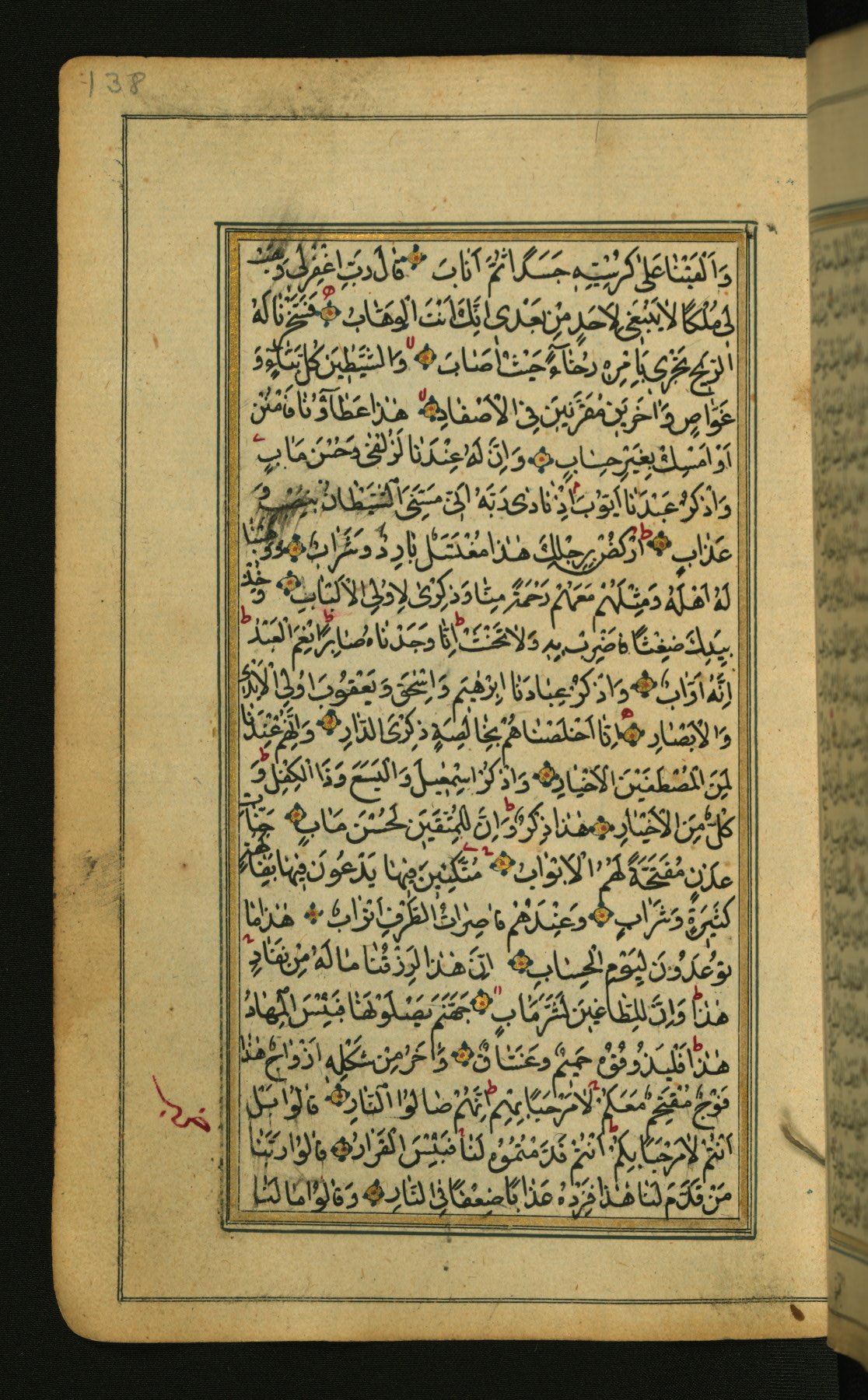 This manuscript is a small illuminated single-volume copy of the Qurʾan, likely produced in Iran. A date is inscribed on the final page, which is interpreted as 1230 AH / 1814-5 CE (fol. 186b). The manuscript opens with an illuminated double-page incipit with the verses of chapter 1 (Sūrat al-fātiḥah) and the initial verses of chapter 2 (Sūrat al-baqarah), decorated with interlinear illumination (fols. 1b-2a). The text is in vocalized naskh script in black ink with reading marks in red and text divisions, such as thirty verses (juzʾ) or sixty verses (ḥizb), in the margins. Illuminated discs with colored dots separate the verses. Chapter headings are in riqāʿ script in red ink on a gold ground. The nineteenth-century lacquer binding with a floral composition on a gold field on the upper and lower boards seems to be contemporary with the manuscript. The insides of both boards are painted with a lobed yellow central medallion and pendants on an orange field.