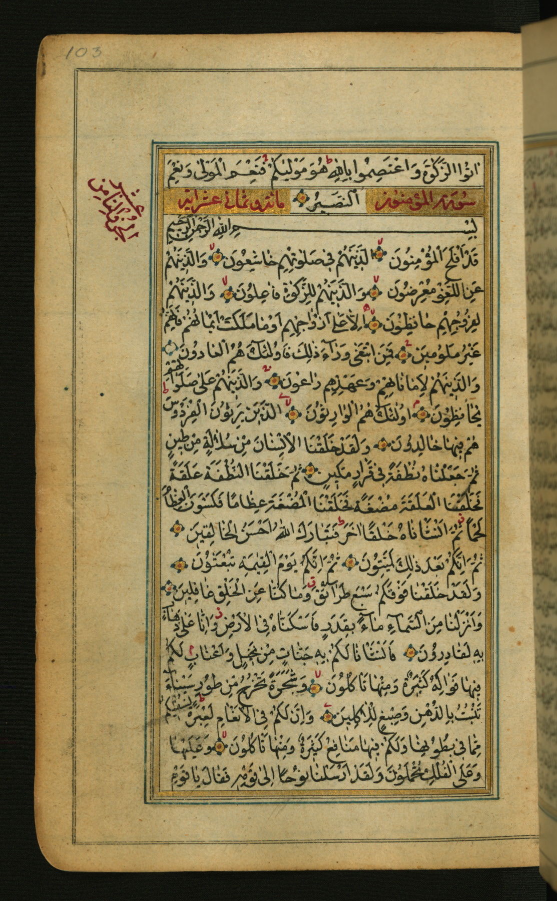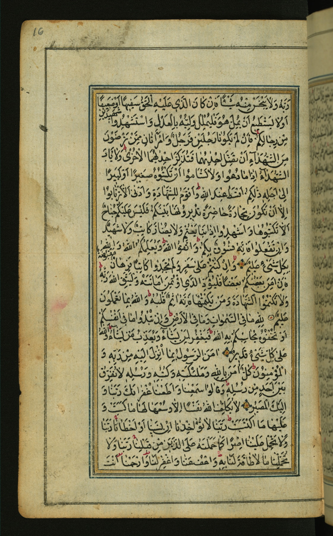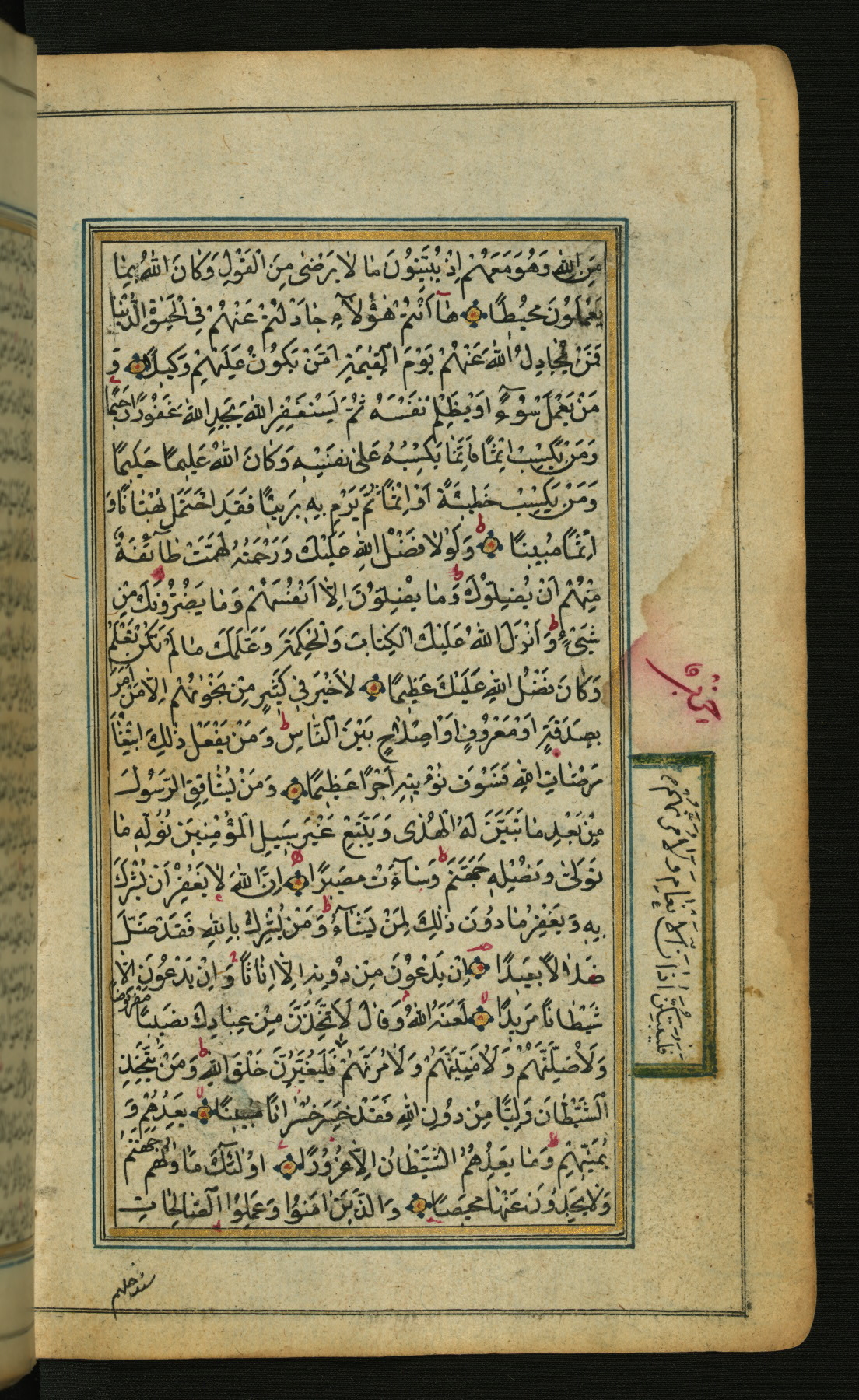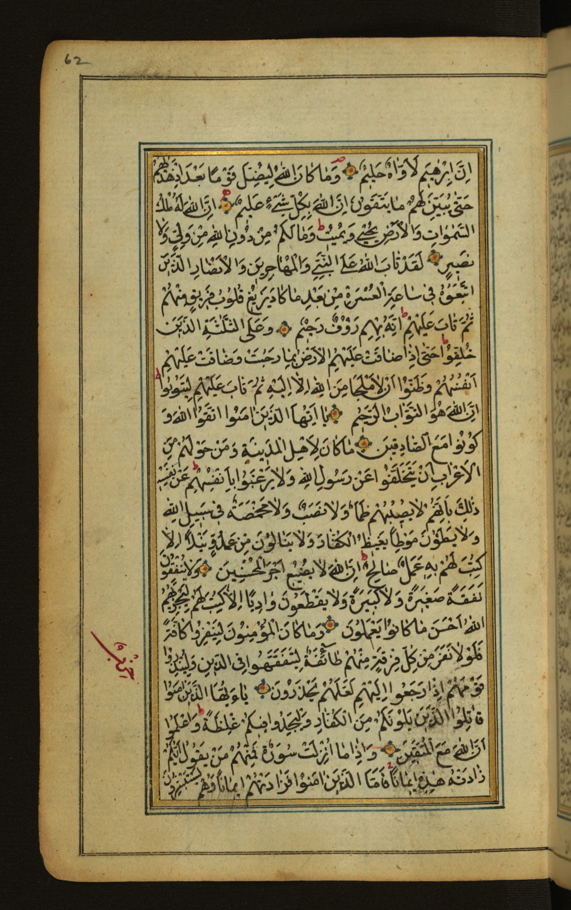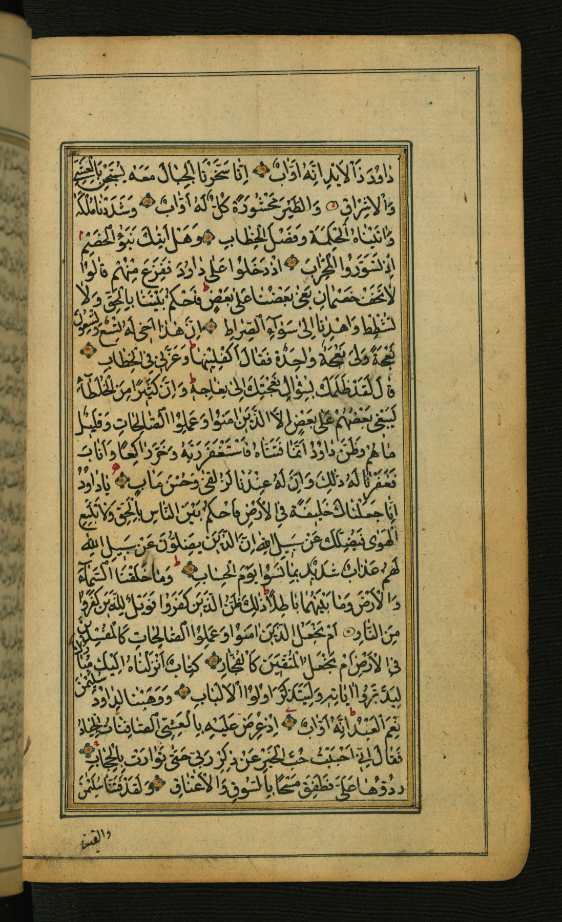 This manuscript is a small illuminated single-volume copy of the Qurʾan, likely produced in Iran. A date is inscribed on the final page, which is interpreted as 1230 AH / 1814-5 CE (fol. 186b). The manuscript opens with an illuminated double-page incipit with the verses of chapter 1 (Sūrat al-fātiḥah) and the initial verses of chapter 2 (Sūrat al-baqarah), decorated with interlinear illumination (fols. 1b-2a). The text is in vocalized naskh script in black ink with reading marks in red and text divisions, such as thirty verses (juzʾ) or sixty verses (ḥizb), in the margins. Illuminated discs with colored dots separate the verses. Chapter headings are in riqāʿ script in red ink on a gold ground. The nineteenth-century lacquer binding with a floral composition on a gold field on the upper and lower boards seems to be contemporary with the manuscript. The insides of both boards are painted with a lobed yellow central medallion and pendants on an orange field.