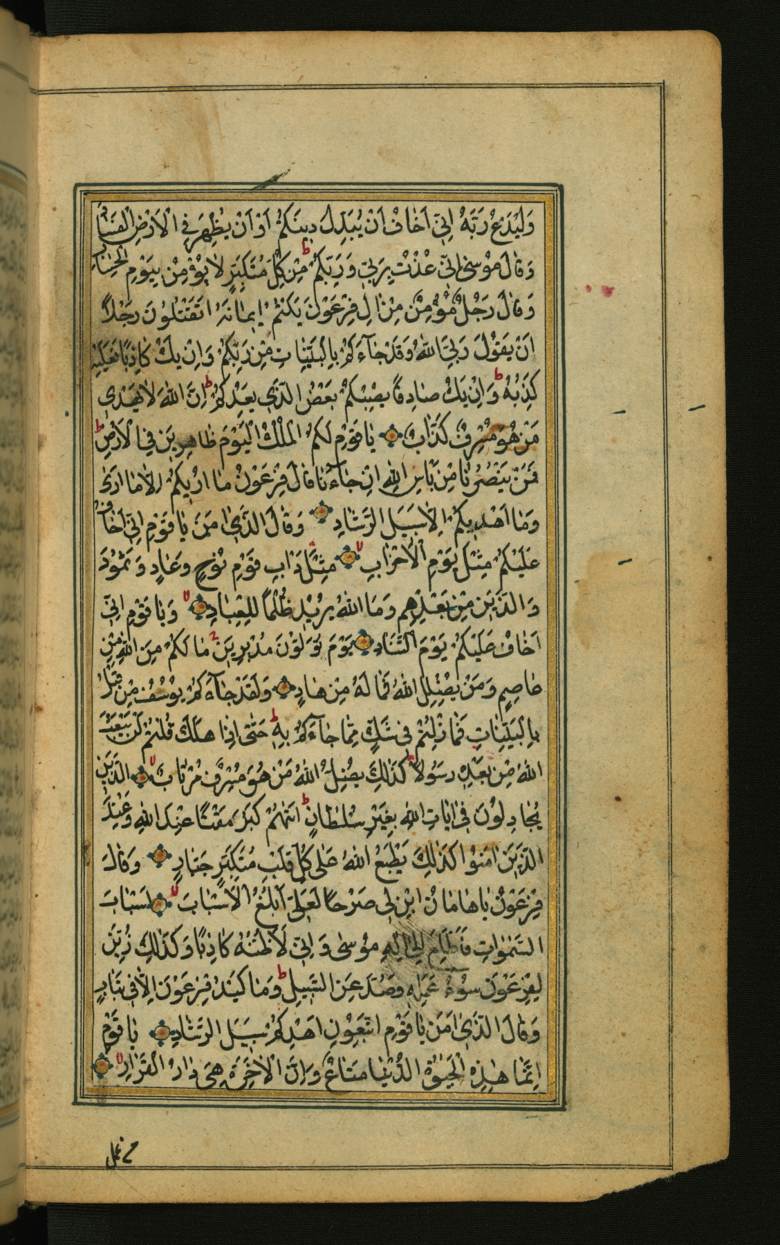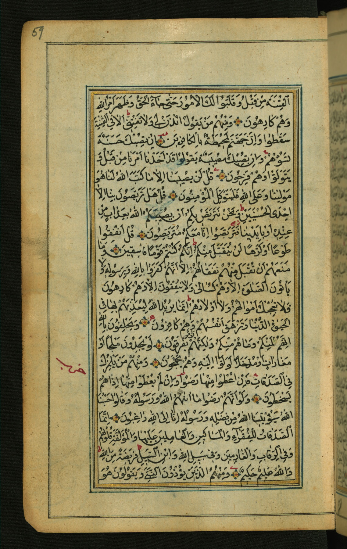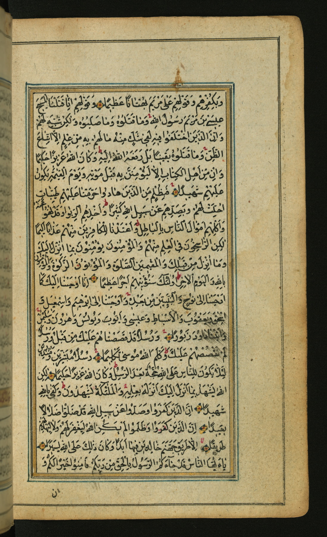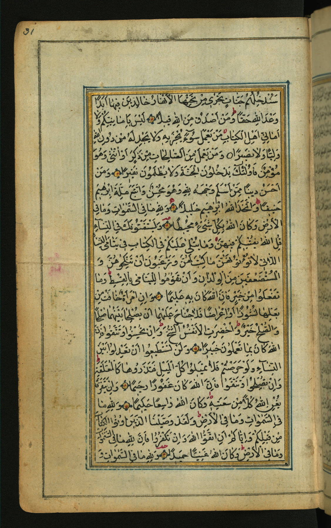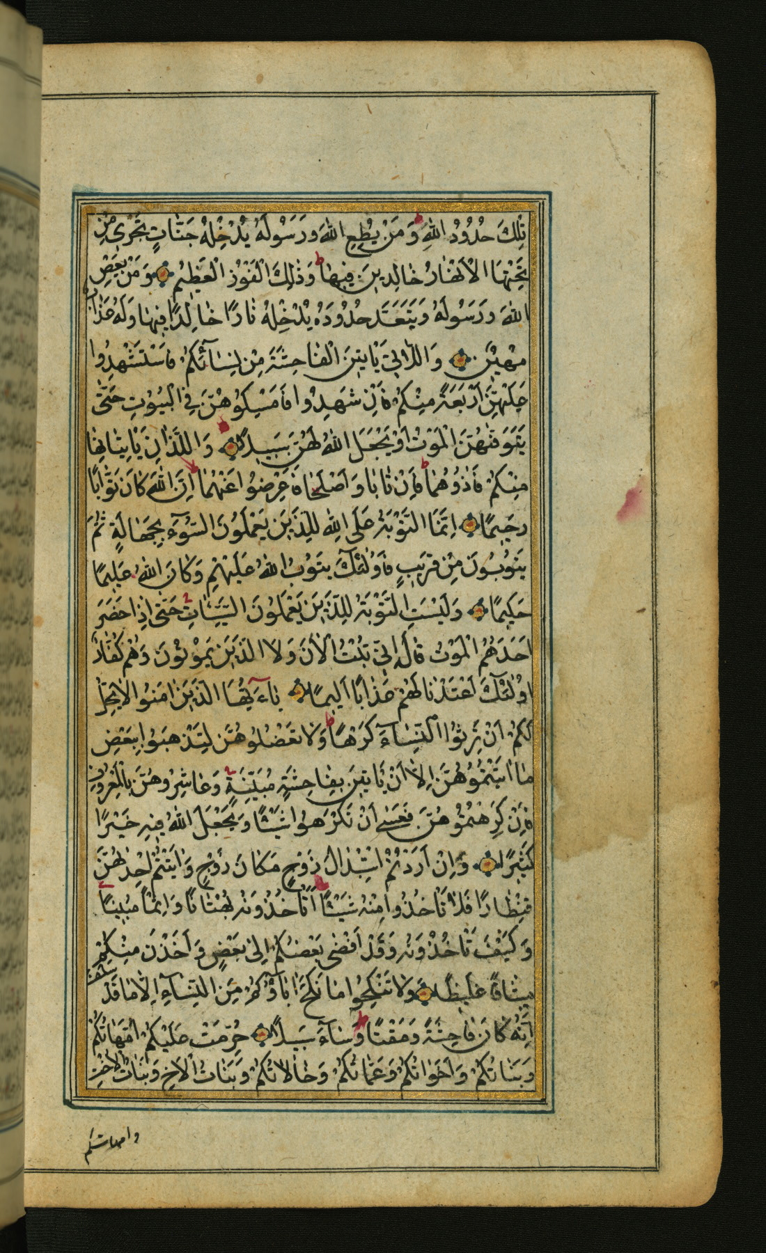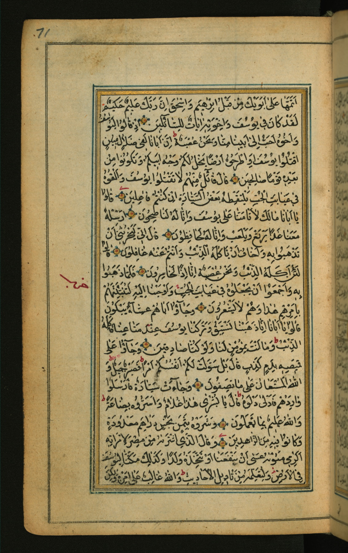 This manuscript is a small illuminated single-volume copy of the Qurʾan, likely produced in Iran. A date is inscribed on the final page, which is interpreted as 1230 AH / 1814-5 CE (fol. 186b). The manuscript opens with an illuminated double-page incipit with the verses of chapter 1 (Sūrat al-fātiḥah) and the initial verses of chapter 2 (Sūrat al-baqarah), decorated with interlinear illumination (fols. 1b-2a). The text is in vocalized naskh script in black ink with reading marks in red and text divisions, such as thirty verses (juzʾ) or sixty verses (ḥizb), in the margins. Illuminated discs with colored dots separate the verses. Chapter headings are in riqāʿ script in red ink on a gold ground. The nineteenth-century lacquer binding with a floral composition on a gold field on the upper and lower boards seems to be contemporary with the manuscript. The insides of both boards are painted with a lobed yellow central medallion and pendants on an orange field.