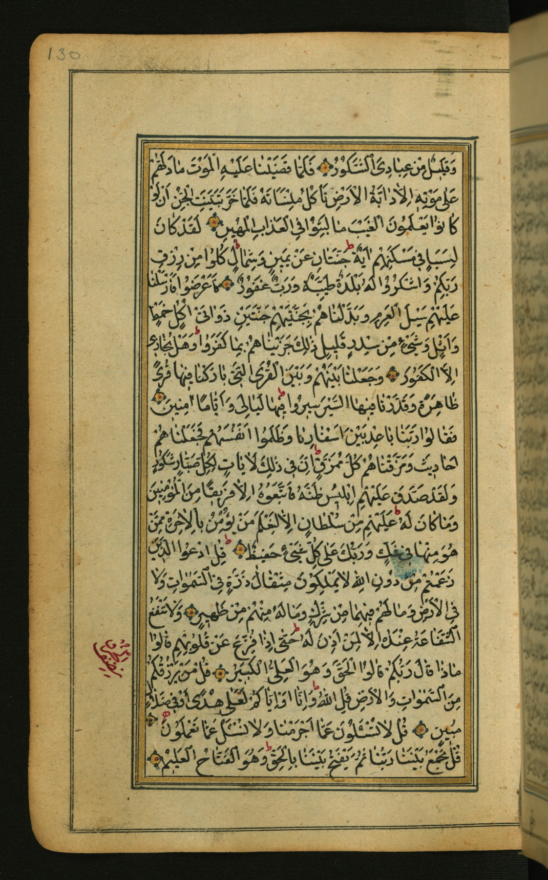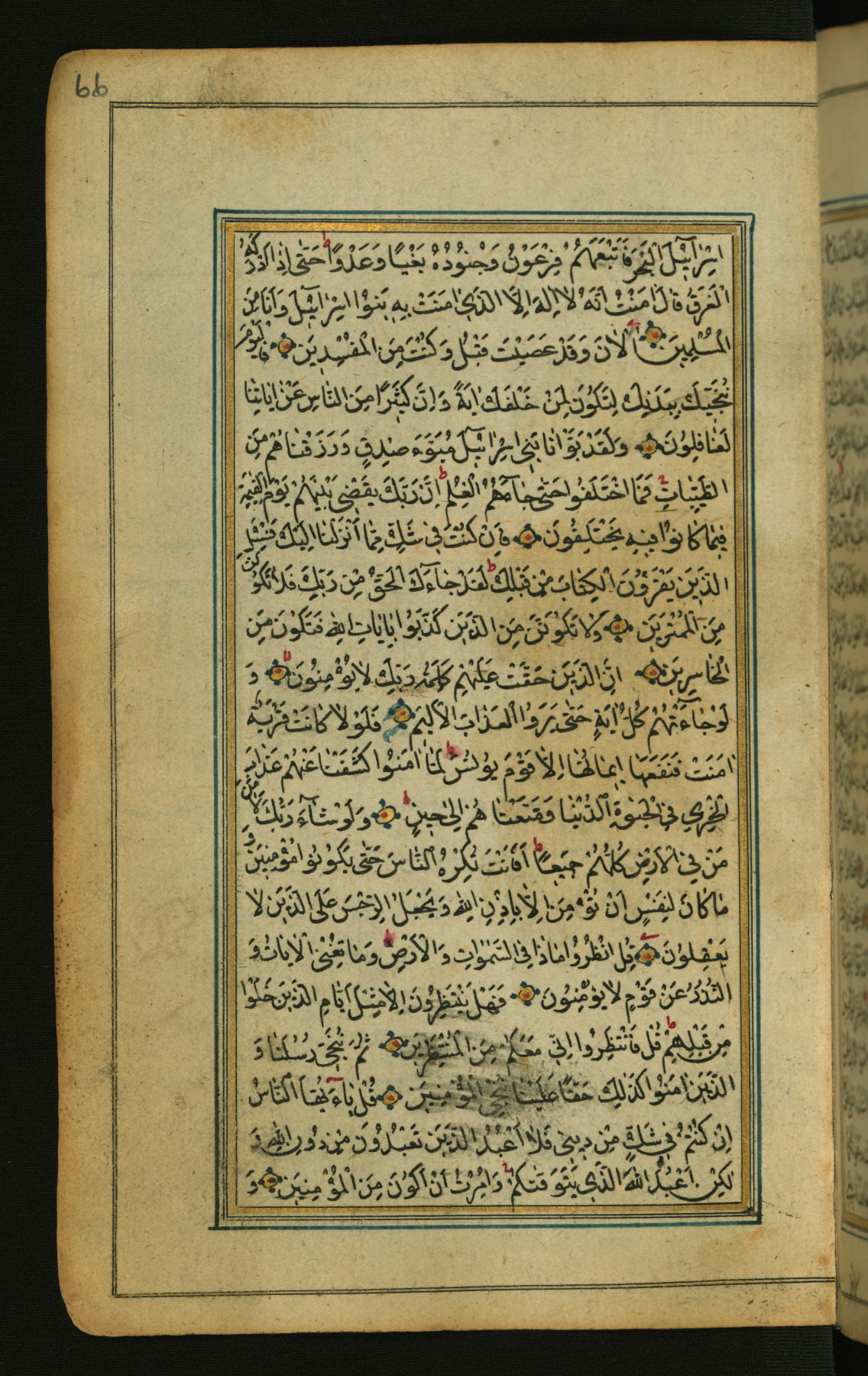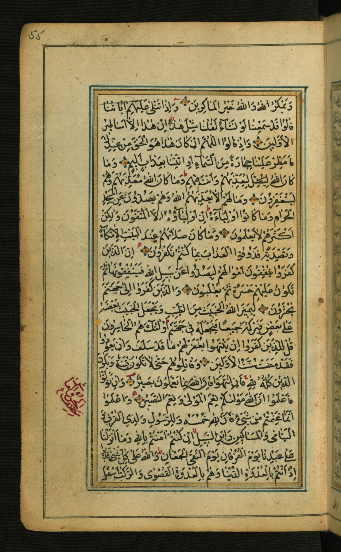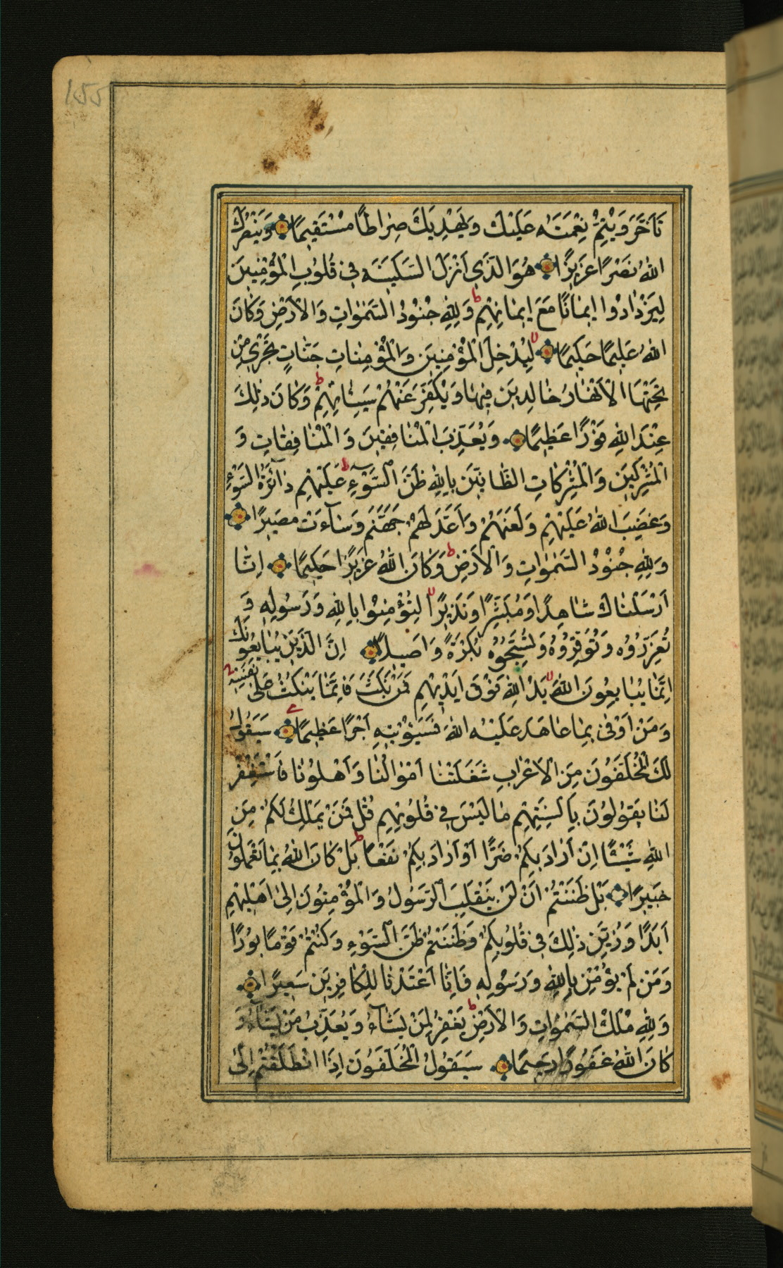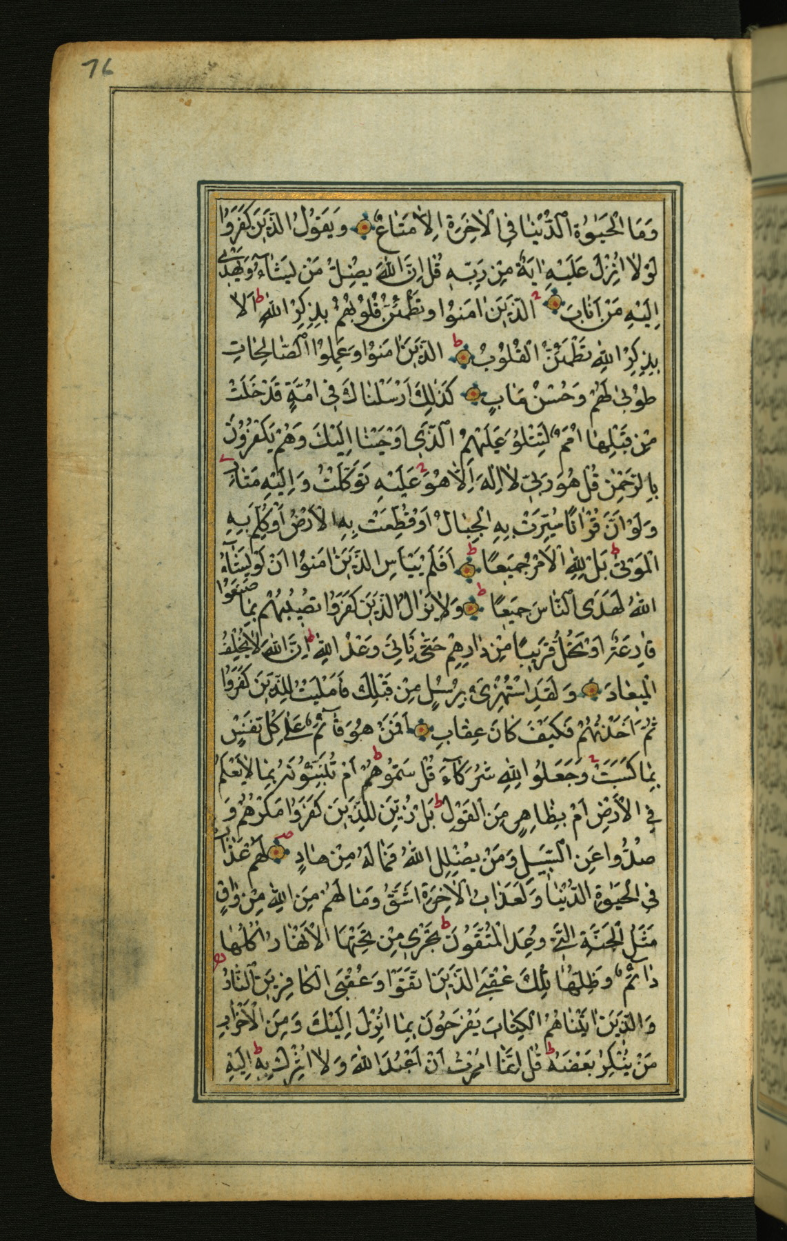 This manuscript is a small illuminated single-volume copy of the Qurʾan, likely produced in Iran. A date is inscribed on the final page, which is interpreted as 1230 AH / 1814-5 CE (fol. 186b). The manuscript opens with an illuminated double-page incipit with the verses of chapter 1 (Sūrat al-fātiḥah) and the initial verses of chapter 2 (Sūrat al-baqarah), decorated with interlinear illumination (fols. 1b-2a). The text is in vocalized naskh script in black ink with reading marks in red and text divisions, such as thirty verses (juzʾ) or sixty verses (ḥizb), in the margins. Illuminated discs with colored dots separate the verses. Chapter headings are in riqāʿ script in red ink on a gold ground. The nineteenth-century lacquer binding with a floral composition on a gold field on the upper and lower boards seems to be contemporary with the manuscript. The insides of both boards are painted with a lobed yellow central medallion and pendants on an orange field.