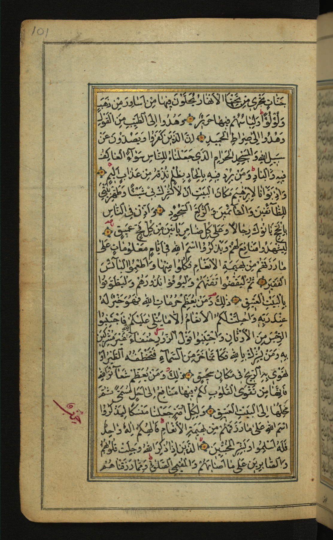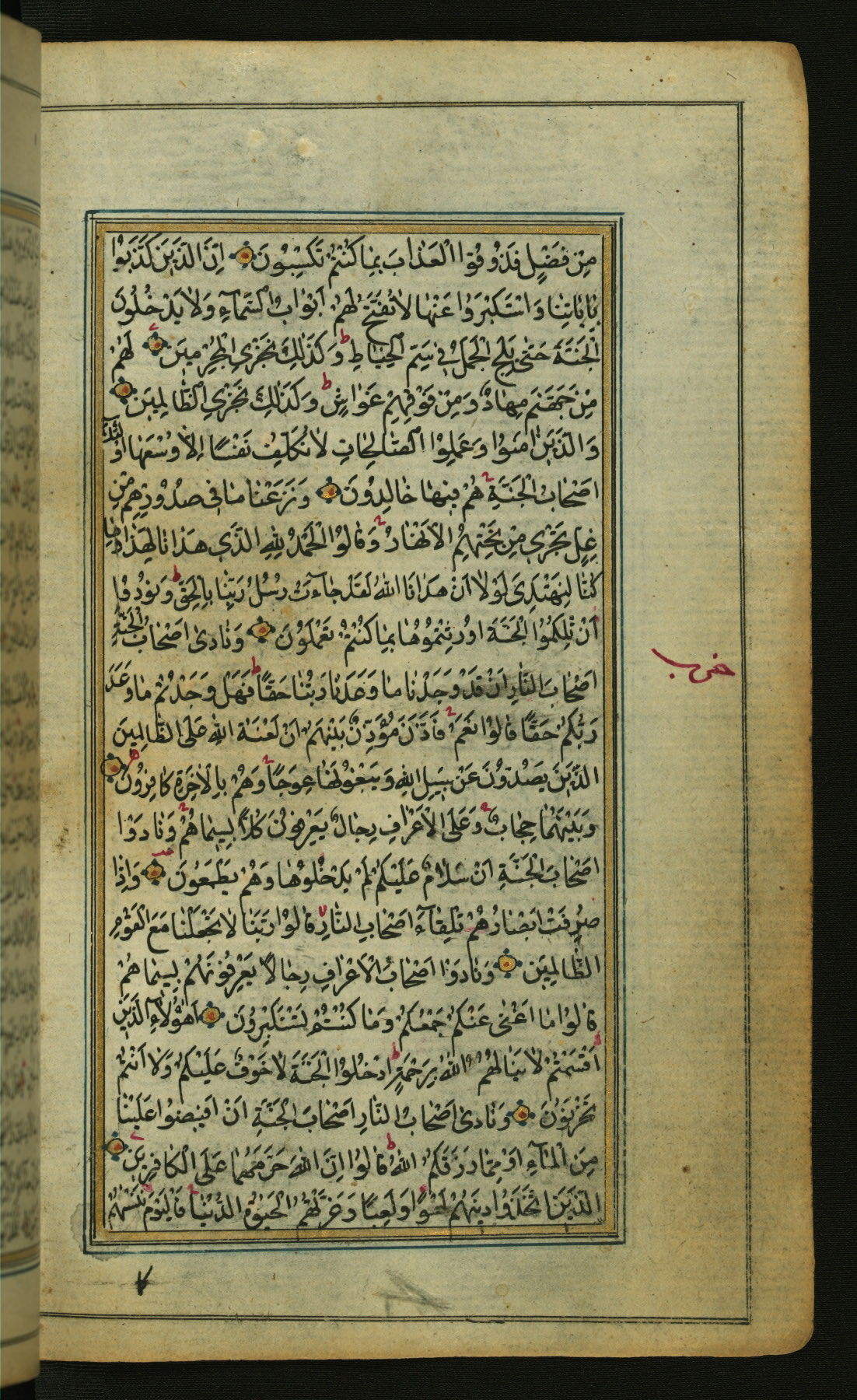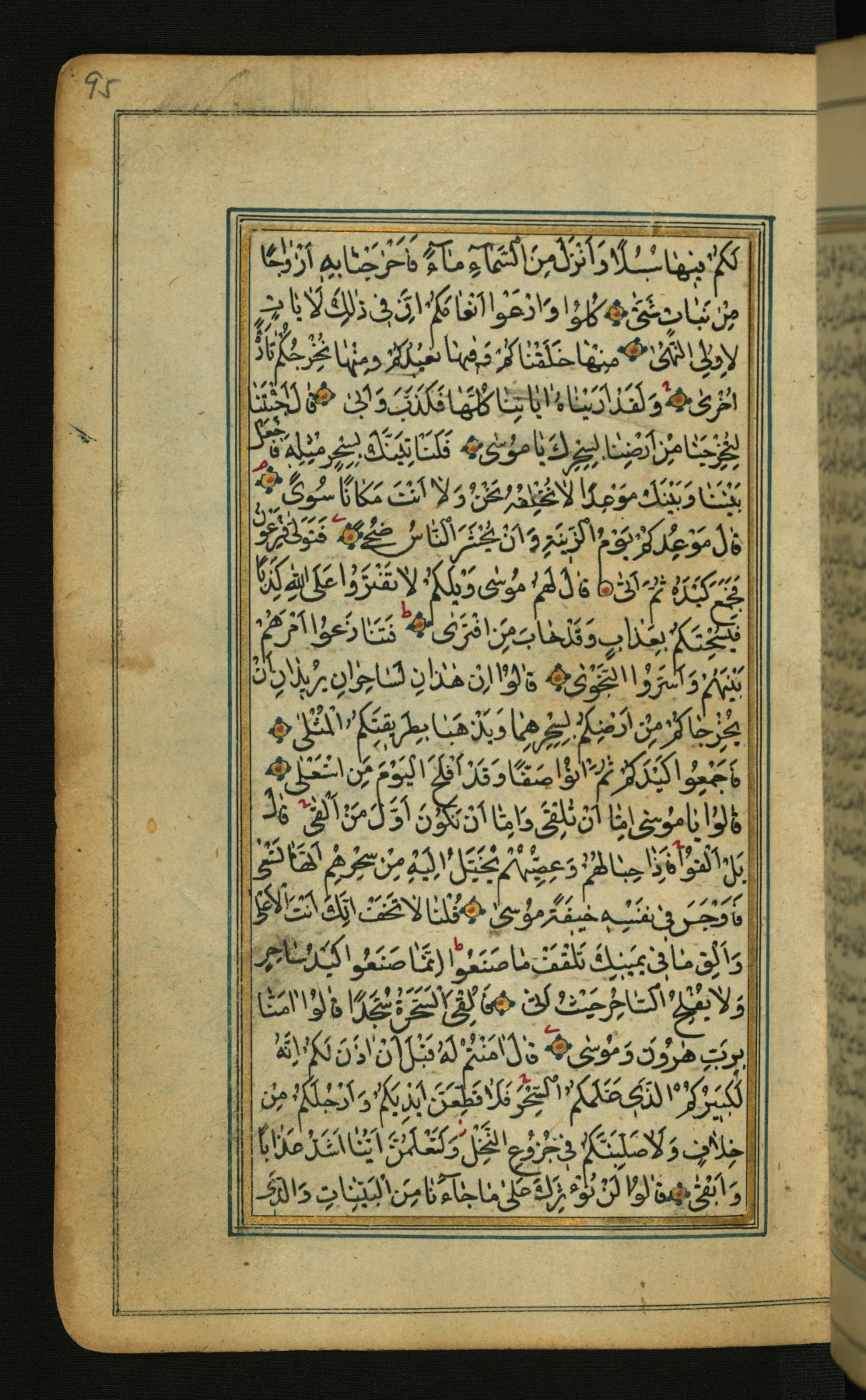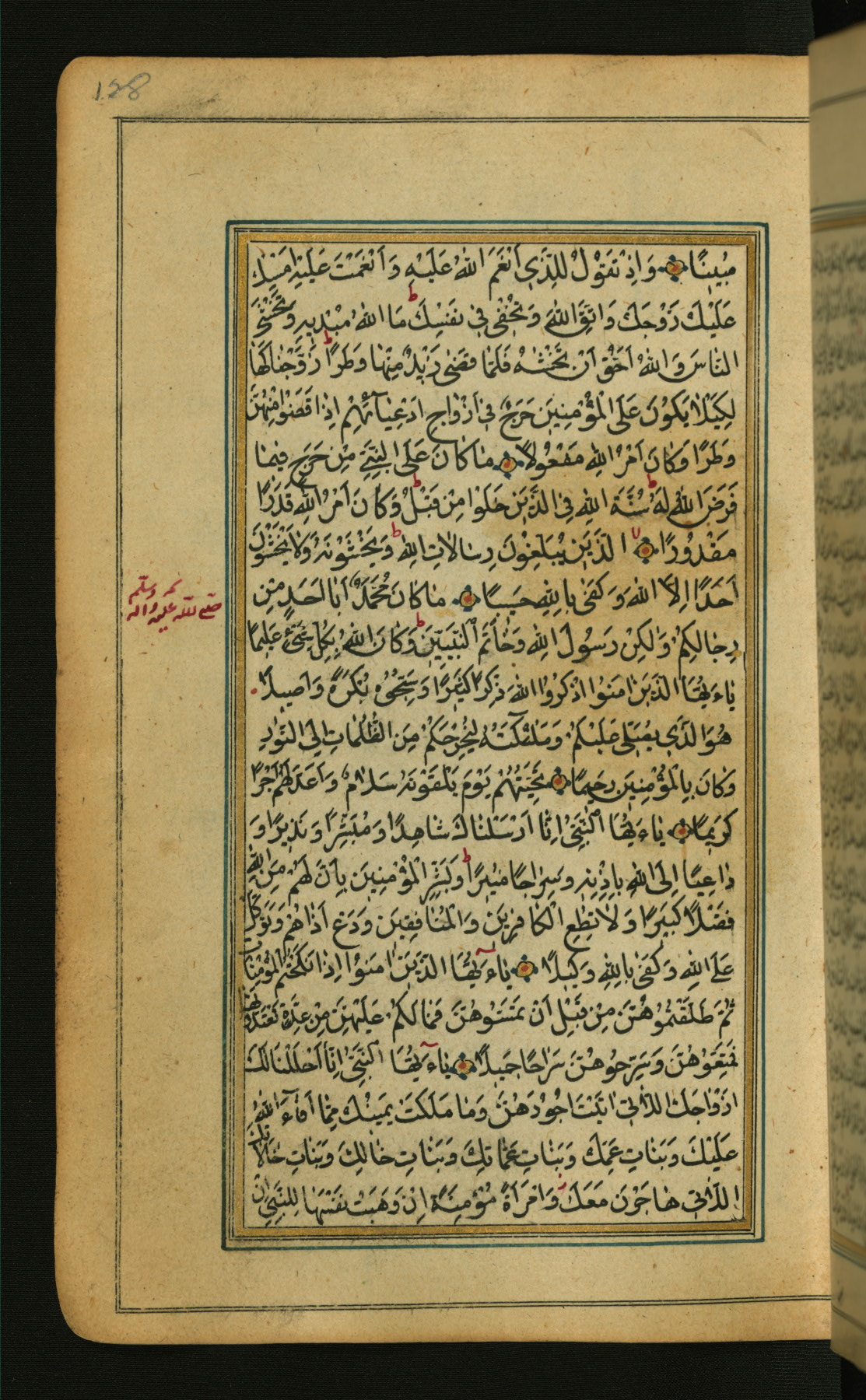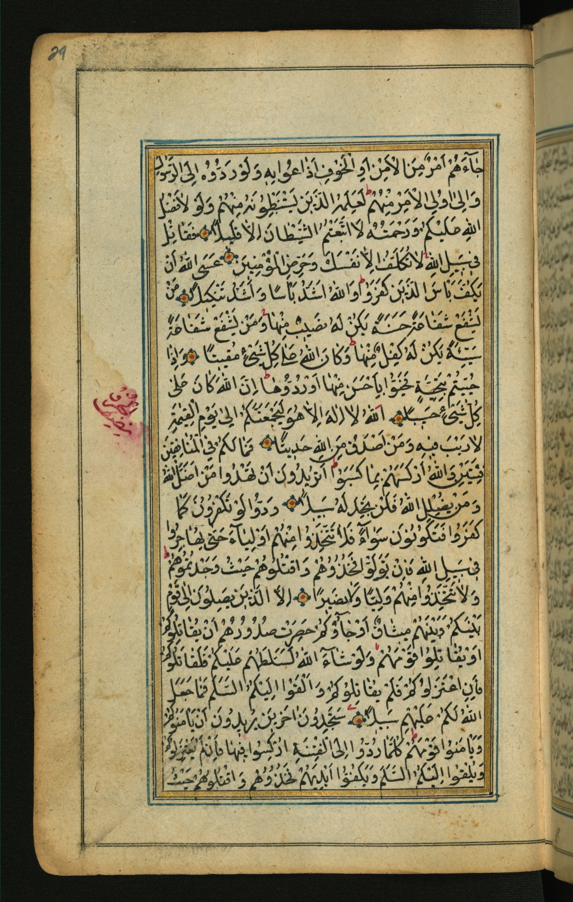 This manuscript is a small illuminated single-volume copy of the Qurʾan, likely produced in Iran. A date is inscribed on the final page, which is interpreted as 1230 AH / 1814-5 CE (fol. 186b). The manuscript opens with an illuminated double-page incipit with the verses of chapter 1 (Sūrat al-fātiḥah) and the initial verses of chapter 2 (Sūrat al-baqarah), decorated with interlinear illumination (fols. 1b-2a). The text is in vocalized naskh script in black ink with reading marks in red and text divisions, such as thirty verses (juzʾ) or sixty verses (ḥizb), in the margins. Illuminated discs with colored dots separate the verses. Chapter headings are in riqāʿ script in red ink on a gold ground. The nineteenth-century lacquer binding with a floral composition on a gold field on the upper and lower boards seems to be contemporary with the manuscript. The insides of both boards are painted with a lobed yellow central medallion and pendants on an orange field.