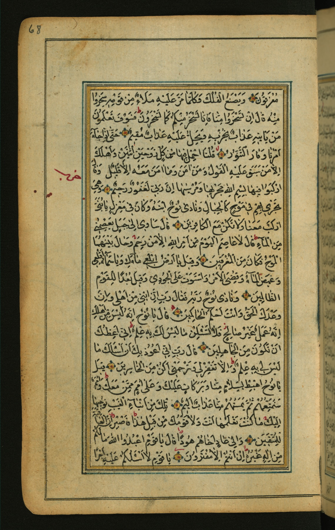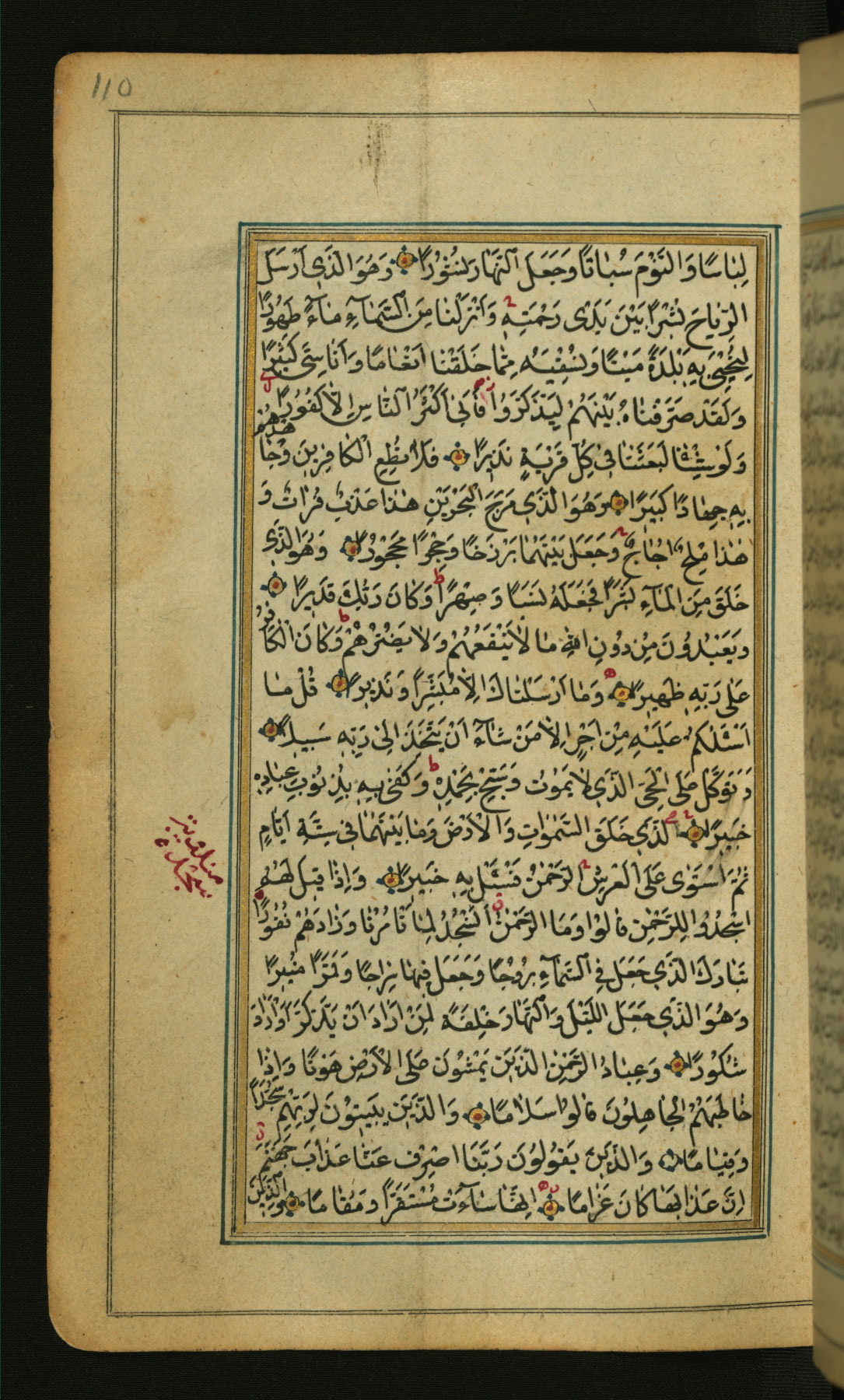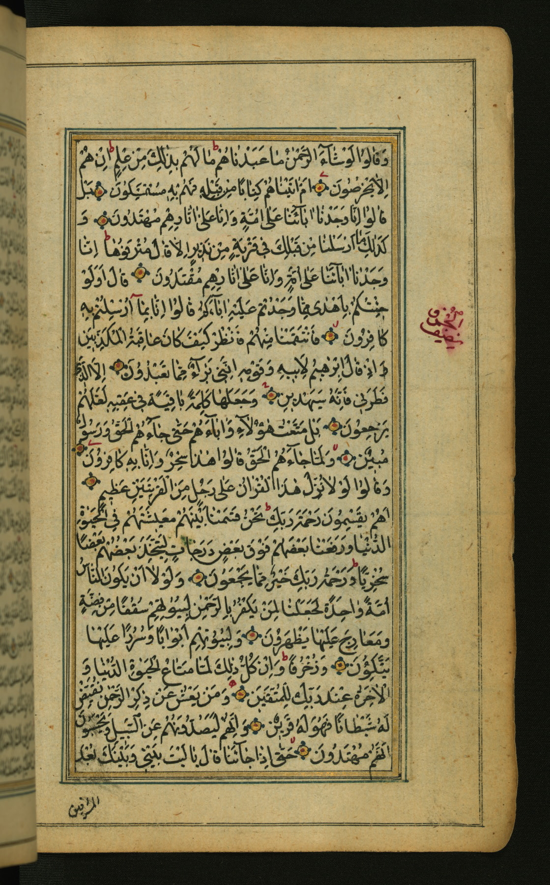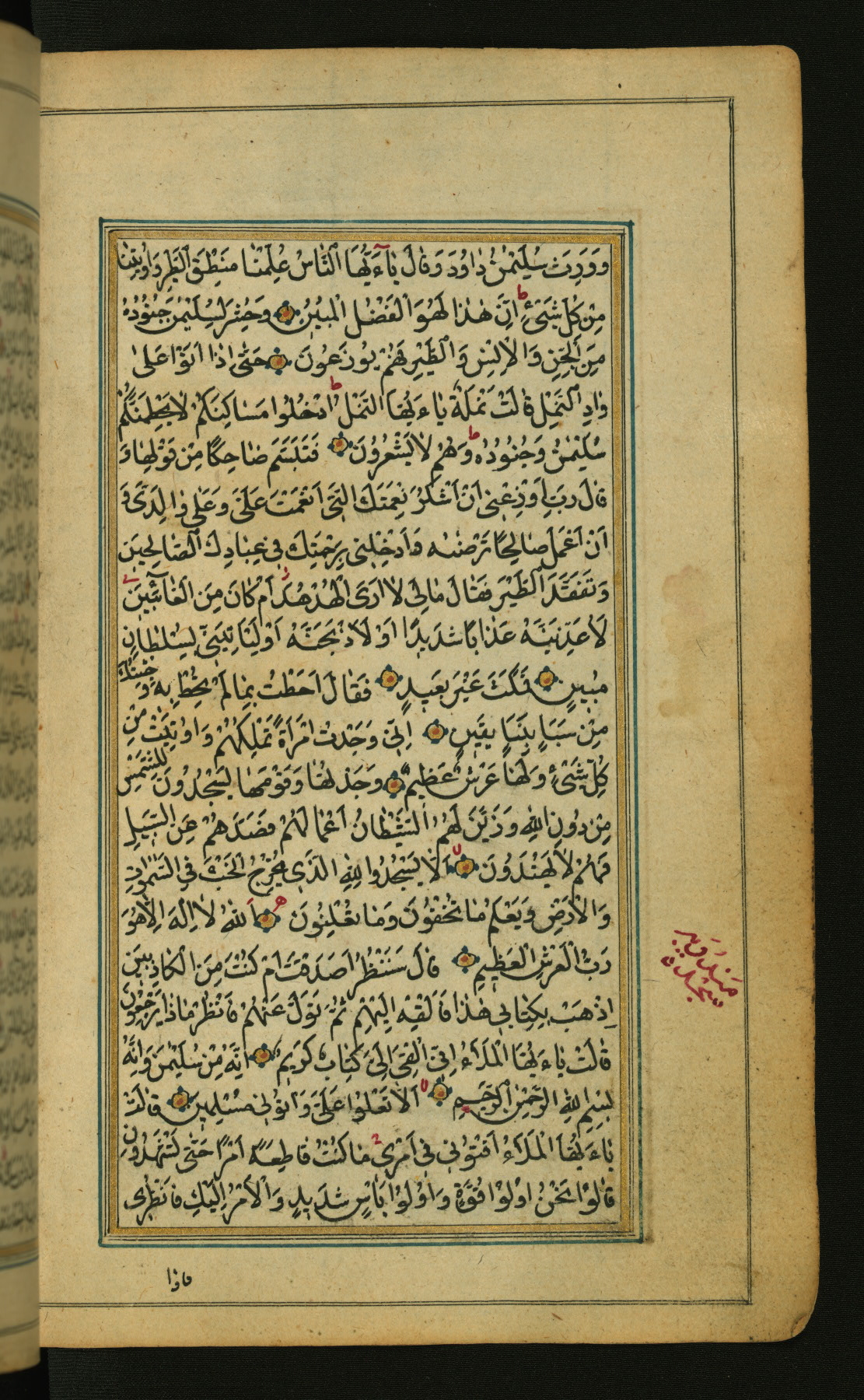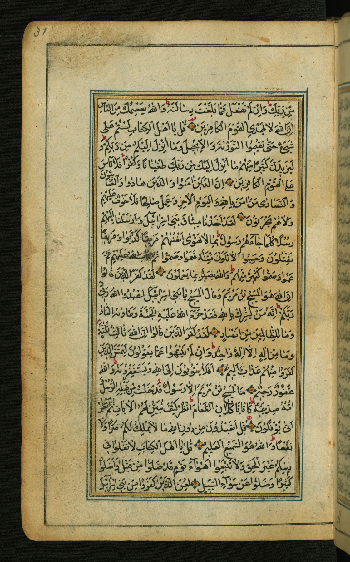 This manuscript is a small illuminated single-volume copy of the Qurʾan, likely produced in Iran. A date is inscribed on the final page, which is interpreted as 1230 AH / 1814-5 CE (fol. 186b). The manuscript opens with an illuminated double-page incipit with the verses of chapter 1 (Sūrat al-fātiḥah) and the initial verses of chapter 2 (Sūrat al-baqarah), decorated with interlinear illumination (fols. 1b-2a). The text is in vocalized naskh script in black ink with reading marks in red and text divisions, such as thirty verses (juzʾ) or sixty verses (ḥizb), in the margins. Illuminated discs with colored dots separate the verses. Chapter headings are in riqāʿ script in red ink on a gold ground. The nineteenth-century lacquer binding with a floral composition on a gold field on the upper and lower boards seems to be contemporary with the manuscript. The insides of both boards are painted with a lobed yellow central medallion and pendants on an orange field.