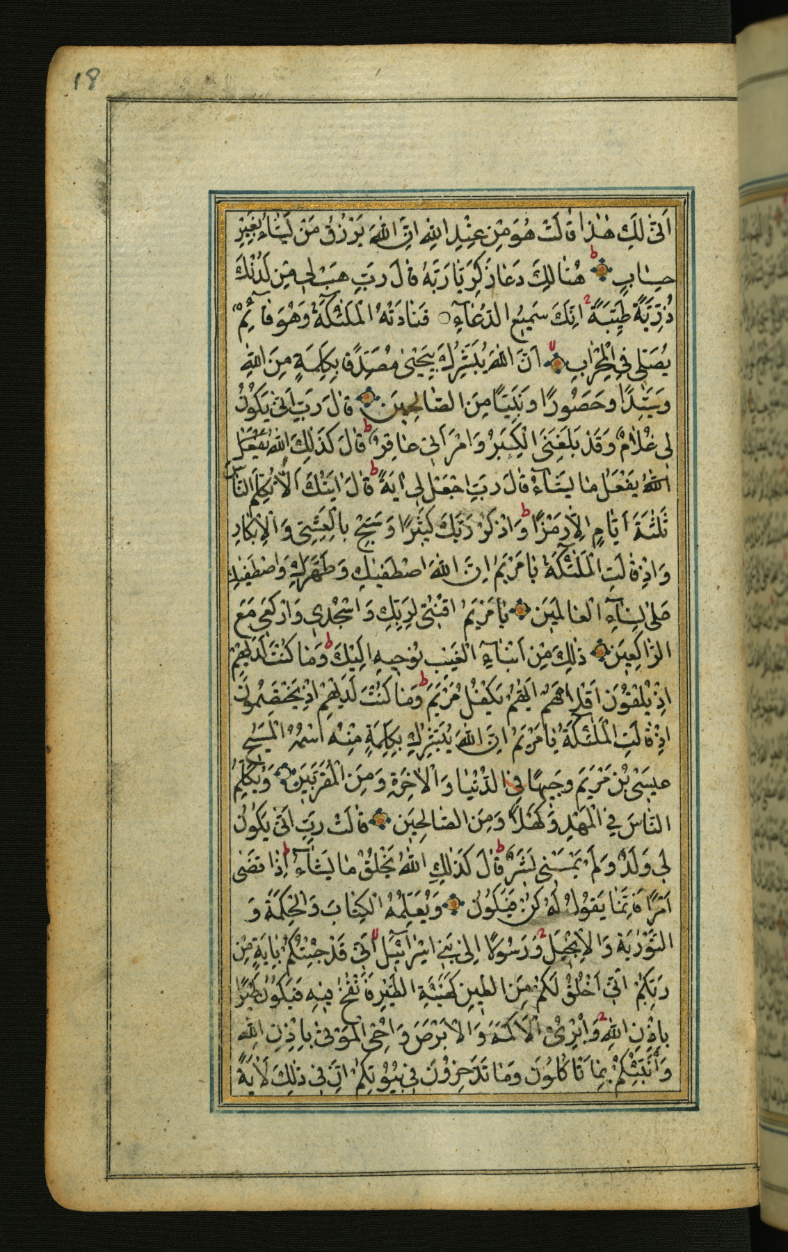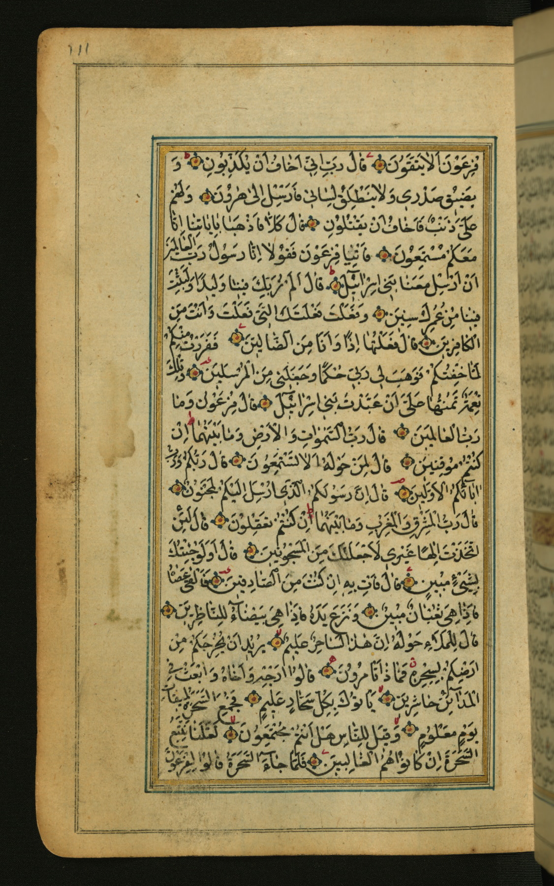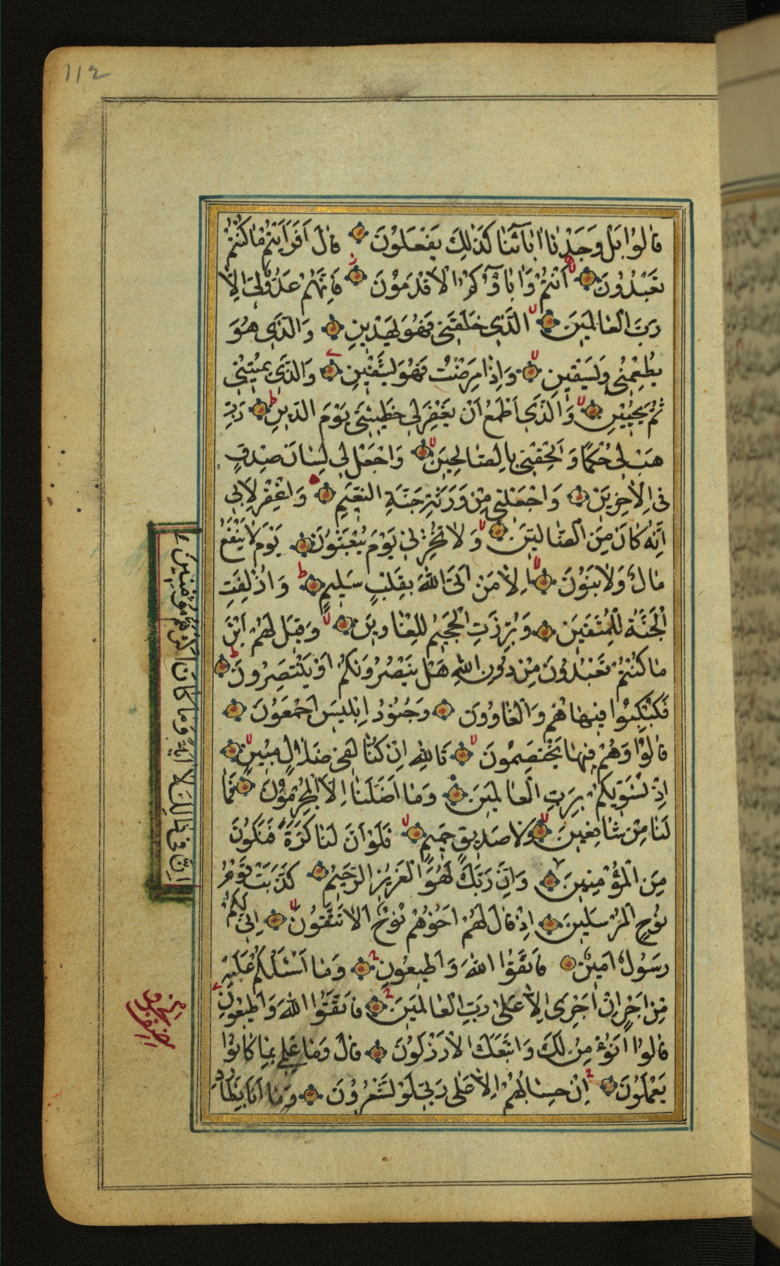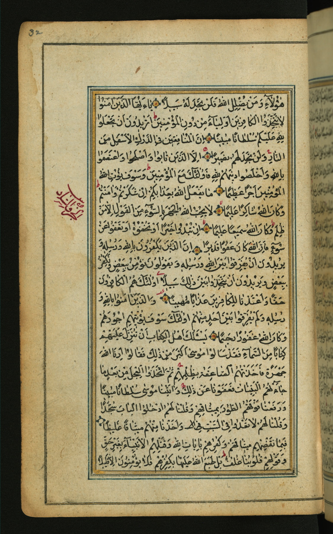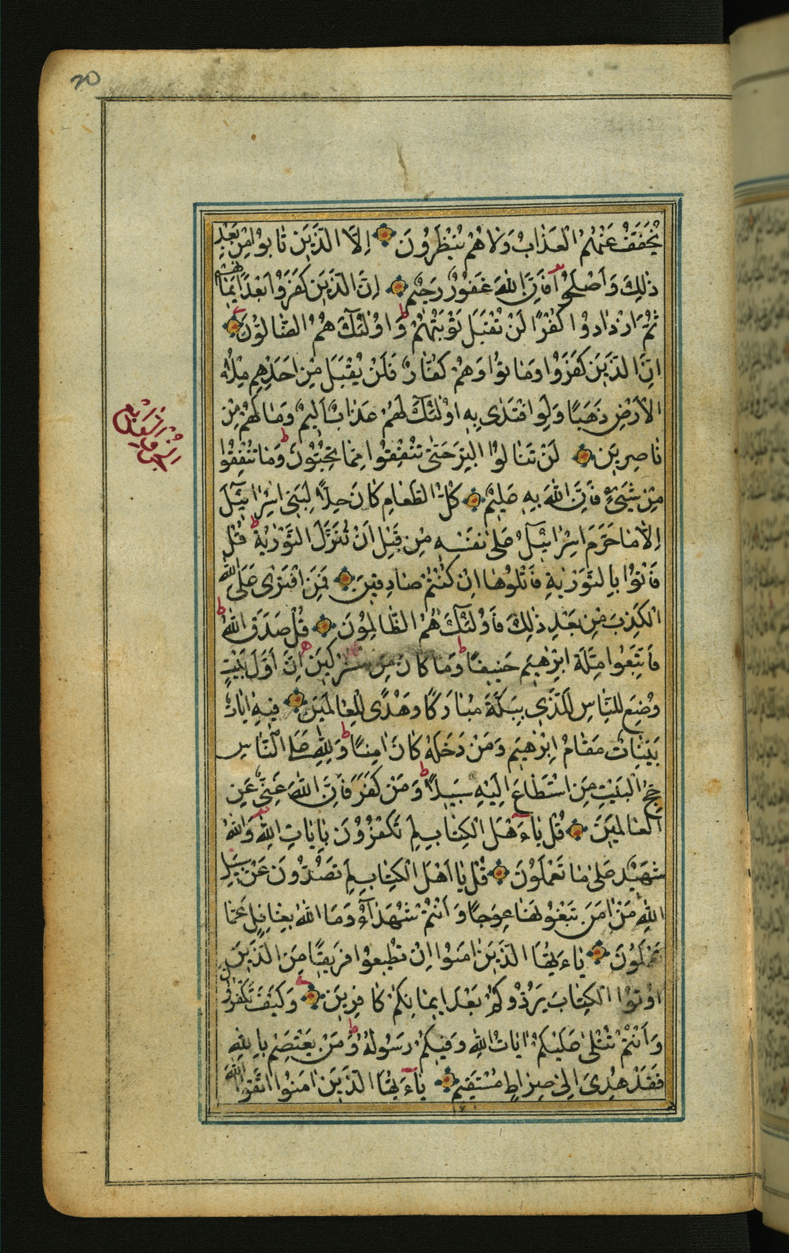This manuscript is a small illuminated single-volume copy of the Qurʾan, likely produced in Iran. A date is inscribed on the final page, which is interpreted as 1230 AH / 1814-5 CE (fol. 186b). The manuscript opens with an illuminated double-page incipit with the verses of chapter 1 (Sūrat al-fātiḥah) and the initial verses of chapter 2 (Sūrat al-baqarah), decorated with interlinear illumination (fols. 1b-2a). The text is in vocalized naskh script in black ink with reading marks in red and text divisions, such as thirty verses (juzʾ) or sixty verses (ḥizb), in the margins. Illuminated discs with colored dots separate the verses. Chapter headings are in riqāʿ script in red ink on a gold ground. The nineteenth-century lacquer binding with a floral composition on a gold field on the upper and lower boards seems to be contemporary with the manuscript. The insides of both boards are painted with a lobed yellow central medallion and pendants on an orange field.
