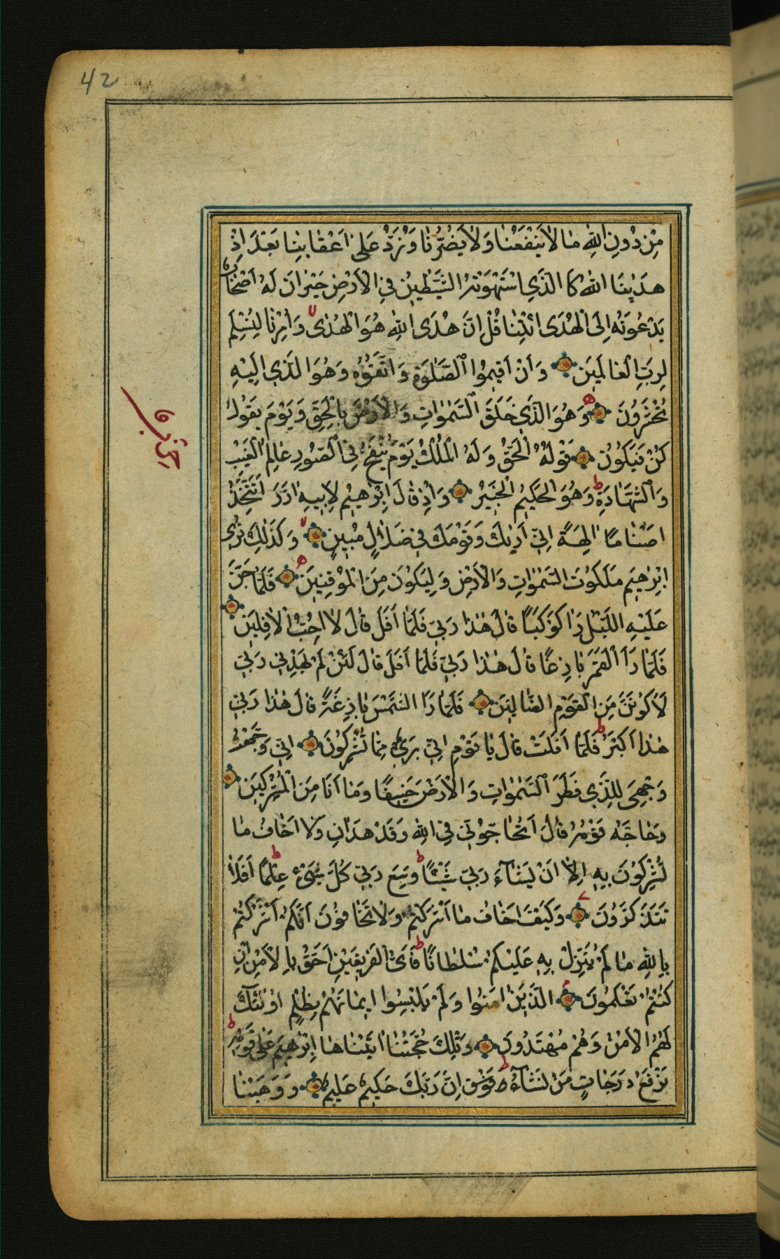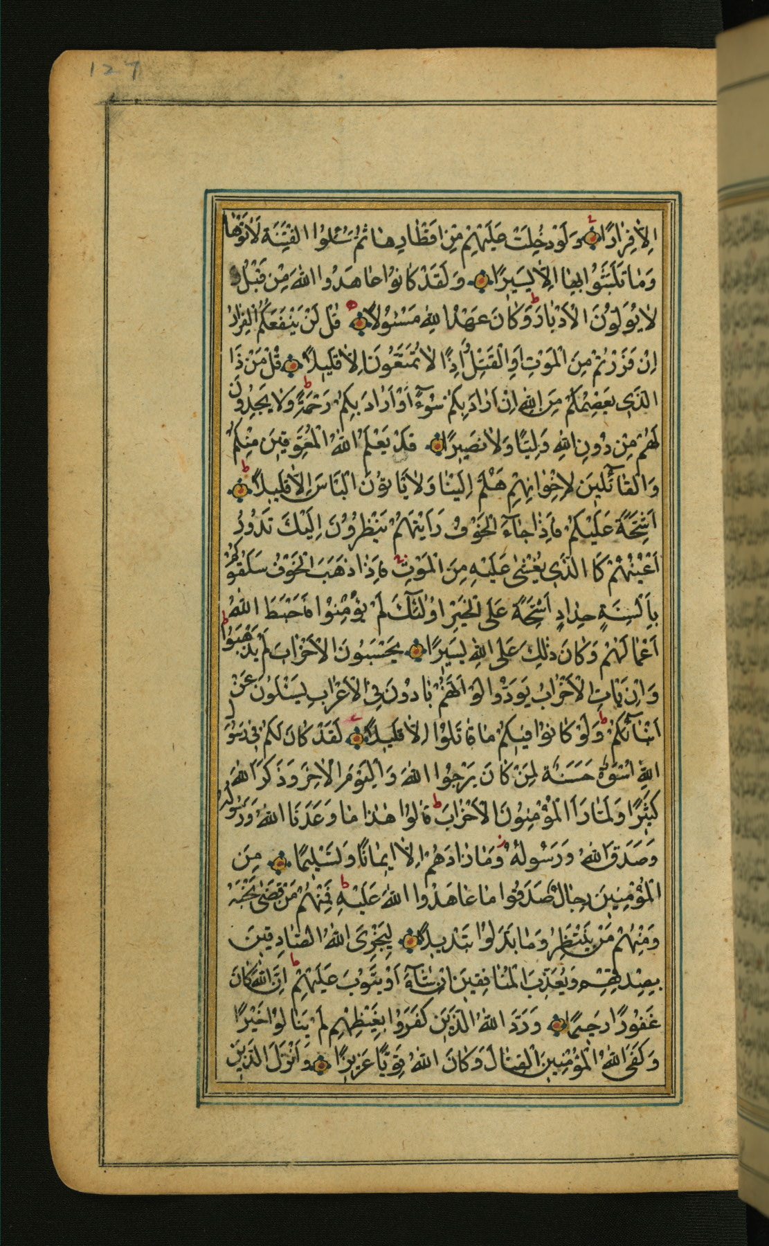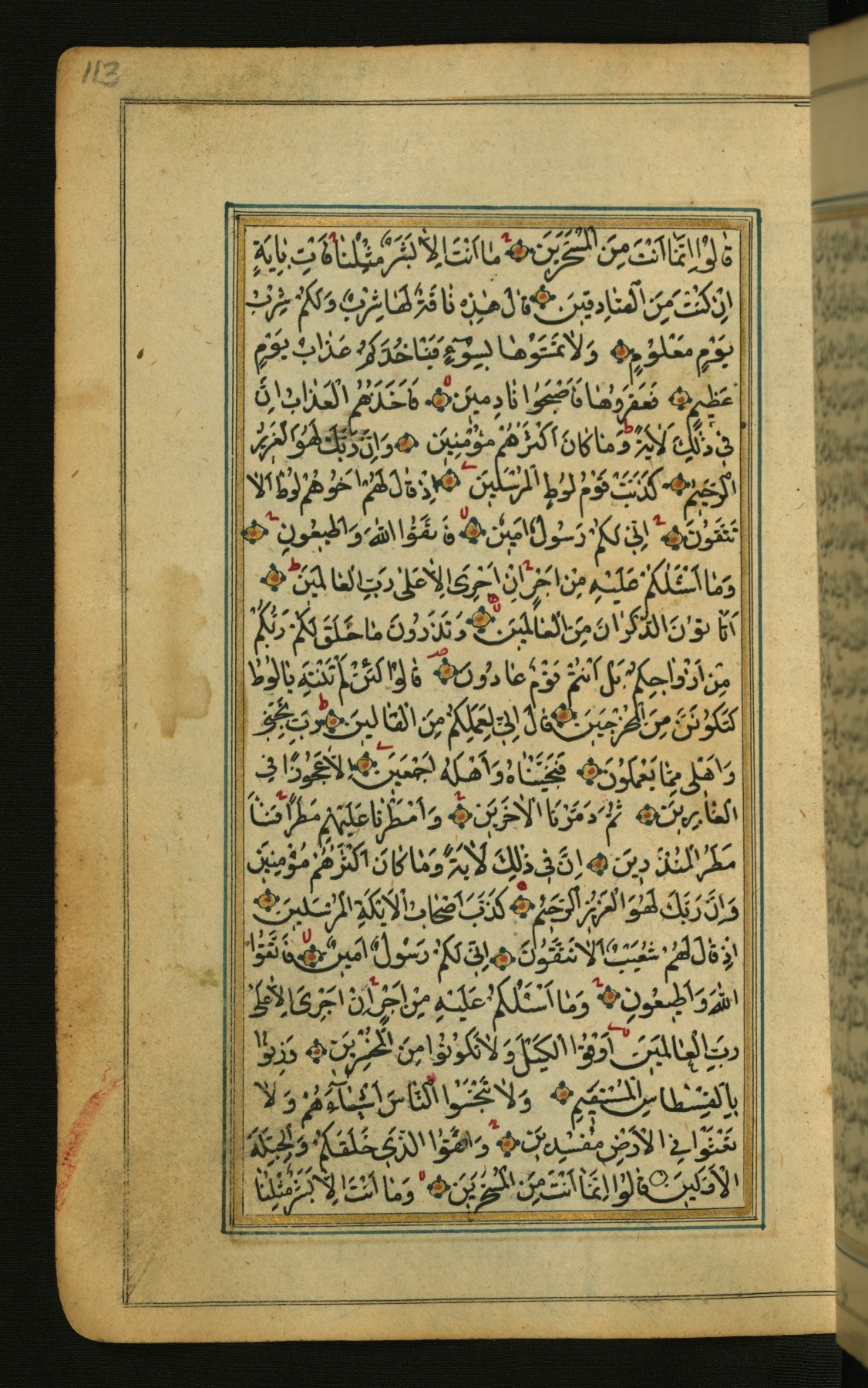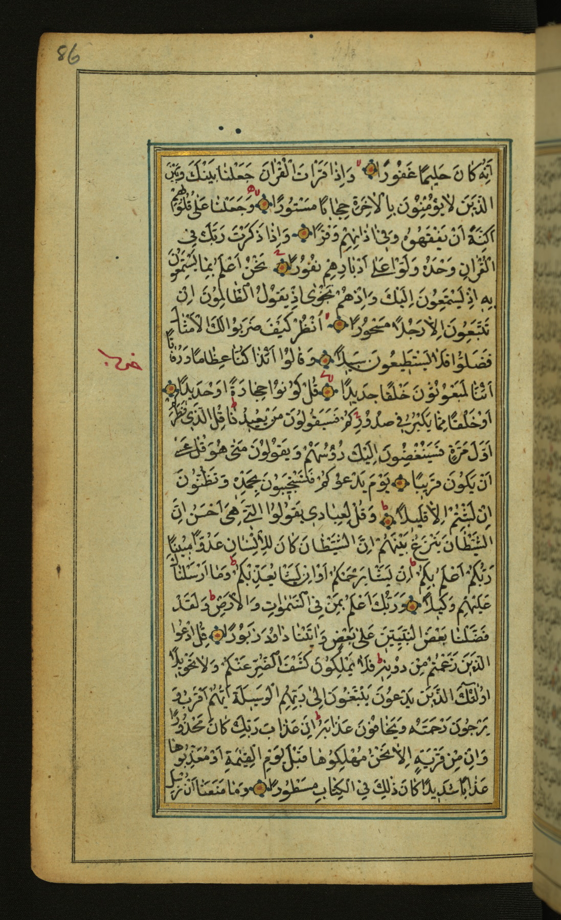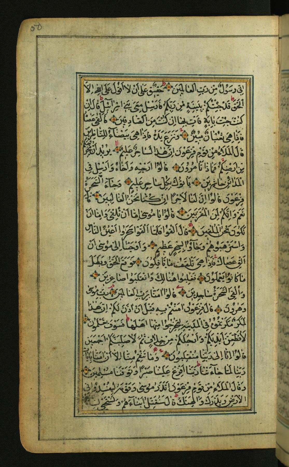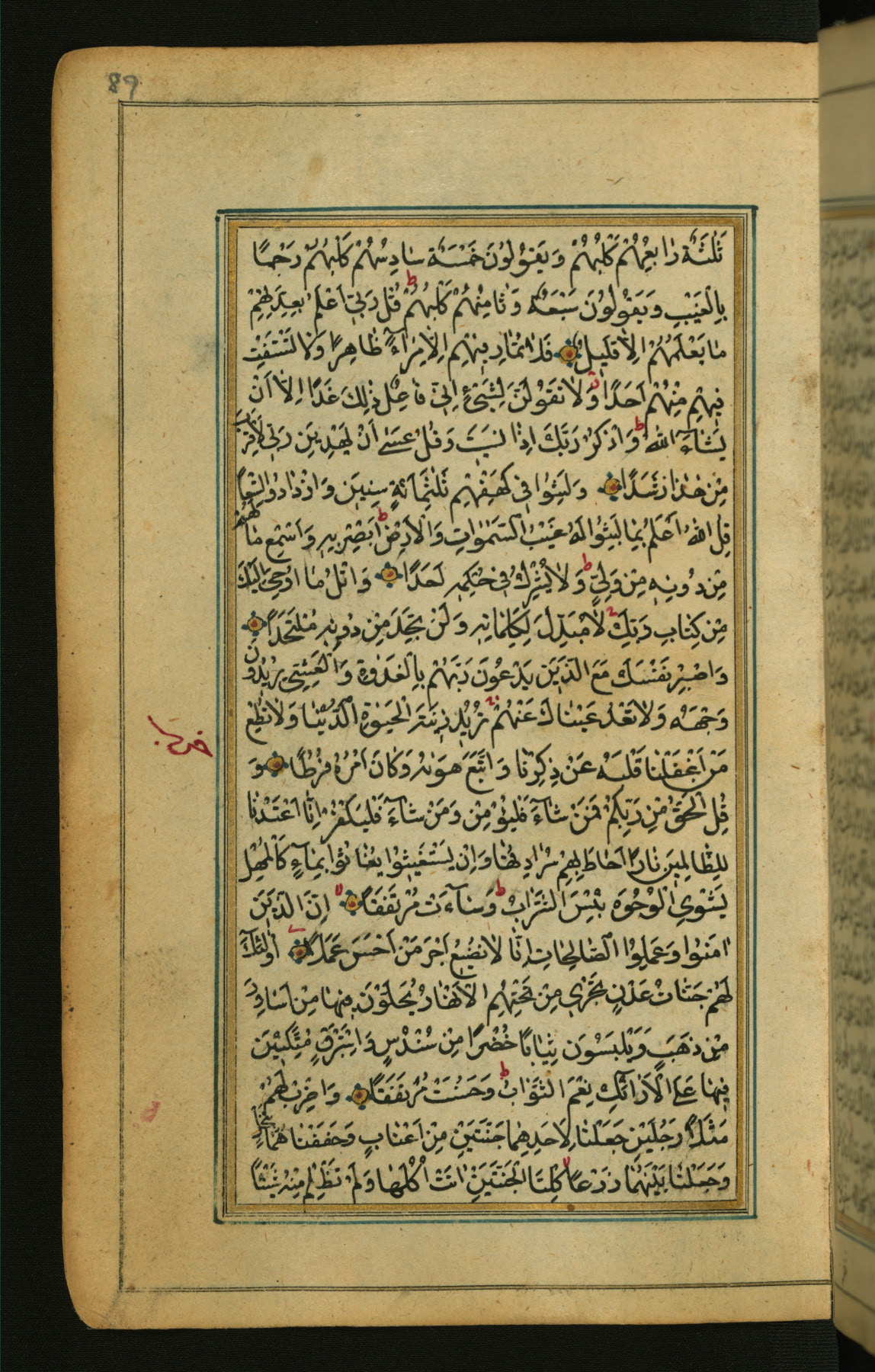 This manuscript is a small illuminated single-volume copy of the Qurʾan, likely produced in Iran. A date is inscribed on the final page, which is interpreted as 1230 AH / 1814-5 CE (fol. 186b). The manuscript opens with an illuminated double-page incipit with the verses of chapter 1 (Sūrat al-fātiḥah) and the initial verses of chapter 2 (Sūrat al-baqarah), decorated with interlinear illumination (fols. 1b-2a). The text is in vocalized naskh script in black ink with reading marks in red and text divisions, such as thirty verses (juzʾ) or sixty verses (ḥizb), in the margins. Illuminated discs with colored dots separate the verses. Chapter headings are in riqāʿ script in red ink on a gold ground. The nineteenth-century lacquer binding with a floral composition on a gold field on the upper and lower boards seems to be contemporary with the manuscript. The insides of both boards are painted with a lobed yellow central medallion and pendants on an orange field.