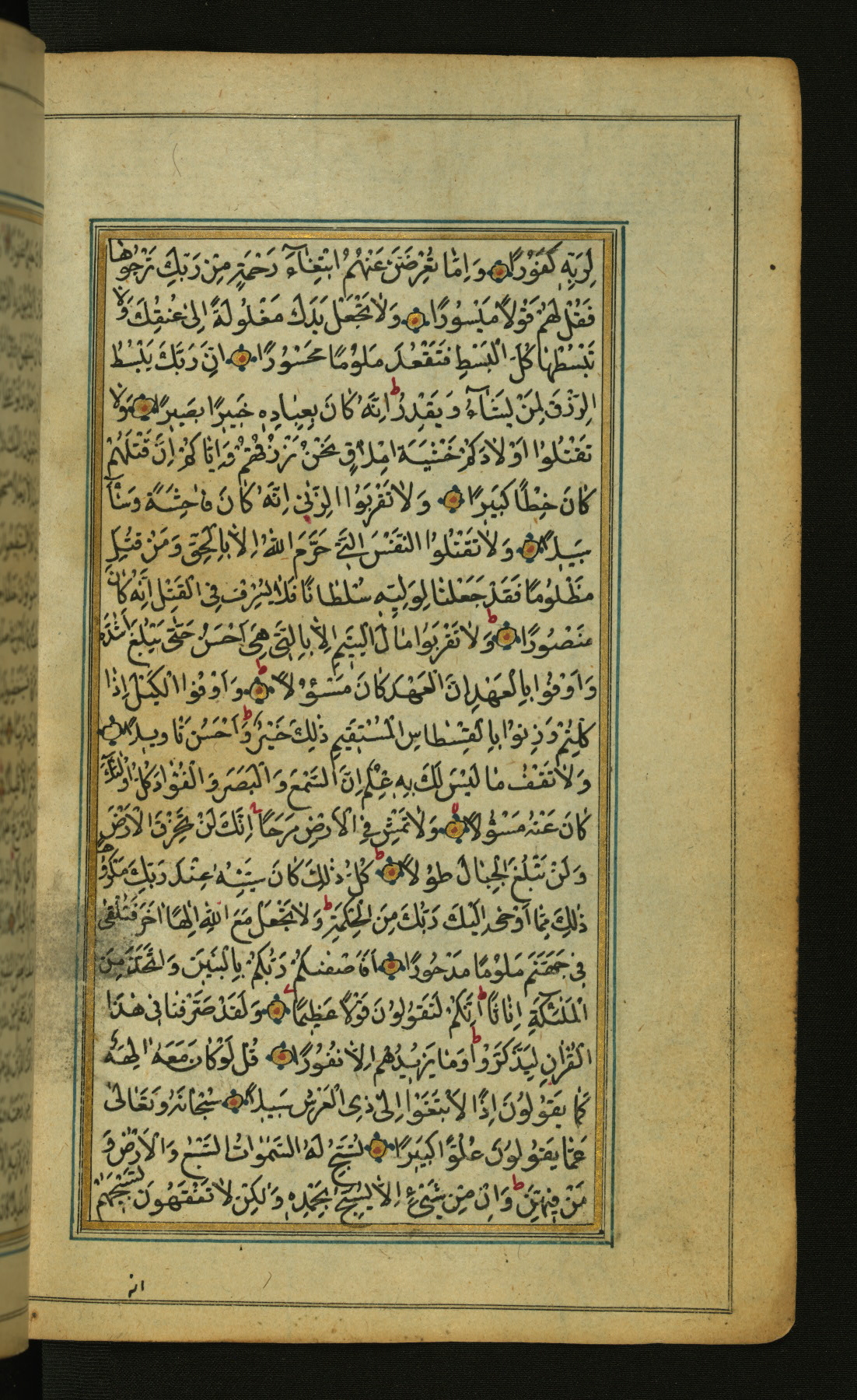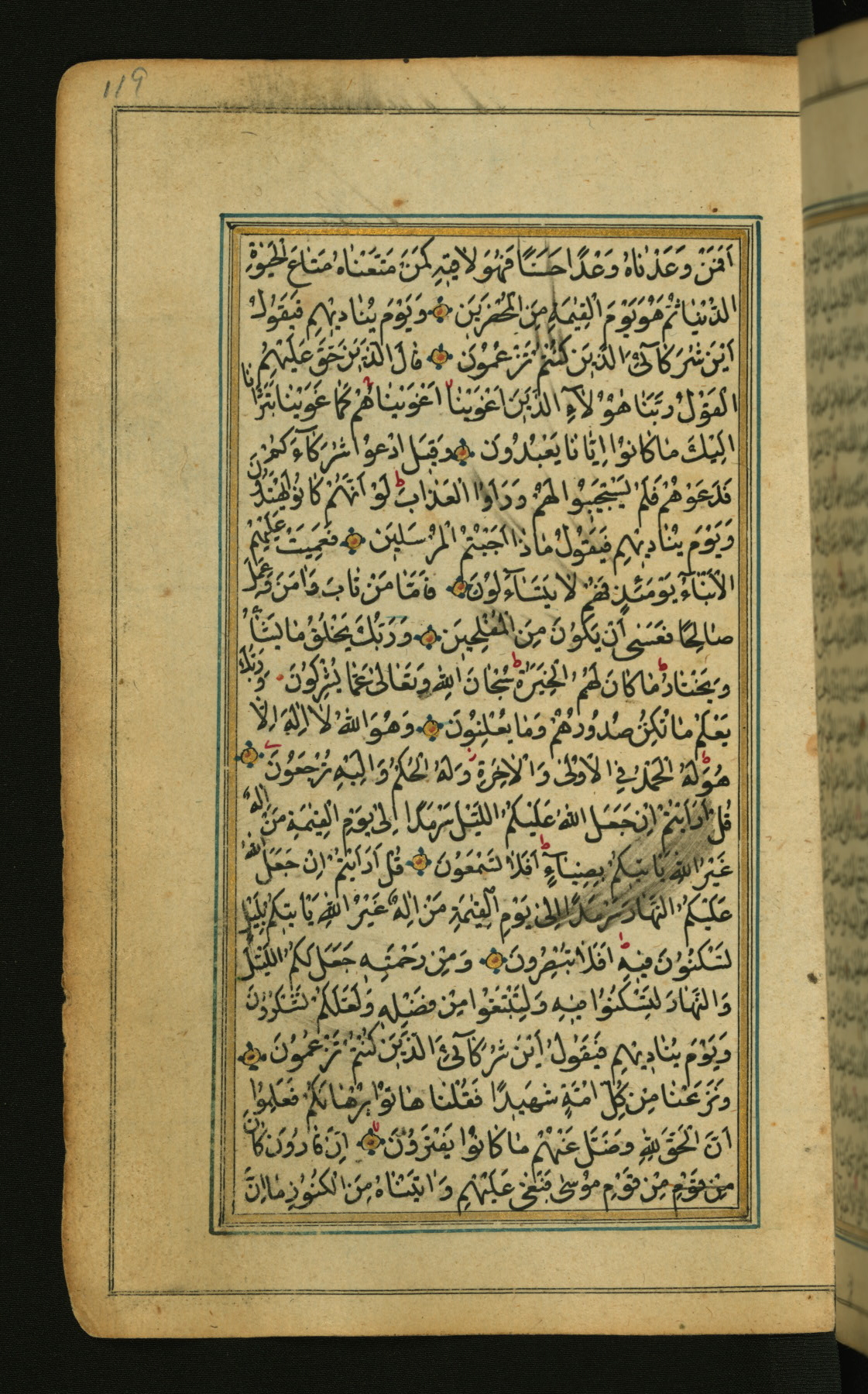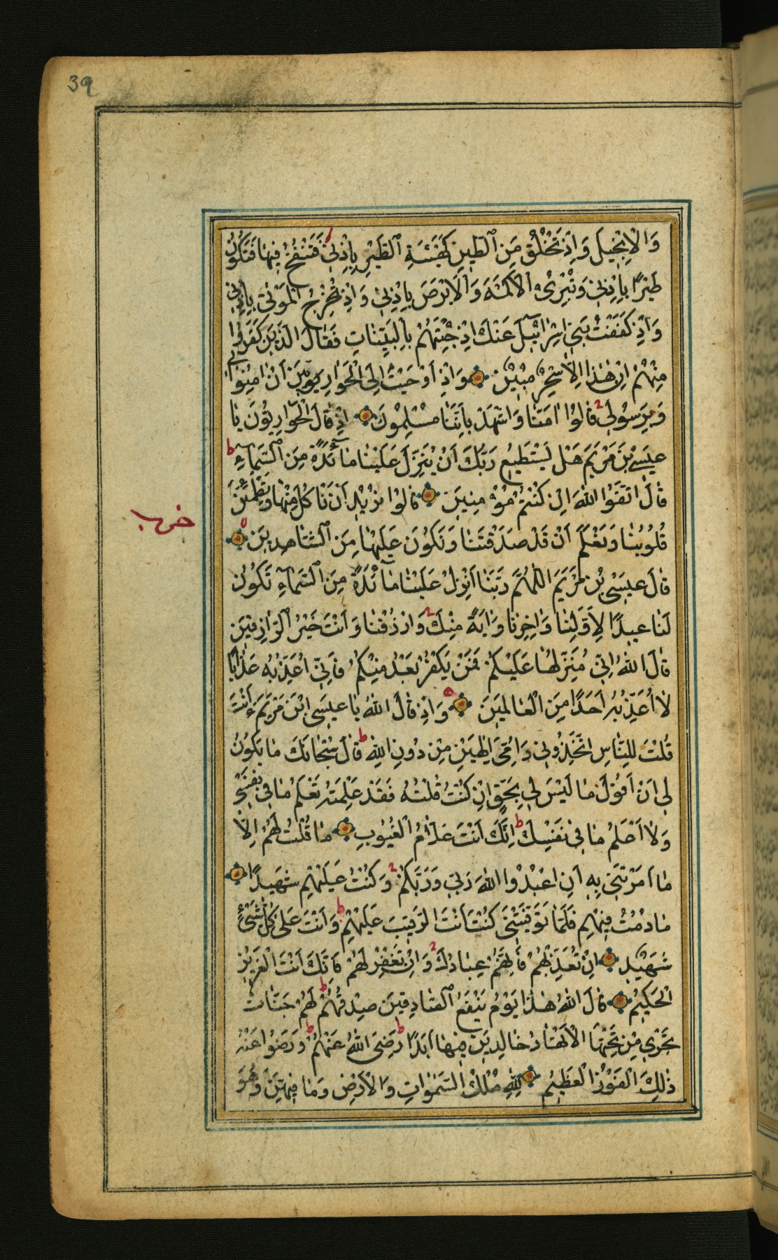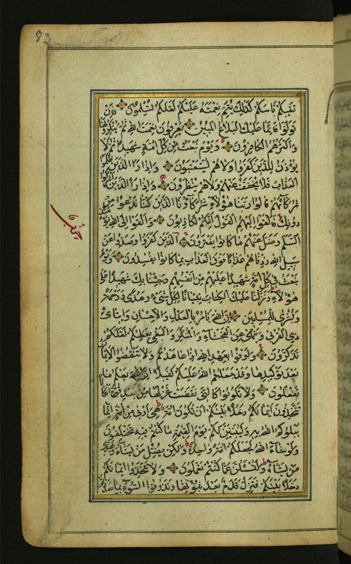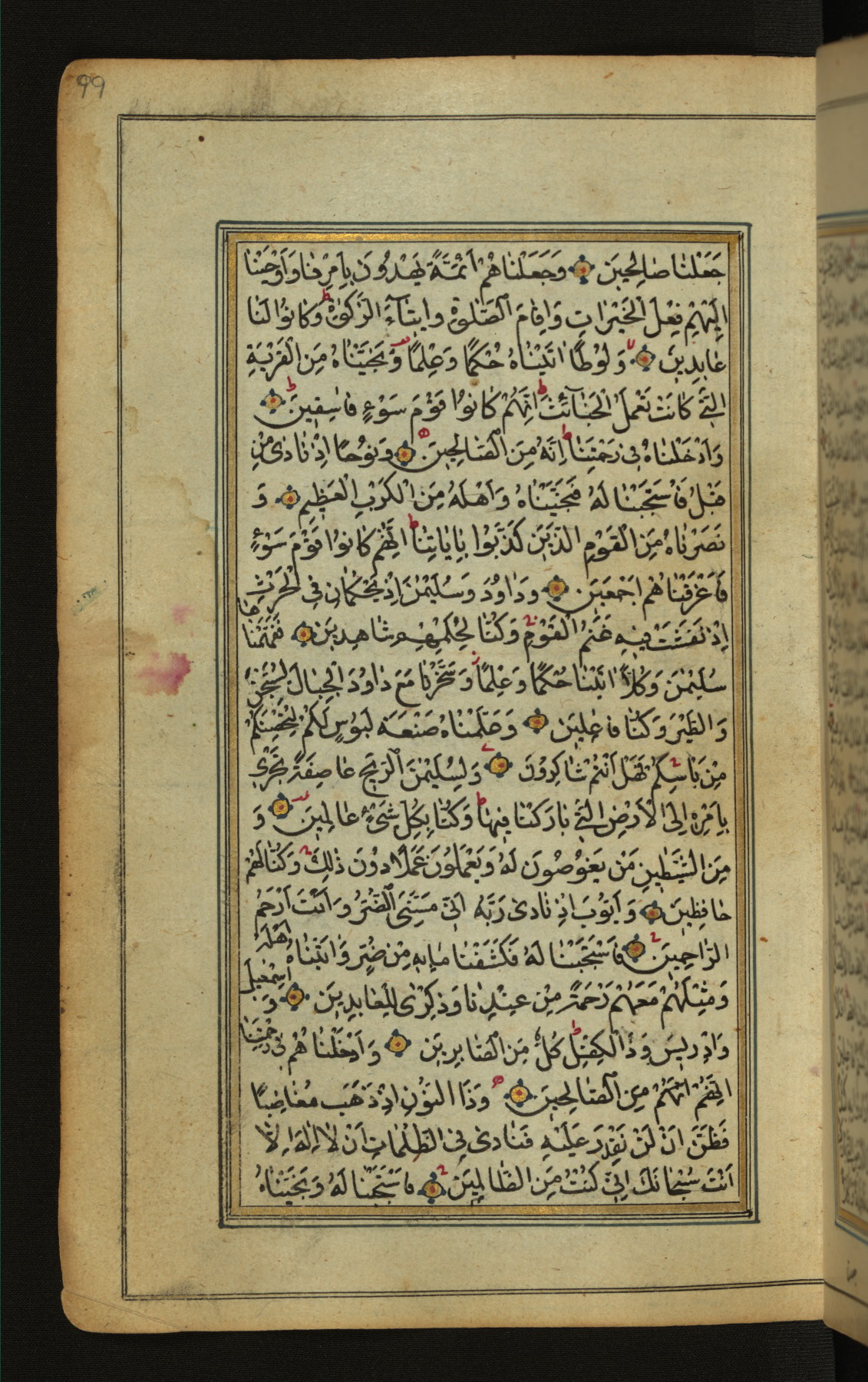 This manuscript is a small illuminated single-volume copy of the Qurʾan, likely produced in Iran. A date is inscribed on the final page, which is interpreted as 1230 AH / 1814-5 CE (fol. 186b). The manuscript opens with an illuminated double-page incipit with the verses of chapter 1 (Sūrat al-fātiḥah) and the initial verses of chapter 2 (Sūrat al-baqarah), decorated with interlinear illumination (fols. 1b-2a). The text is in vocalized naskh script in black ink with reading marks in red and text divisions, such as thirty verses (juzʾ) or sixty verses (ḥizb), in the margins. Illuminated discs with colored dots separate the verses. Chapter headings are in riqāʿ script in red ink on a gold ground. The nineteenth-century lacquer binding with a floral composition on a gold field on the upper and lower boards seems to be contemporary with the manuscript. The insides of both boards are painted with a lobed yellow central medallion and pendants on an orange field.