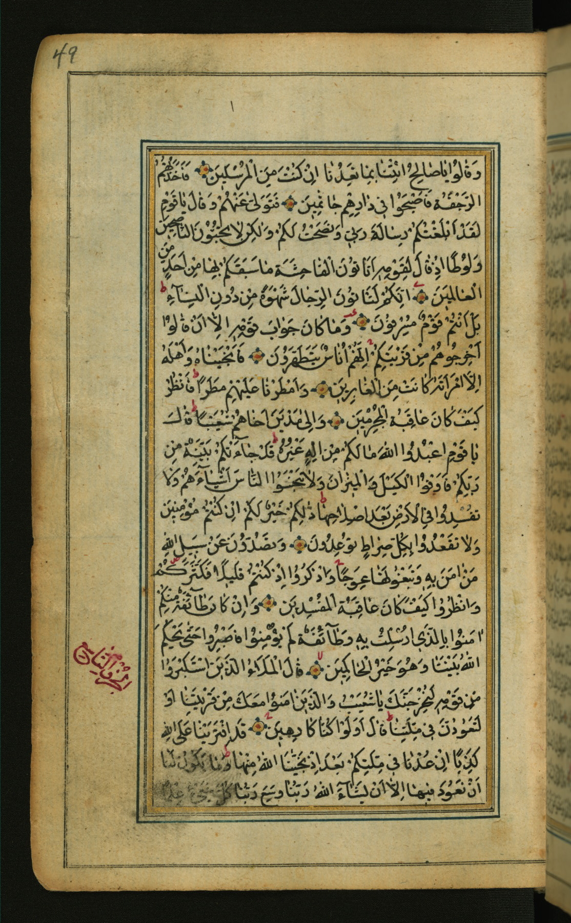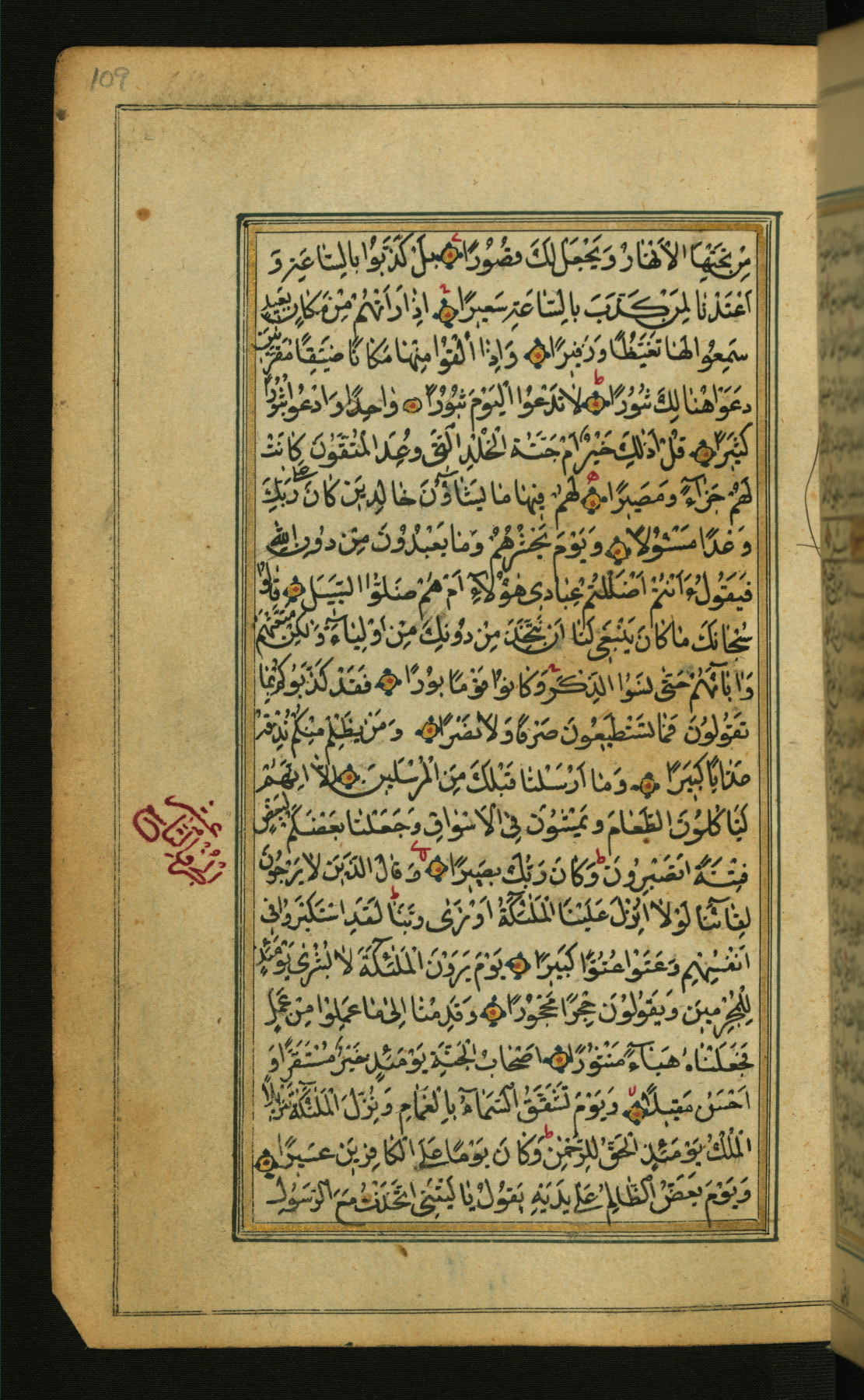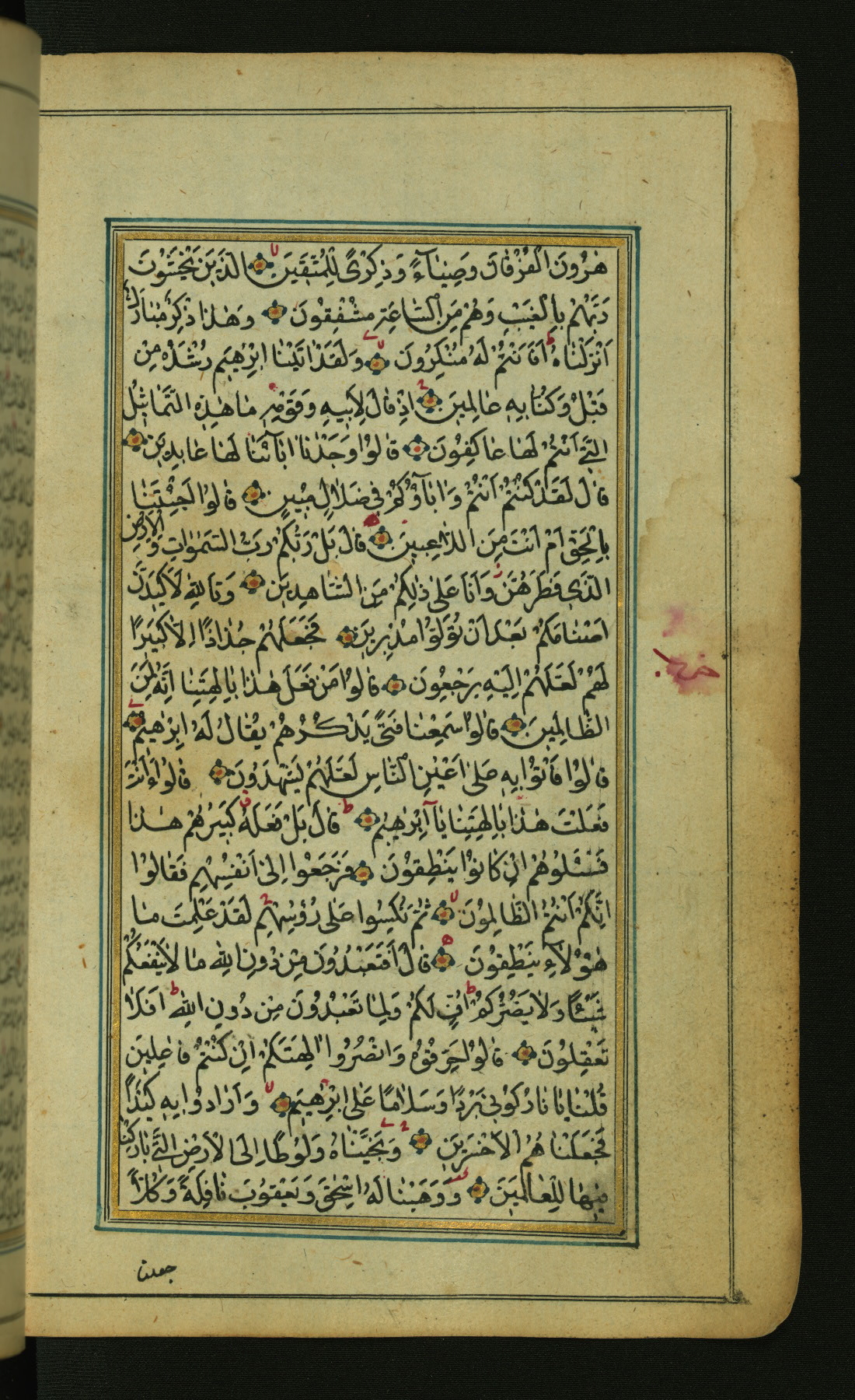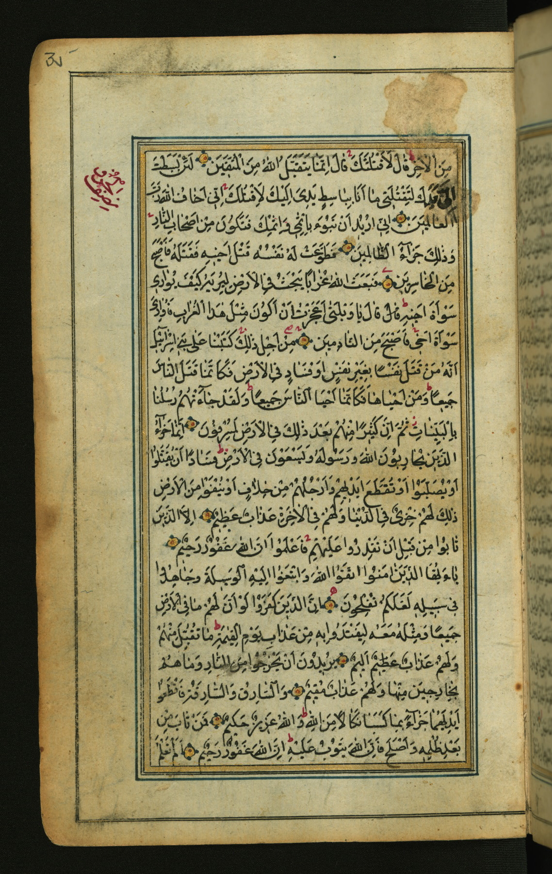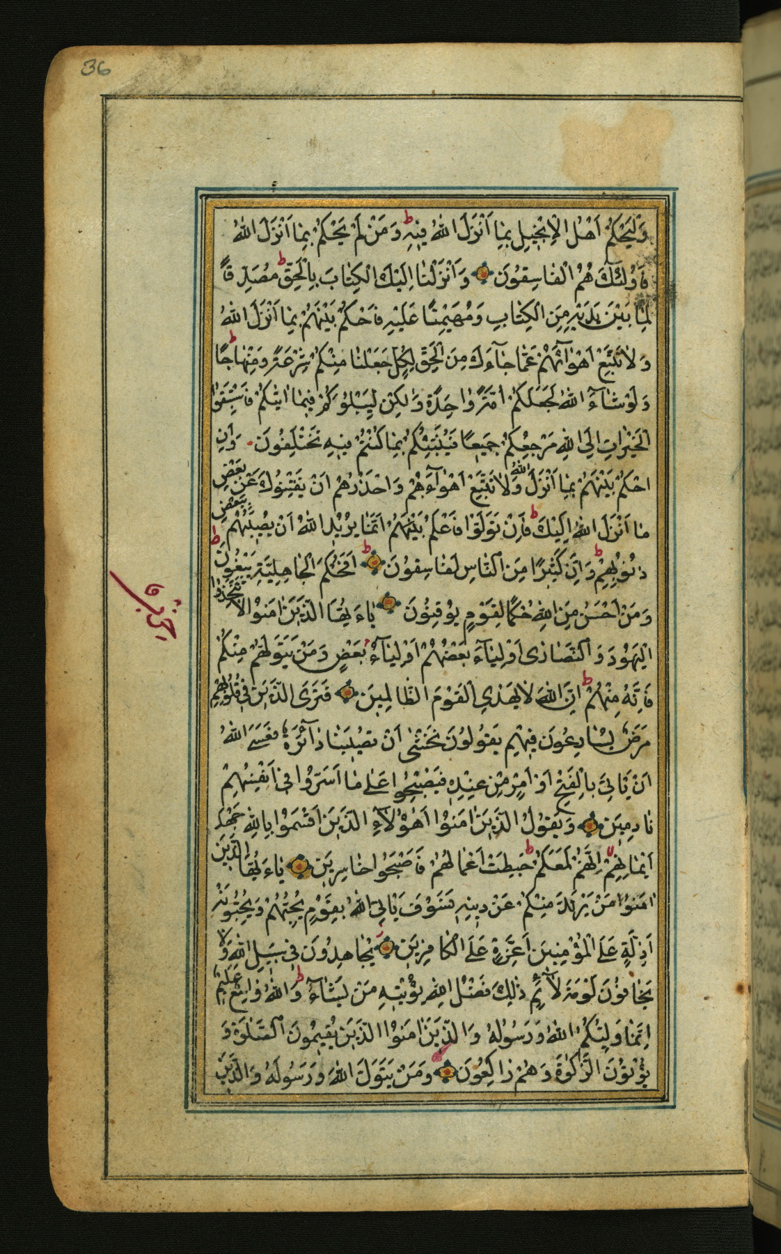 This manuscript is a small illuminated single-volume copy of the Qurʾan, likely produced in Iran. A date is inscribed on the final page, which is interpreted as 1230 AH / 1814-5 CE (fol. 186b). The manuscript opens with an illuminated double-page incipit with the verses of chapter 1 (Sūrat al-fātiḥah) and the initial verses of chapter 2 (Sūrat al-baqarah), decorated with interlinear illumination (fols. 1b-2a). The text is in vocalized naskh script in black ink with reading marks in red and text divisions, such as thirty verses (juzʾ) or sixty verses (ḥizb), in the margins. Illuminated discs with colored dots separate the verses. Chapter headings are in riqāʿ script in red ink on a gold ground. The nineteenth-century lacquer binding with a floral composition on a gold field on the upper and lower boards seems to be contemporary with the manuscript. The insides of both boards are painted with a lobed yellow central medallion and pendants on an orange field.