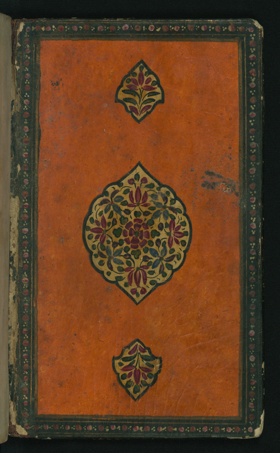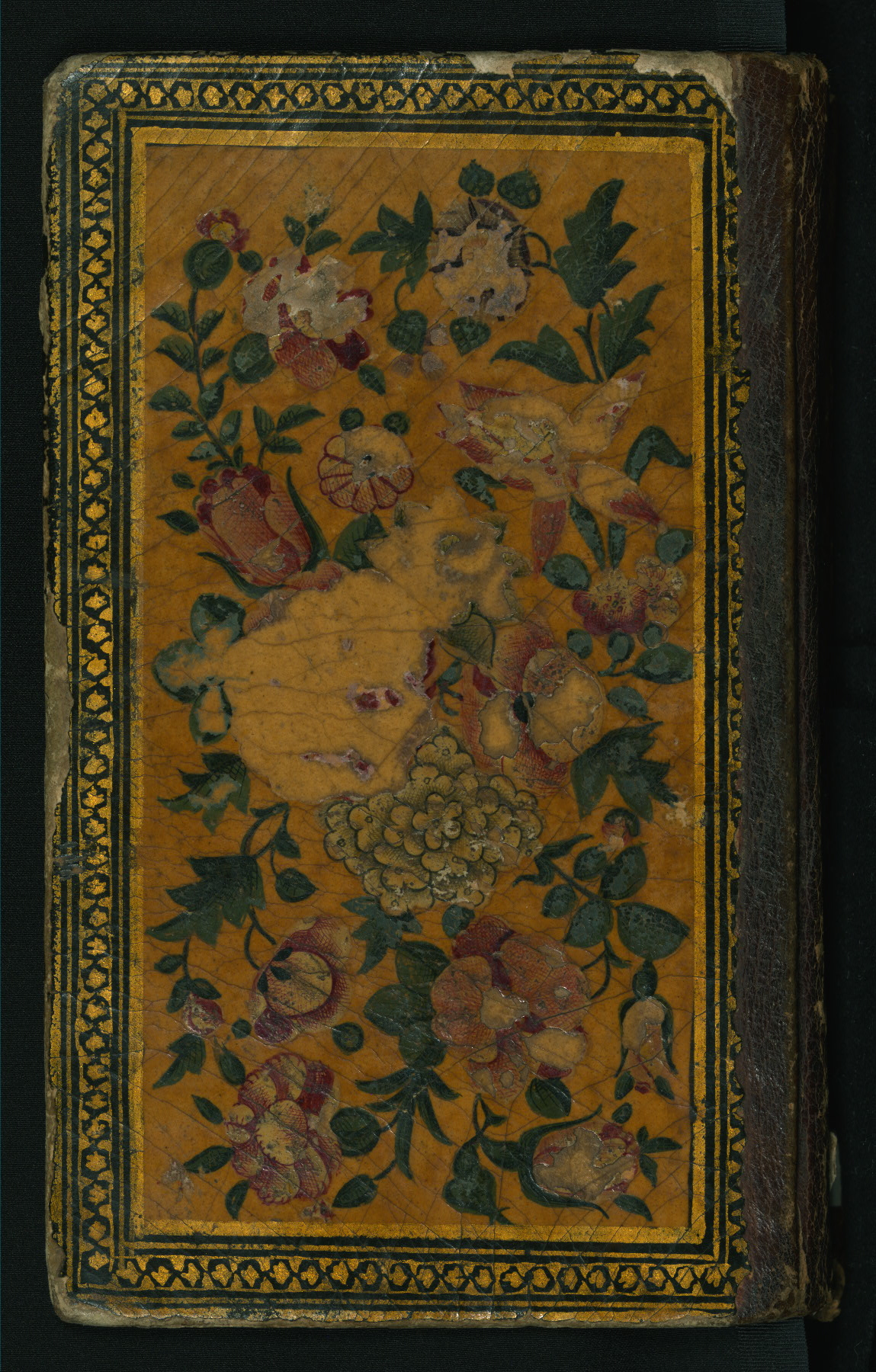Contemporary with manuscript; lacquer binding (no flap); floral composition on a gold ground enclosed by a gold frame with a repeating pattern on a black ground; insides of both upper and lower boards painted with a lobed, yellow central medallion and pendants with floral motifs on an orange ground, possibly in India (Kashmir)