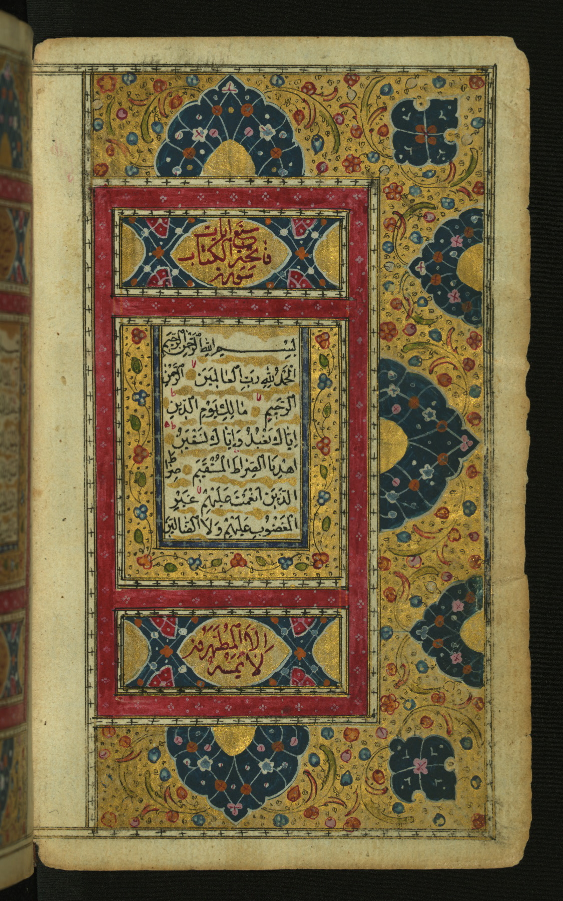- Label: This is the right side of a double-page illuminated incipit. The verses of chapter 1 (Sūrat al-fātiḥah), are written in a vocalized naskh script in black ink with reading marks in red and interlinear gold decoration. The chapter headings and indication of number of verses are written in riqā‘ script in red ink on a gold ground in the upper rectangular panel. A wide illuminated border with blue half medallions and polychrome arabesques surrounds the text. The upper and lower panels and text area are separated by red frames with white dots and a narrow white border with black motifs.