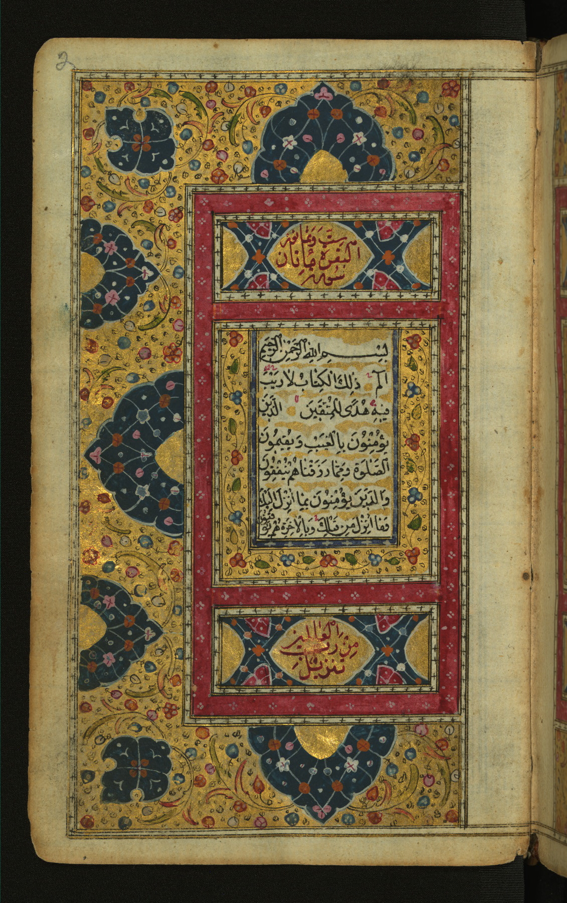 - Label: This is the left side of a double-page illuminated incipit. The verses of chapter 2 (Sūrat al-baqarah), are written in a vocalized naskh script in black ink with reading marks in red and interlinear gold decoration. The chapter headings and indication of number of verses are written in riqā‘ script in red ink on a gold ground in the upper rectangular panel. A wide illuminated border with blue half medallions and polychrome arabesques surrounds the text. The upper and lower panels and text area are separated by red frames with white dots and a narrow white border with black motifs.
