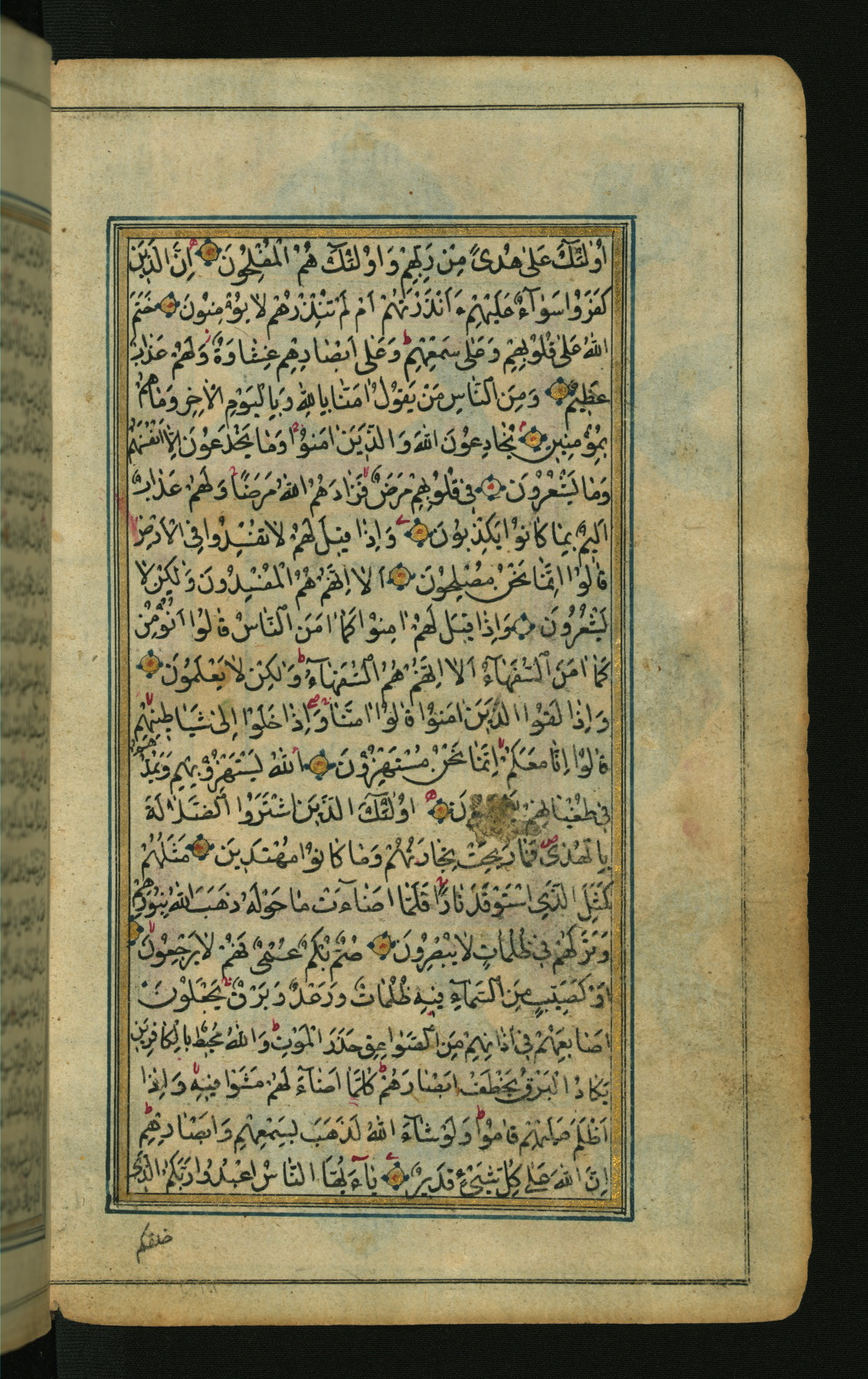 - Decoration note: Double-page illuminated incipit (fols. 1b-2a); chapter headings in riqāʿ script in red ink on gold ground; illuminated discs with colored dots separating verses; illuminated text frame in gold, black, and blue