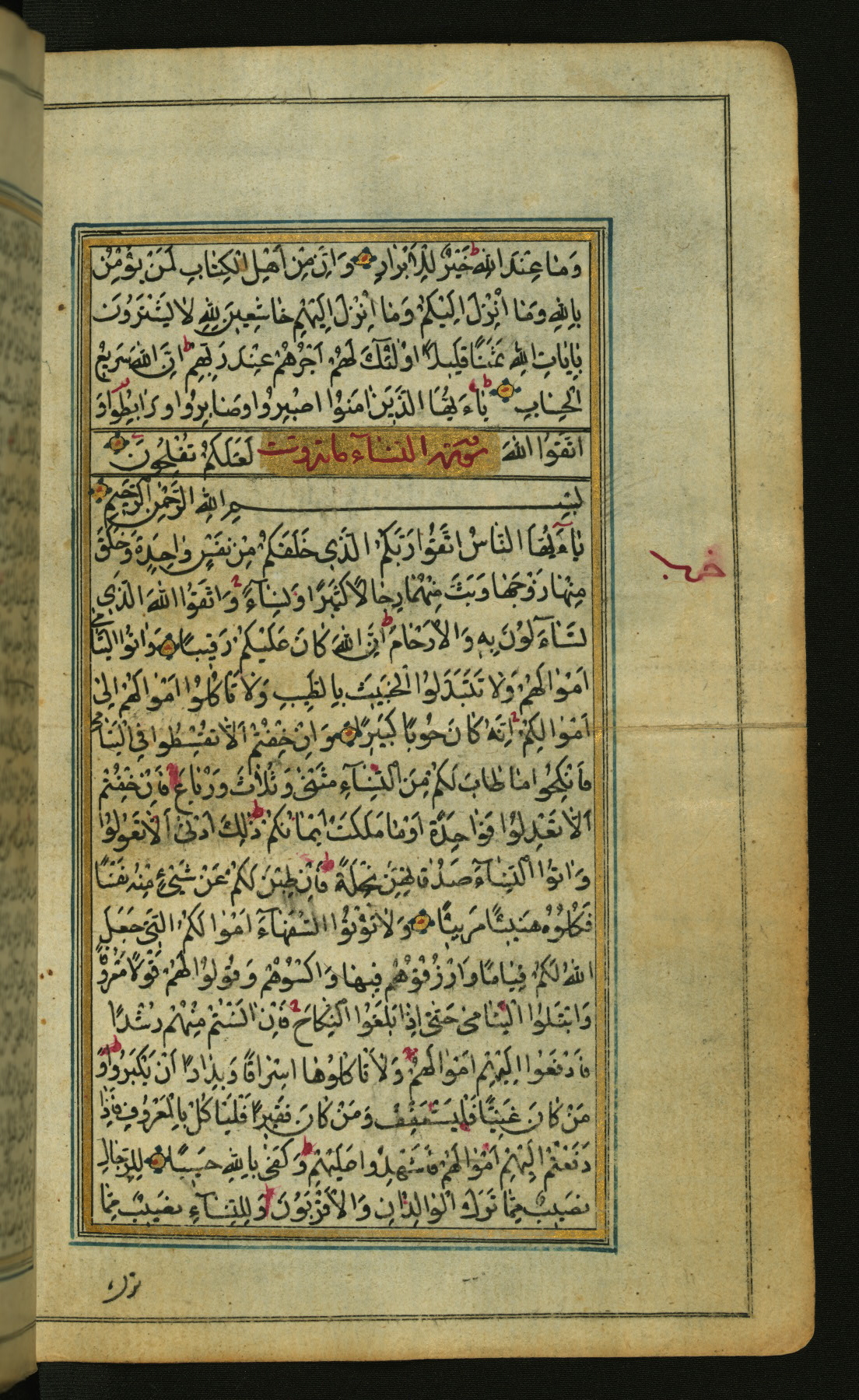 - Label: This text page has an illuminated chapter heading for chapter 4 (Sūrat al-nisā') in riqāʿ script in red ink on a gold ground. The text is in vocalized naskh script in black ink with reading marks in red, and illuminated discs with colored dots separate the verses.