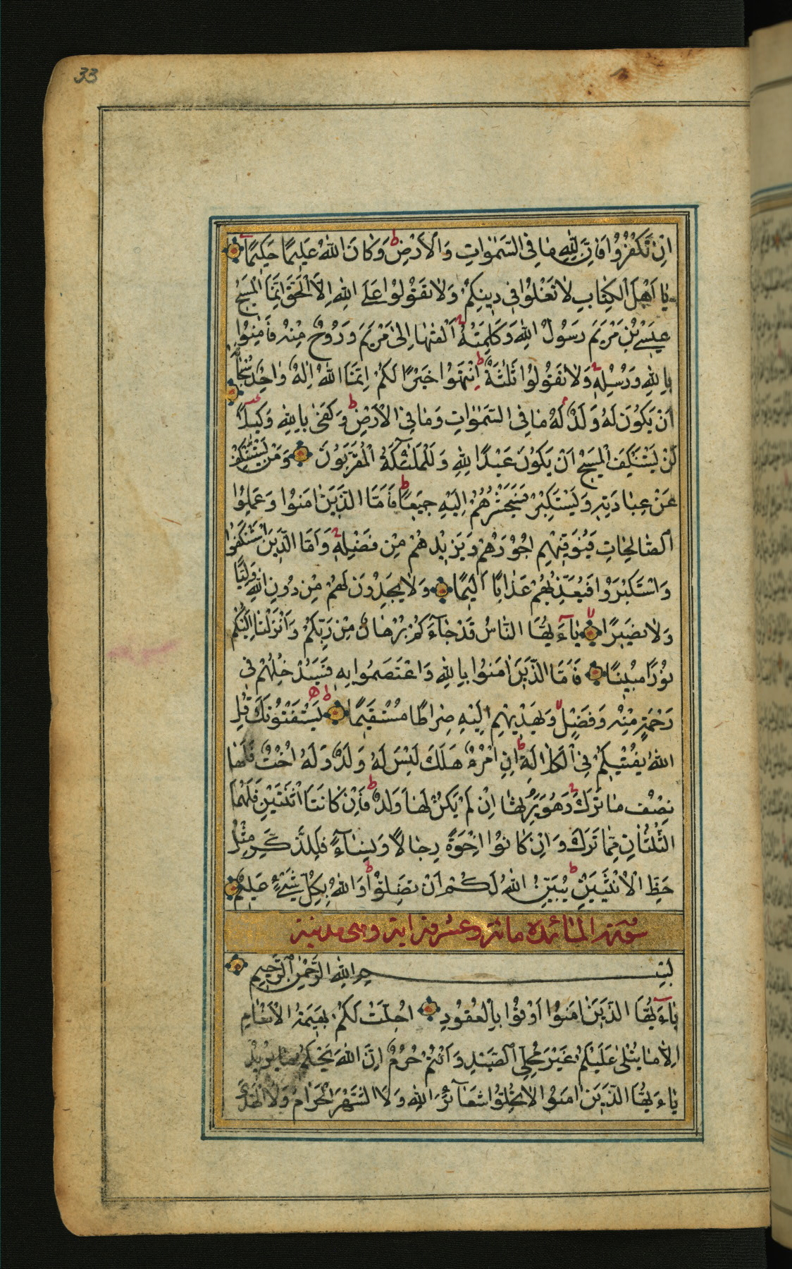 - Label: This text page has an illuminated chapter heading for chapter 5 (Sūrat al-mā'idah), written in riqāʿ script in red ink on a gold ground. The text is in vocalized naskh script in black ink with reading marks in red, and illuminated discs with colored dots separate the verses.