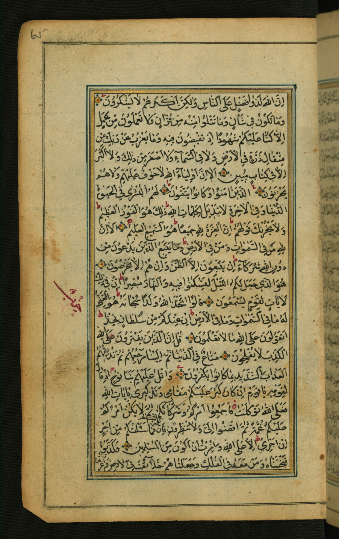 - Label: The text is in vocalized naskh script in black ink with reading marks in red. In the margin at the right is the textual divider for sixty verses (ḥizb).
