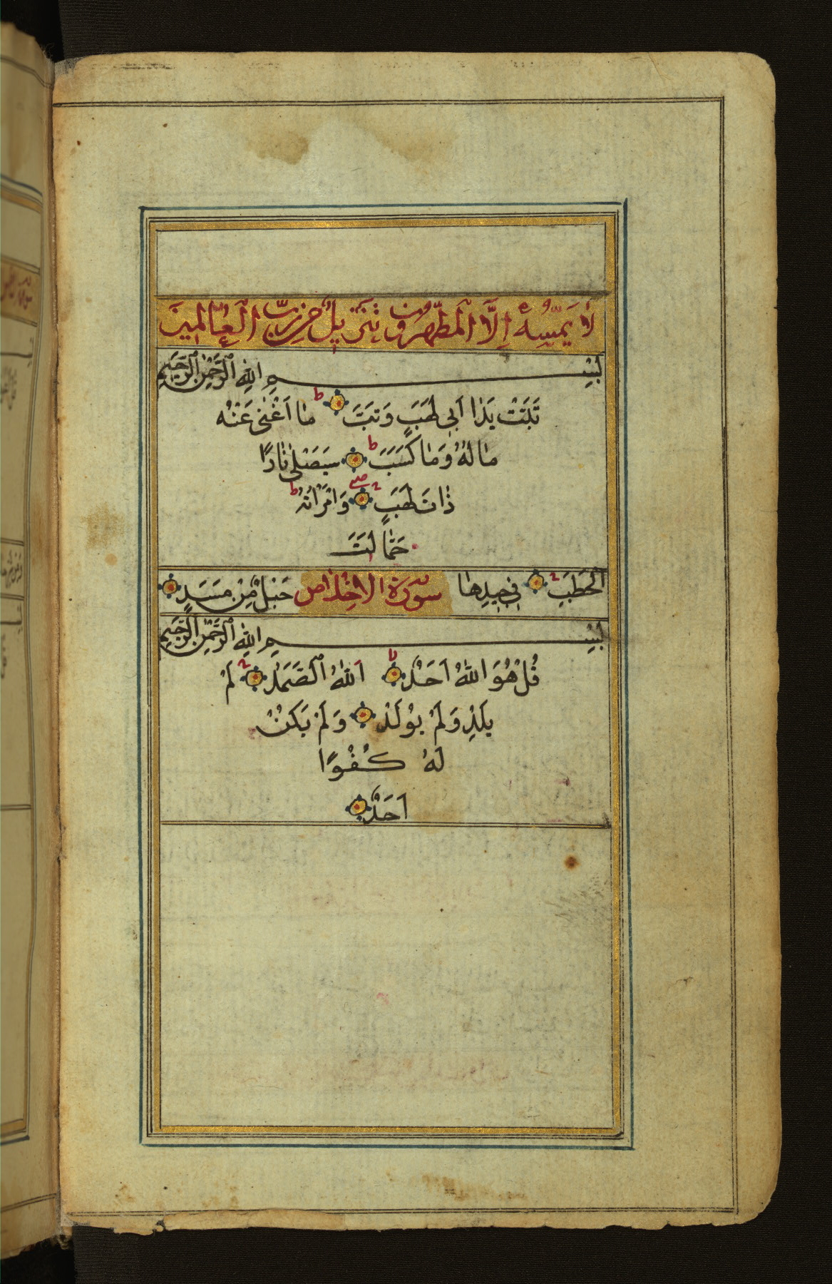 - Label: This text page has two illuminated chapter headings written in riqāʿ script in red ink on a gold ground for chapter 111 (Sūrat al-lahab) and chapter 112 (Sūrat al-ilkhās).