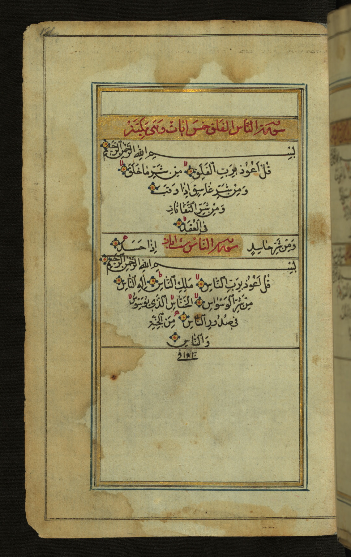 - Label: Chapters 113 (Sūrat al-falaq) and 114 (Sūrat al-nās) are written in vocalized naskh script in black ink with reading marks in red. A date is inscribed as 1030 AH / 1621 CE and is believed to have been forged. It is now interpreted as 1230 AH / 1814-5 CE.