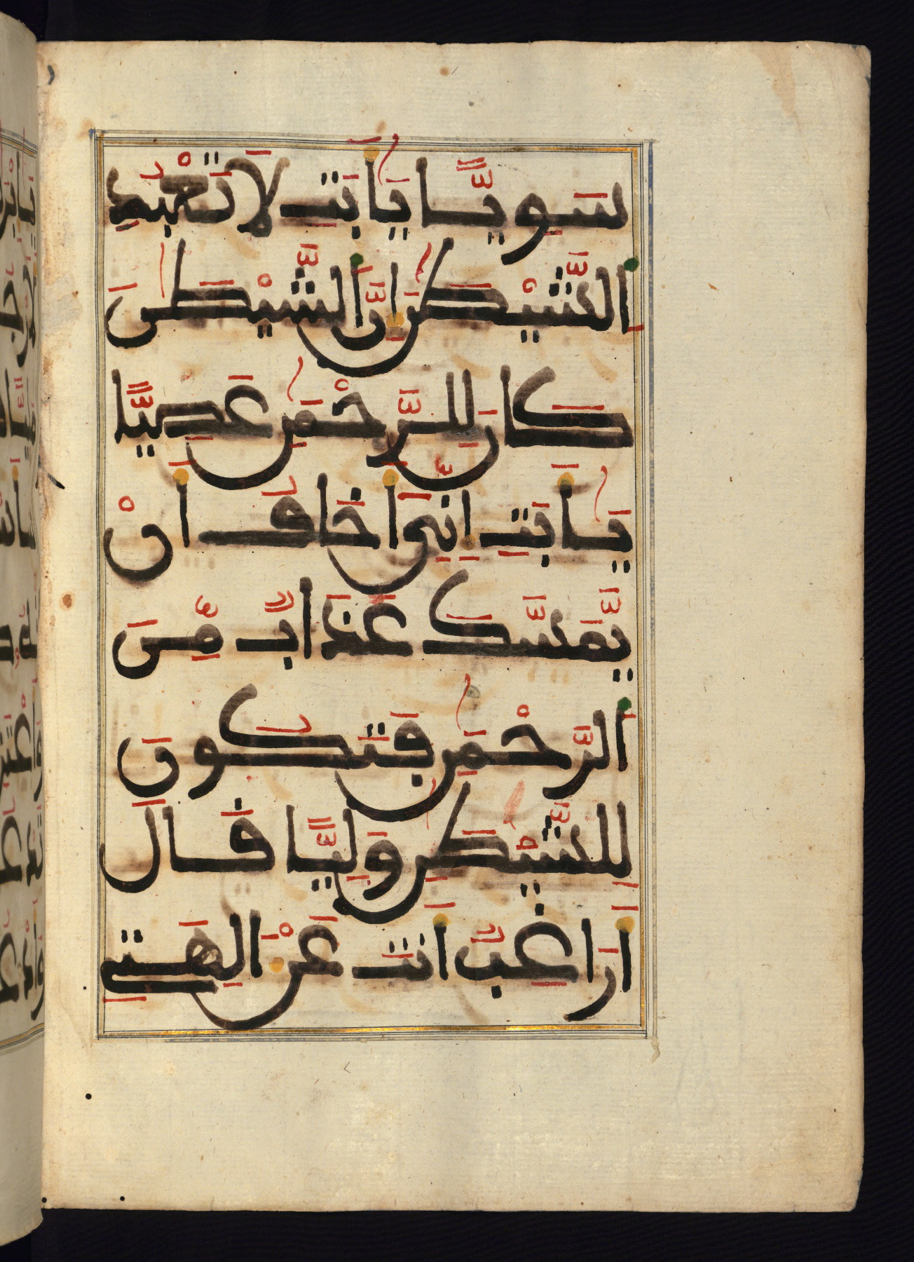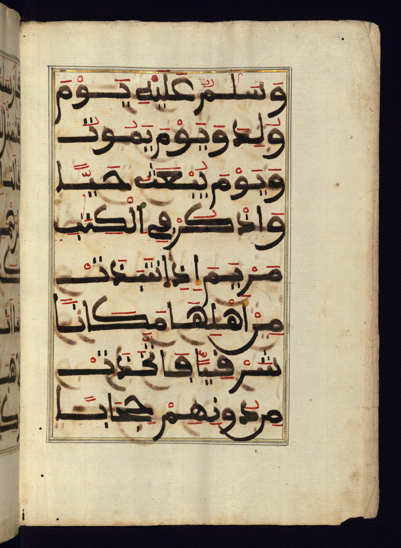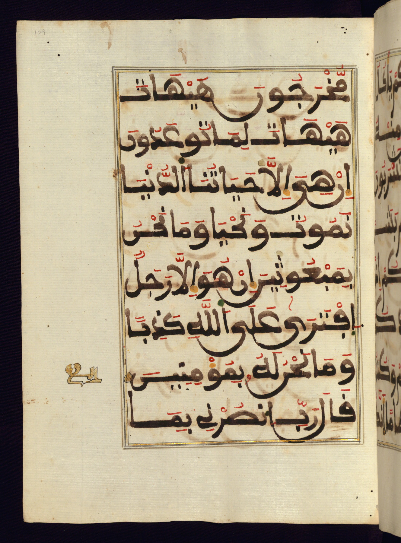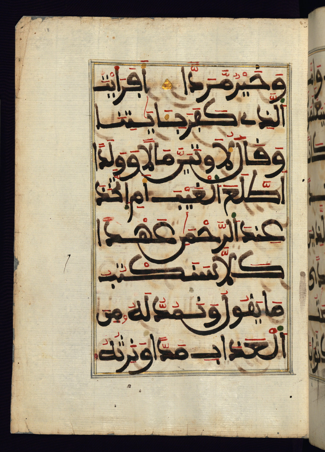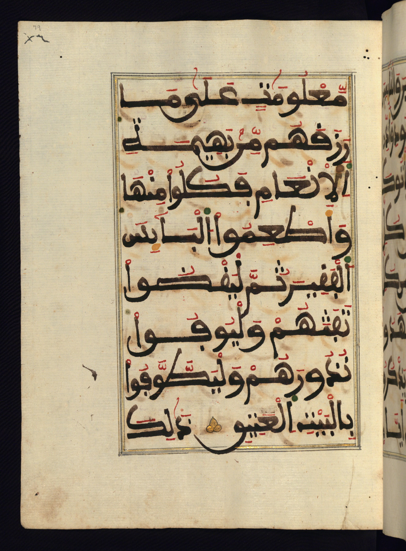 This manuscript is a fragment of the Qur'an, consisting of chapters 19 (Sūrat Maryam) through 23 (Sūrat al-muʾminūn). It was produced in the Maghreb and dates to the twelfth century AH / eighteenth CE. The text is written in a large Maghribī script, with vocalization in red, green, and yellow ink on Italian paper. The codex opens with an illuminated chapter heading for chapter 19 (Sūrat Maryam) written in the New Abbasid (broken cursive) style (fol. 1b) in gold ink within a decorative headpiece. The titles of other chapters are written in the New Abbasid (broken cursive) style in gold ink (fols. 21a, 47b, 70a, and 102a) with a marginal medallion. The blind-tooled goatskin binding is not contemporary with the manuscript and probably dates to the thirteenth century AH / nineteenth CE.