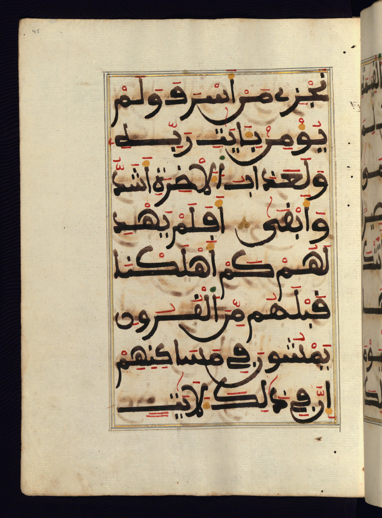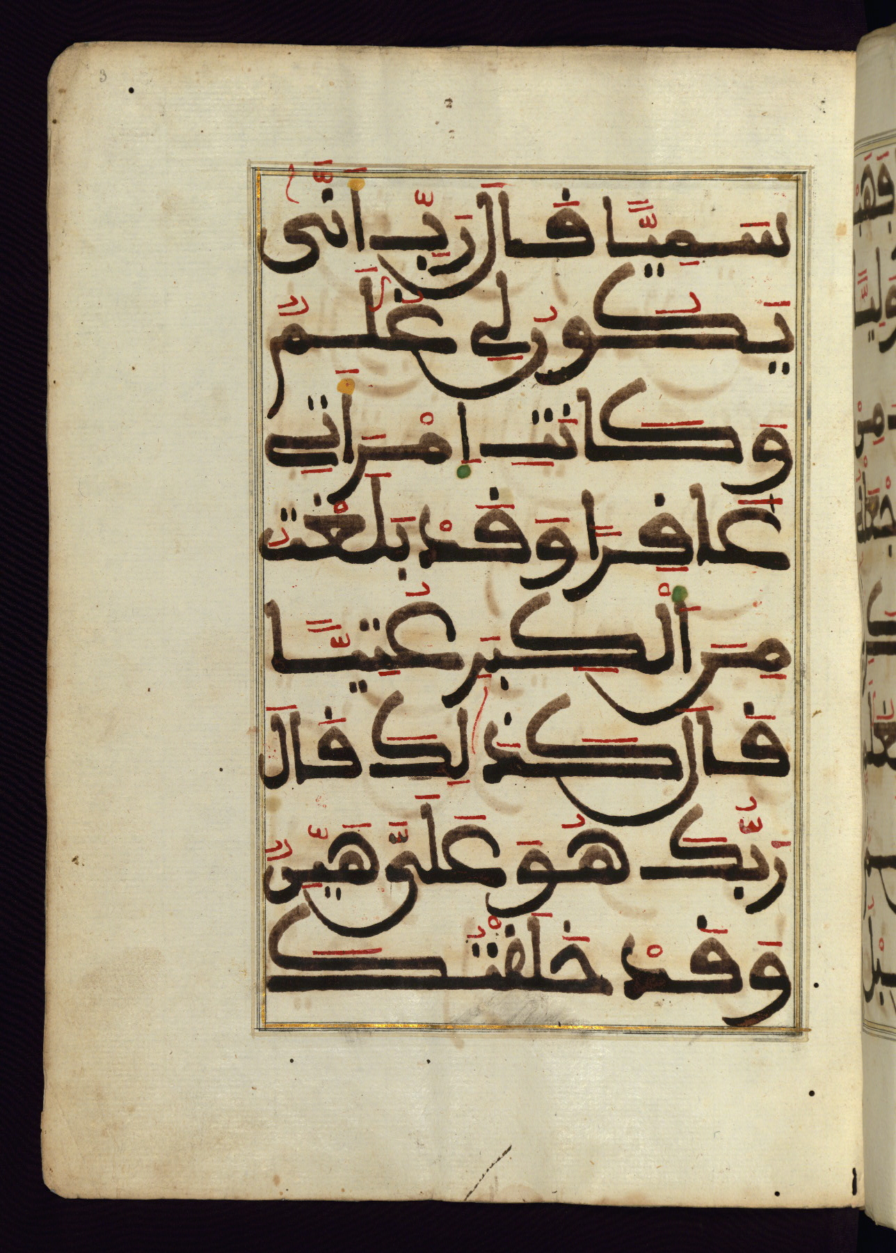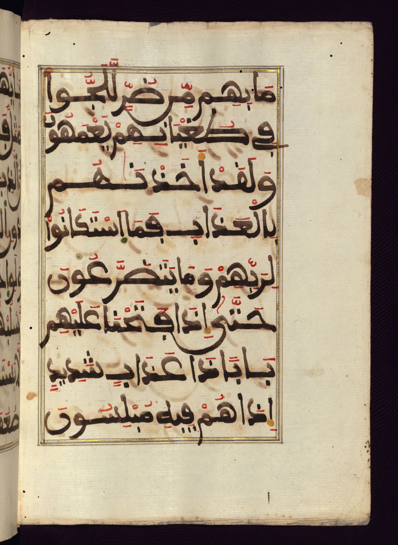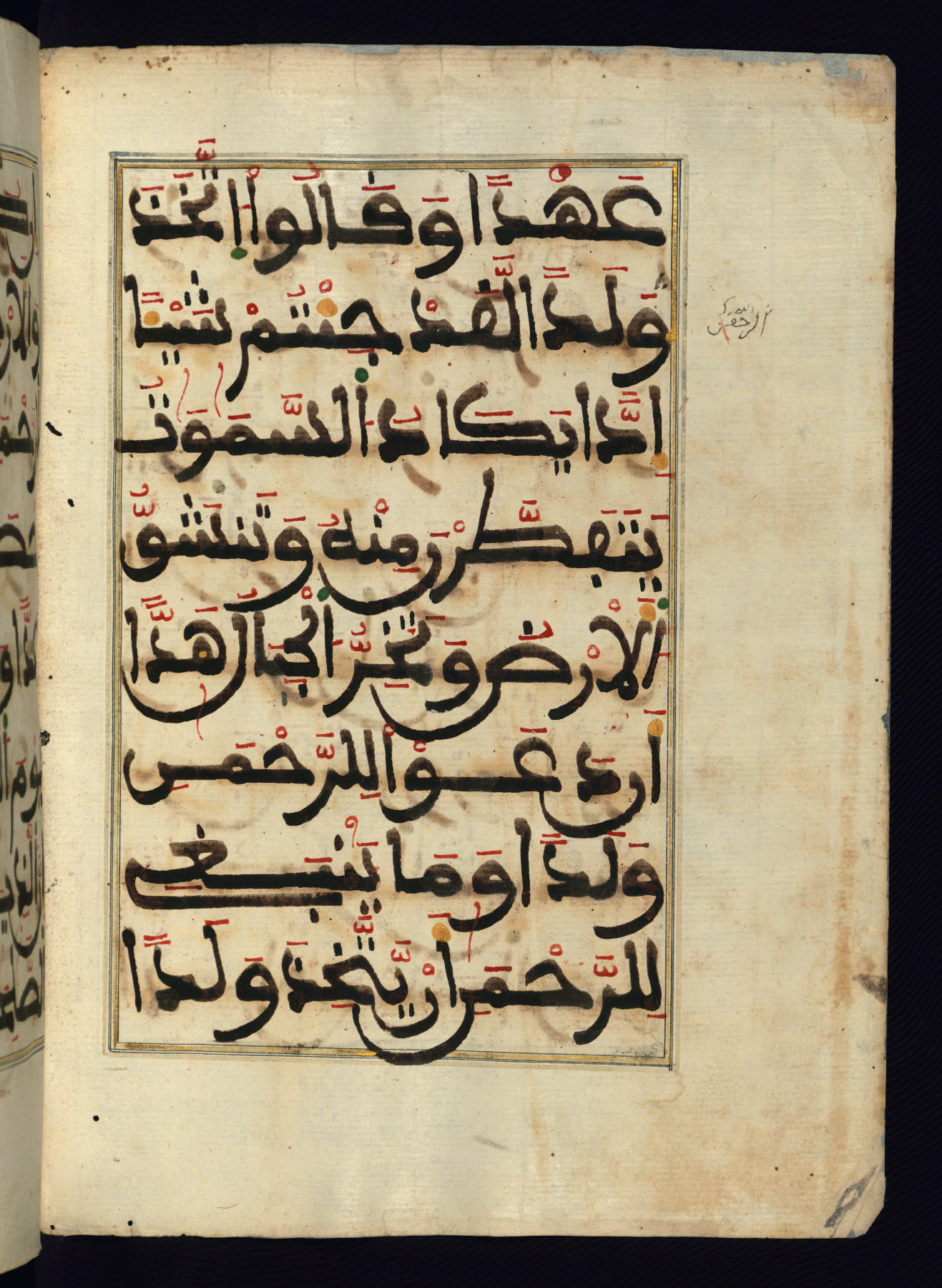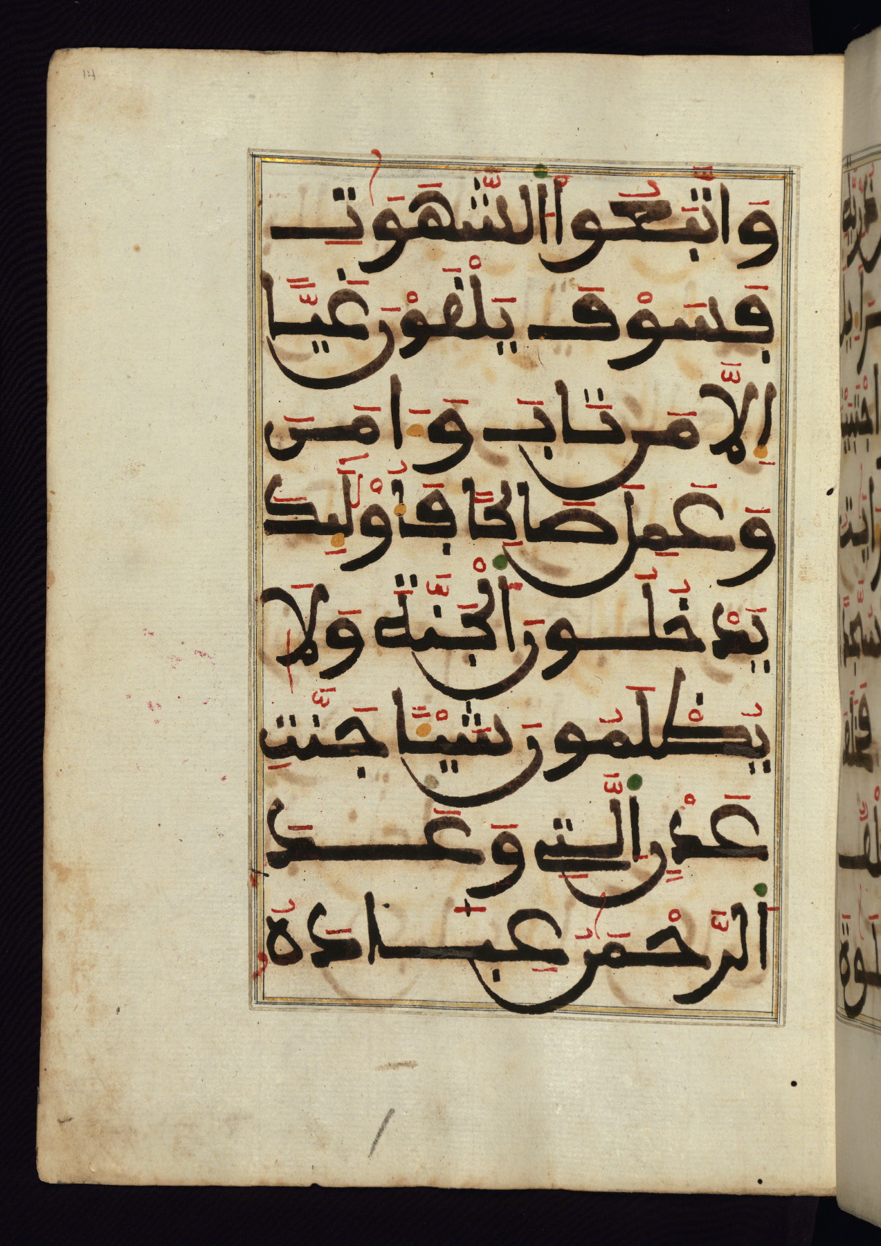 This manuscript is a fragment of the Qur'an, consisting of chapters 19 (Sūrat Maryam) through 23 (Sūrat al-muʾminūn). It was produced in the Maghreb and dates to the twelfth century AH / eighteenth CE. The text is written in a large Maghribī script, with vocalization in red, green, and yellow ink on Italian paper. The codex opens with an illuminated chapter heading for chapter 19 (Sūrat Maryam) written in the New Abbasid (broken cursive) style (fol. 1b) in gold ink within a decorative headpiece. The titles of other chapters are written in the New Abbasid (broken cursive) style in gold ink (fols. 21a, 47b, 70a, and 102a) with a marginal medallion. The blind-tooled goatskin binding is not contemporary with the manuscript and probably dates to the thirteenth century AH / nineteenth CE.