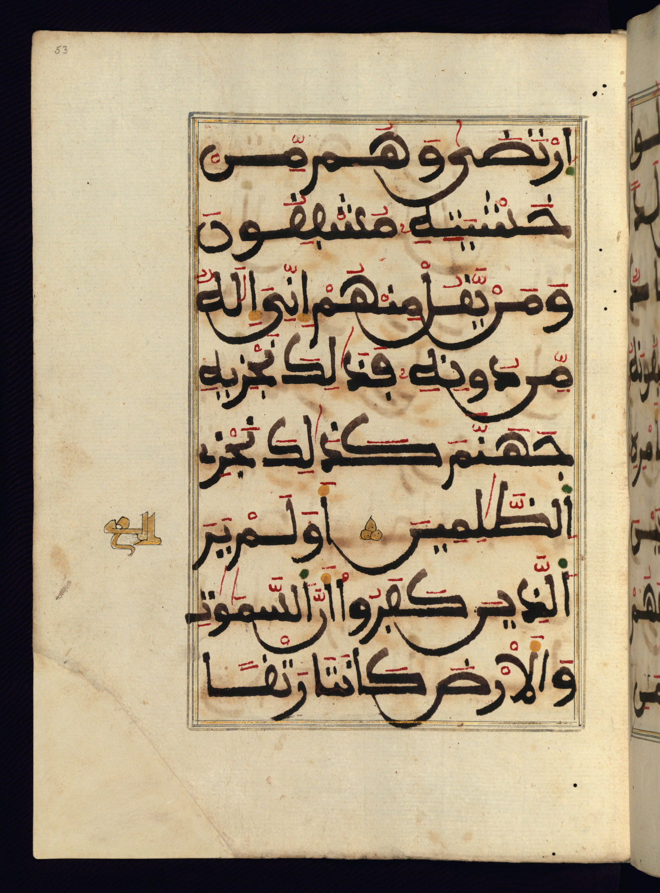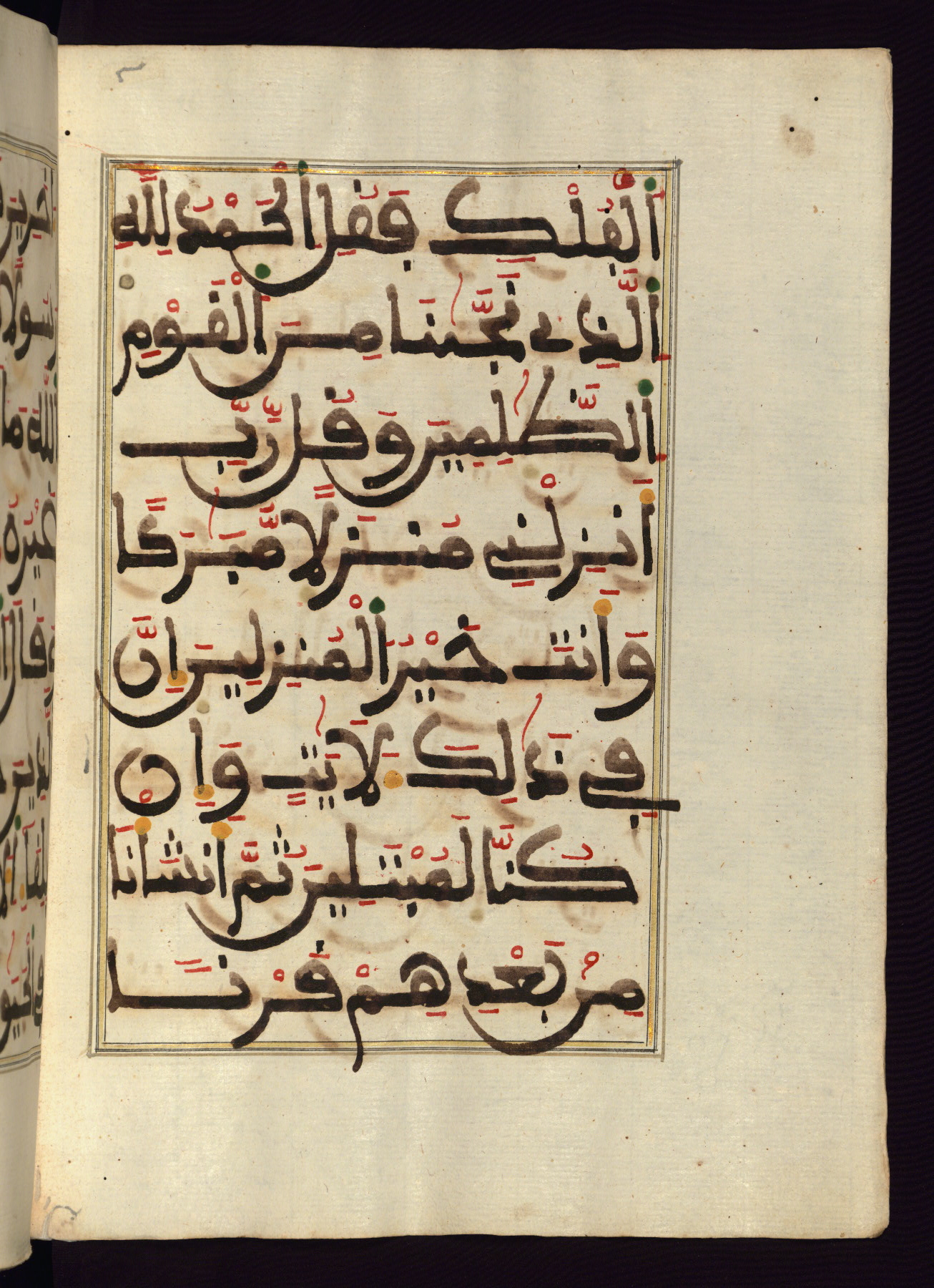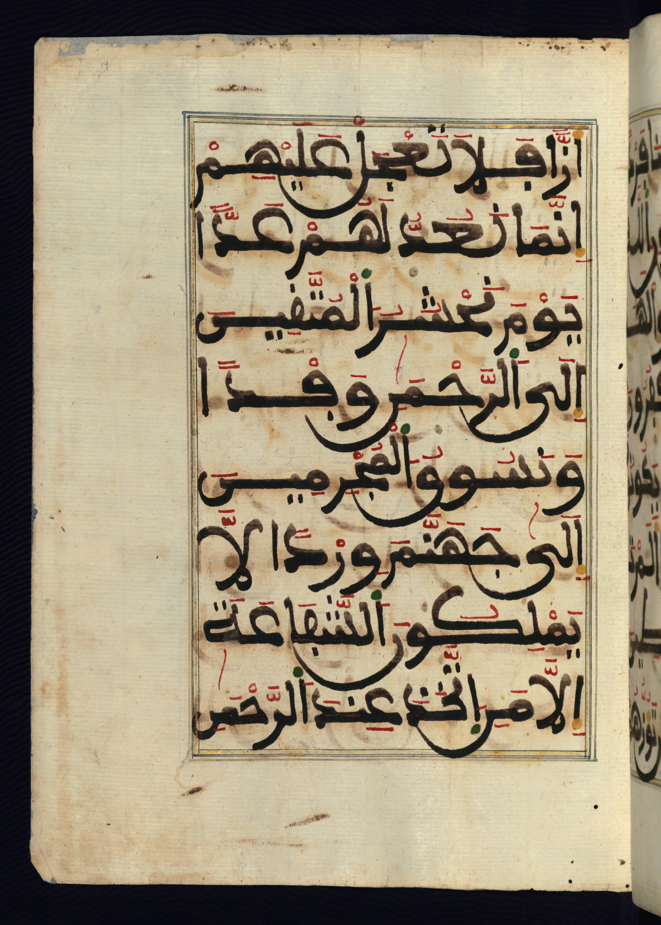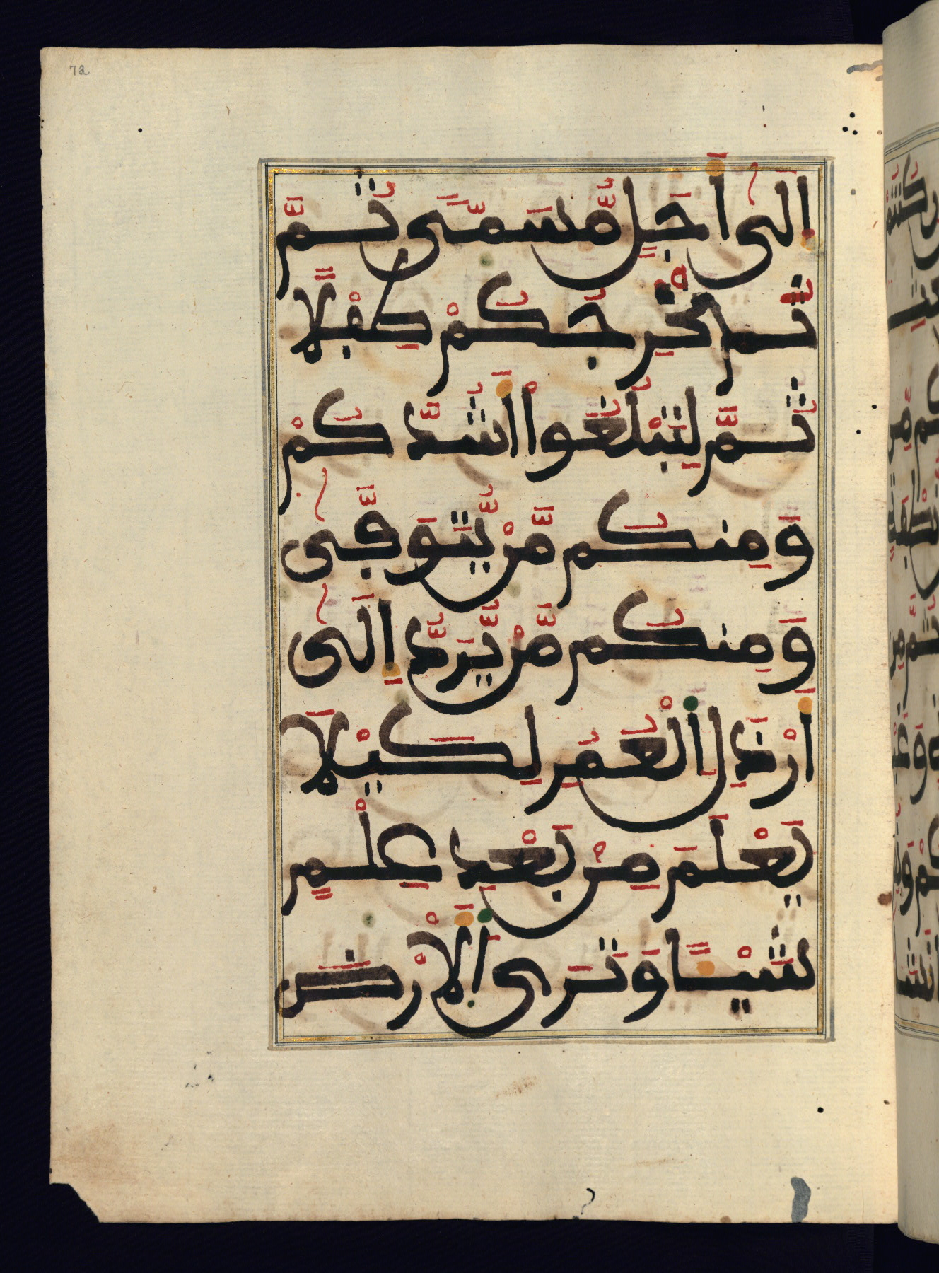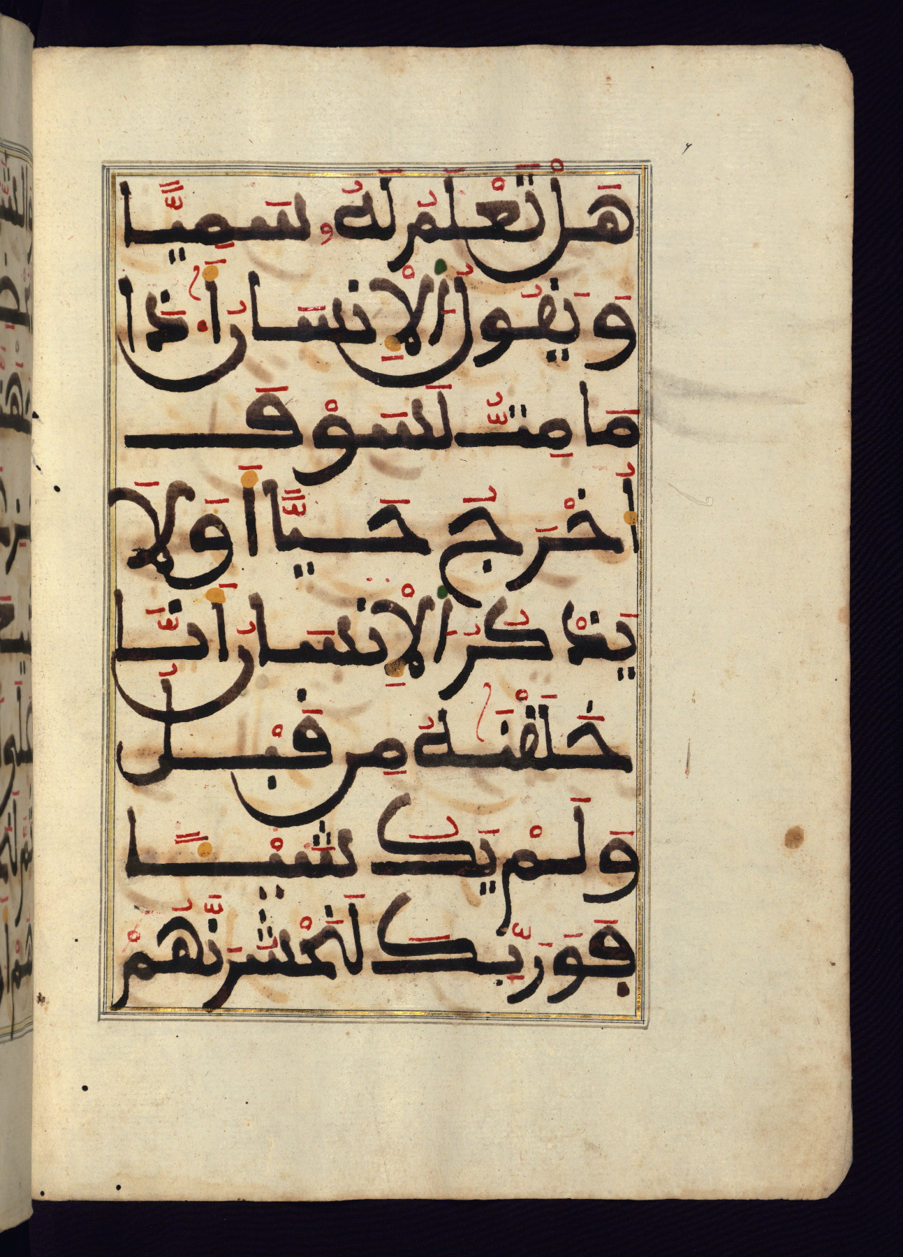 This manuscript is a fragment of the Qur'an, consisting of chapters 19 (Sūrat Maryam) through 23 (Sūrat al-muʾminūn). It was produced in the Maghreb and dates to the twelfth century AH / eighteenth CE. The text is written in a large Maghribī script, with vocalization in red, green, and yellow ink on Italian paper. The codex opens with an illuminated chapter heading for chapter 19 (Sūrat Maryam) written in the New Abbasid (broken cursive) style (fol. 1b) in gold ink within a decorative headpiece. The titles of other chapters are written in the New Abbasid (broken cursive) style in gold ink (fols. 21a, 47b, 70a, and 102a) with a marginal medallion. The blind-tooled goatskin binding is not contemporary with the manuscript and probably dates to the thirteenth century AH / nineteenth CE.