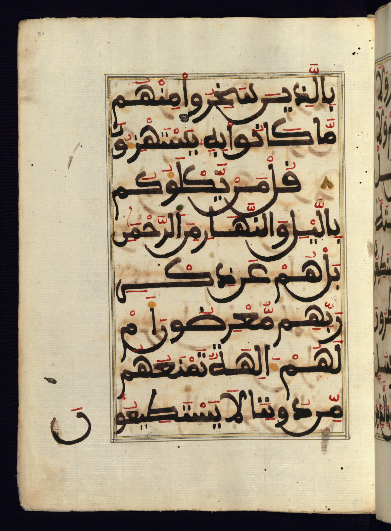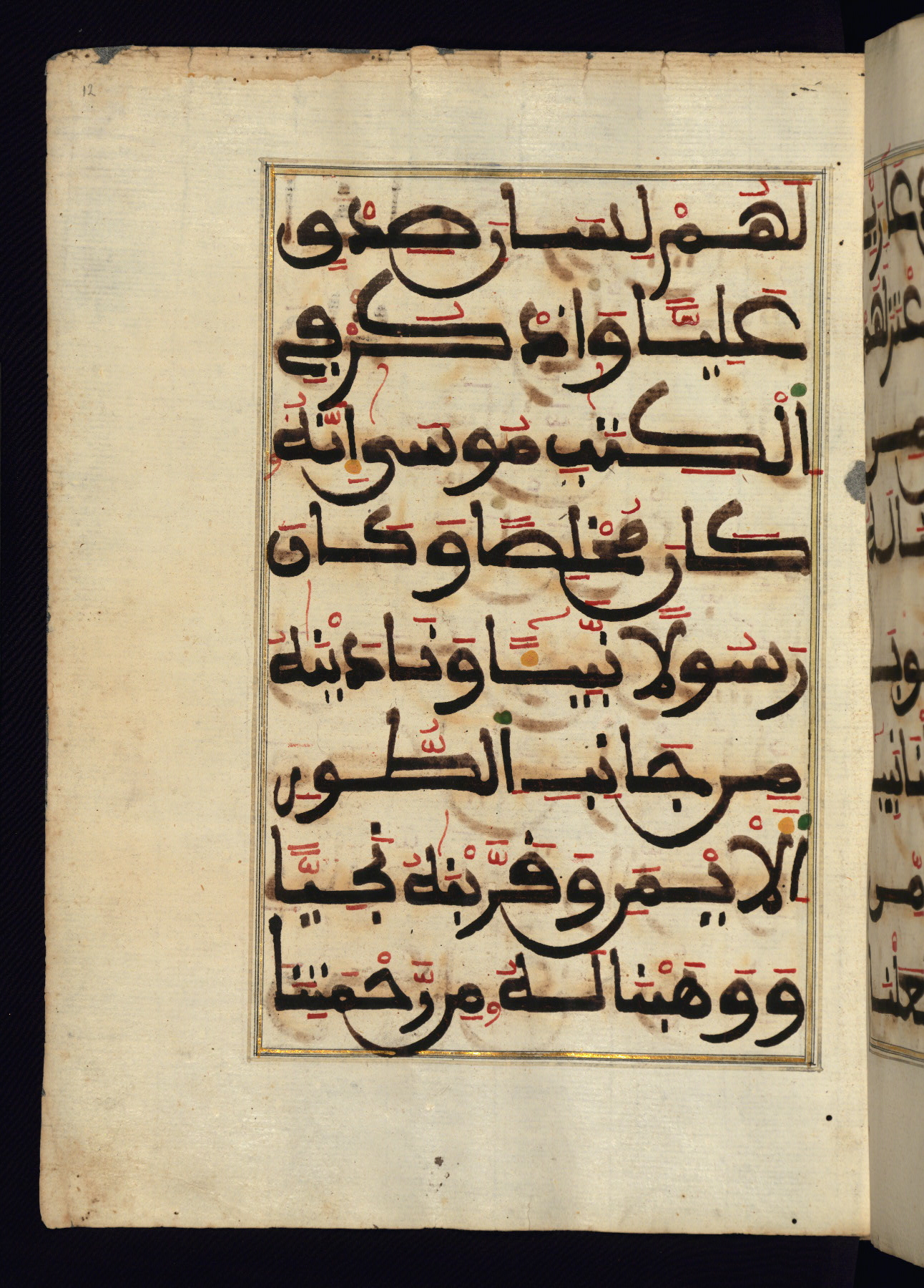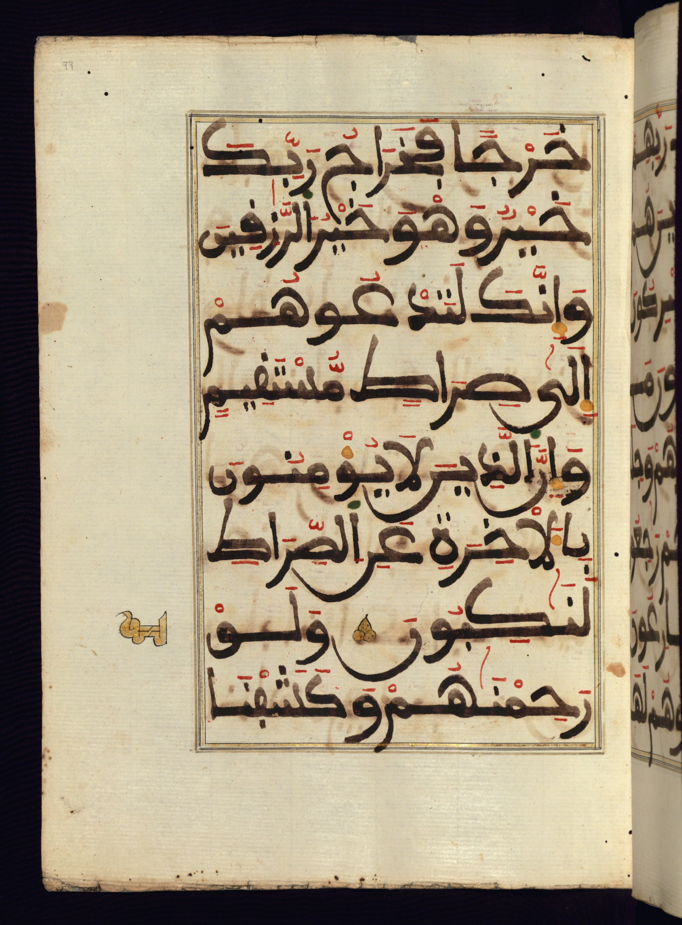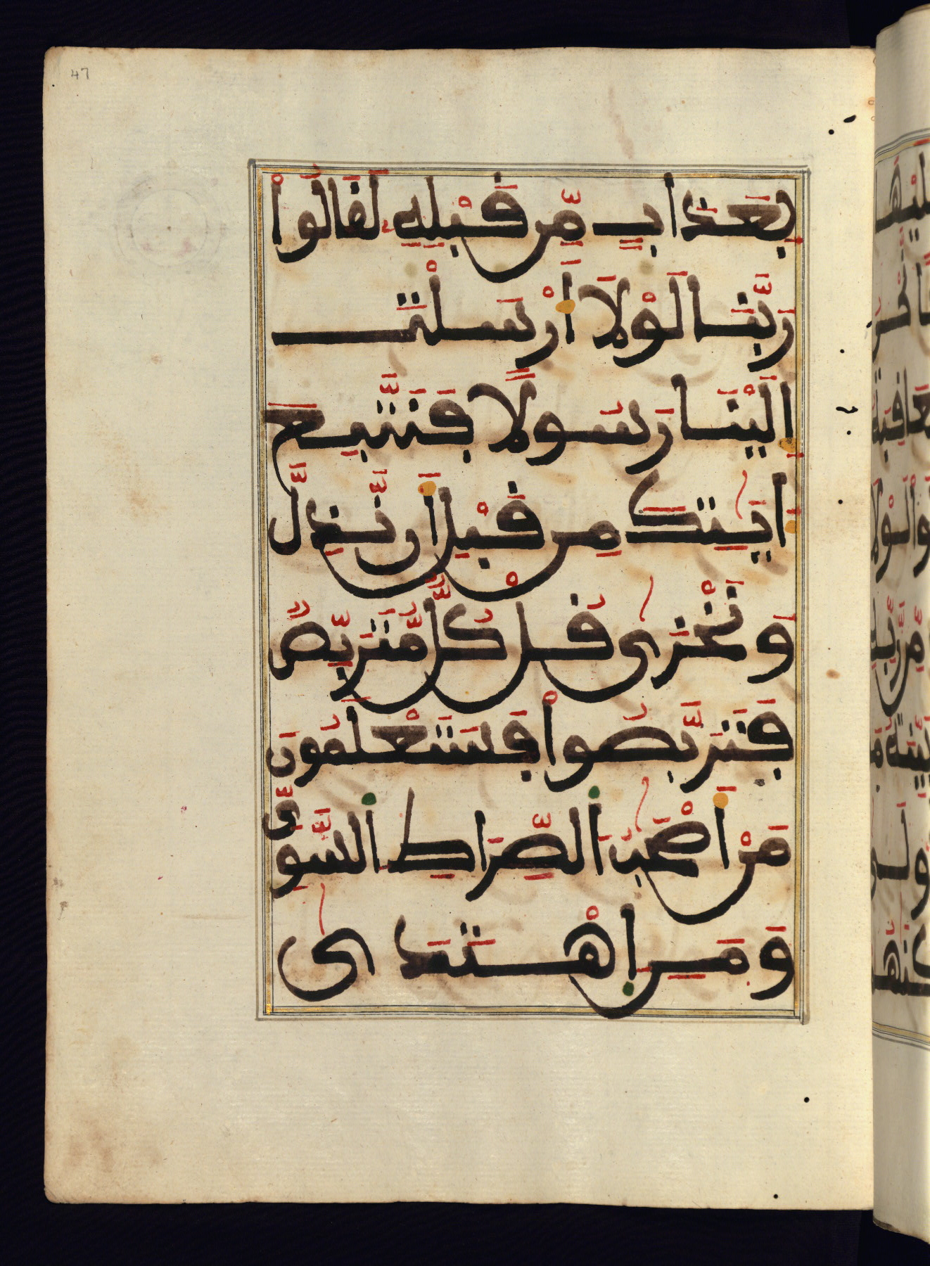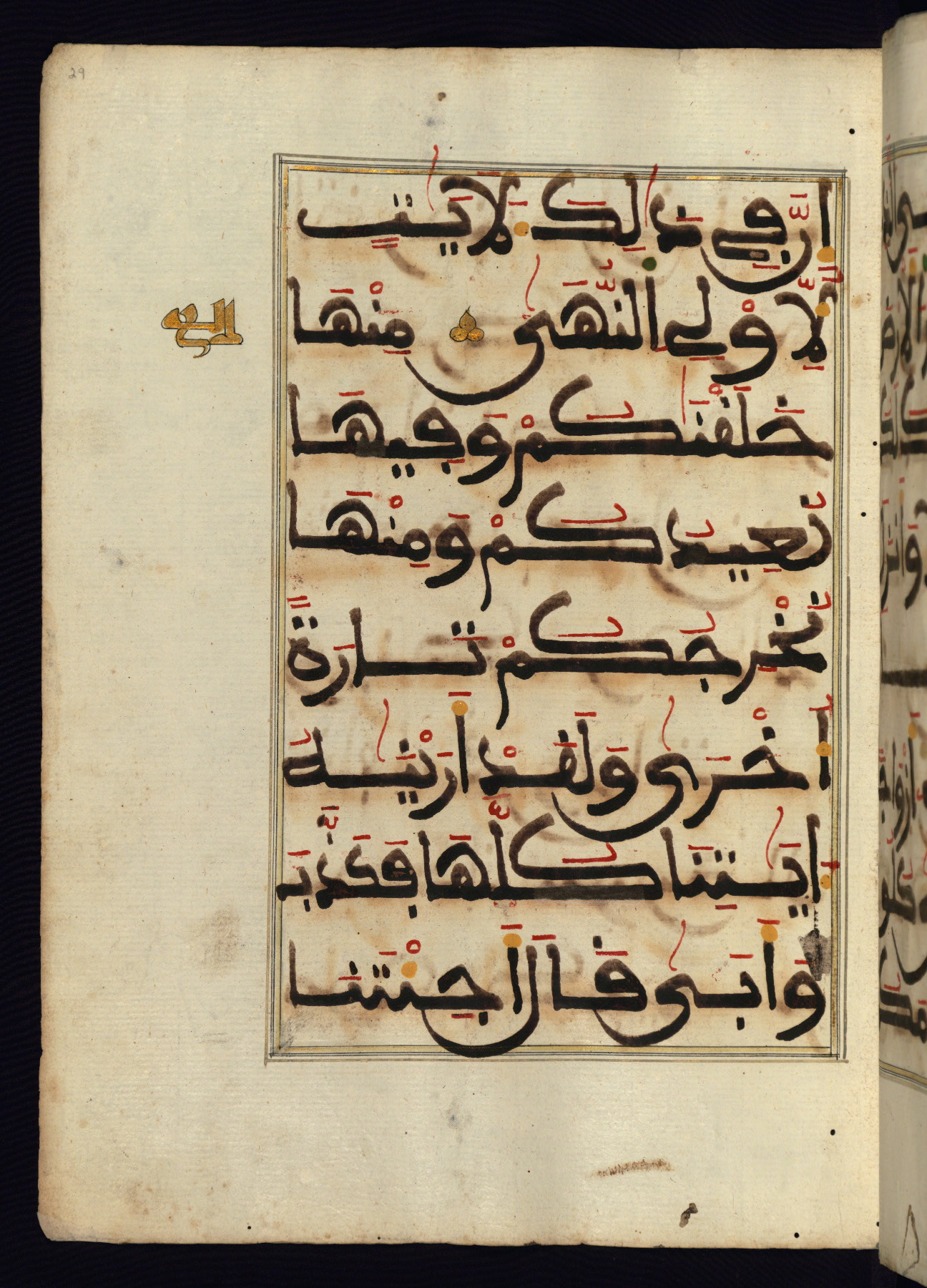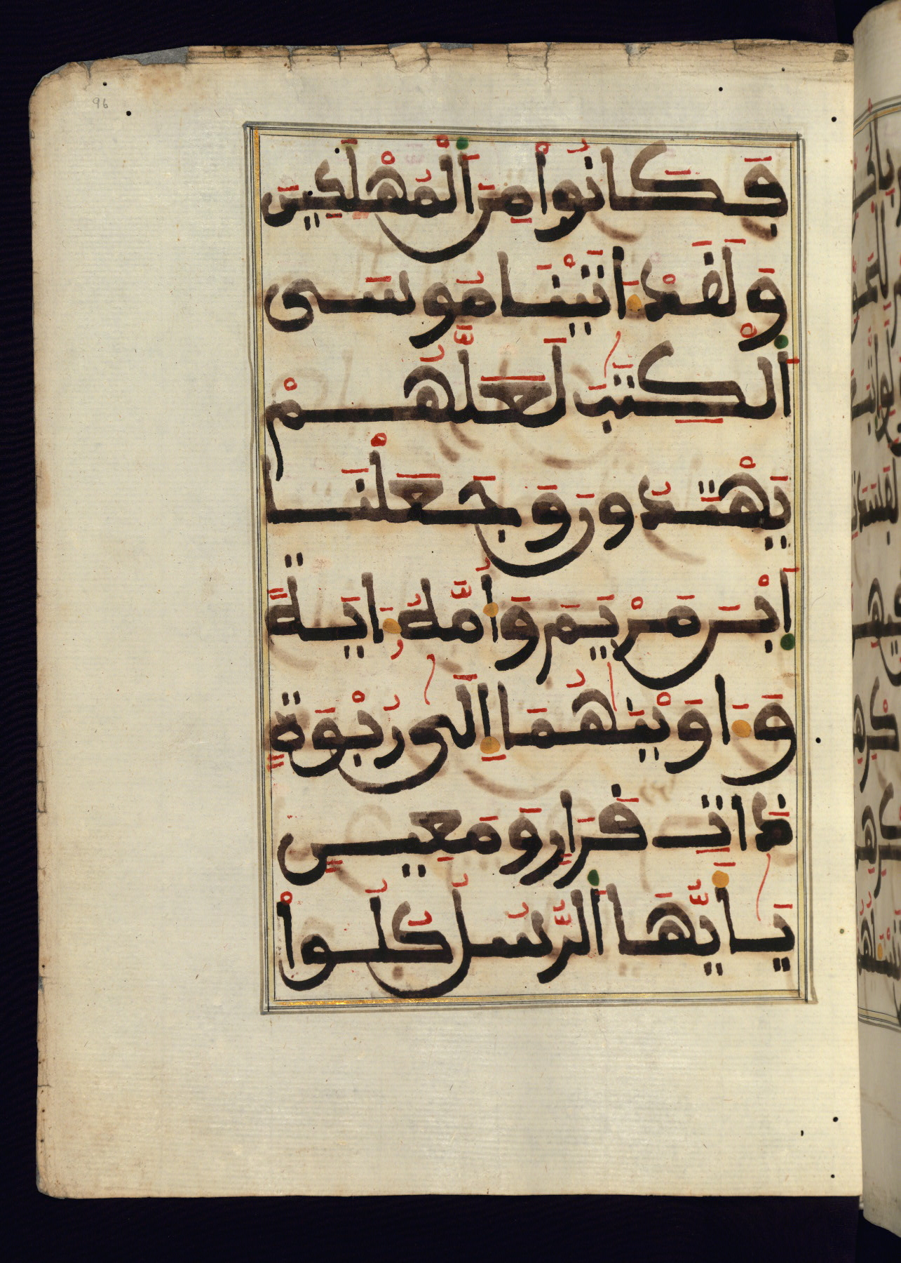 This manuscript is a fragment of the Qur'an, consisting of chapters 19 (Sūrat Maryam) through 23 (Sūrat al-muʾminūn). It was produced in the Maghreb and dates to the twelfth century AH / eighteenth CE. The text is written in a large Maghribī script, with vocalization in red, green, and yellow ink on Italian paper. The codex opens with an illuminated chapter heading for chapter 19 (Sūrat Maryam) written in the New Abbasid (broken cursive) style (fol. 1b) in gold ink within a decorative headpiece. The titles of other chapters are written in the New Abbasid (broken cursive) style in gold ink (fols. 21a, 47b, 70a, and 102a) with a marginal medallion. The blind-tooled goatskin binding is not contemporary with the manuscript and probably dates to the thirteenth century AH / nineteenth CE.
