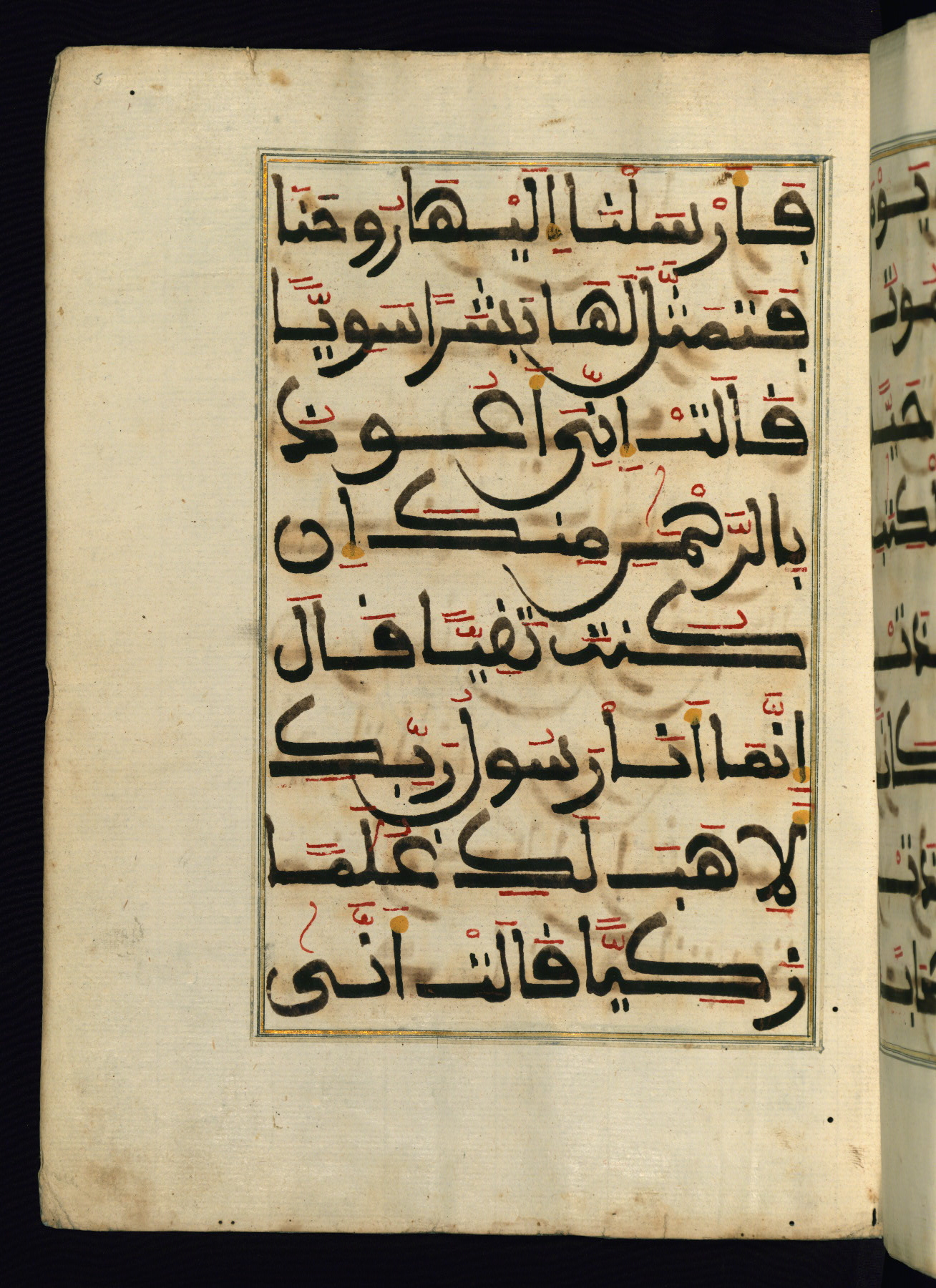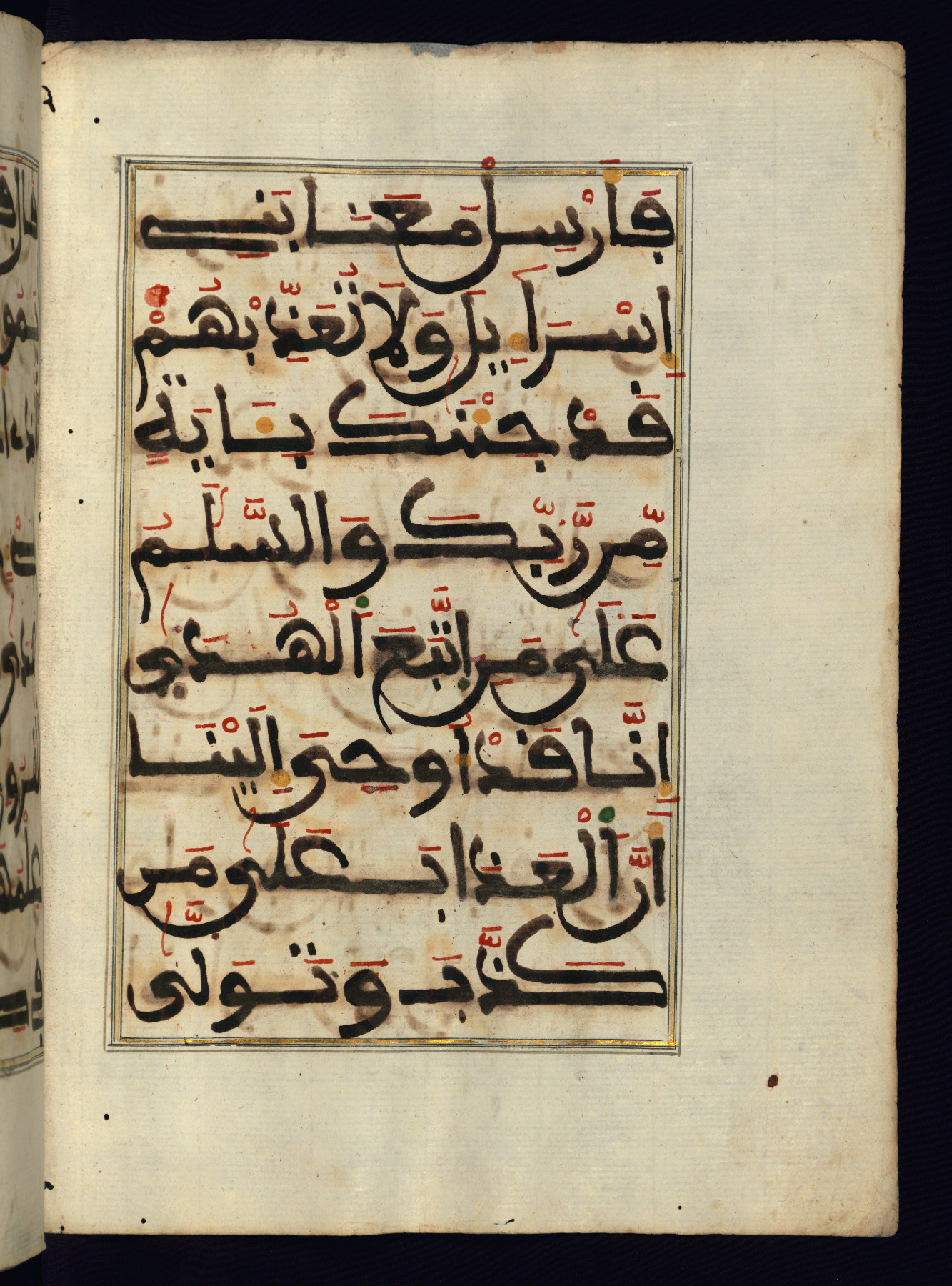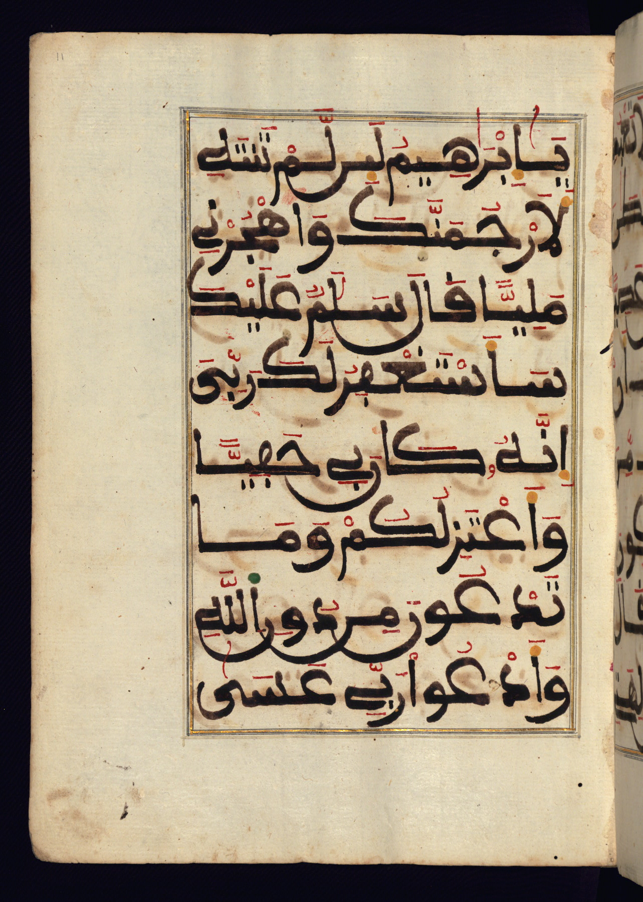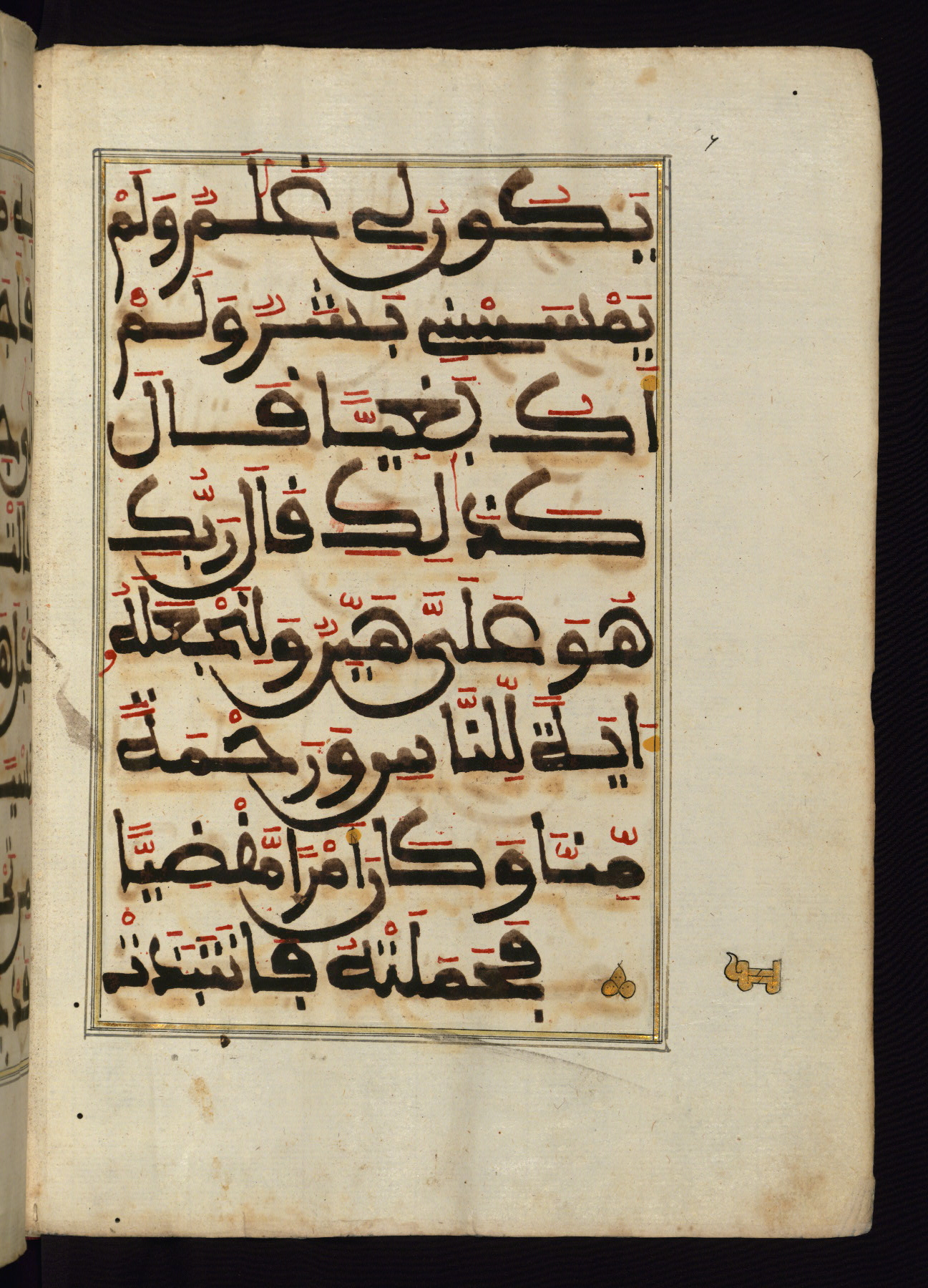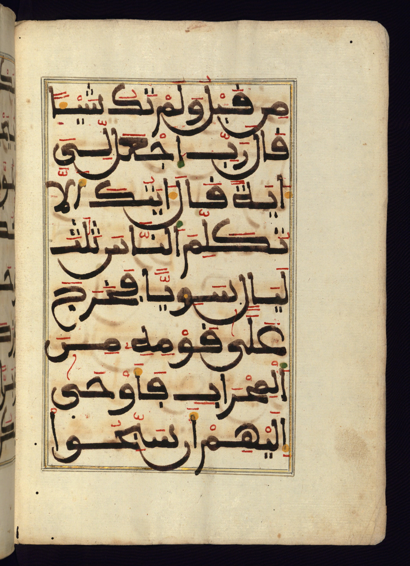 This manuscript is a fragment of the Qur'an, consisting of chapters 19 (Sūrat Maryam) through 23 (Sūrat al-muʾminūn). It was produced in the Maghreb and dates to the twelfth century AH / eighteenth CE. The text is written in a large Maghribī script, with vocalization in red, green, and yellow ink on Italian paper. The codex opens with an illuminated chapter heading for chapter 19 (Sūrat Maryam) written in the New Abbasid (broken cursive) style (fol. 1b) in gold ink within a decorative headpiece. The titles of other chapters are written in the New Abbasid (broken cursive) style in gold ink (fols. 21a, 47b, 70a, and 102a) with a marginal medallion. The blind-tooled goatskin binding is not contemporary with the manuscript and probably dates to the thirteenth century AH / nineteenth CE.