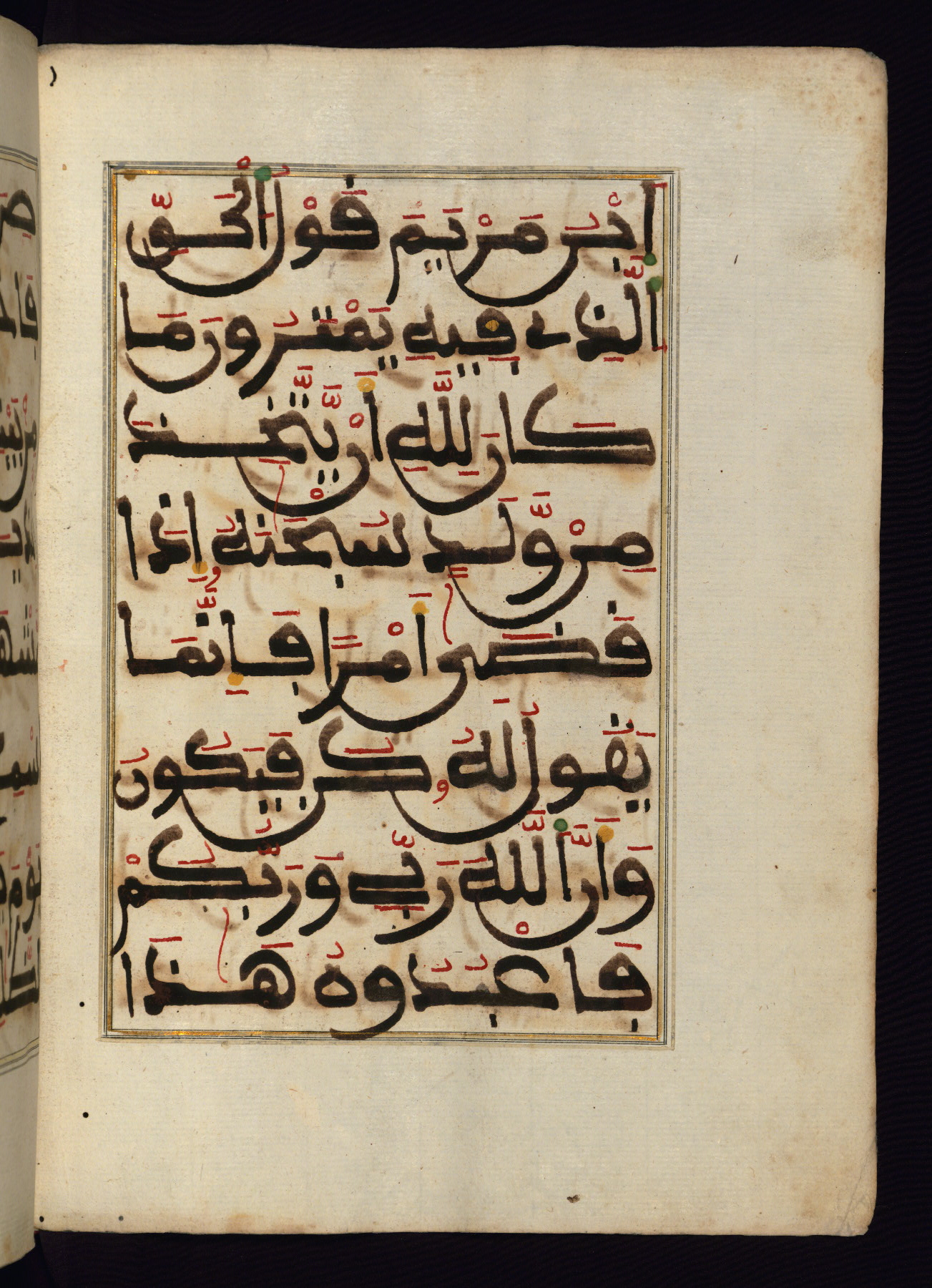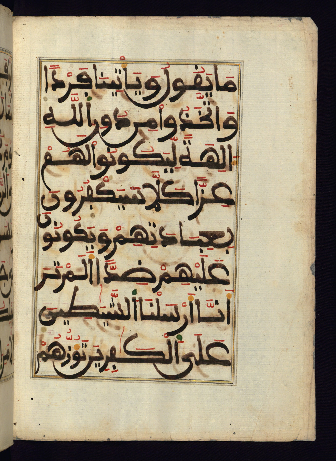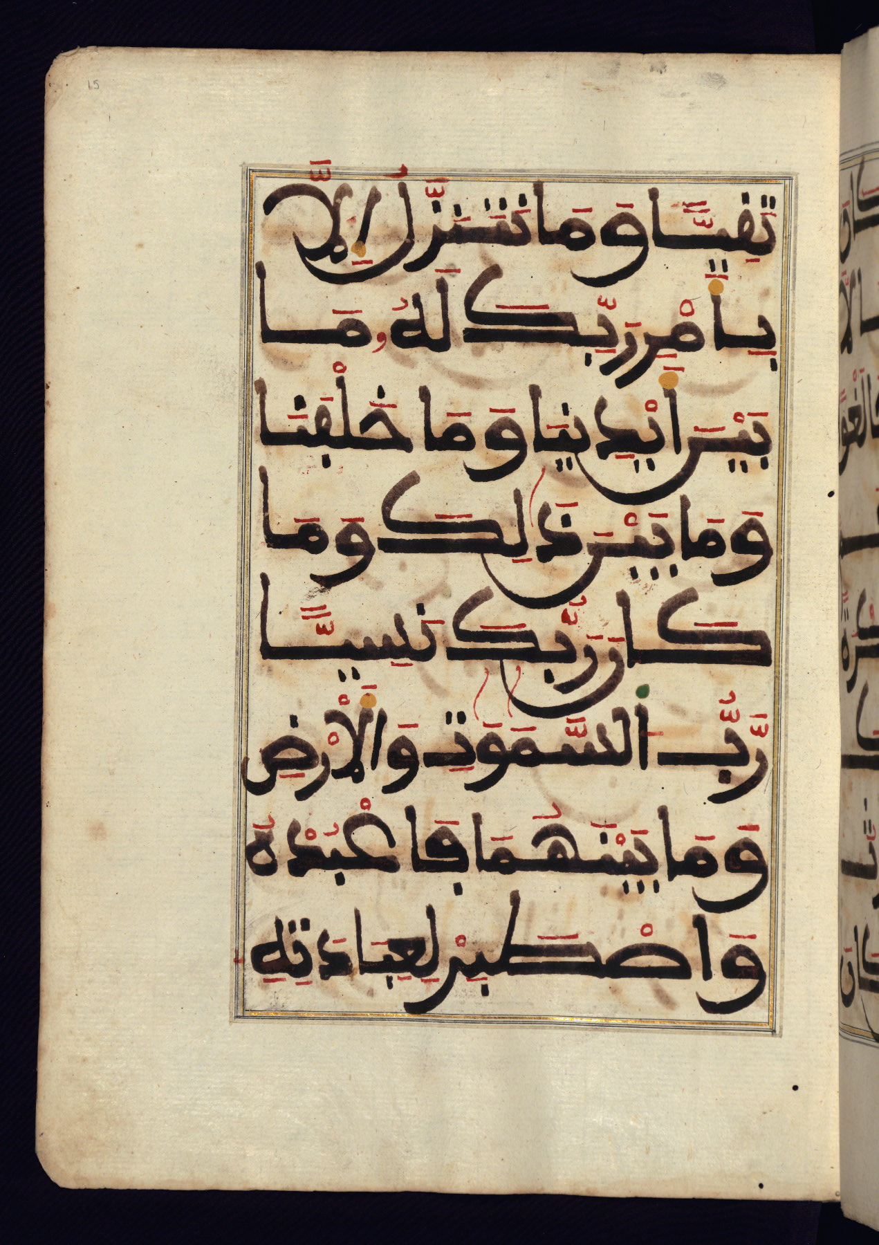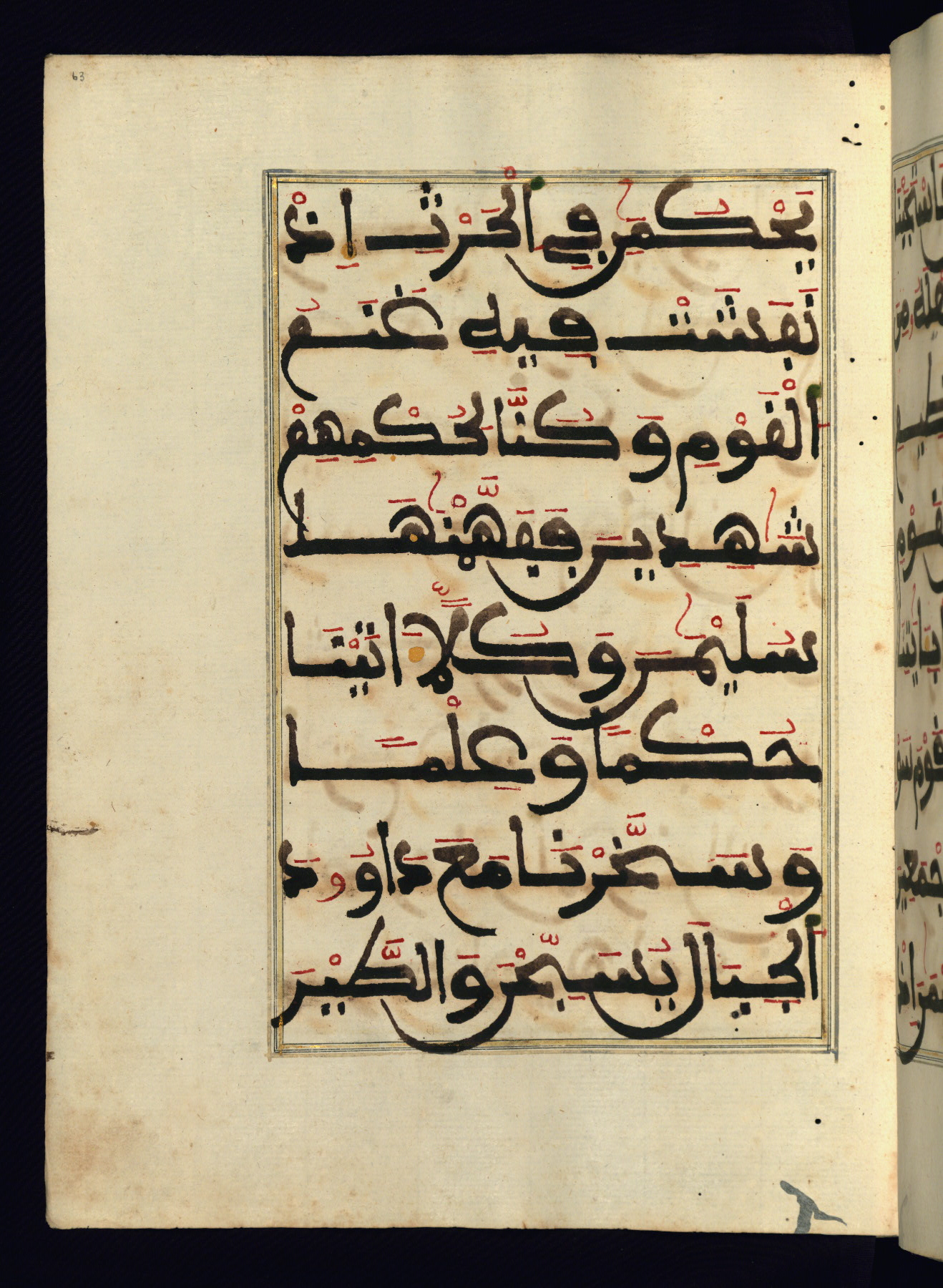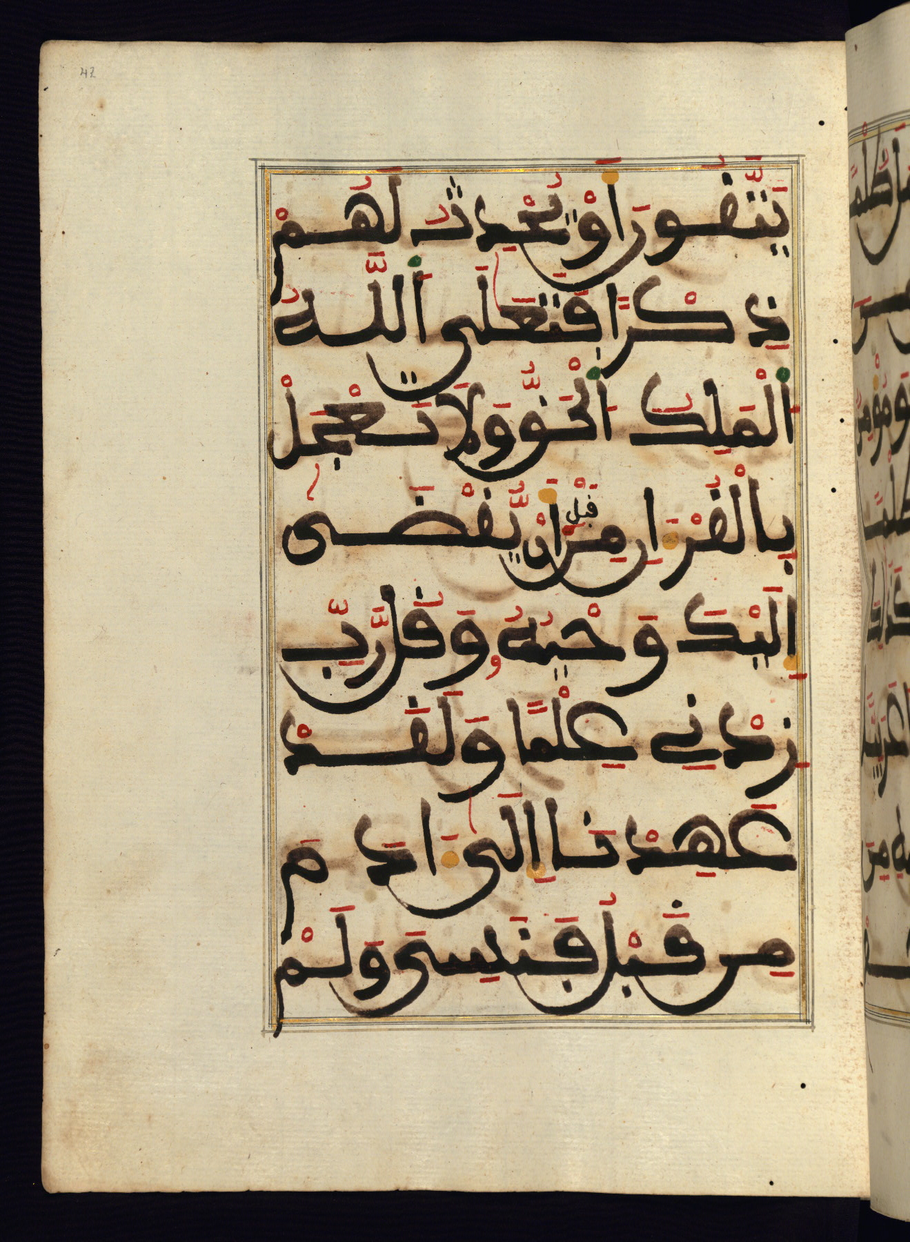 This manuscript is a fragment of the Qur'an, consisting of chapters 19 (Sūrat Maryam) through 23 (Sūrat al-muʾminūn). It was produced in the Maghreb and dates to the twelfth century AH / eighteenth CE. The text is written in a large Maghribī script, with vocalization in red, green, and yellow ink on Italian paper. The codex opens with an illuminated chapter heading for chapter 19 (Sūrat Maryam) written in the New Abbasid (broken cursive) style (fol. 1b) in gold ink within a decorative headpiece. The titles of other chapters are written in the New Abbasid (broken cursive) style in gold ink (fols. 21a, 47b, 70a, and 102a) with a marginal medallion. The blind-tooled goatskin binding is not contemporary with the manuscript and probably dates to the thirteenth century AH / nineteenth CE.
