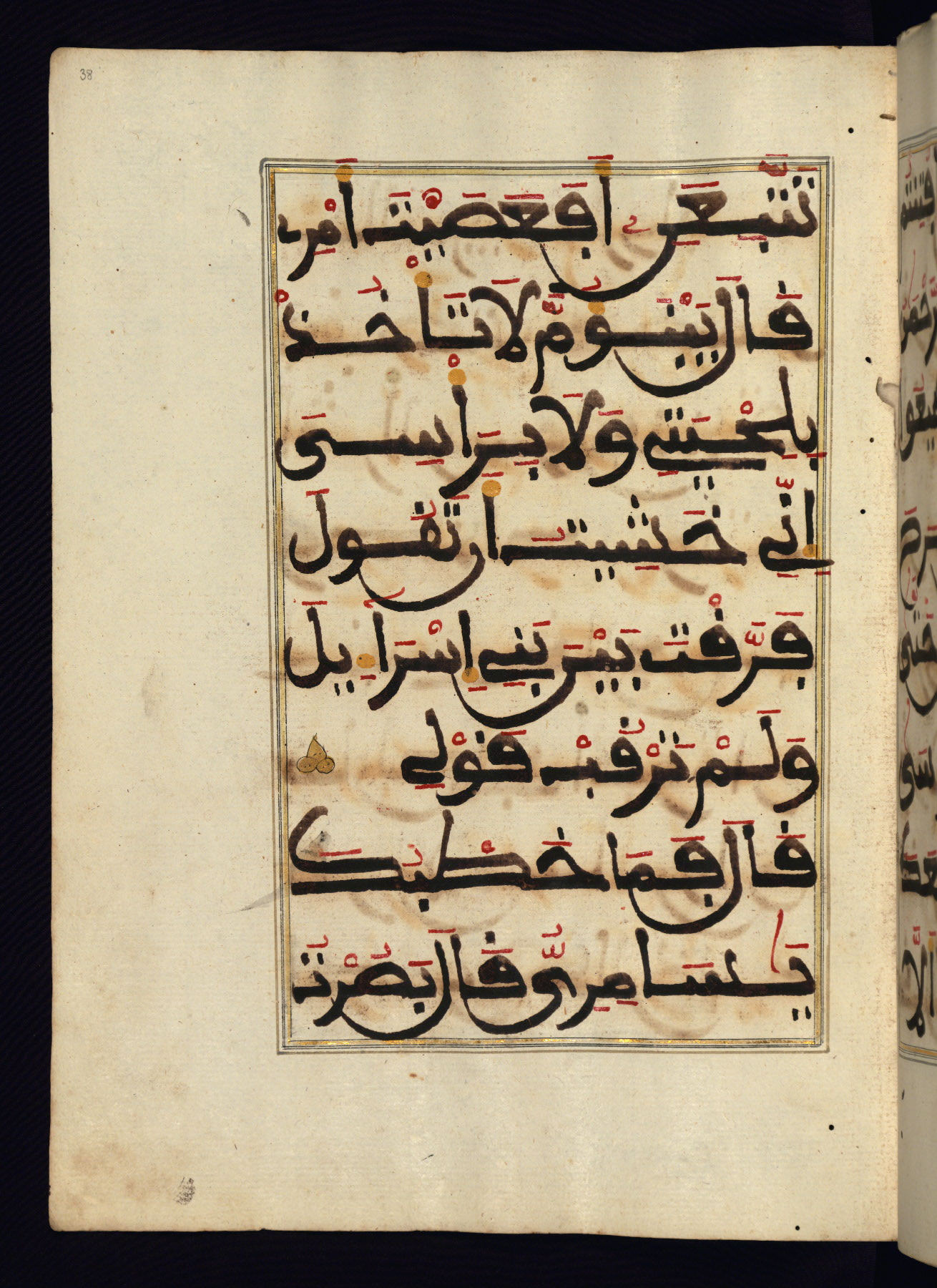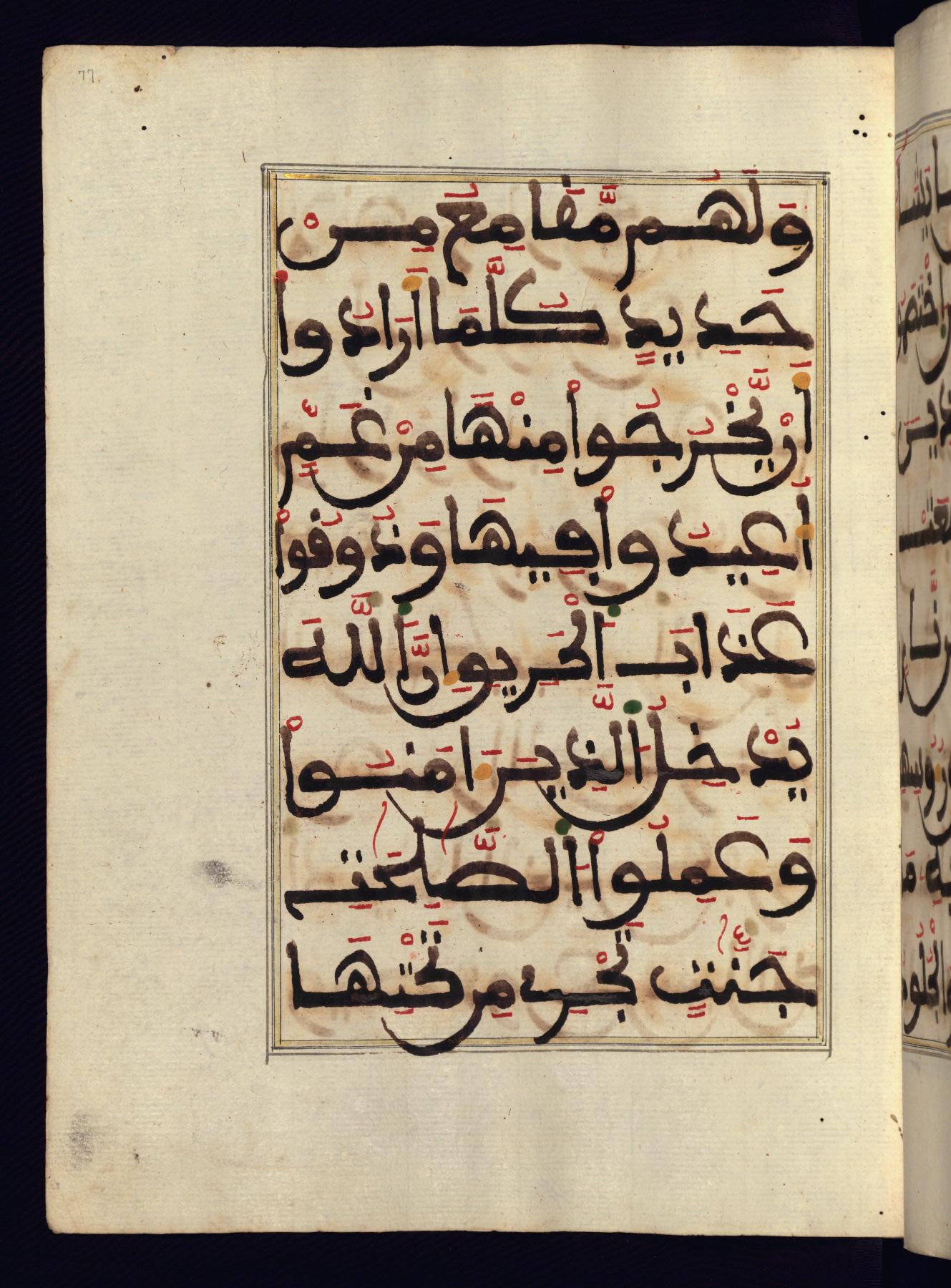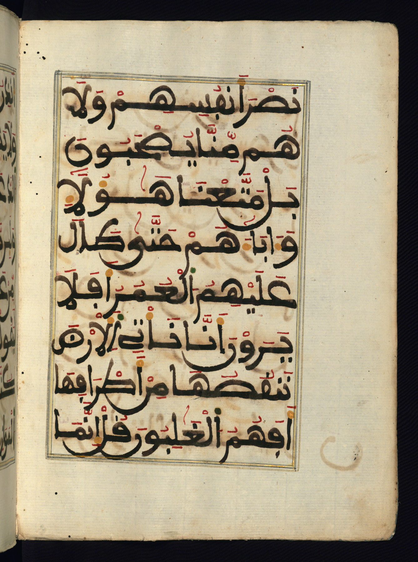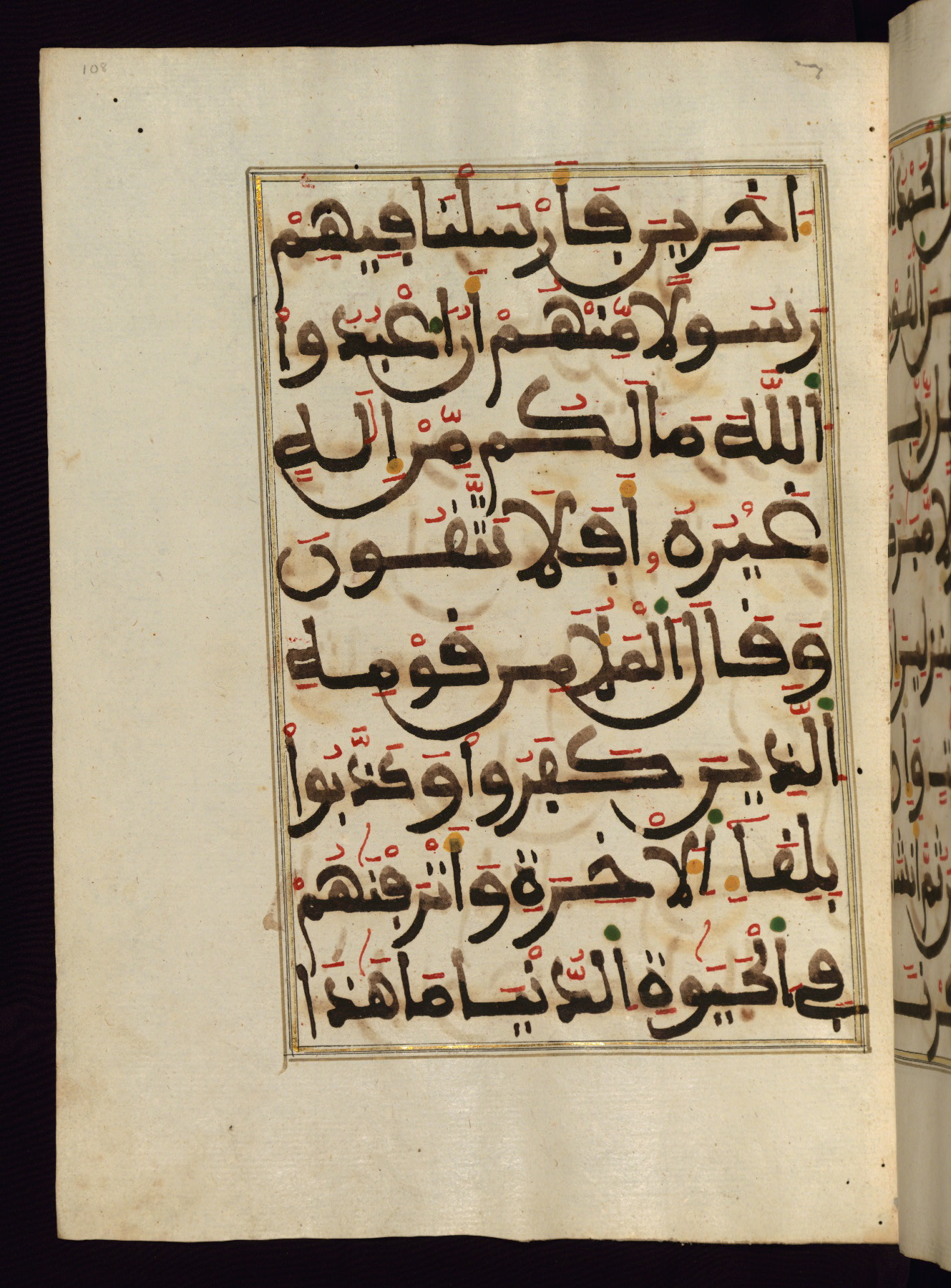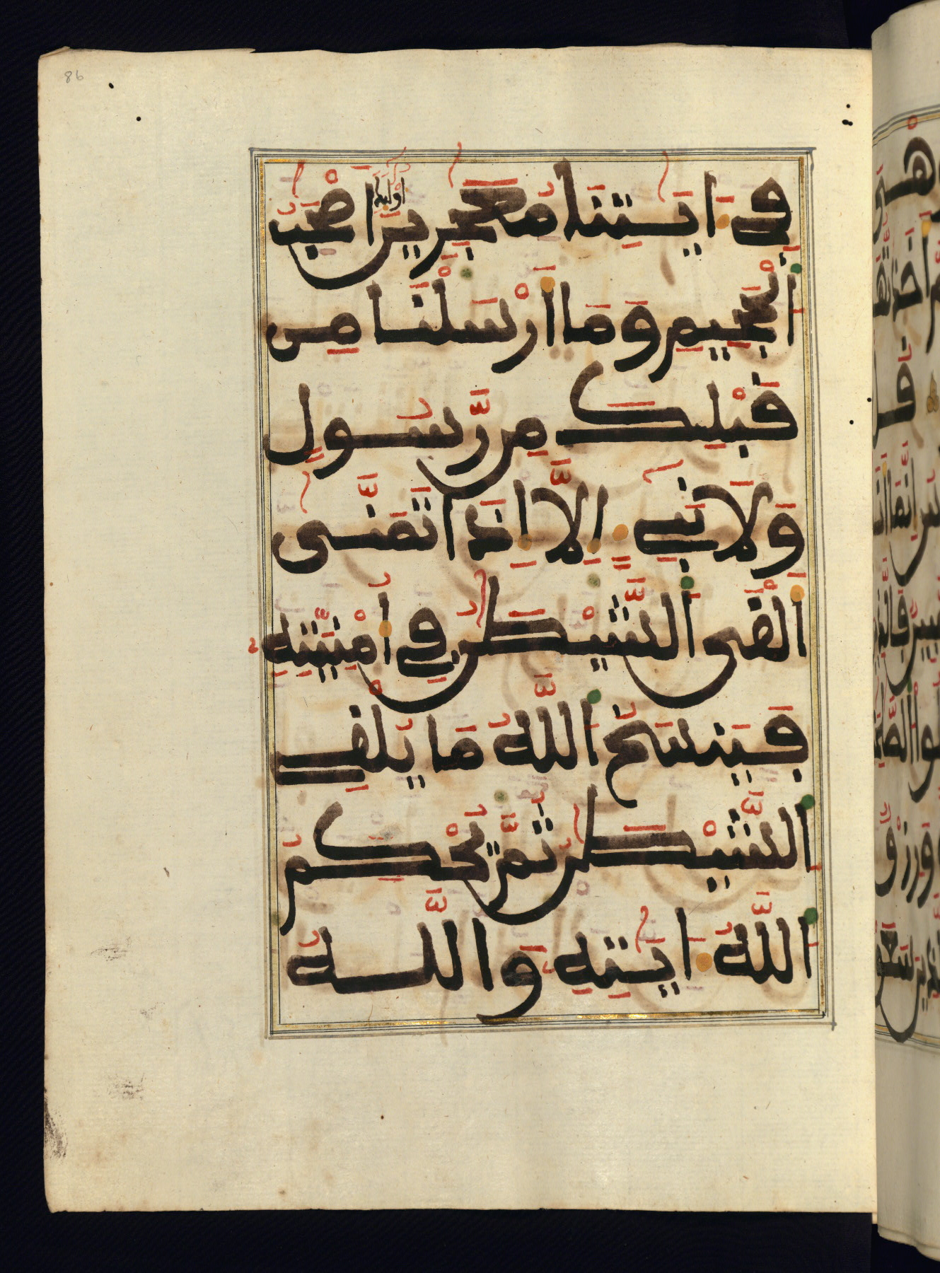 This manuscript is a fragment of the Qur'an, consisting of chapters 19 (Sūrat Maryam) through 23 (Sūrat al-muʾminūn). It was produced in the Maghreb and dates to the twelfth century AH / eighteenth CE. The text is written in a large Maghribī script, with vocalization in red, green, and yellow ink on Italian paper. The codex opens with an illuminated chapter heading for chapter 19 (Sūrat Maryam) written in the New Abbasid (broken cursive) style (fol. 1b) in gold ink within a decorative headpiece. The titles of other chapters are written in the New Abbasid (broken cursive) style in gold ink (fols. 21a, 47b, 70a, and 102a) with a marginal medallion. The blind-tooled goatskin binding is not contemporary with the manuscript and probably dates to the thirteenth century AH / nineteenth CE.