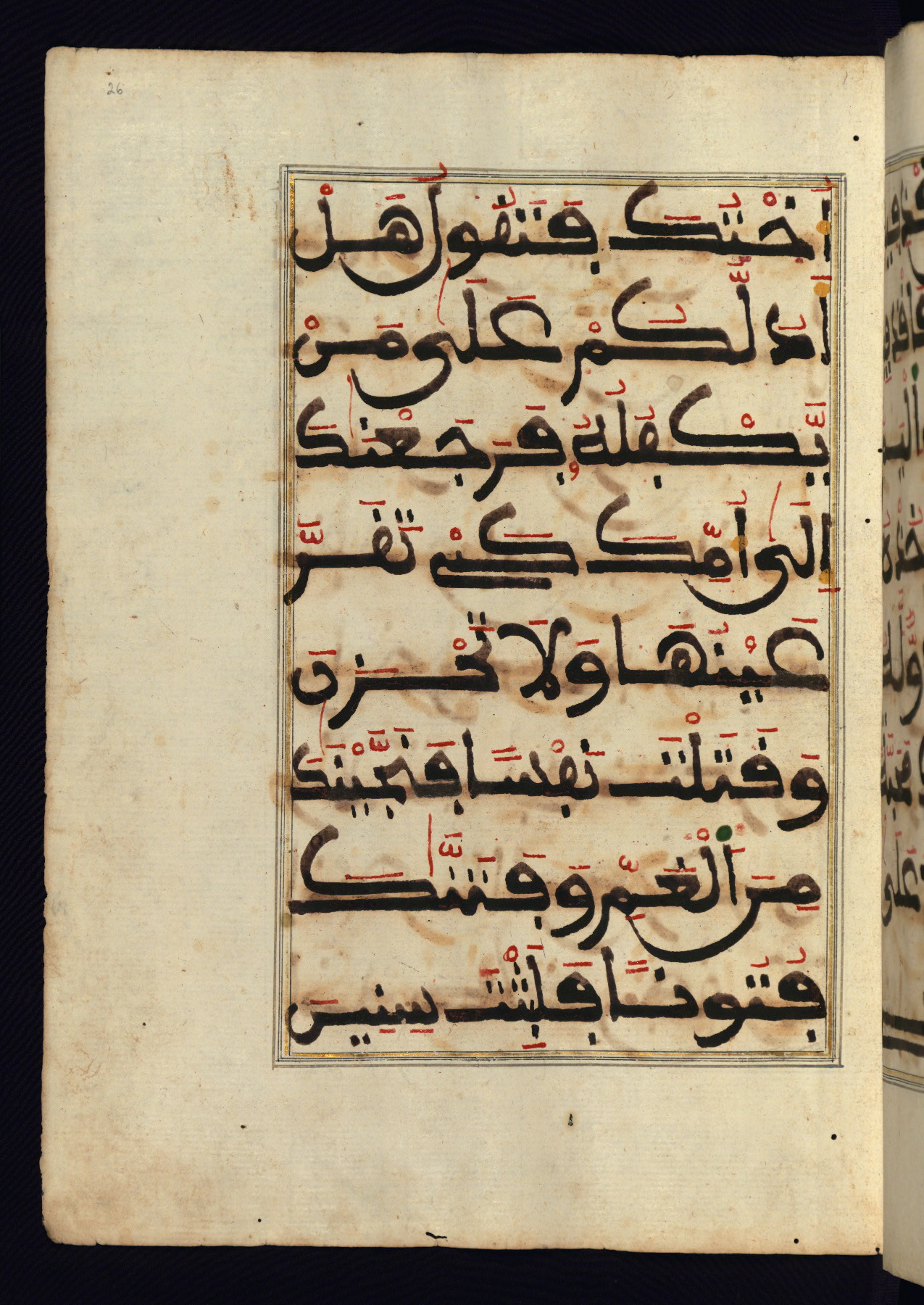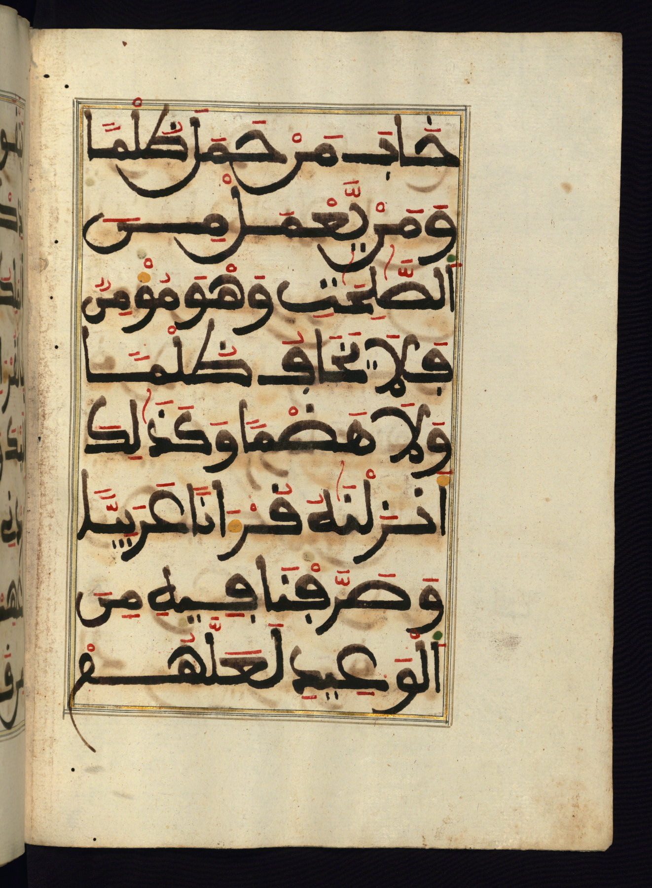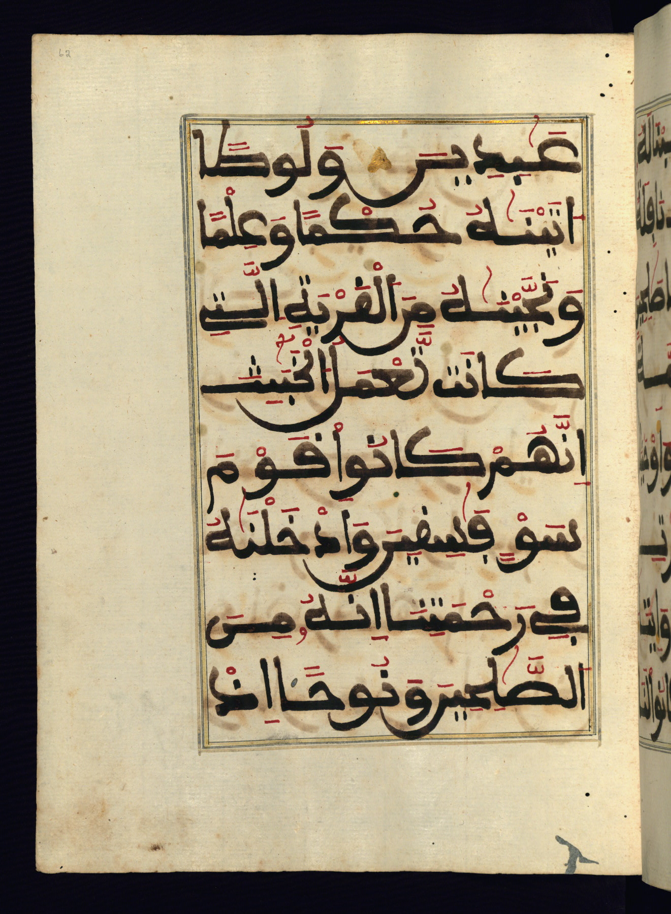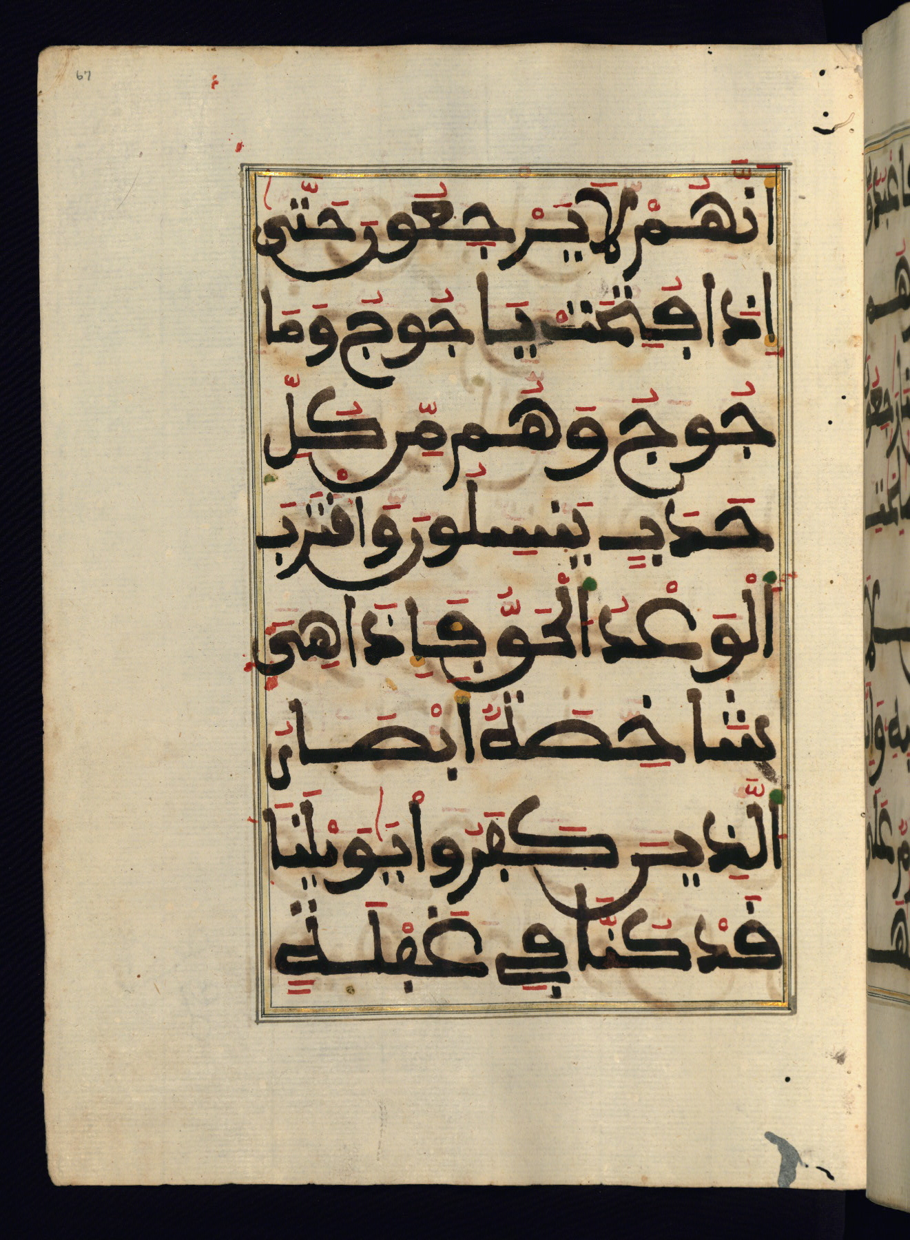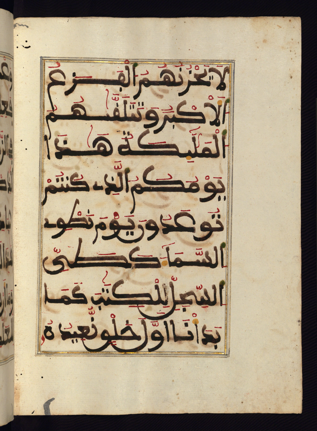 This manuscript is a fragment of the Qur'an, consisting of chapters 19 (Sūrat Maryam) through 23 (Sūrat al-muʾminūn). It was produced in the Maghreb and dates to the twelfth century AH / eighteenth CE. The text is written in a large Maghribī script, with vocalization in red, green, and yellow ink on Italian paper. The codex opens with an illuminated chapter heading for chapter 19 (Sūrat Maryam) written in the New Abbasid (broken cursive) style (fol. 1b) in gold ink within a decorative headpiece. The titles of other chapters are written in the New Abbasid (broken cursive) style in gold ink (fols. 21a, 47b, 70a, and 102a) with a marginal medallion. The blind-tooled goatskin binding is not contemporary with the manuscript and probably dates to the thirteenth century AH / nineteenth CE.
