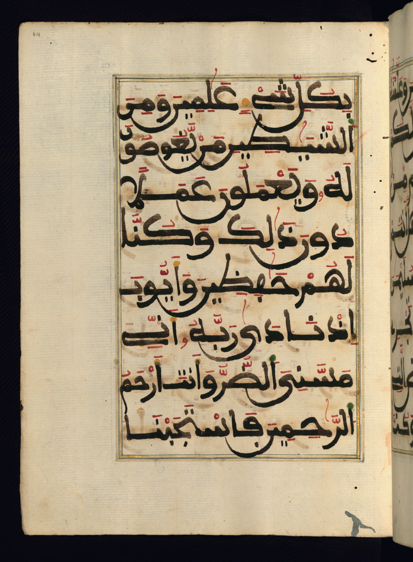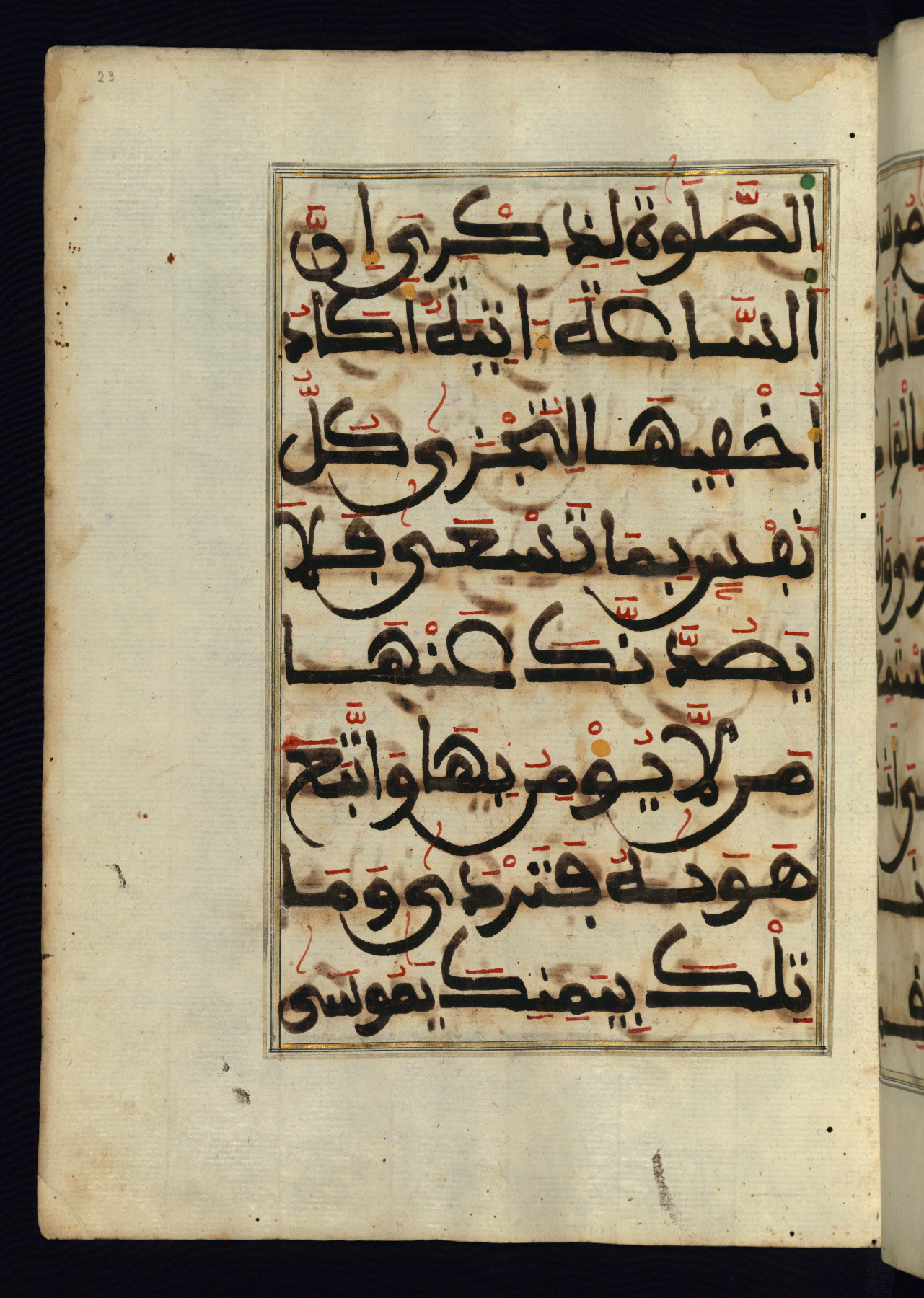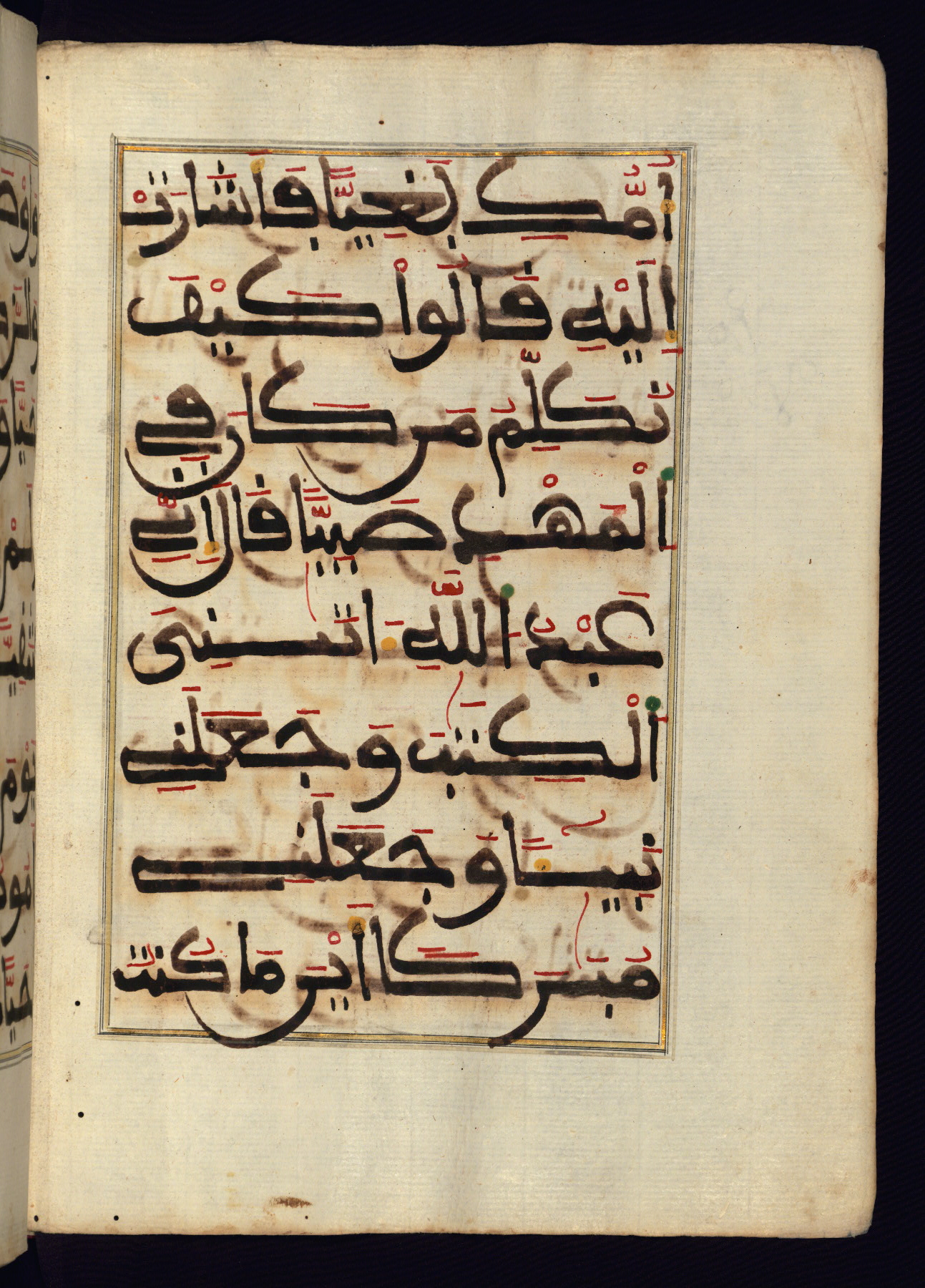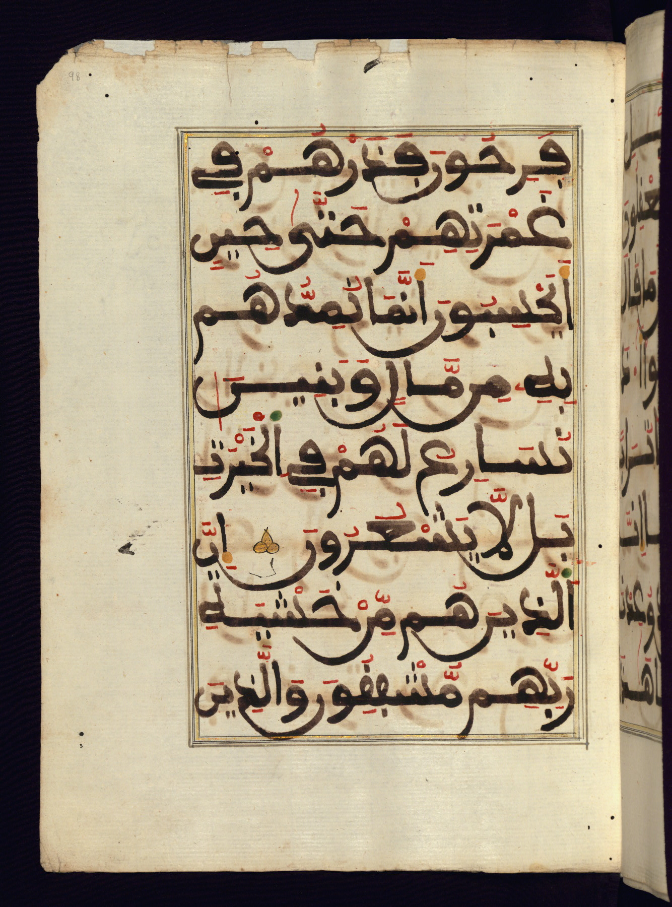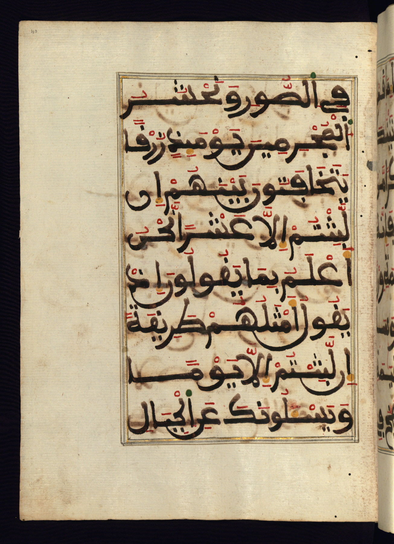 This manuscript is a fragment of the Qur'an, consisting of chapters 19 (Sūrat Maryam) through 23 (Sūrat al-muʾminūn). It was produced in the Maghreb and dates to the twelfth century AH / eighteenth CE. The text is written in a large Maghribī script, with vocalization in red, green, and yellow ink on Italian paper. The codex opens with an illuminated chapter heading for chapter 19 (Sūrat Maryam) written in the New Abbasid (broken cursive) style (fol. 1b) in gold ink within a decorative headpiece. The titles of other chapters are written in the New Abbasid (broken cursive) style in gold ink (fols. 21a, 47b, 70a, and 102a) with a marginal medallion. The blind-tooled goatskin binding is not contemporary with the manuscript and probably dates to the thirteenth century AH / nineteenth CE.