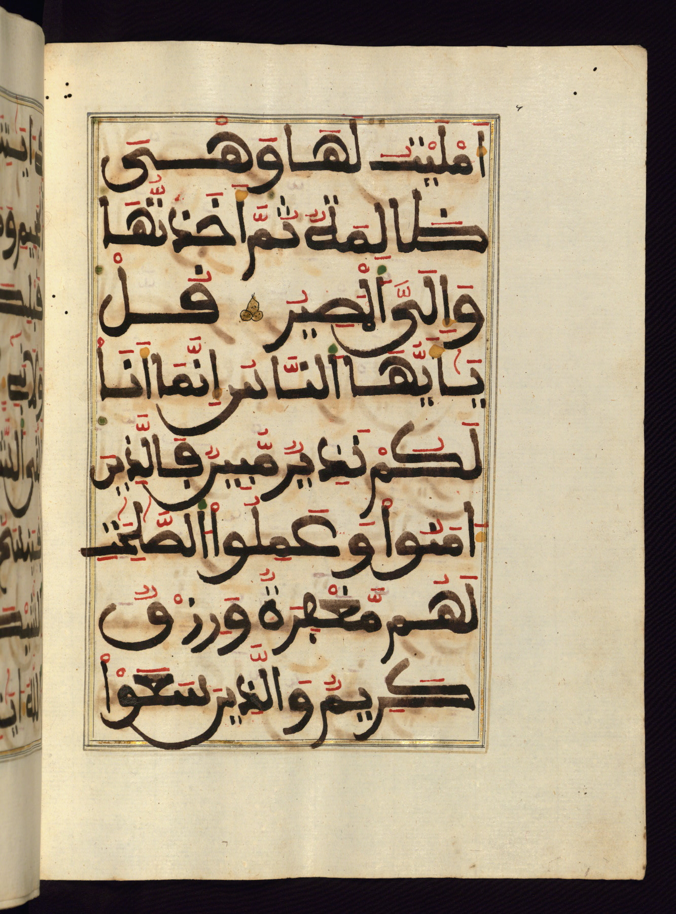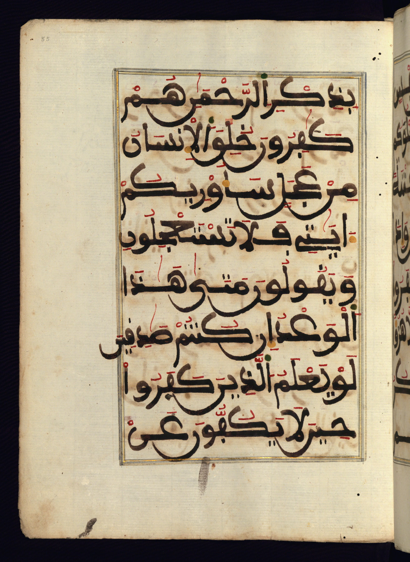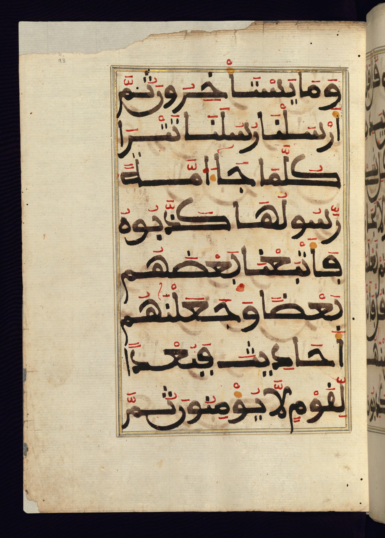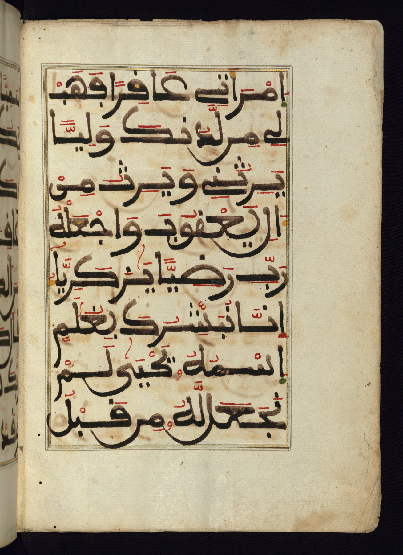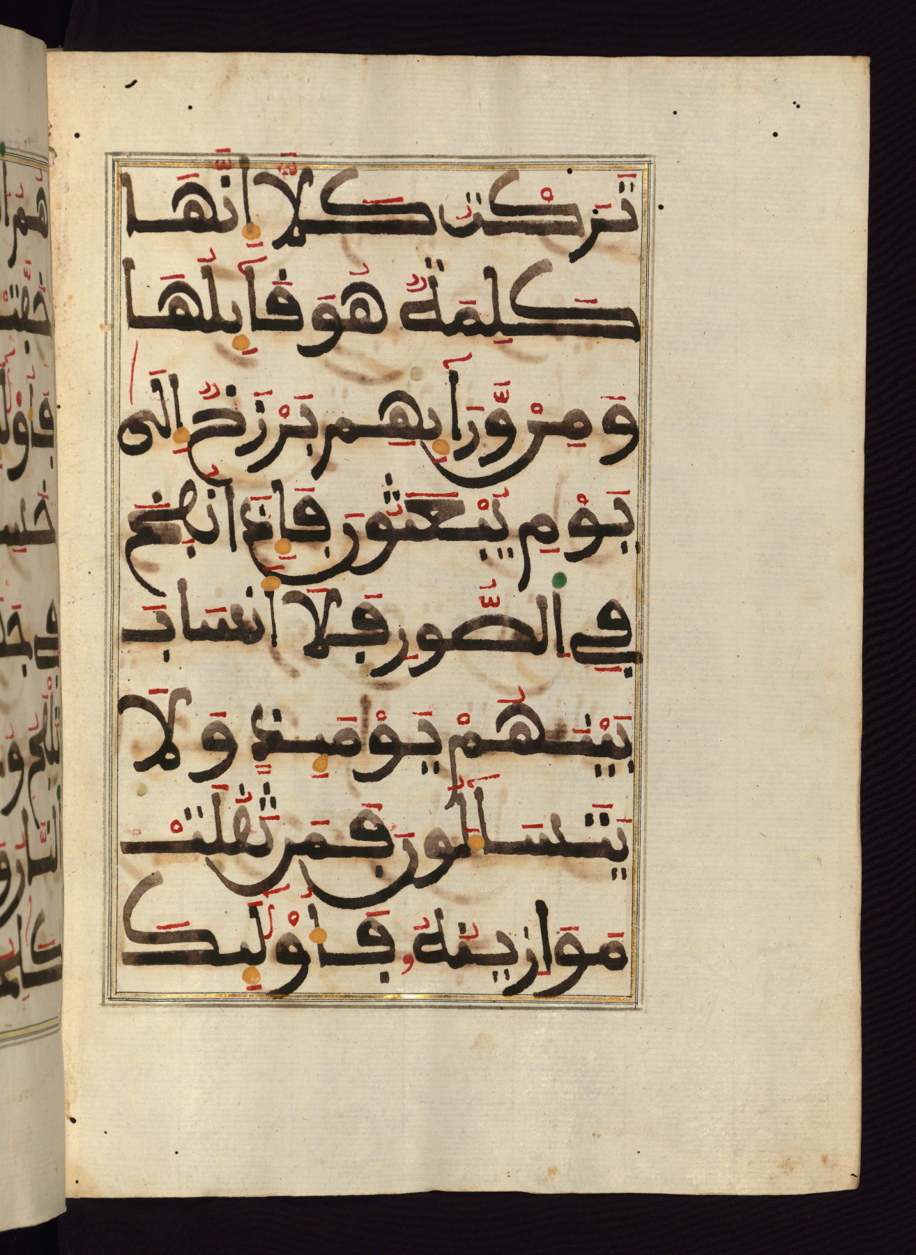This manuscript is a fragment of the Qur'an, consisting of chapters 19 (Sūrat Maryam) through 23 (Sūrat al-muʾminūn). It was produced in the Maghreb and dates to the twelfth century AH / eighteenth CE. The text is written in a large Maghribī script, with vocalization in red, green, and yellow ink on Italian paper. The codex opens with an illuminated chapter heading for chapter 19 (Sūrat Maryam) written in the New Abbasid (broken cursive) style (fol. 1b) in gold ink within a decorative headpiece. The titles of other chapters are written in the New Abbasid (broken cursive) style in gold ink (fols. 21a, 47b, 70a, and 102a) with a marginal medallion. The blind-tooled goatskin binding is not contemporary with the manuscript and probably dates to the thirteenth century AH / nineteenth CE.