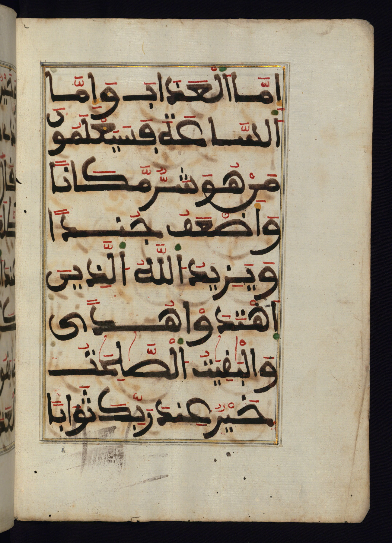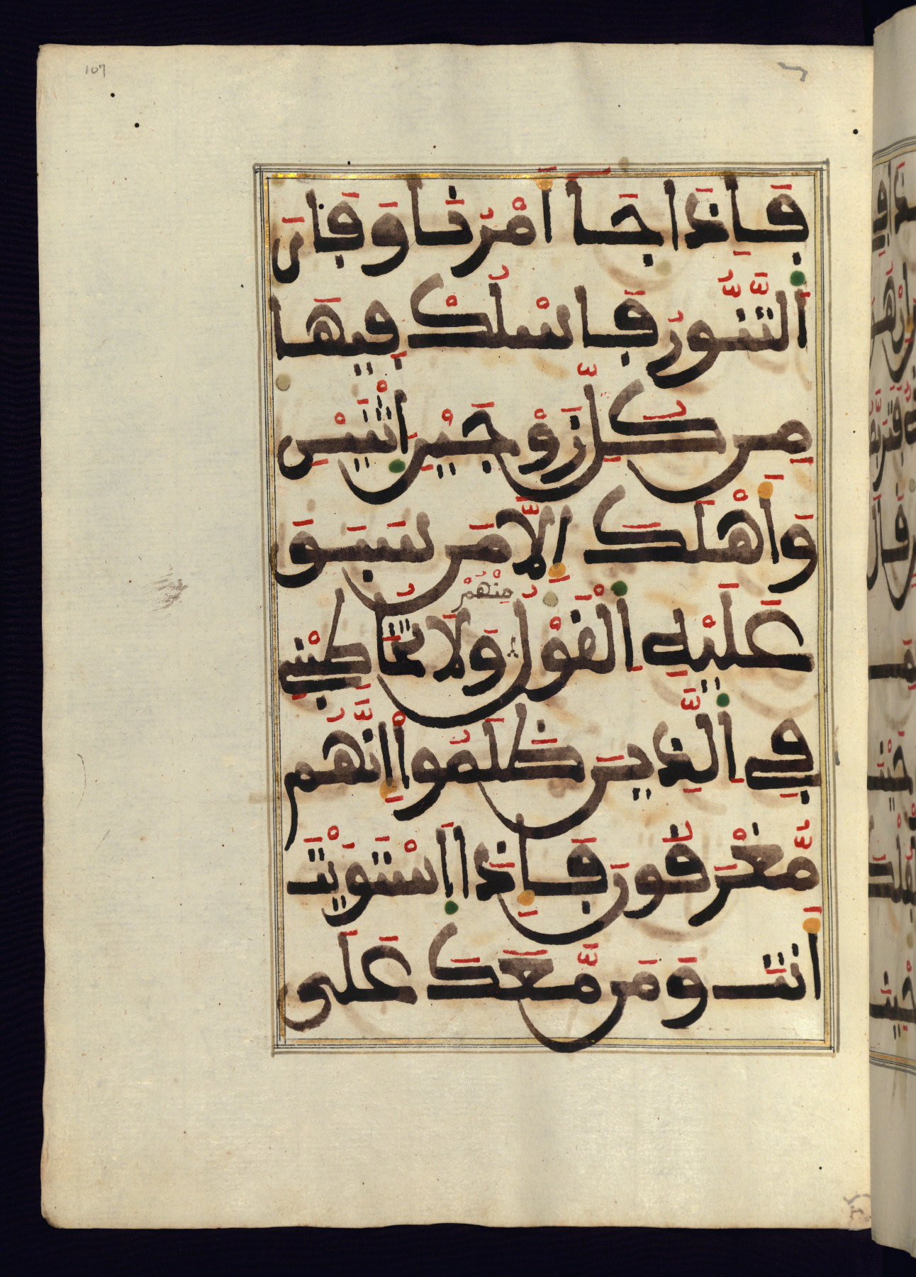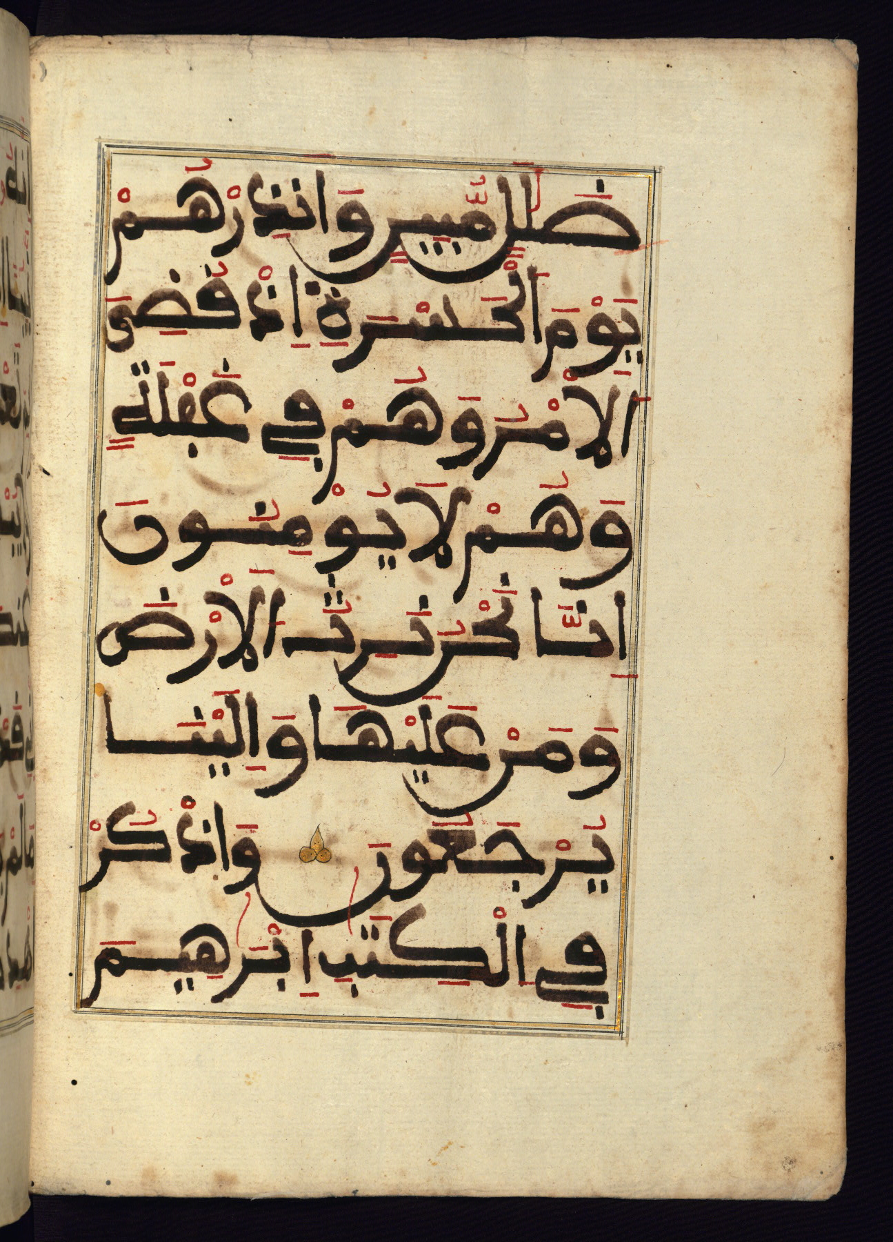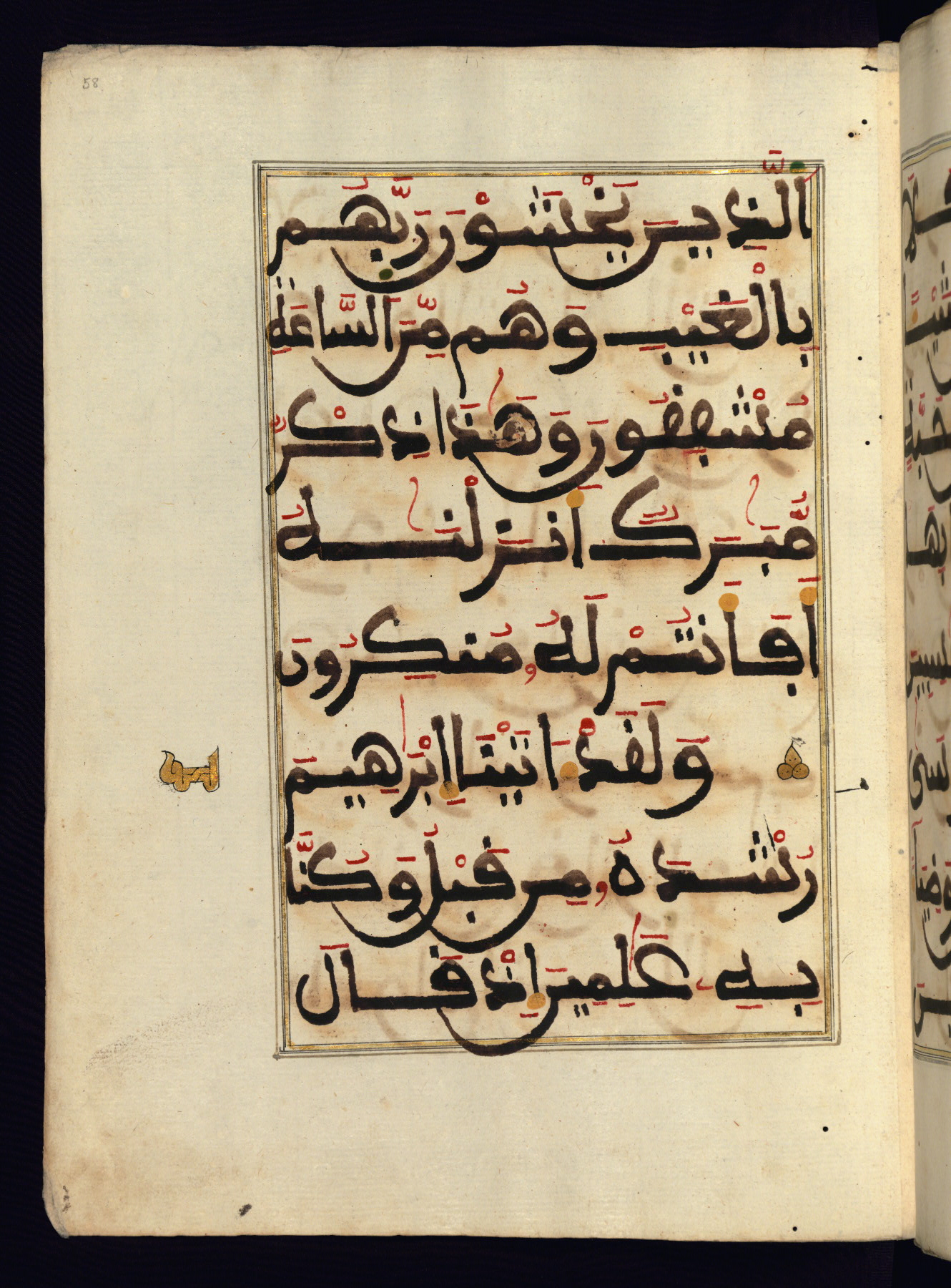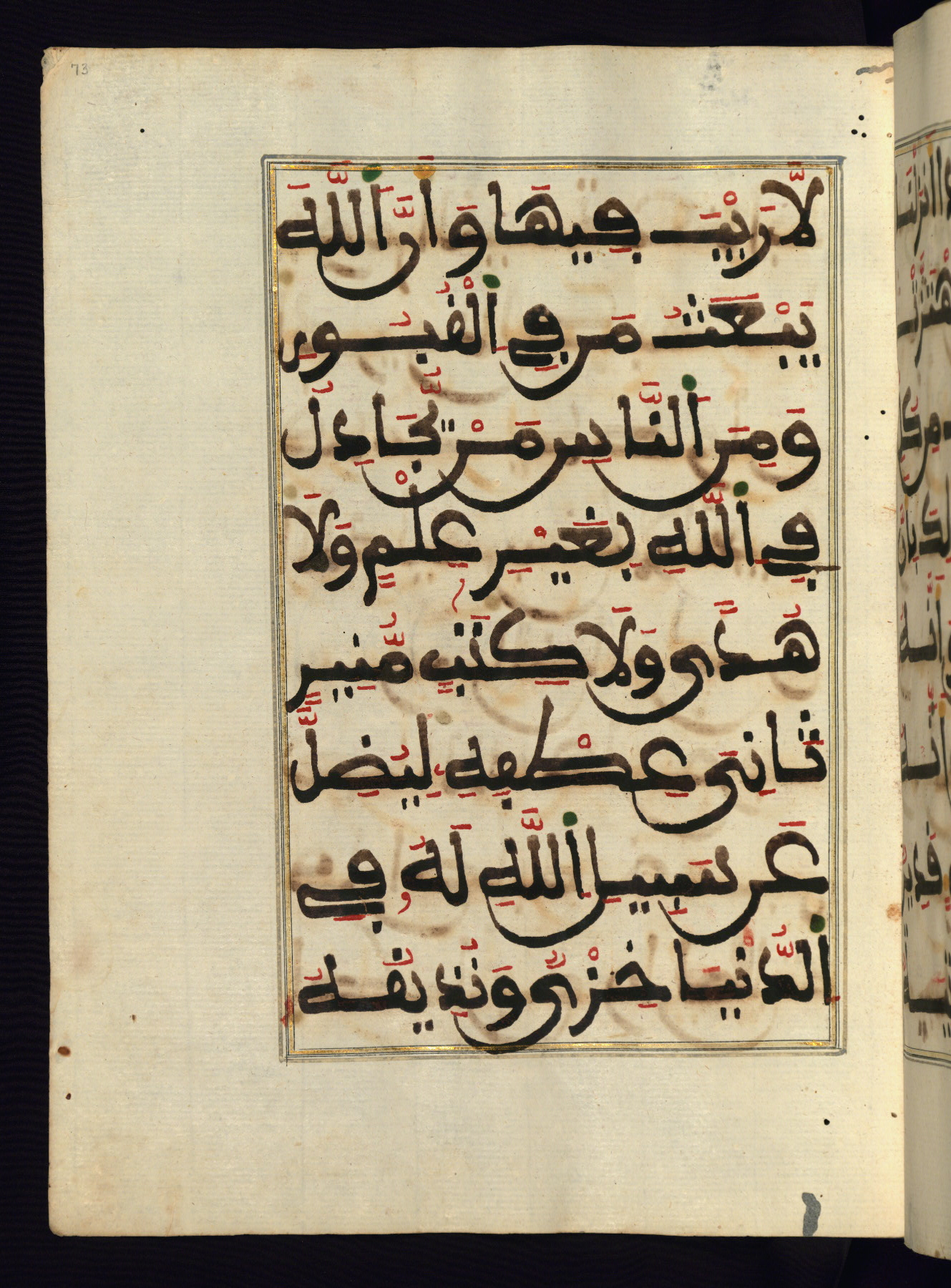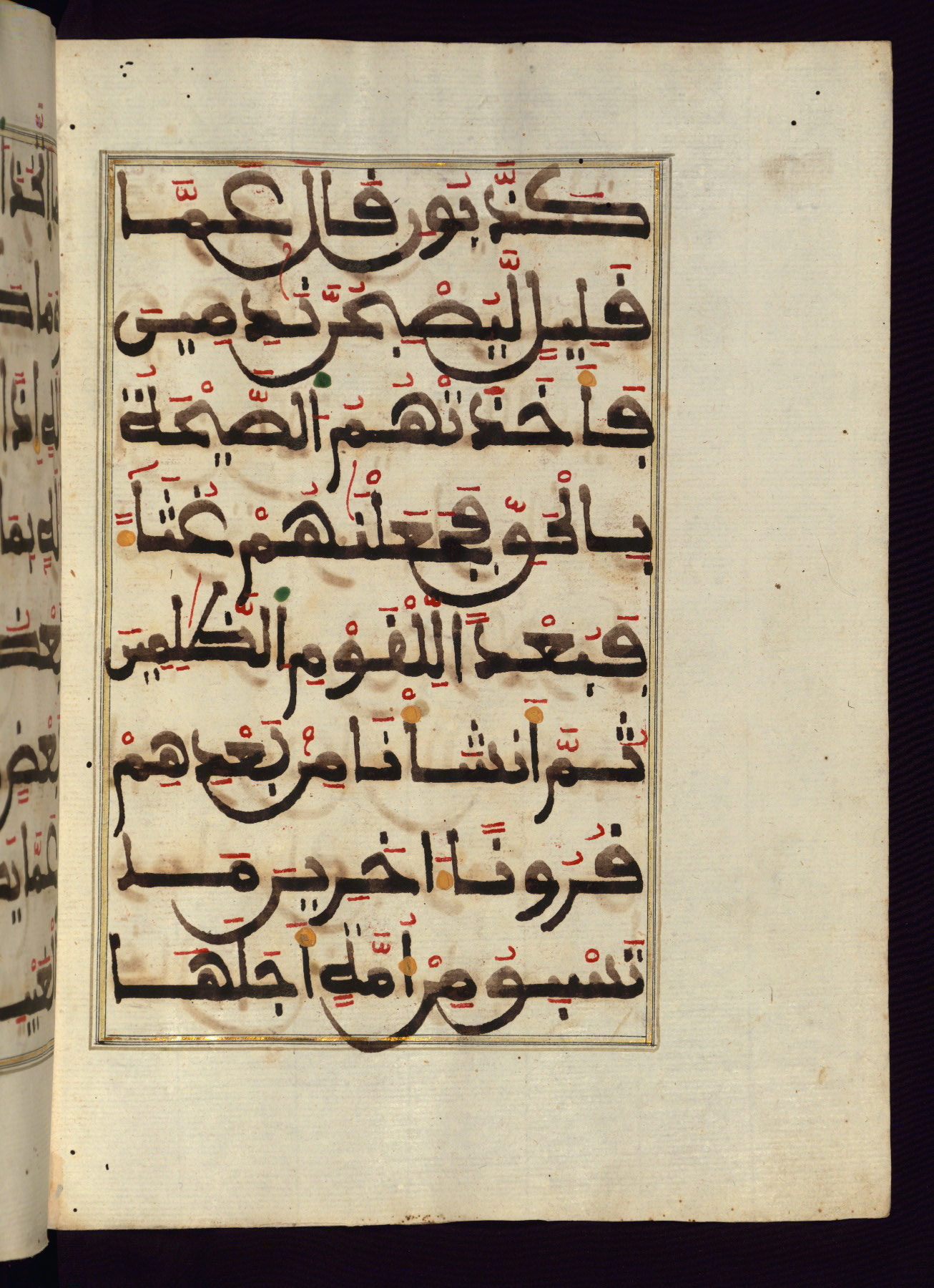 This manuscript is a fragment of the Qur'an, consisting of chapters 19 (Sūrat Maryam) through 23 (Sūrat al-muʾminūn). It was produced in the Maghreb and dates to the twelfth century AH / eighteenth CE. The text is written in a large Maghribī script, with vocalization in red, green, and yellow ink on Italian paper. The codex opens with an illuminated chapter heading for chapter 19 (Sūrat Maryam) written in the New Abbasid (broken cursive) style (fol. 1b) in gold ink within a decorative headpiece. The titles of other chapters are written in the New Abbasid (broken cursive) style in gold ink (fols. 21a, 47b, 70a, and 102a) with a marginal medallion. The blind-tooled goatskin binding is not contemporary with the manuscript and probably dates to the thirteenth century AH / nineteenth CE.
