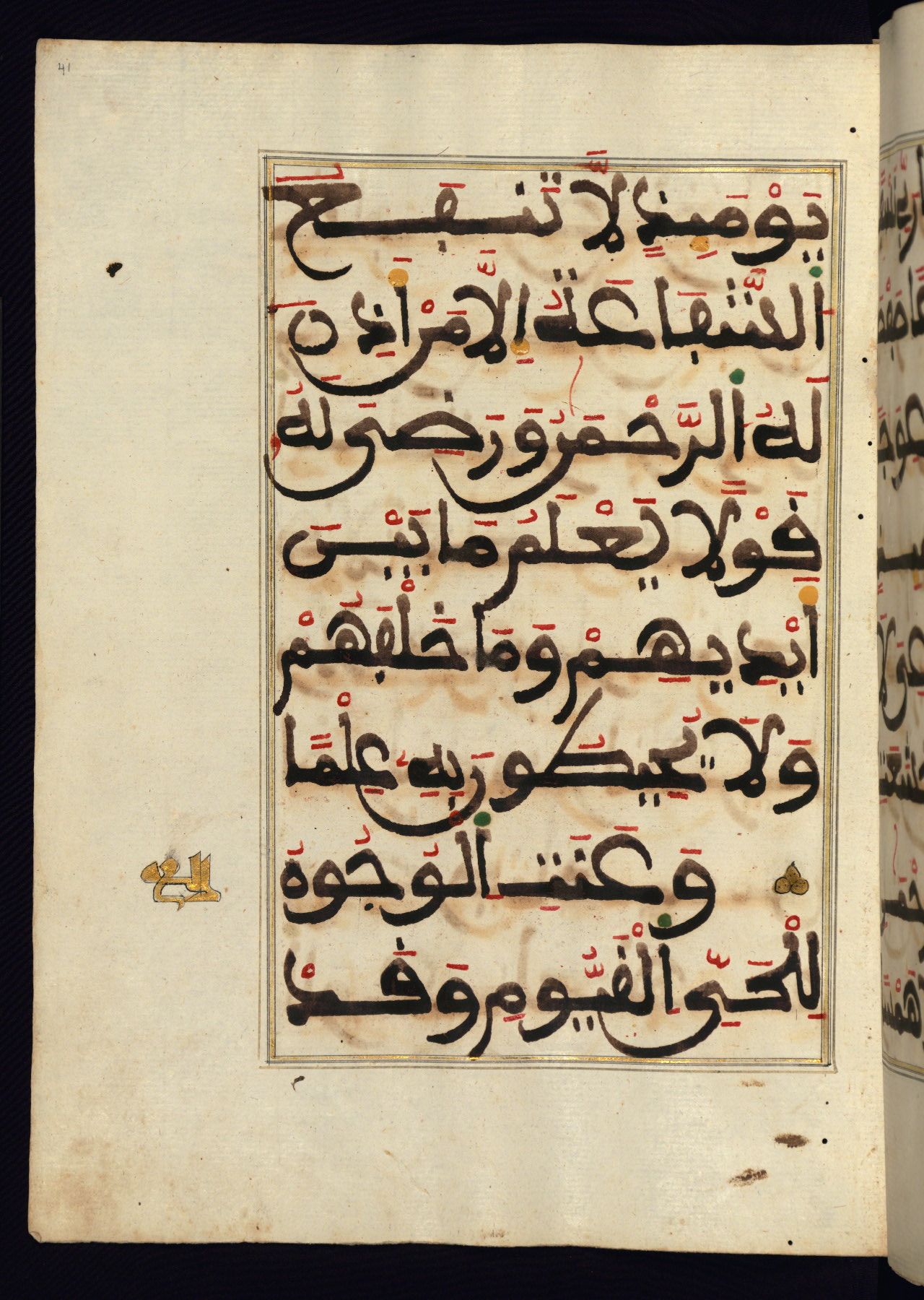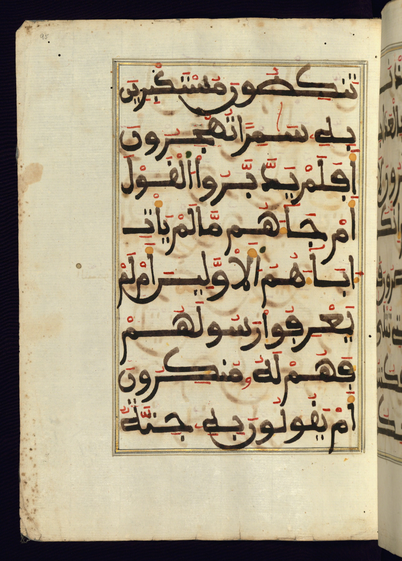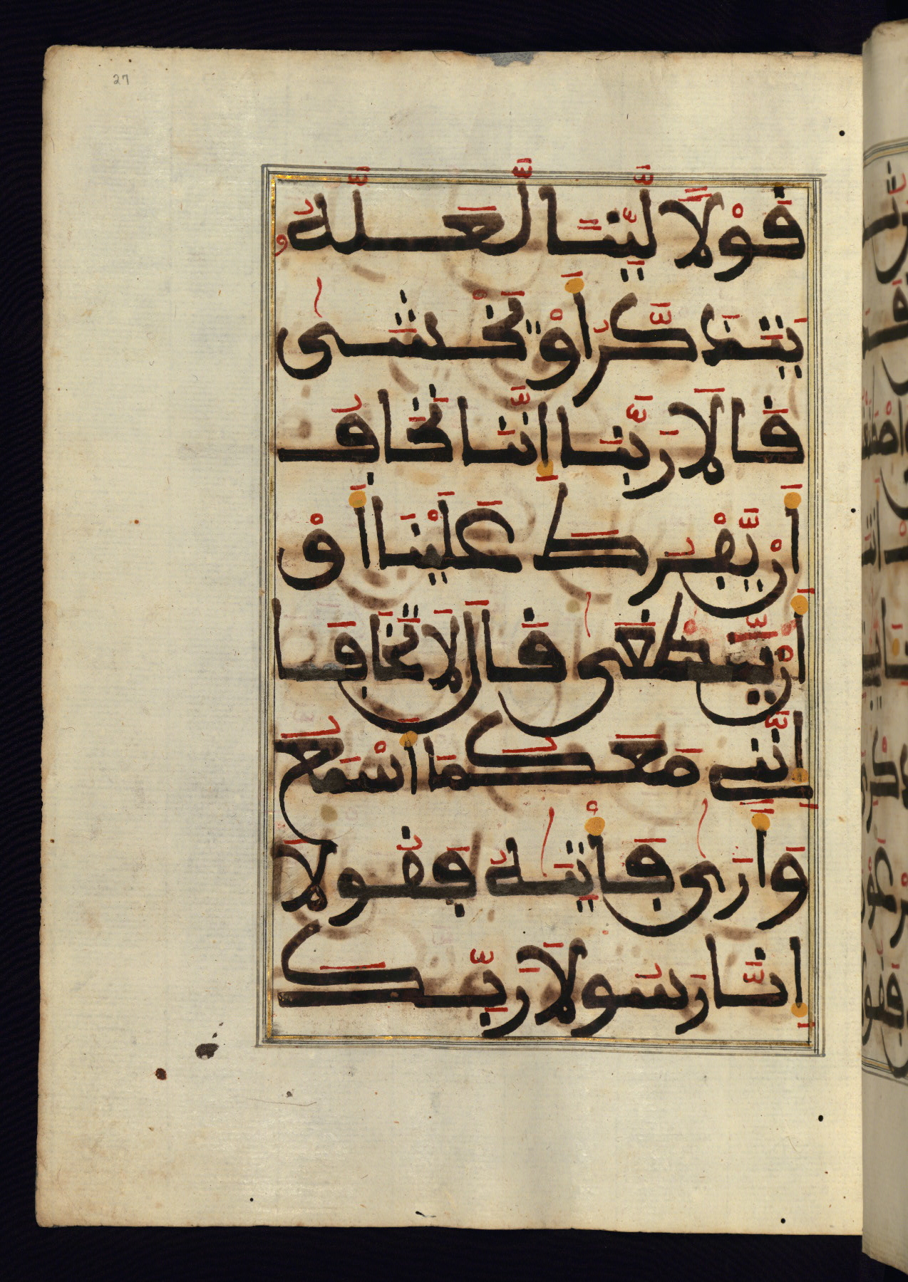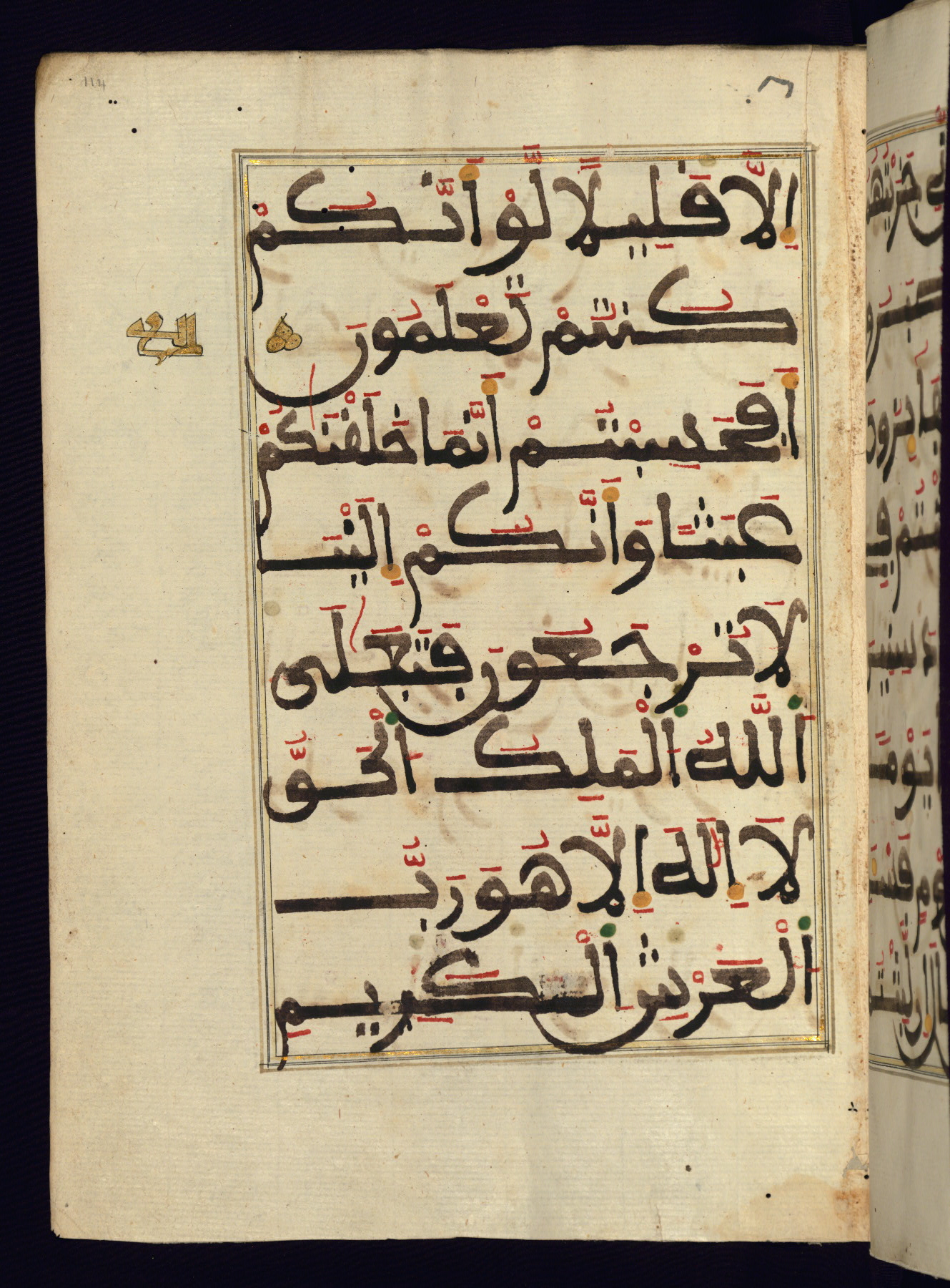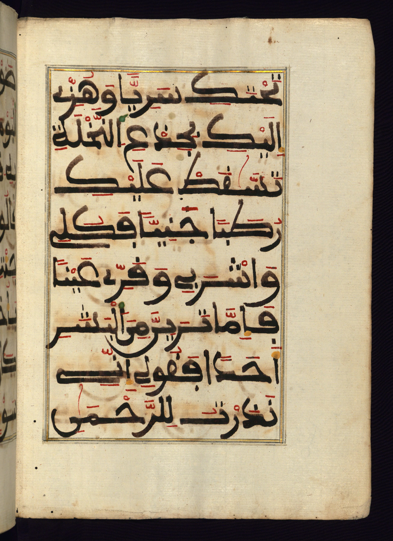 This manuscript is a fragment of the Qur'an, consisting of chapters 19 (Sūrat Maryam) through 23 (Sūrat al-muʾminūn). It was produced in the Maghreb and dates to the twelfth century AH / eighteenth CE. The text is written in a large Maghribī script, with vocalization in red, green, and yellow ink on Italian paper. The codex opens with an illuminated chapter heading for chapter 19 (Sūrat Maryam) written in the New Abbasid (broken cursive) style (fol. 1b) in gold ink within a decorative headpiece. The titles of other chapters are written in the New Abbasid (broken cursive) style in gold ink (fols. 21a, 47b, 70a, and 102a) with a marginal medallion. The blind-tooled goatskin binding is not contemporary with the manuscript and probably dates to the thirteenth century AH / nineteenth CE.