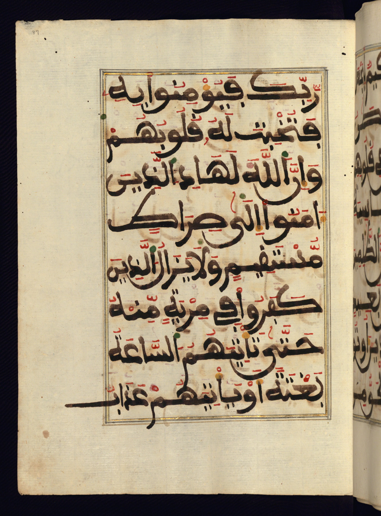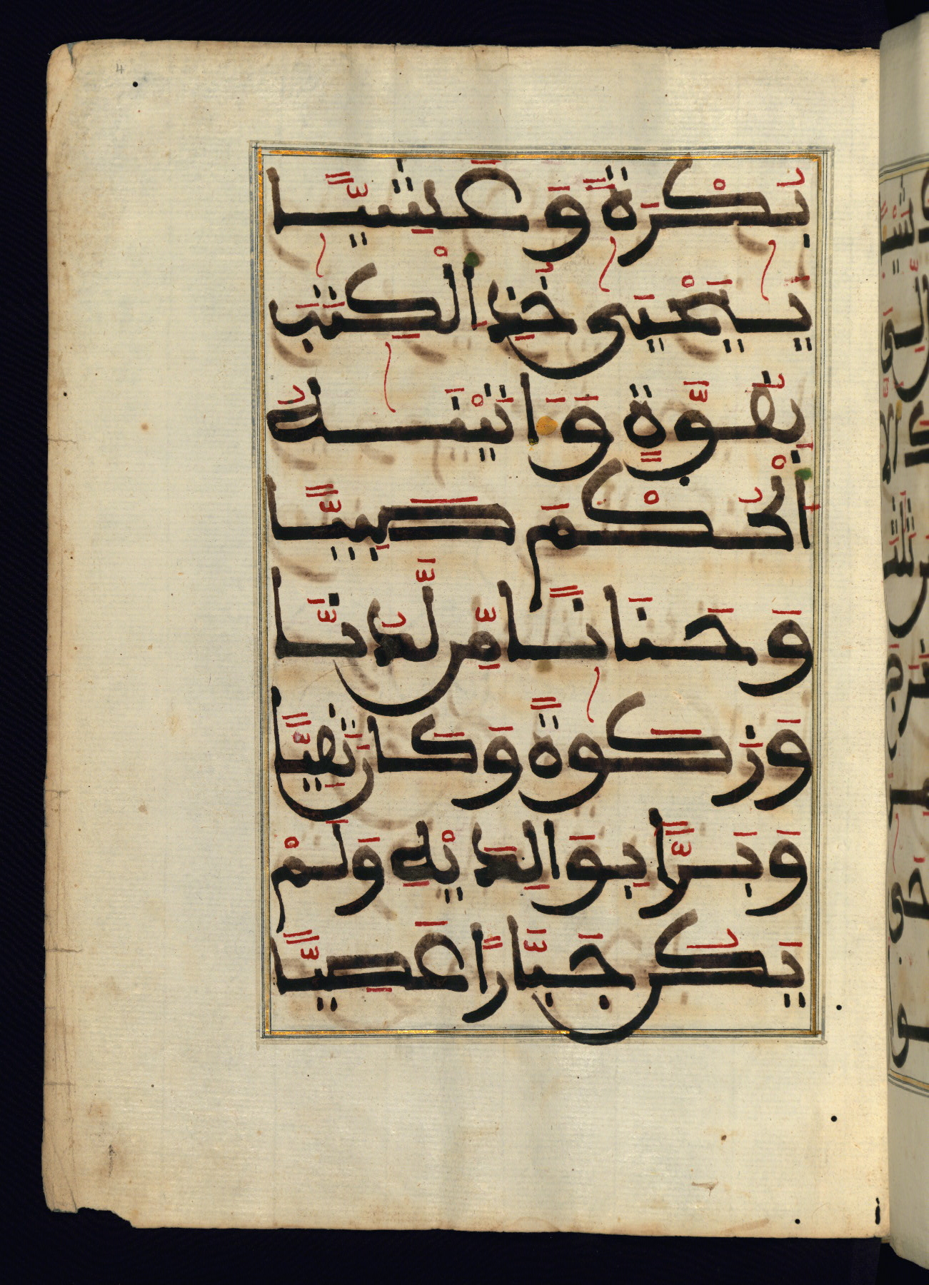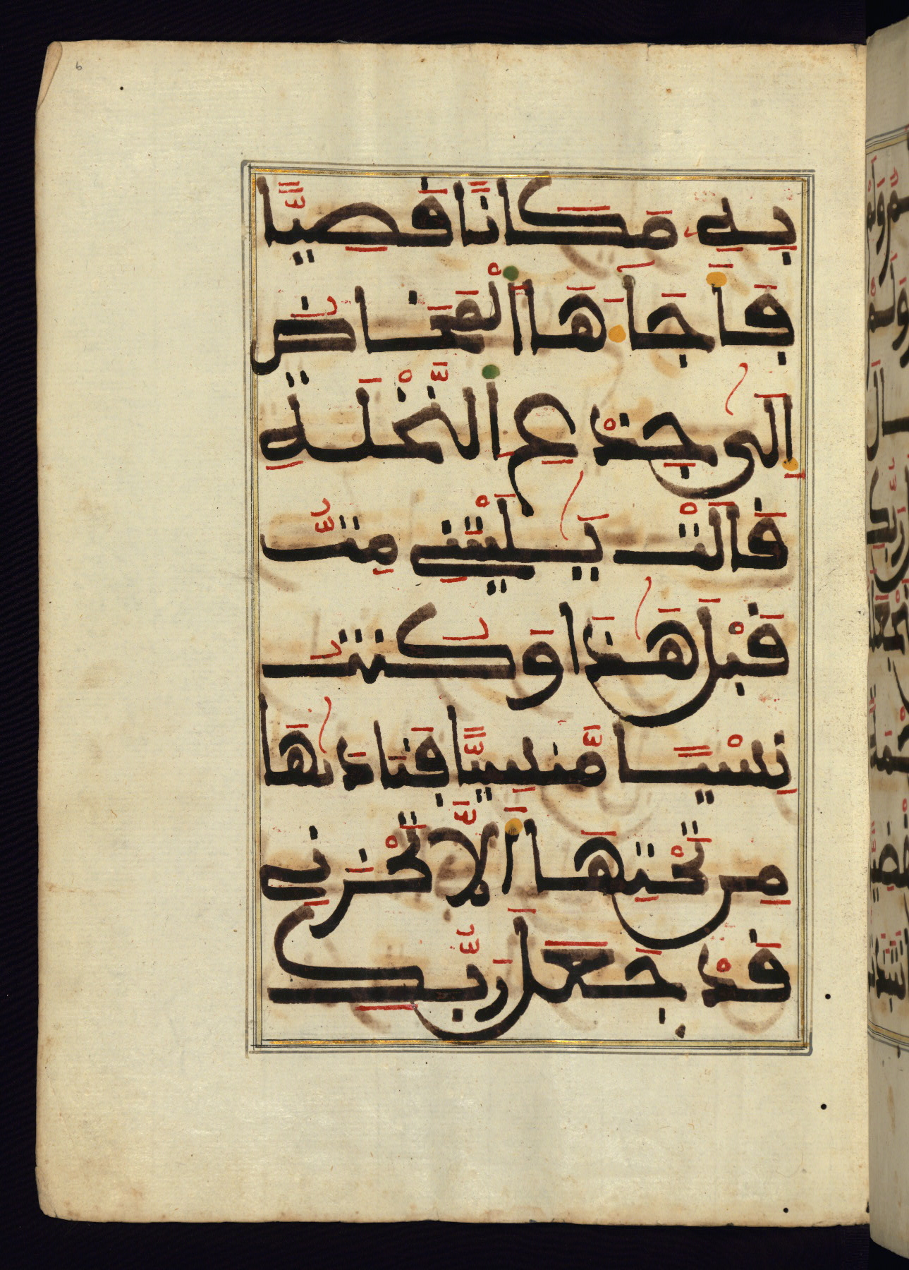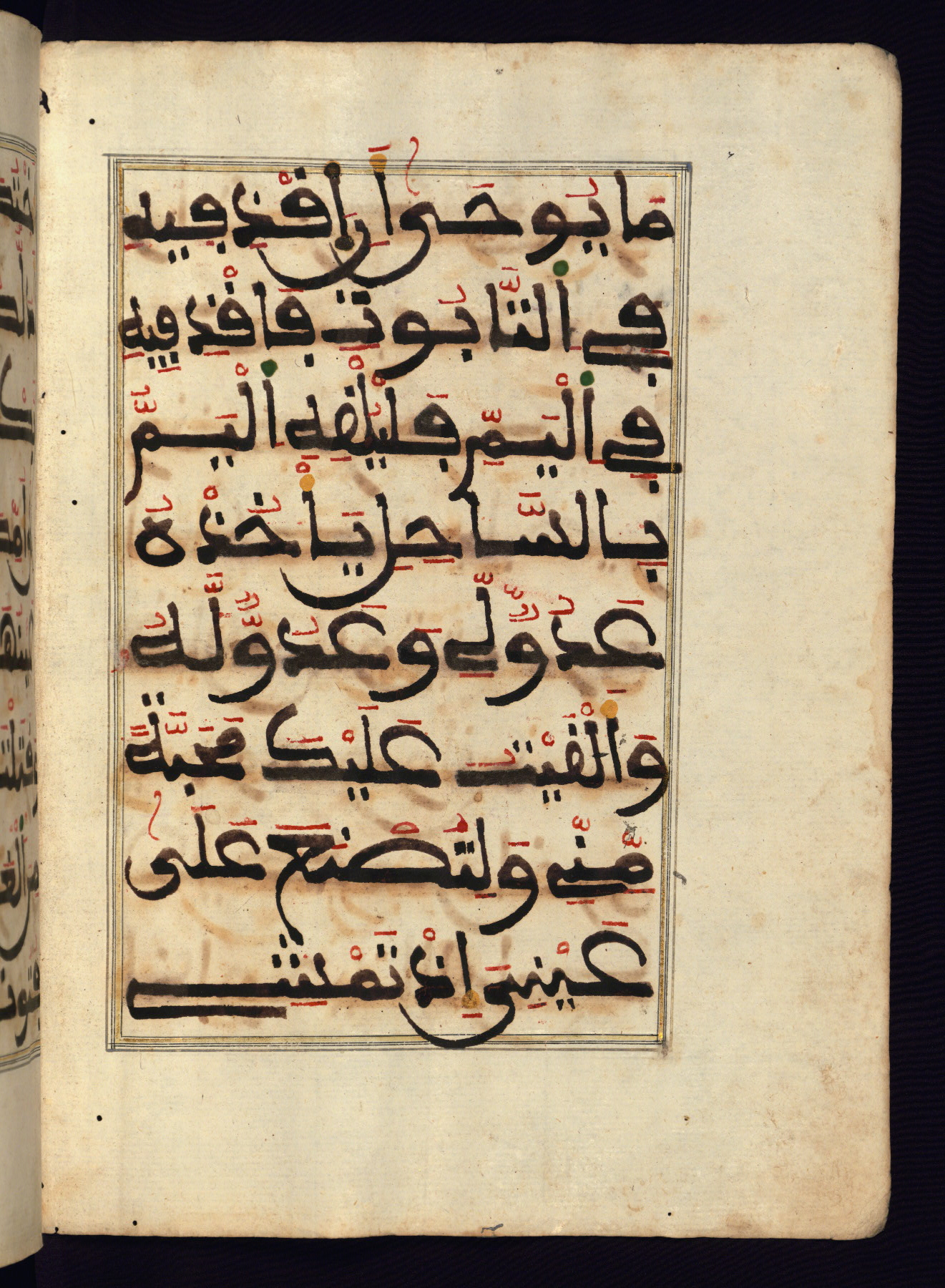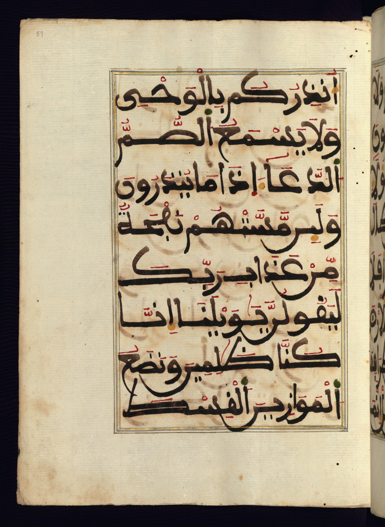 This manuscript is a fragment of the Qur'an, consisting of chapters 19 (Sūrat Maryam) through 23 (Sūrat al-muʾminūn). It was produced in the Maghreb and dates to the twelfth century AH / eighteenth CE. The text is written in a large Maghribī script, with vocalization in red, green, and yellow ink on Italian paper. The codex opens with an illuminated chapter heading for chapter 19 (Sūrat Maryam) written in the New Abbasid (broken cursive) style (fol. 1b) in gold ink within a decorative headpiece. The titles of other chapters are written in the New Abbasid (broken cursive) style in gold ink (fols. 21a, 47b, 70a, and 102a) with a marginal medallion. The blind-tooled goatskin binding is not contemporary with the manuscript and probably dates to the thirteenth century AH / nineteenth CE.