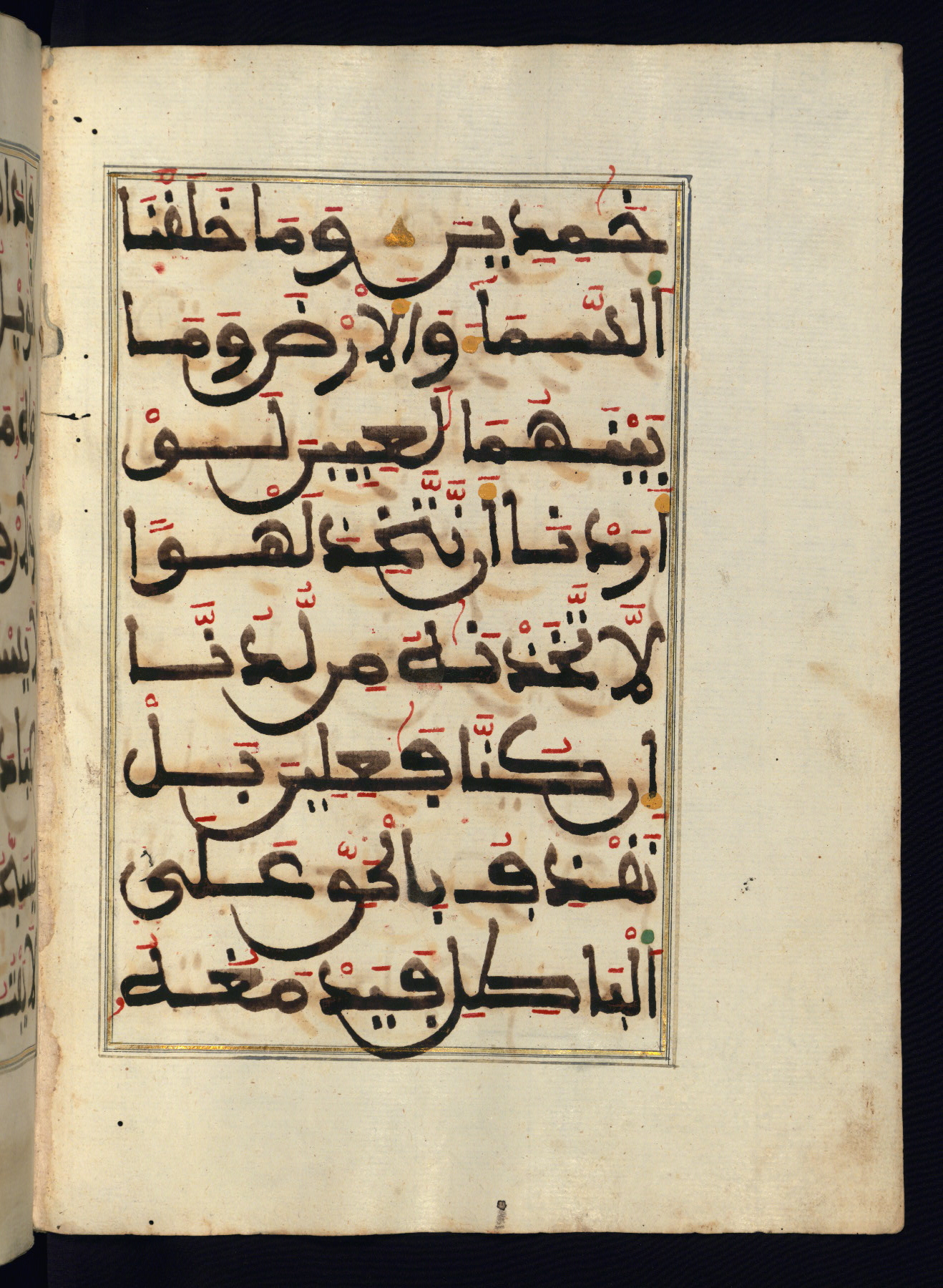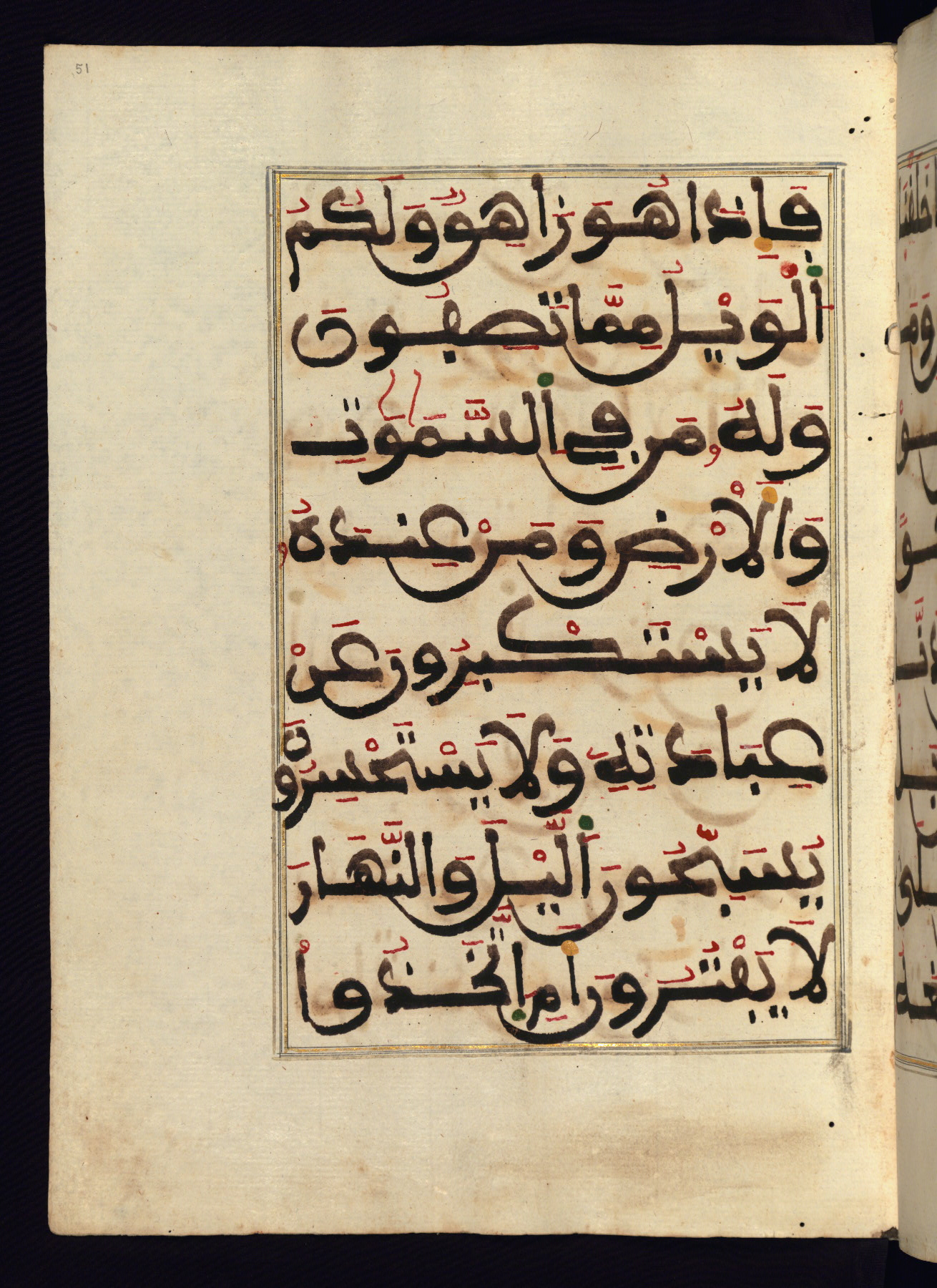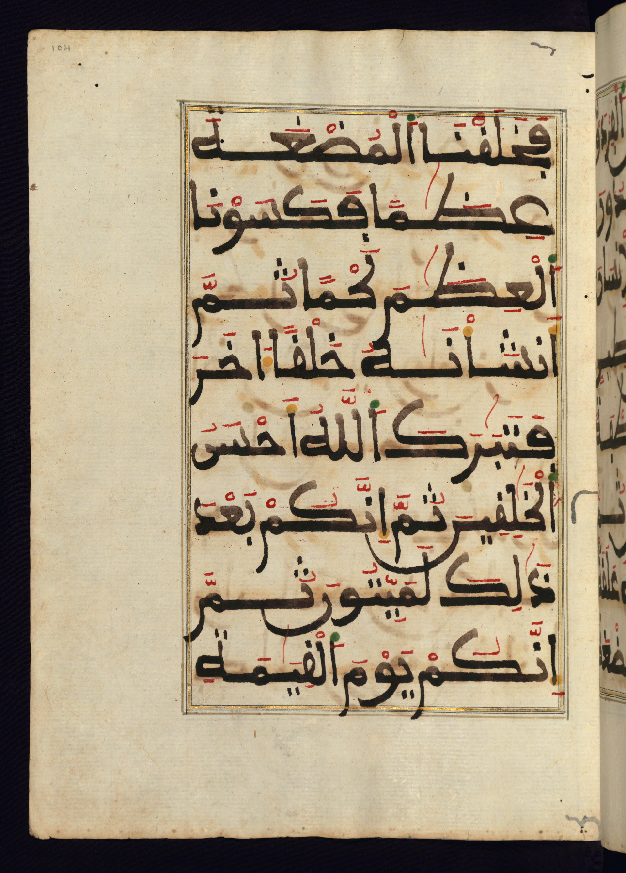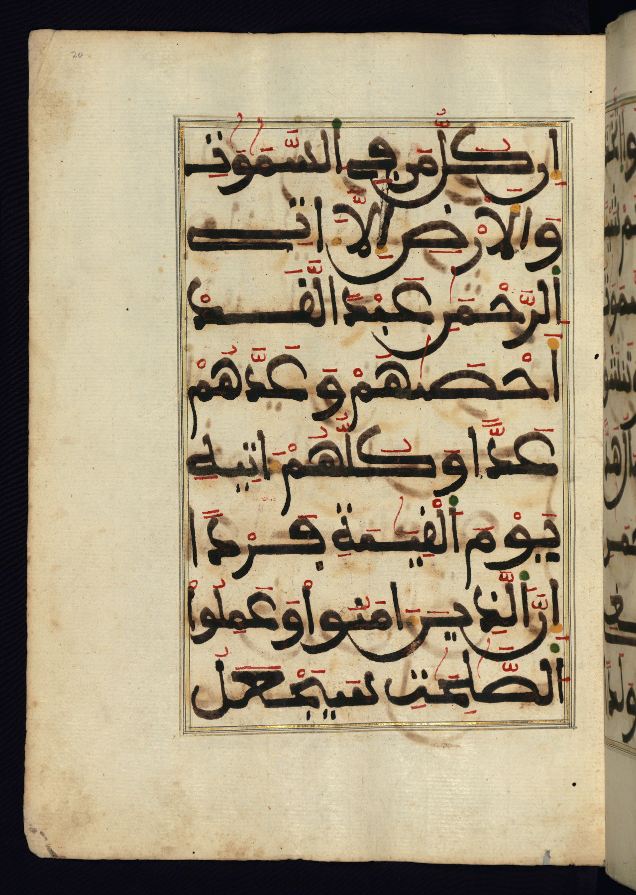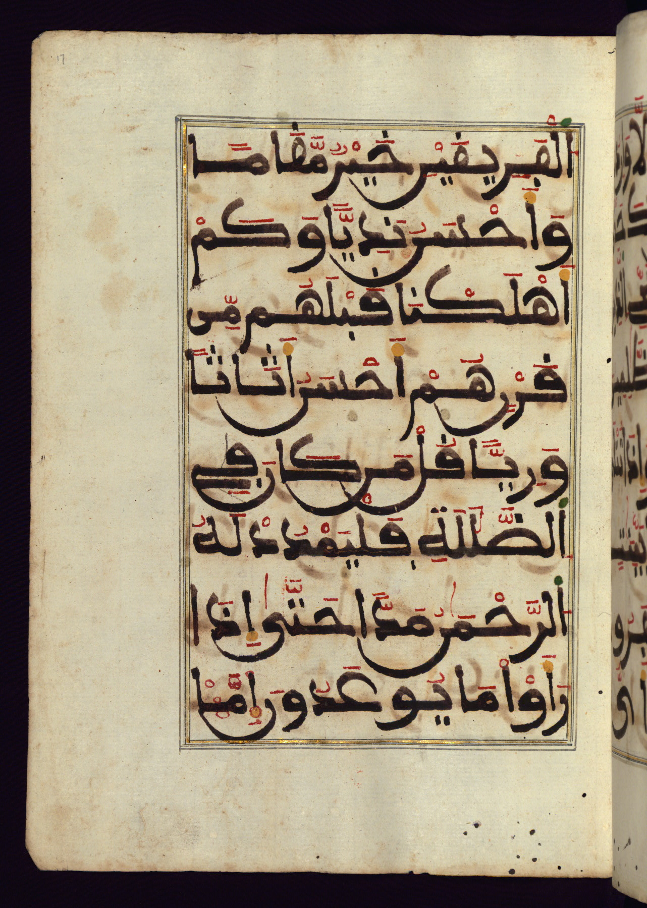 This manuscript is a fragment of the Qur'an, consisting of chapters 19 (Sūrat Maryam) through 23 (Sūrat al-muʾminūn). It was produced in the Maghreb and dates to the twelfth century AH / eighteenth CE. The text is written in a large Maghribī script, with vocalization in red, green, and yellow ink on Italian paper. The codex opens with an illuminated chapter heading for chapter 19 (Sūrat Maryam) written in the New Abbasid (broken cursive) style (fol. 1b) in gold ink within a decorative headpiece. The titles of other chapters are written in the New Abbasid (broken cursive) style in gold ink (fols. 21a, 47b, 70a, and 102a) with a marginal medallion. The blind-tooled goatskin binding is not contemporary with the manuscript and probably dates to the thirteenth century AH / nineteenth CE.