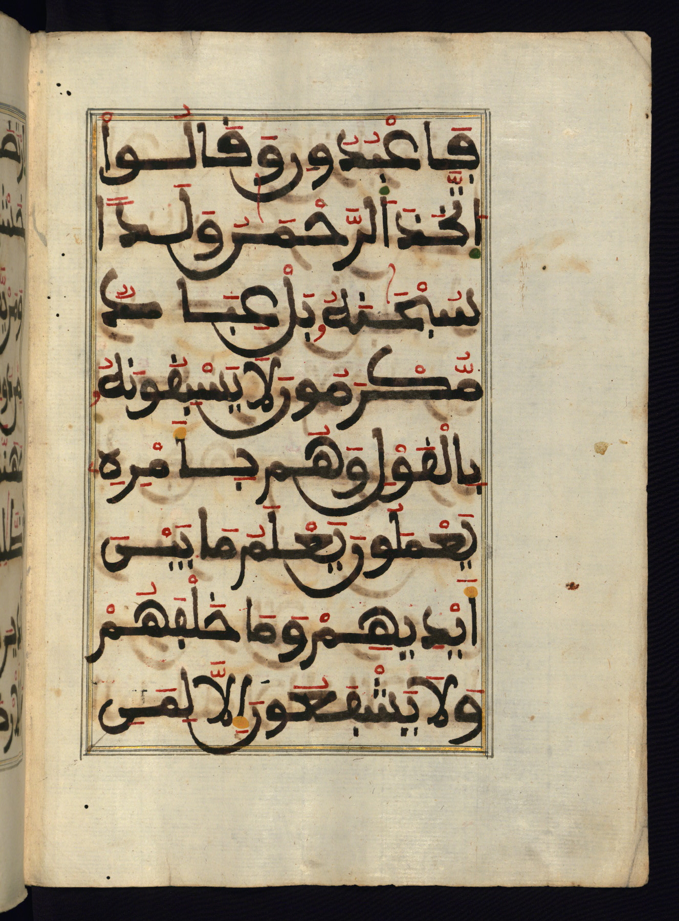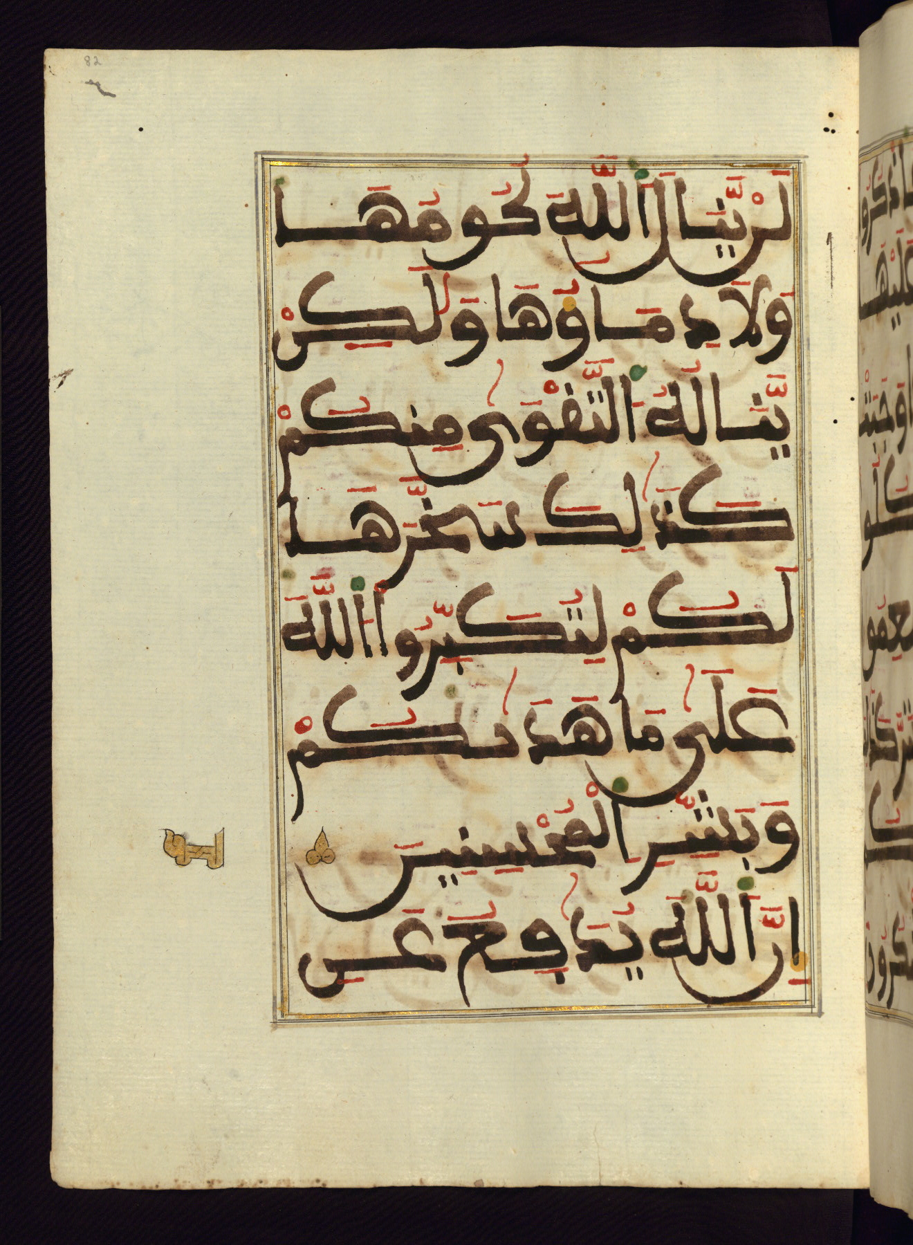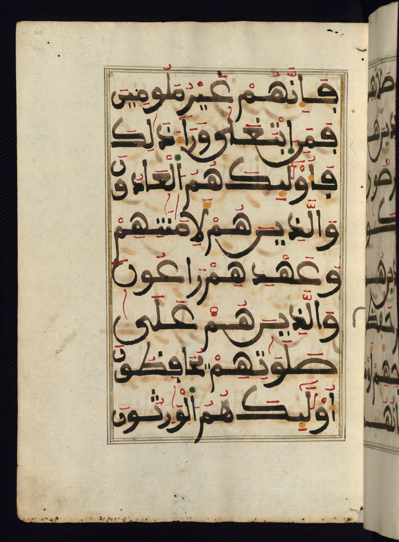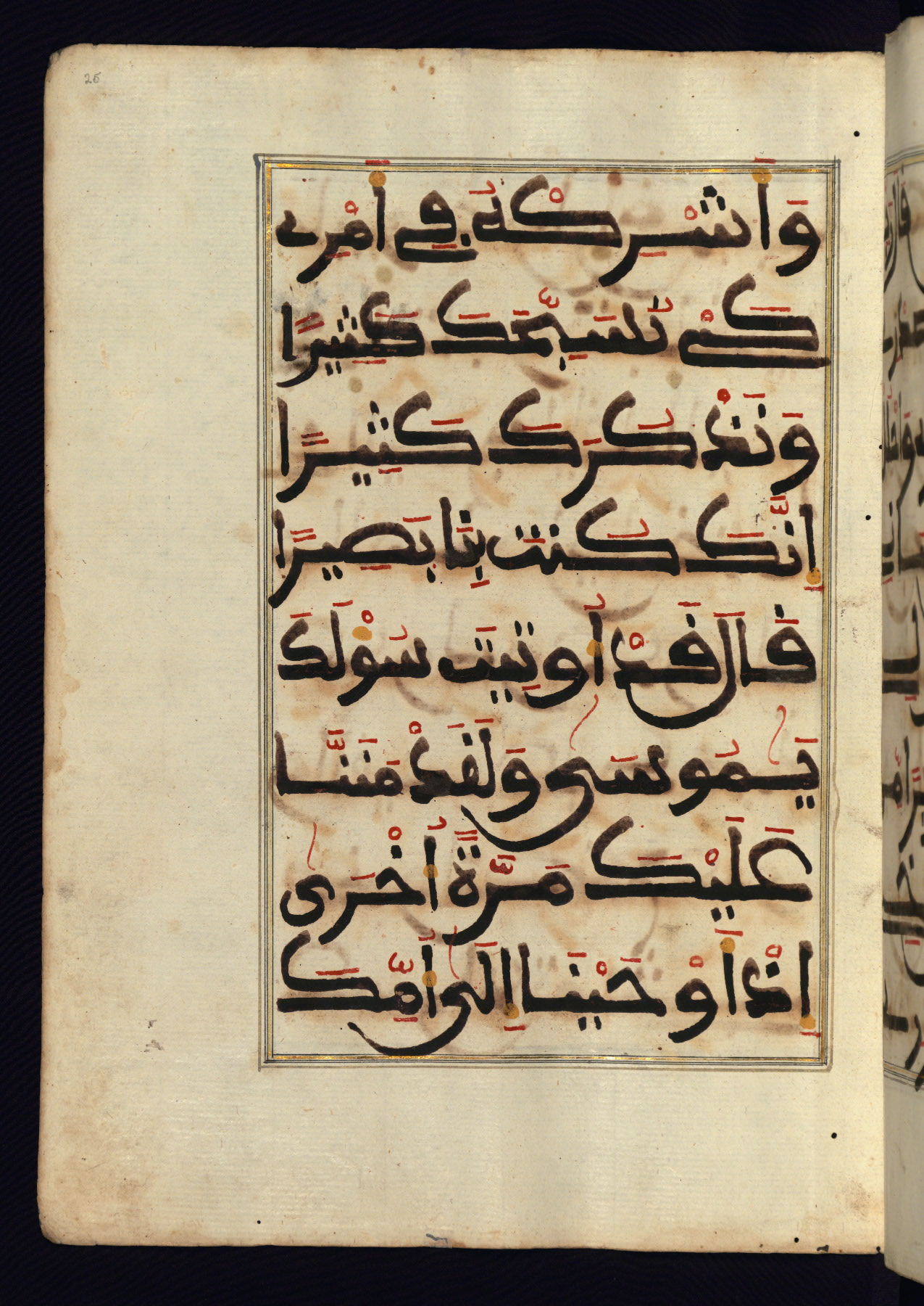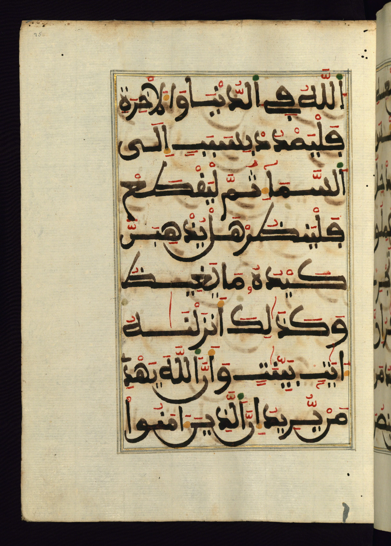 This manuscript is a fragment of the Qur'an, consisting of chapters 19 (Sūrat Maryam) through 23 (Sūrat al-muʾminūn). It was produced in the Maghreb and dates to the twelfth century AH / eighteenth CE. The text is written in a large Maghribī script, with vocalization in red, green, and yellow ink on Italian paper. The codex opens with an illuminated chapter heading for chapter 19 (Sūrat Maryam) written in the New Abbasid (broken cursive) style (fol. 1b) in gold ink within a decorative headpiece. The titles of other chapters are written in the New Abbasid (broken cursive) style in gold ink (fols. 21a, 47b, 70a, and 102a) with a marginal medallion. The blind-tooled goatskin binding is not contemporary with the manuscript and probably dates to the thirteenth century AH / nineteenth CE.