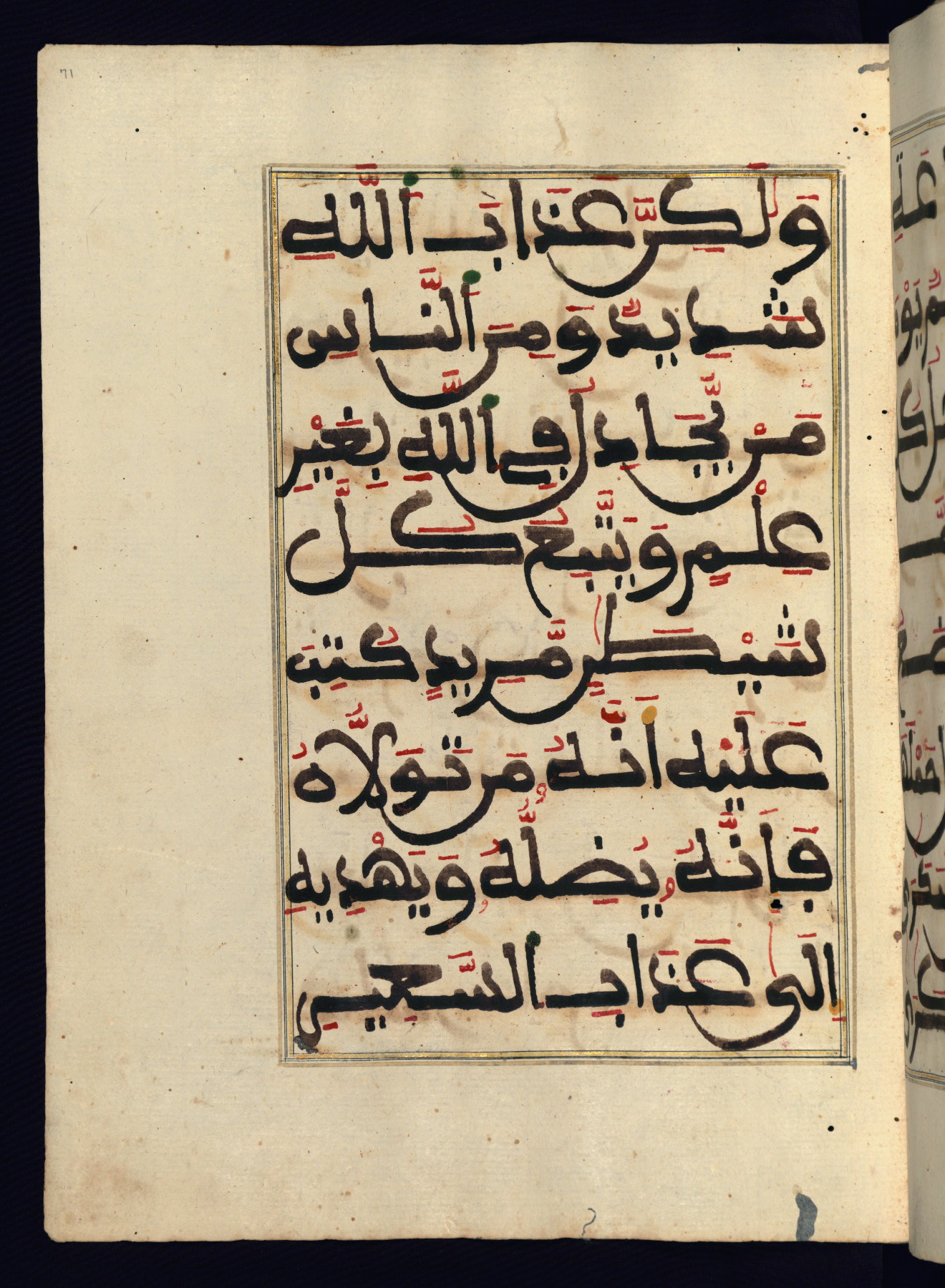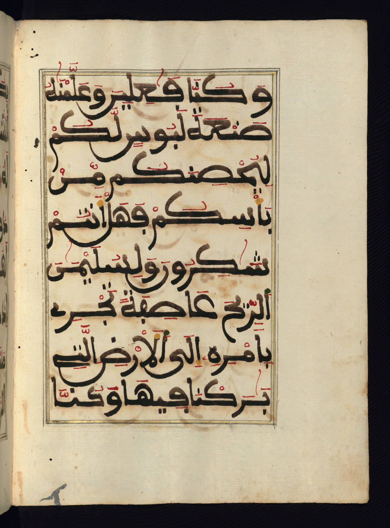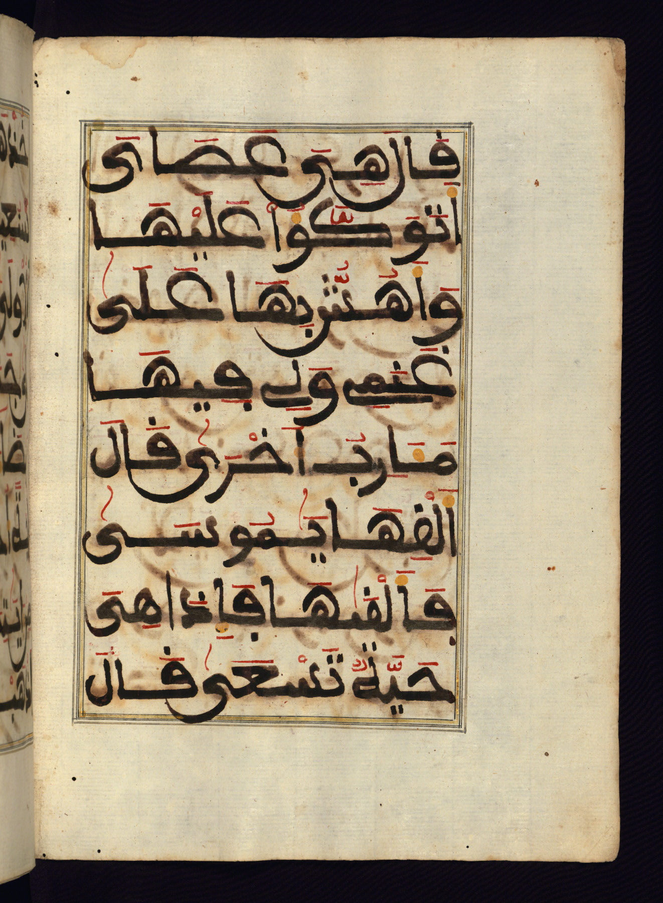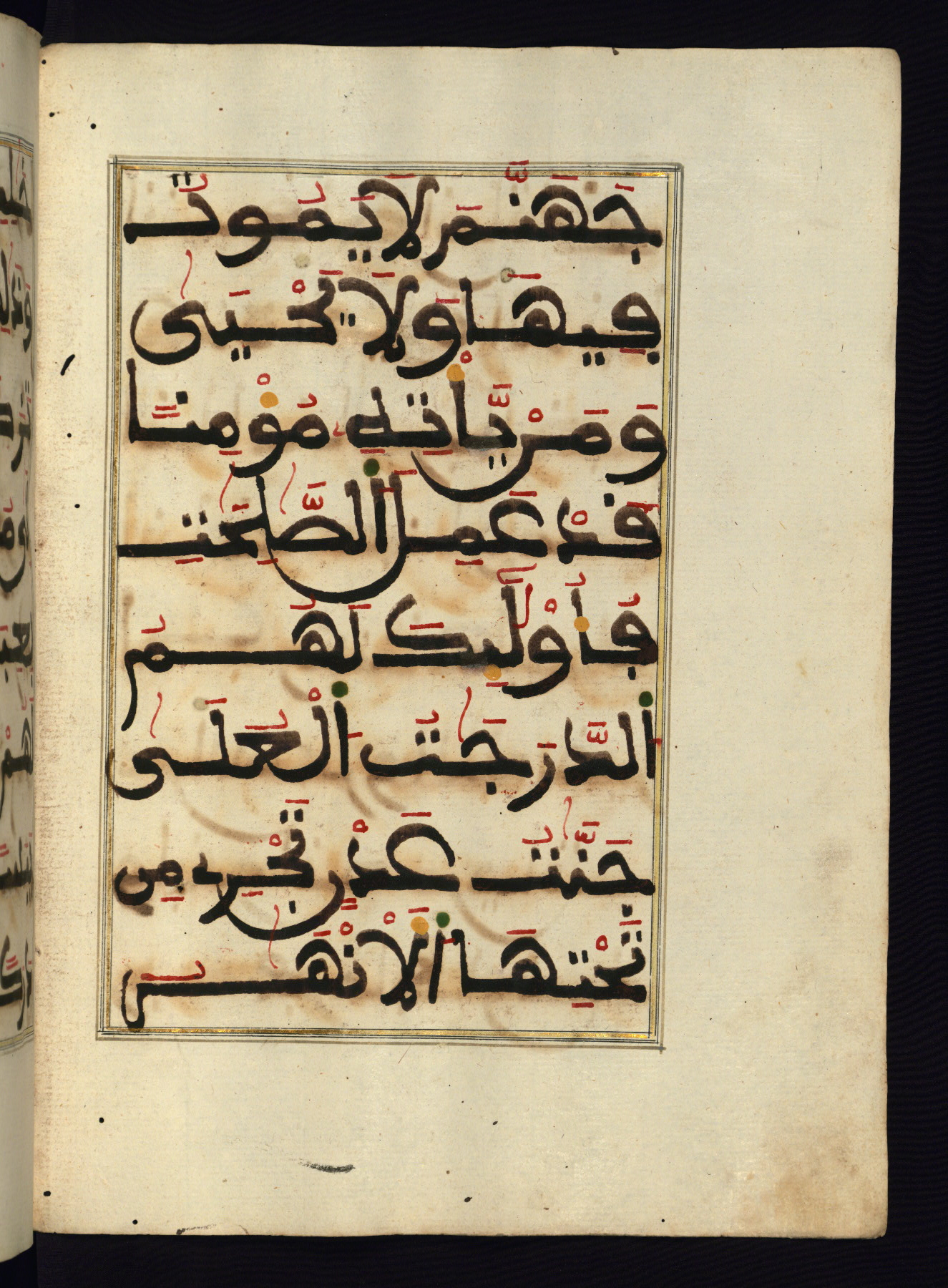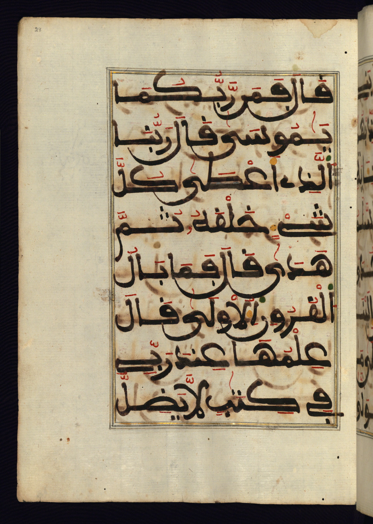 This manuscript is a fragment of the Qur'an, consisting of chapters 19 (Sūrat Maryam) through 23 (Sūrat al-muʾminūn). It was produced in the Maghreb and dates to the twelfth century AH / eighteenth CE. The text is written in a large Maghribī script, with vocalization in red, green, and yellow ink on Italian paper. The codex opens with an illuminated chapter heading for chapter 19 (Sūrat Maryam) written in the New Abbasid (broken cursive) style (fol. 1b) in gold ink within a decorative headpiece. The titles of other chapters are written in the New Abbasid (broken cursive) style in gold ink (fols. 21a, 47b, 70a, and 102a) with a marginal medallion. The blind-tooled goatskin binding is not contemporary with the manuscript and probably dates to the thirteenth century AH / nineteenth CE.