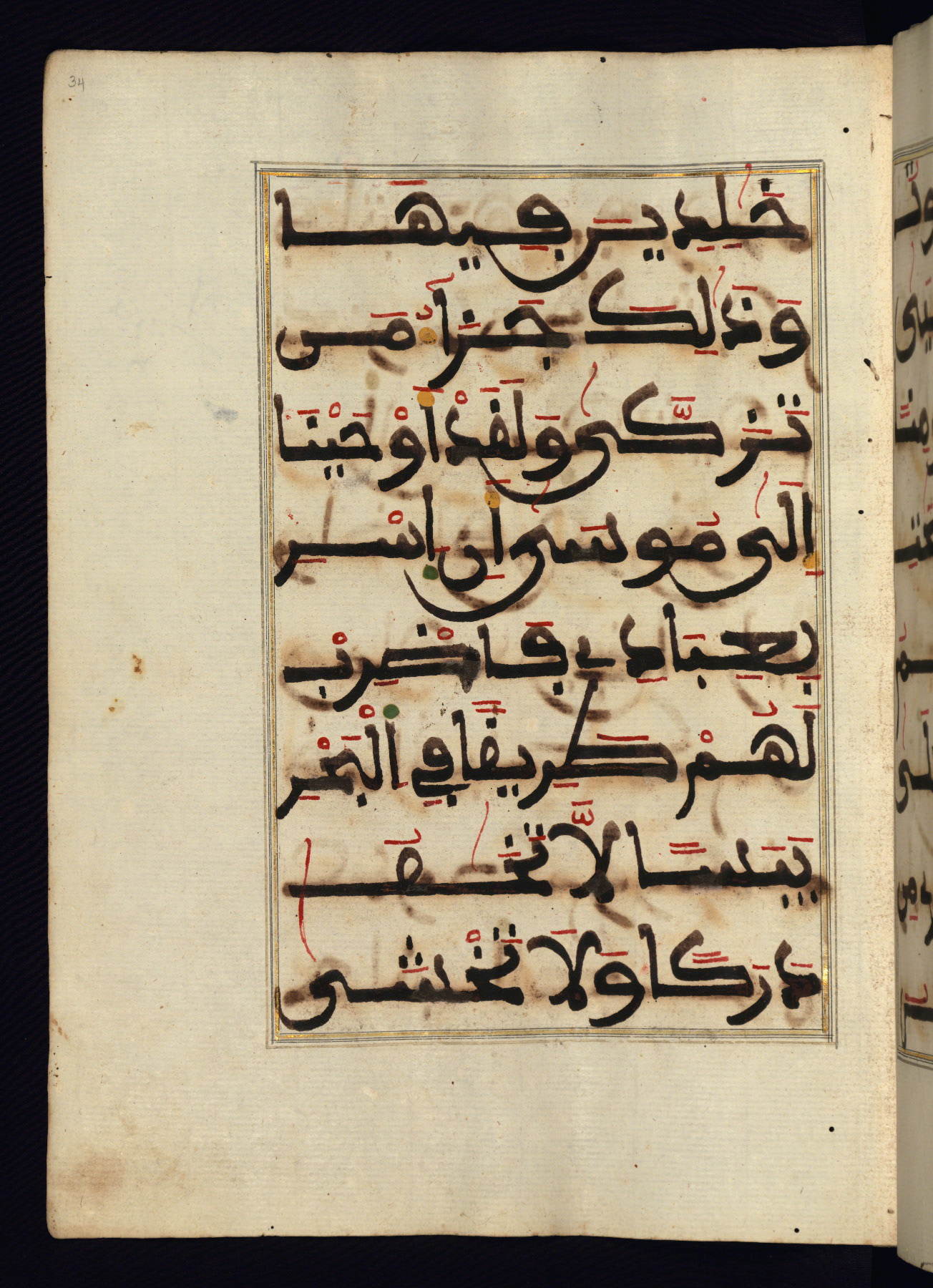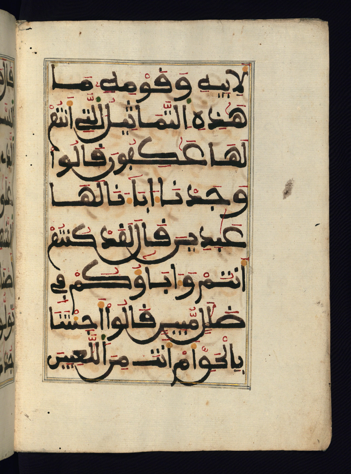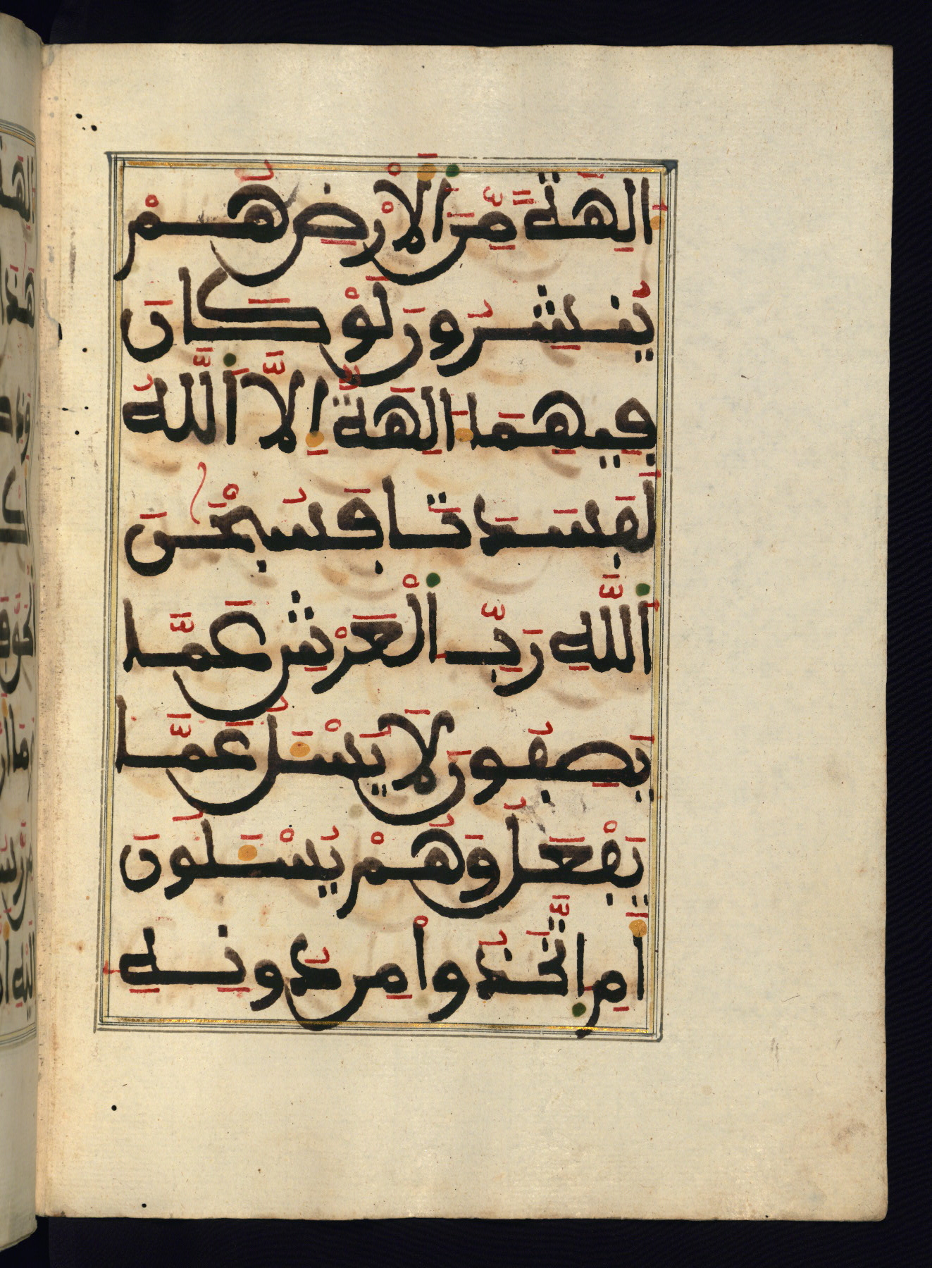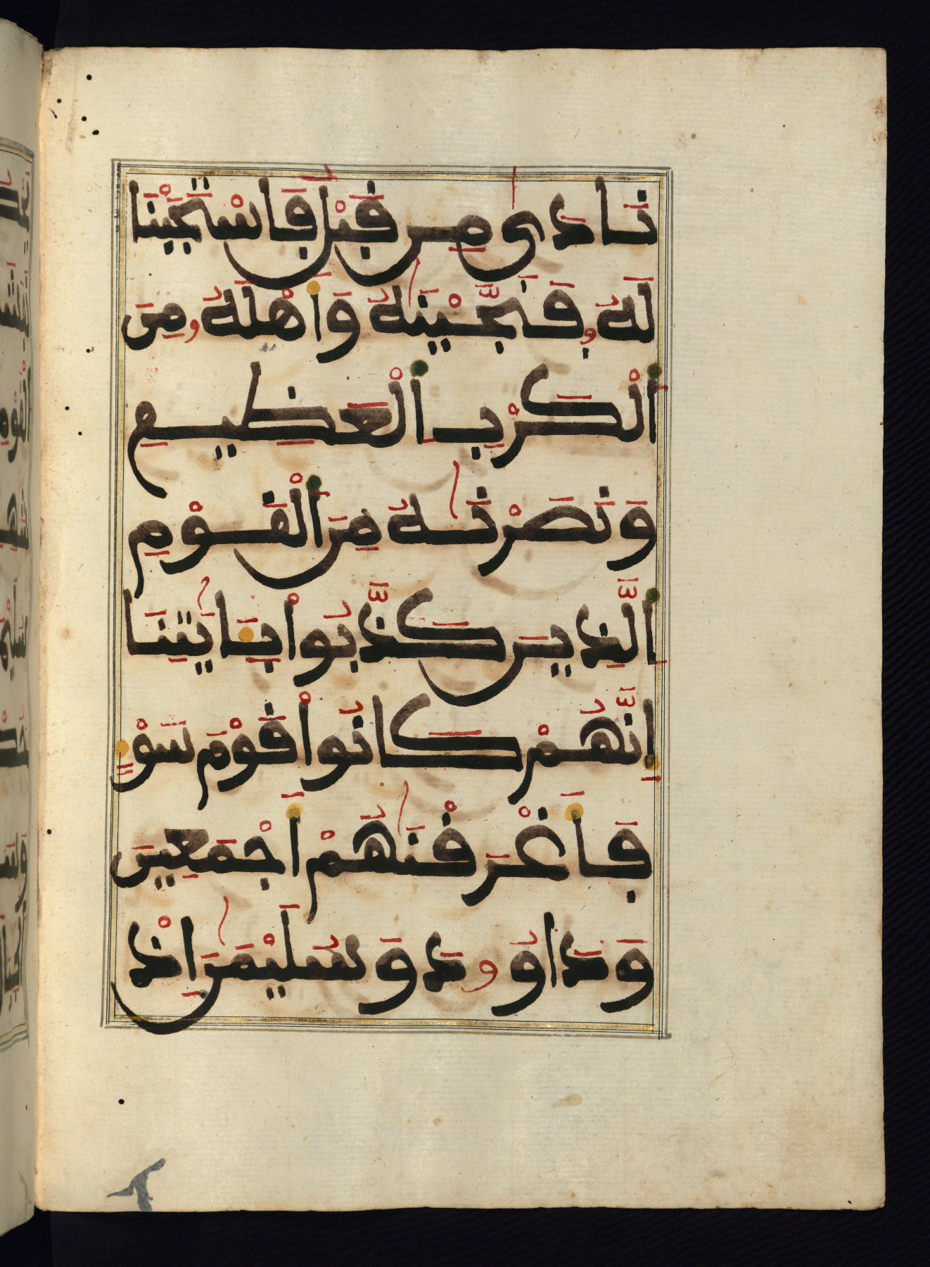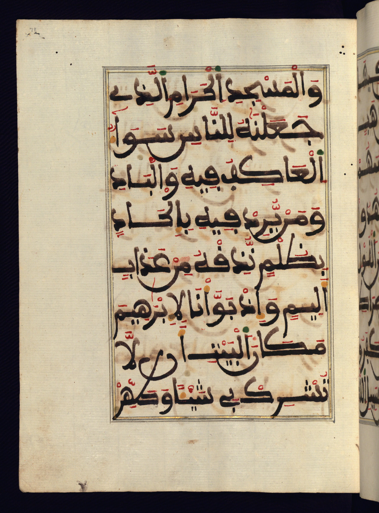 This manuscript is a fragment of the Qur'an, consisting of chapters 19 (Sūrat Maryam) through 23 (Sūrat al-muʾminūn). It was produced in the Maghreb and dates to the twelfth century AH / eighteenth CE. The text is written in a large Maghribī script, with vocalization in red, green, and yellow ink on Italian paper. The codex opens with an illuminated chapter heading for chapter 19 (Sūrat Maryam) written in the New Abbasid (broken cursive) style (fol. 1b) in gold ink within a decorative headpiece. The titles of other chapters are written in the New Abbasid (broken cursive) style in gold ink (fols. 21a, 47b, 70a, and 102a) with a marginal medallion. The blind-tooled goatskin binding is not contemporary with the manuscript and probably dates to the thirteenth century AH / nineteenth CE.